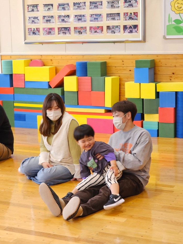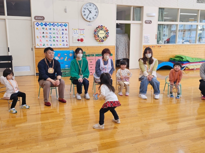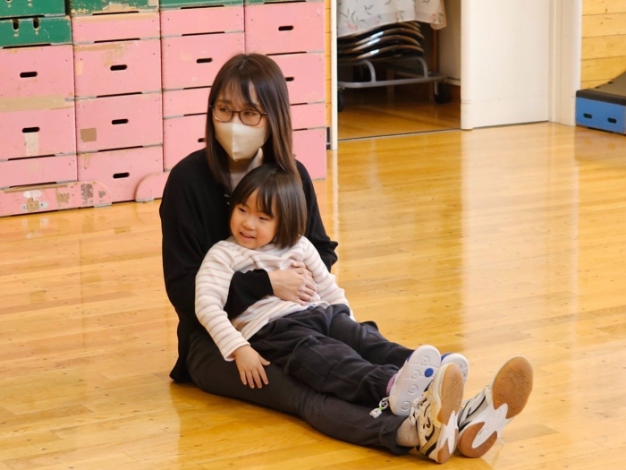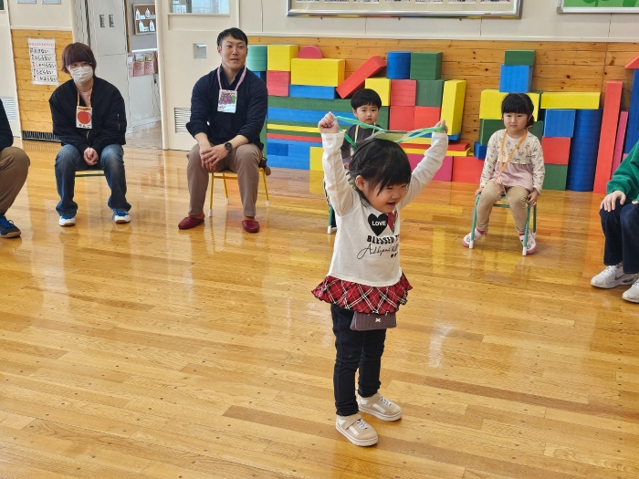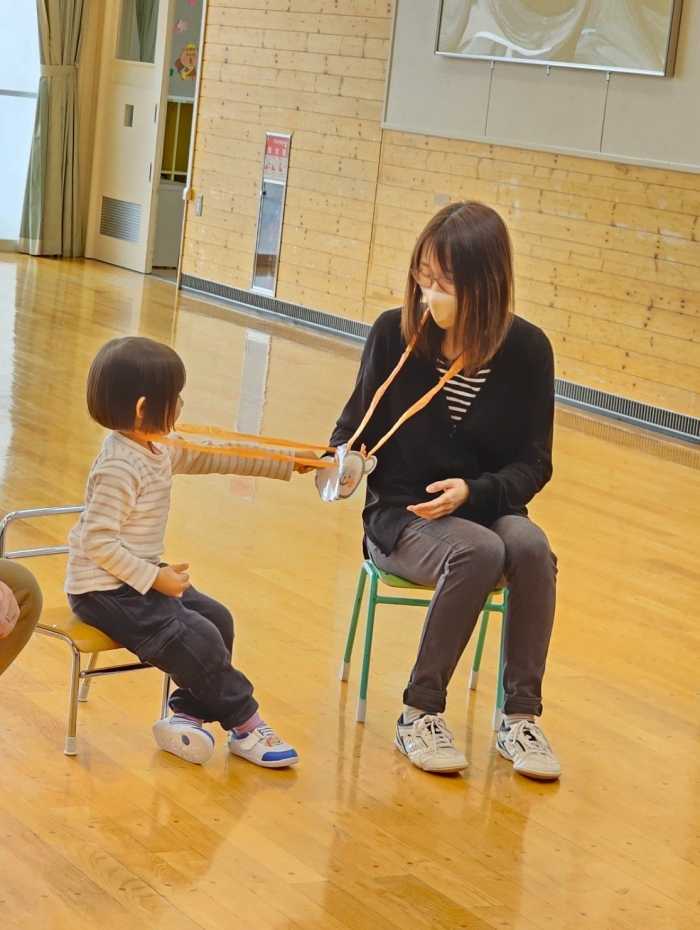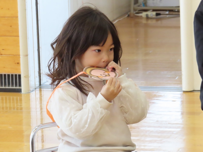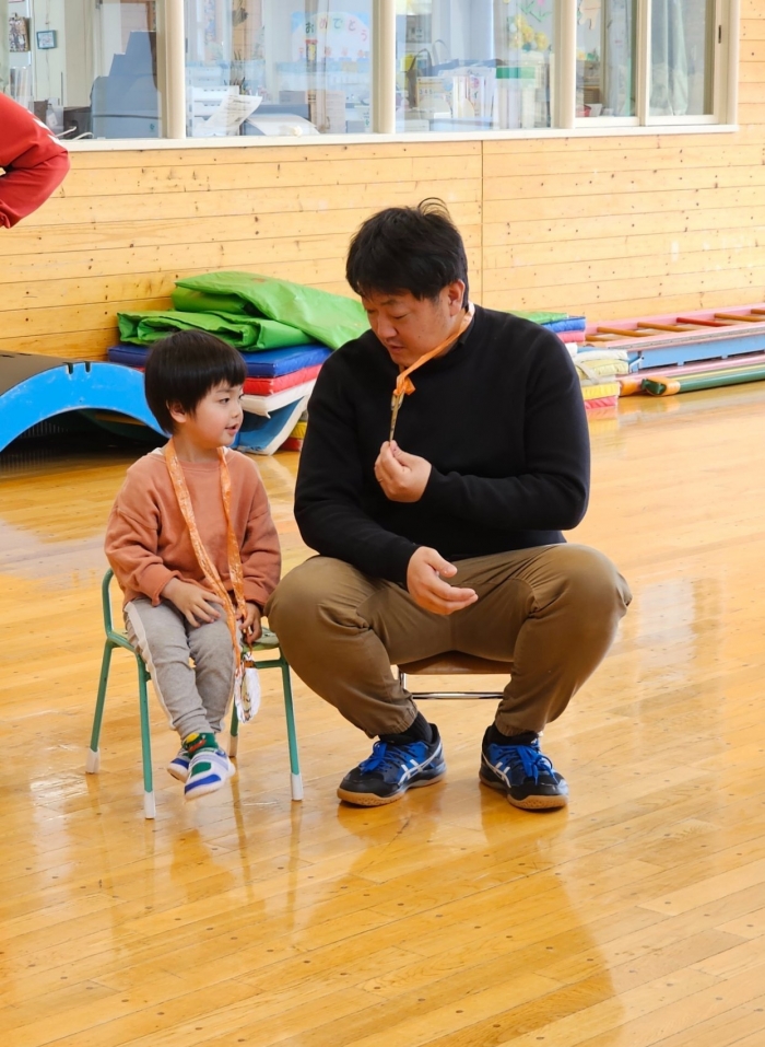 朝の会後は、親子で触れ合い遊び『バスにのって』、集団遊び『フルーツバスケット』『動物バスケット』を楽しみました。お父さん・お母さんがバス役・いちご組が運転手で、膝の上に乗ってユラユラ、急カーブ、急勾配…、盛りだくさんのスキンシップに幸せそうな子ども達でした。『フルーツバスケット』は、いちご組からのリクエスト! 全園児で親しんだことで、すっかりお気に入りになったようです。動物バージョンも加わり、お父さん・お母さんとも一緒に行ったことで楽しさが倍増⤴ 『フルーツor動物バスケット』ブームが続きそうですね。