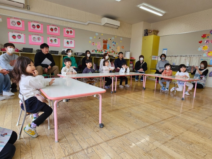 25日(金)『いちご組保育参観日』を実施しました。入園から約3週間…初めてお家の方が見に来てくれる日、きっと見られることへの緊張感もあり、安心の拠り所でもあるお父さん・お母さんと離れられない姿、涙・涙の姿もあるのでは?と予想していました。ところが、いつも通りの元気いっぱい、笑顔いっぱい、おしゃべりもいっぱい(笑)の朝の会をしているいちご組に、先生方はビックリでした。