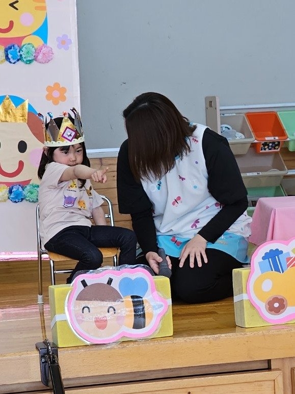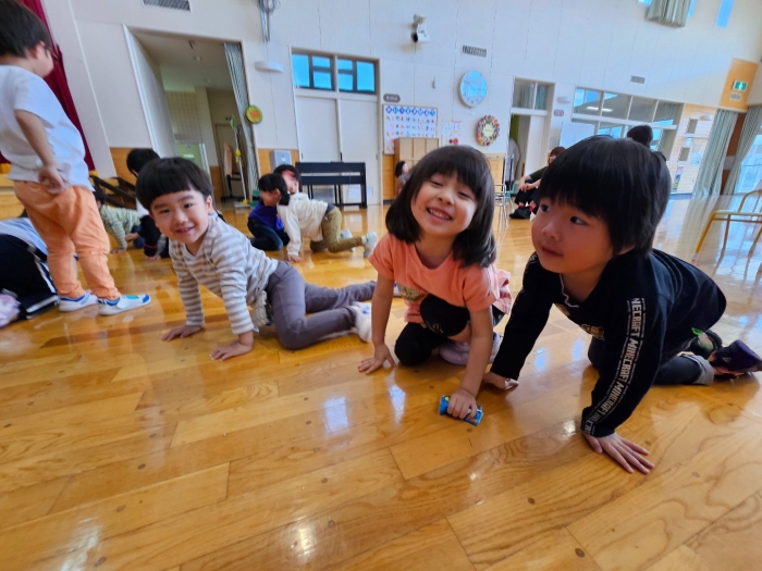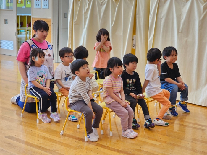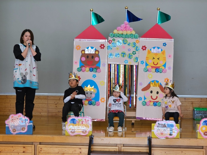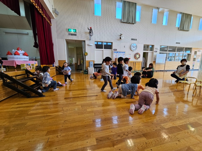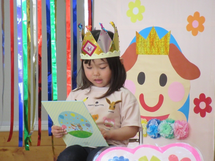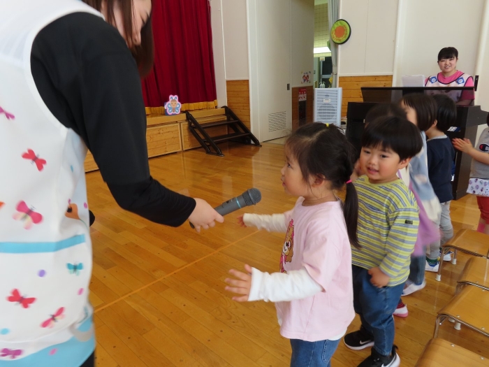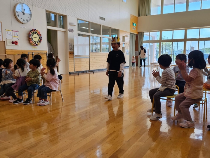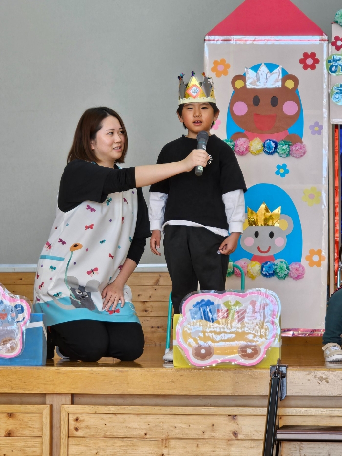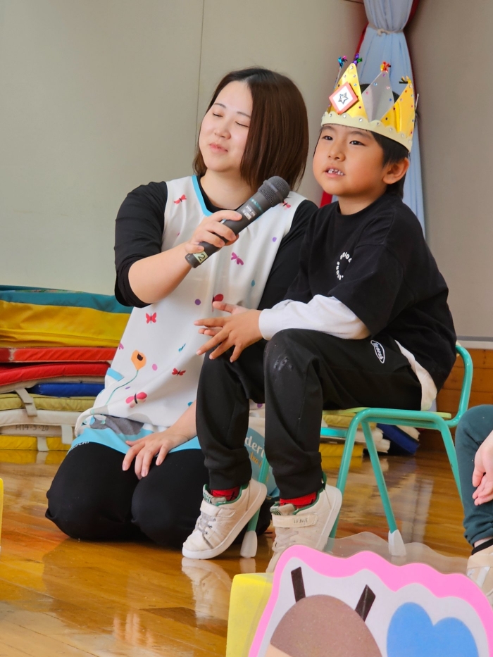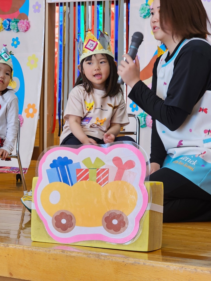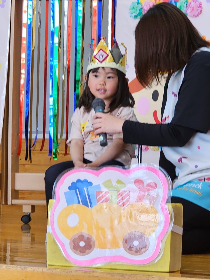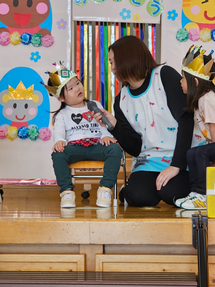 今日は、5月の誕生会☆彡 たけのこ組1名、 いちご組2名のお友達をみんなでお祝いしました。4月の誕生会を体験して、今度は自分の番!と、この日をわくわく楽しみにしていた 誕生児たち。ステージ上では、ベテランの風格が漂い、終始落ち着いて受け答えをするたけのこ組誕生児、ちょっぴり緊張しながらも質問にはしっかり答えていたいちご組誕生児でした。お祝いする側の子ども達も、誕生児から「質問がある人(ぼく・わたしに)は、○○になってください」とのリクエストに全力で答え、カーニバルのような賑やかさでお祝いの歌をプレゼントしていました(^^♪