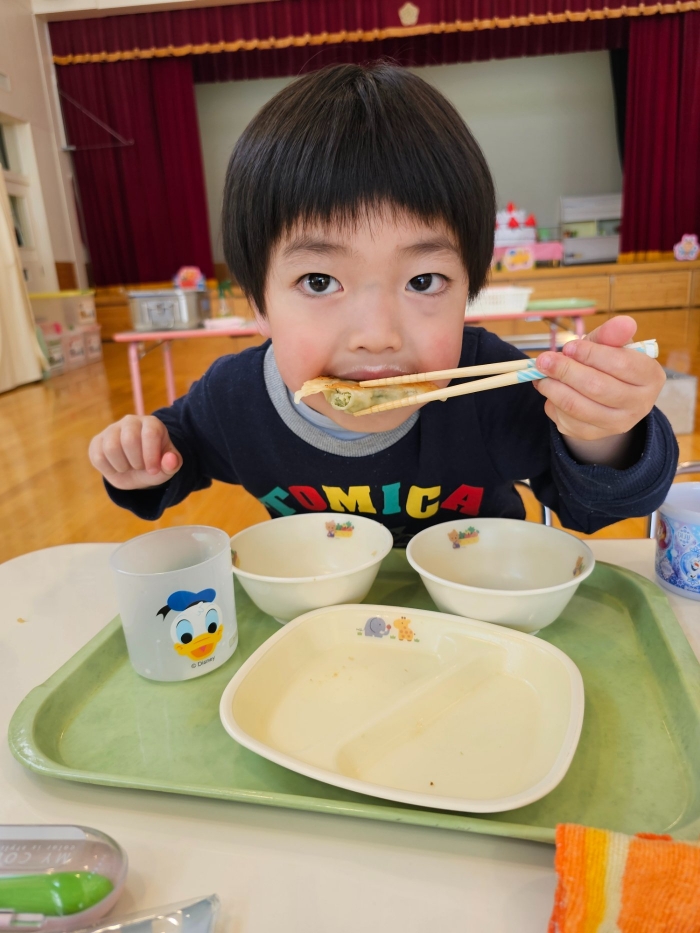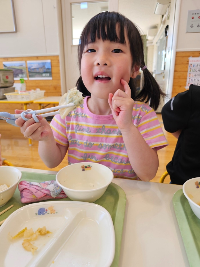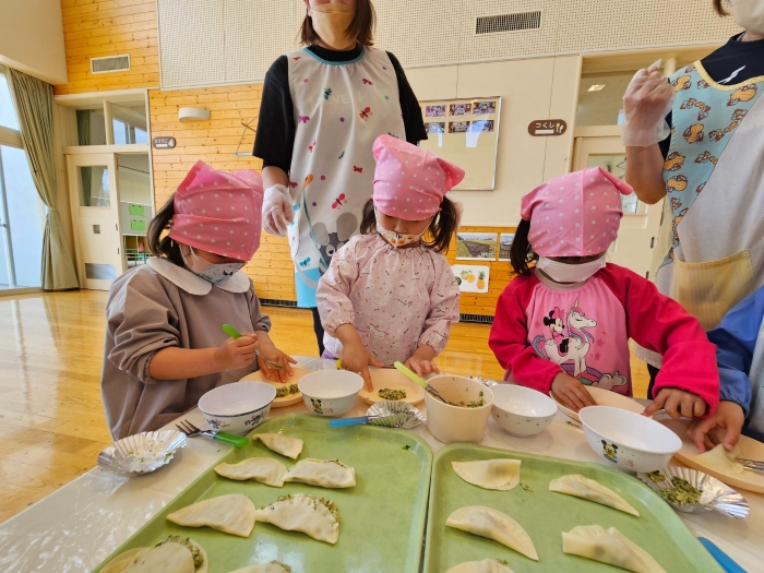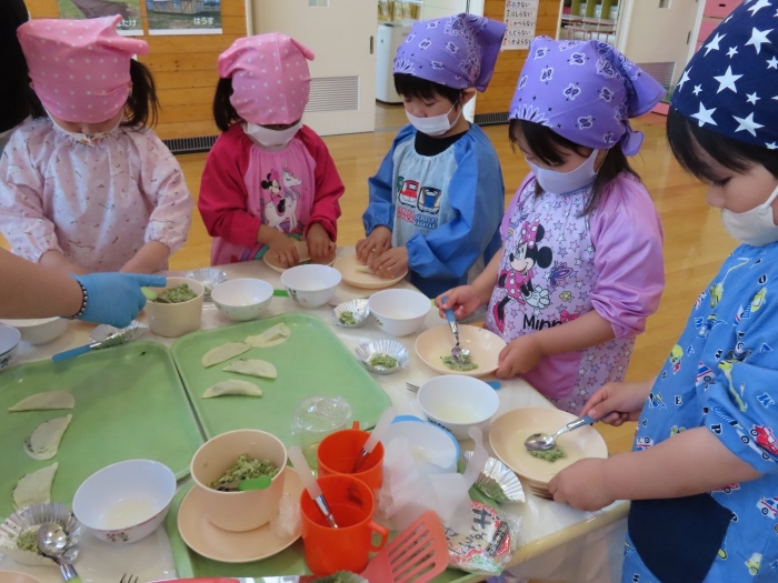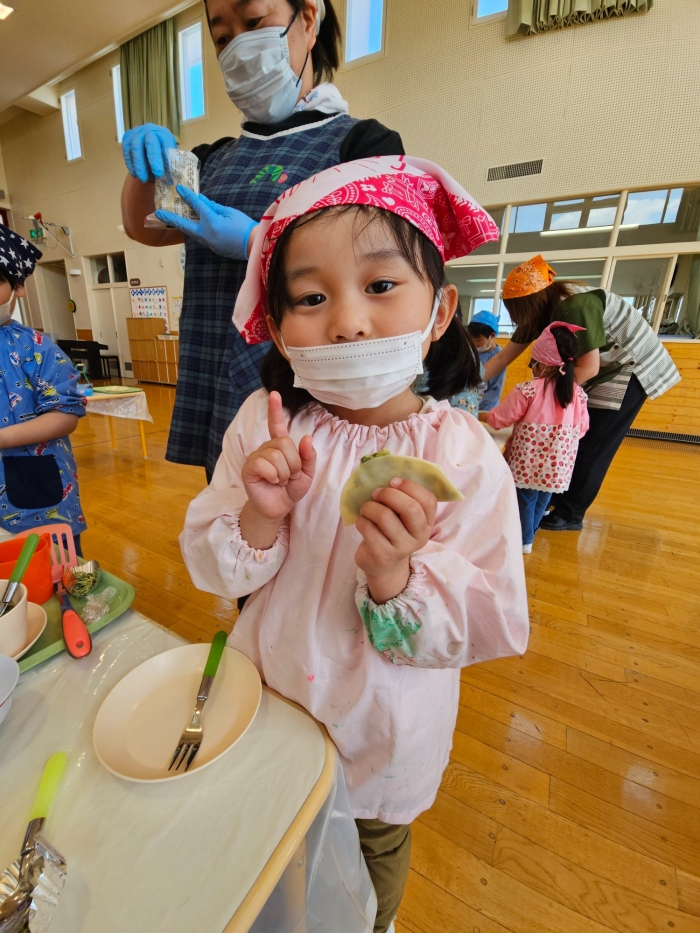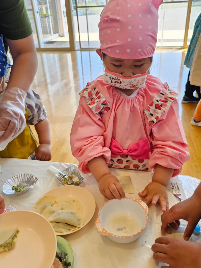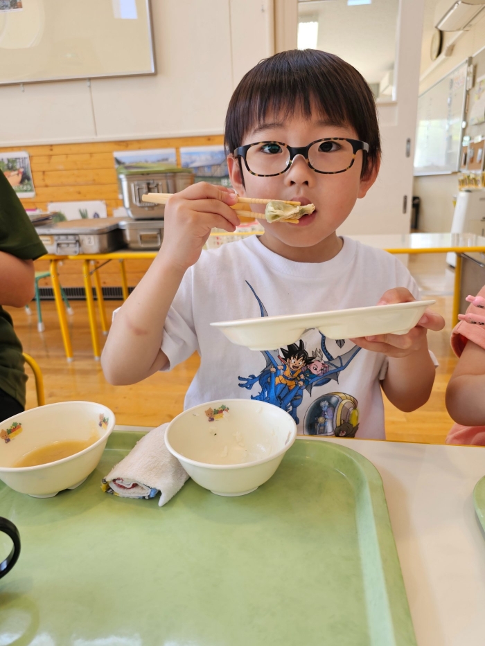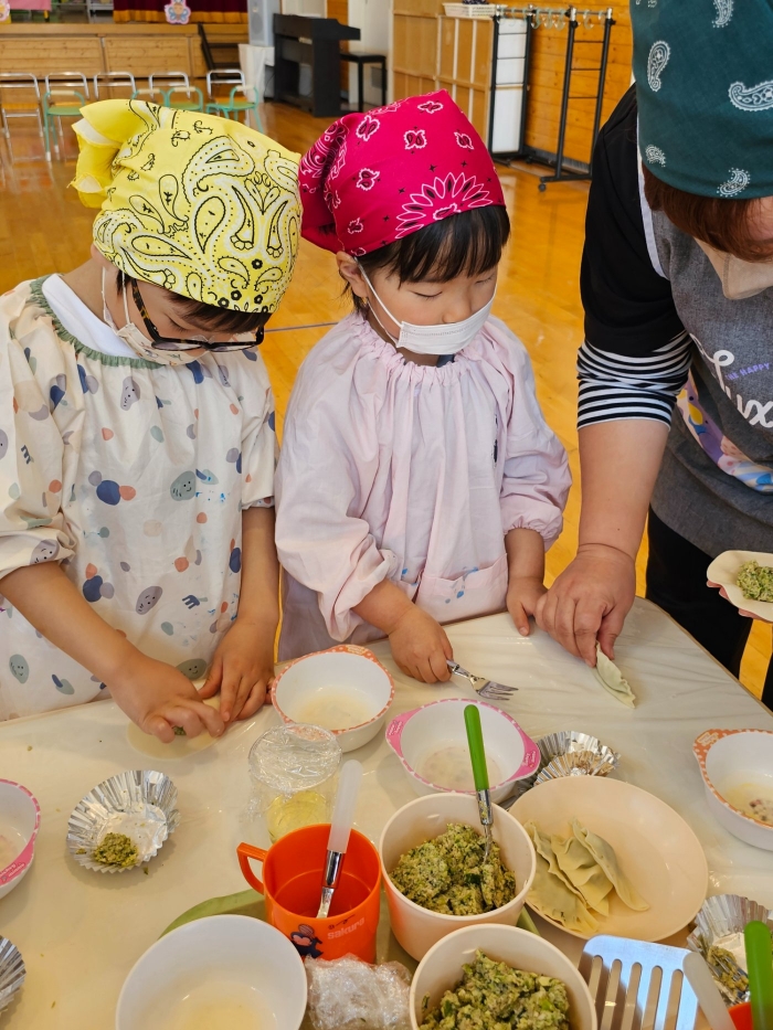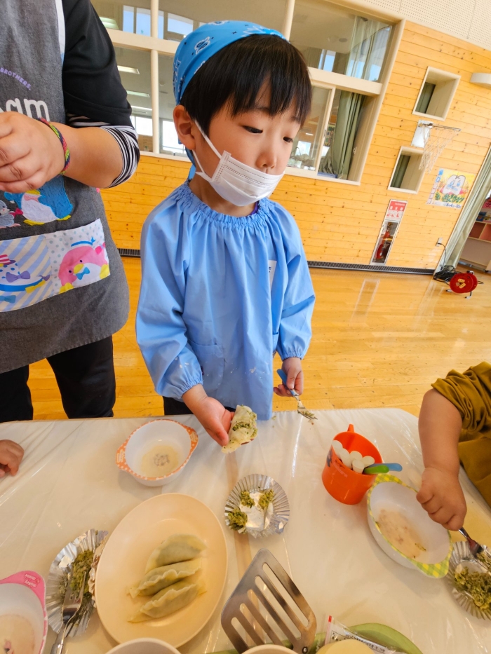お楽しみでは、餃子クッキングを行いました! 天ぷらや醬油漬けにして味わった採りたて行者ニンニクを、今度は餃子にして味わおう!と、みんなで餃子包みに挑戦しました。講師は餃子づくり名人のA先生、 行者ニンニクで作る餃子なので『行者餃子』☆彡とのネーミングも考案。『ギョージャギョーザ』、繰り返すと早口言葉にもなるのでチャレンジすることも勧められ、さっそく挑戦している子もいましたよ(^^♪ スモック、バンダナ、マスクと、クッキングスタイルになることにるんるん♪  餃子を包むことに わくわく♬  個性あふれる様々な形の餃子が出来上がりました。自分たちで作った焼きたて餃子の味はどうだったかな?