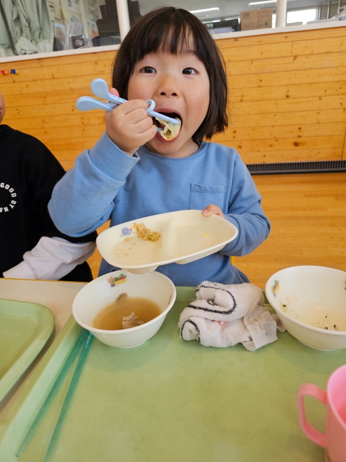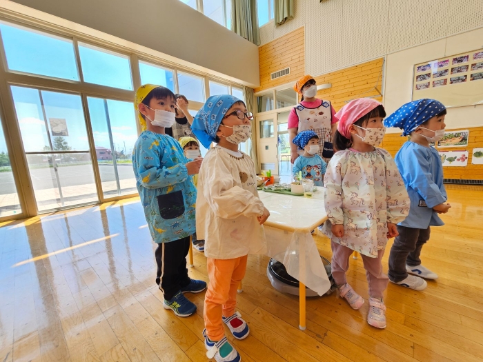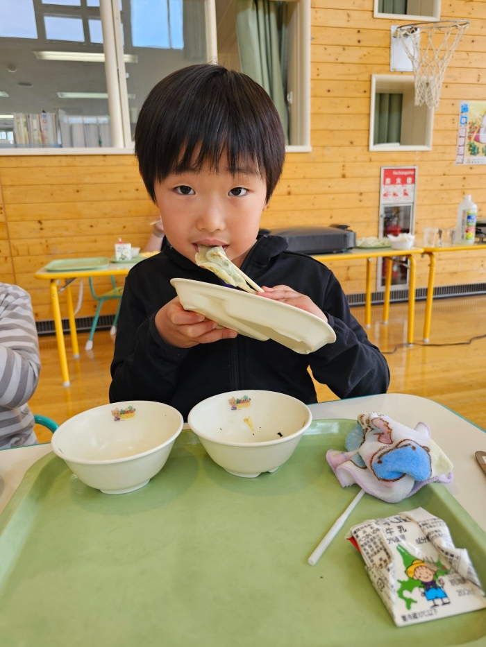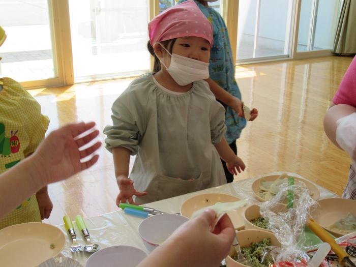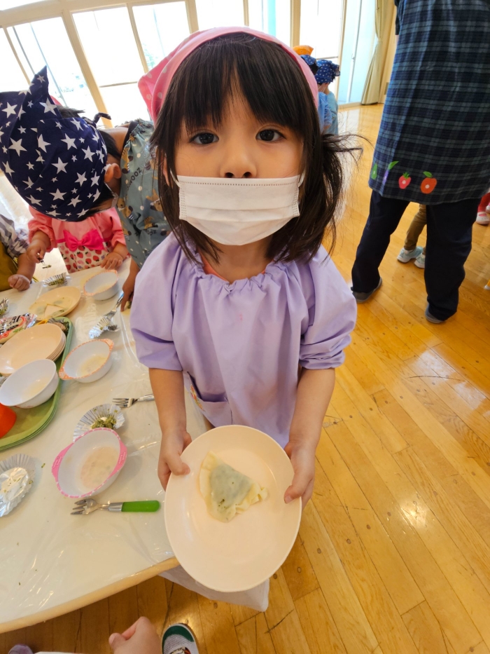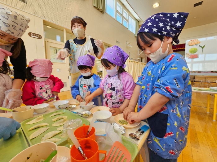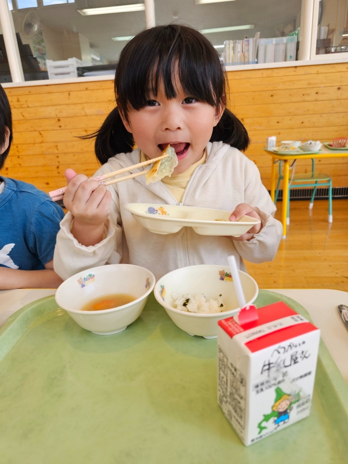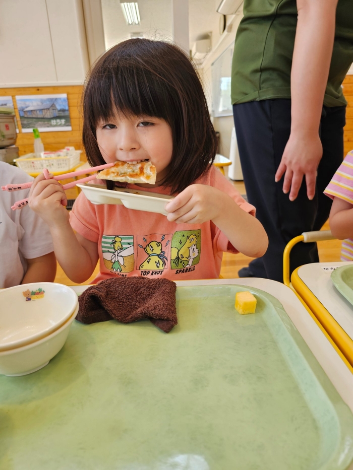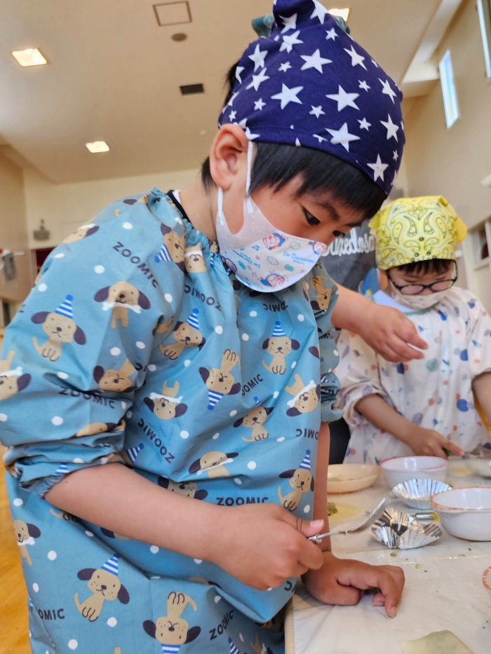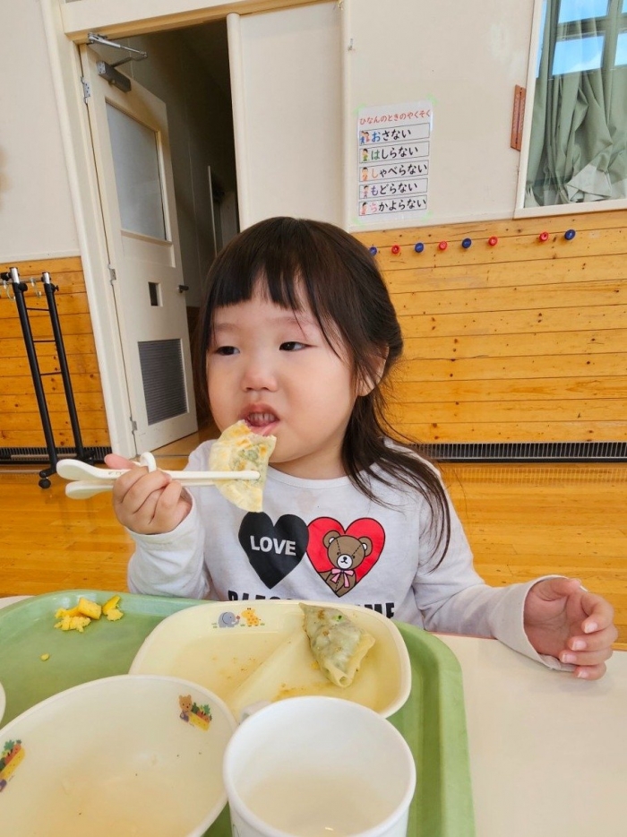 お楽しみでは、餃子クッキングを行いました! 天ぷらや醬油漬けにして味わった採りたて行者ニンニクを、今度は餃子にして味わおう!と、みんなで餃子包みに挑戦しました。講師は餃子づくり名人のA先生、 行者ニンニクで作る餃子なので『行者餃子』☆彡とのネーミングも考案。『ギョージャギョーザ』、繰り返すと早口言葉にもなるのでチャレンジすることも勧められ、さっそく挑戦している子もいましたよ(^^♪ スモック、バンダナ、マスクと、クッキングスタイルになることにるんるん♪  餃子を包むことに わくわく♬  個性あふれる様々な形の餃子が出来上がりました。自分たちで作った焼きたて餃子の味はどうだったかな?