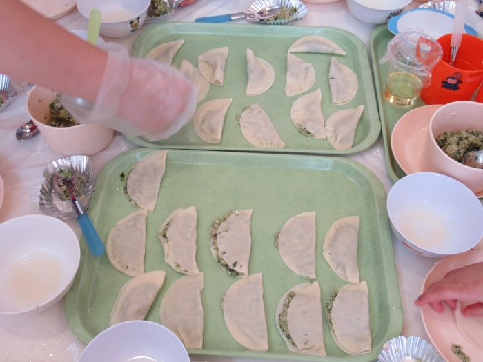 みんなが担当するギョーザの包み方も