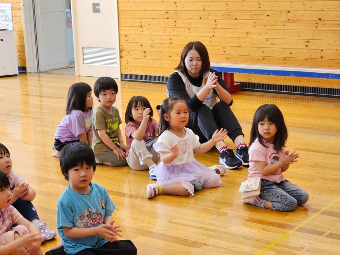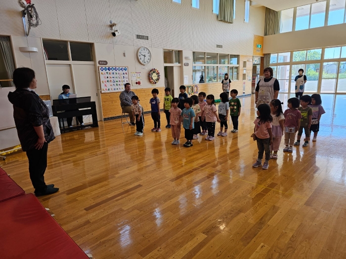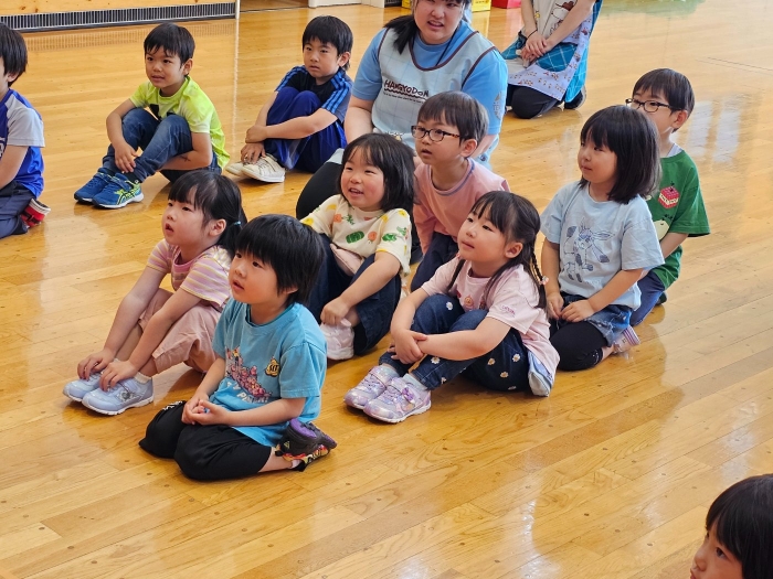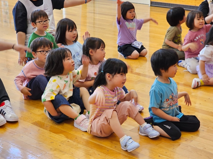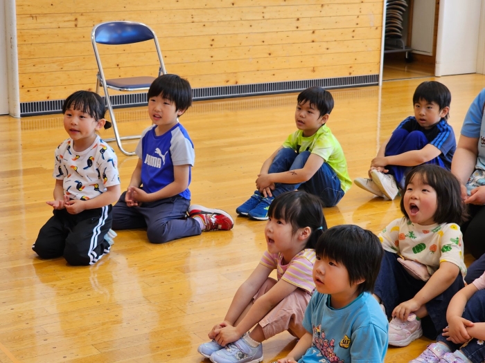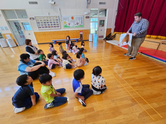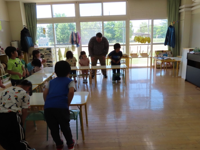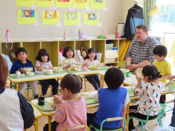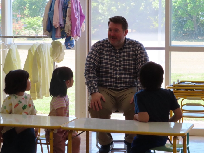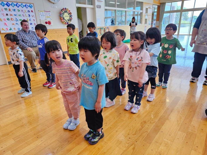 今日は『ALT(外国語指導助手)交流』で、マシュー先生が来園しました。昨年度も親しんでいるたけのこ組&つくし組は「あっ、マシュー先生だ!」と名前を覚えている子が多数! 緊張するかな?と思っていた初対面のいちご組もキラキラした目で見つめていました。