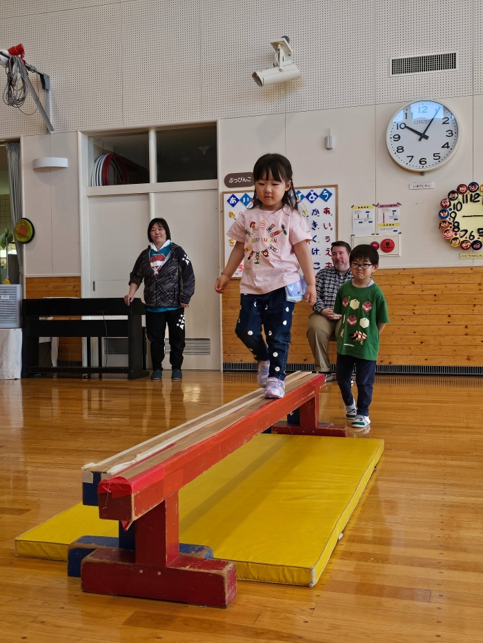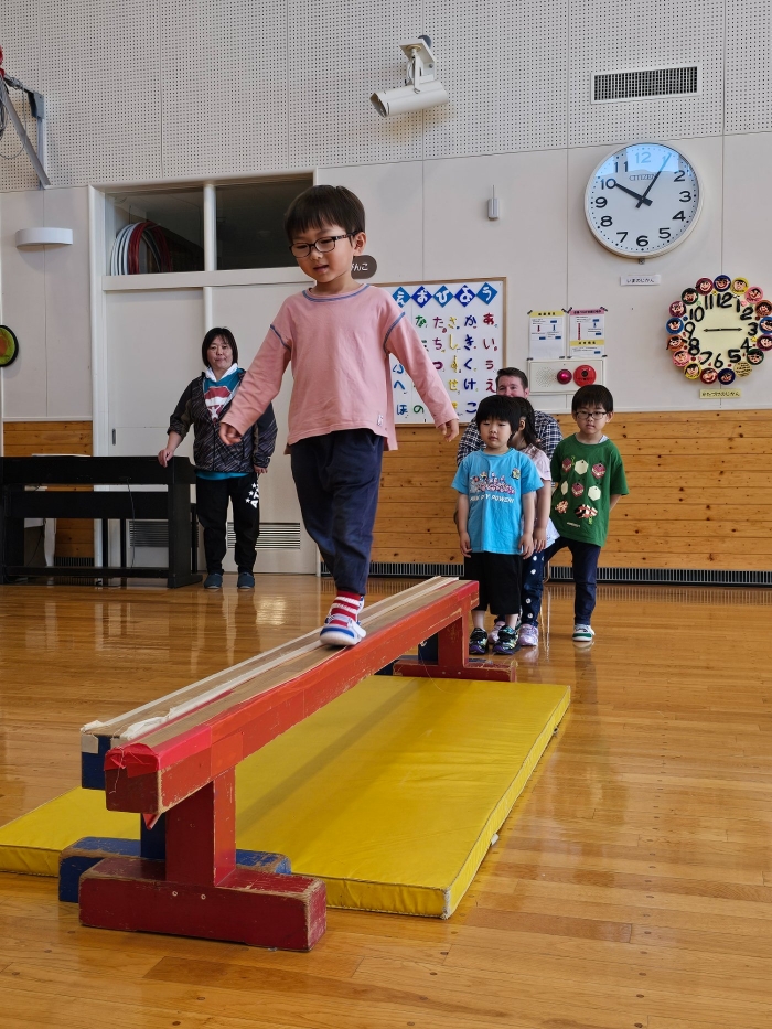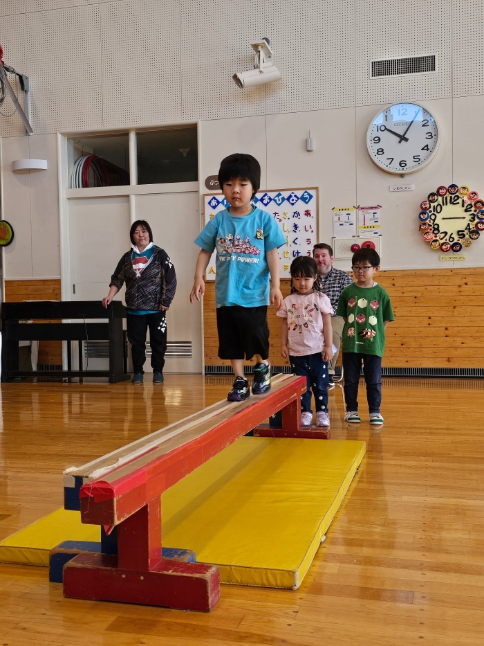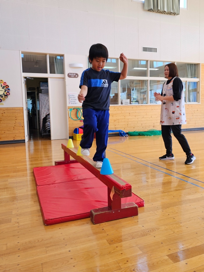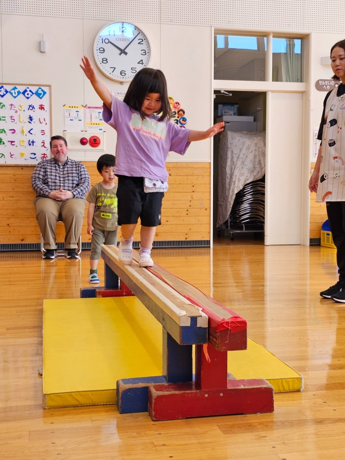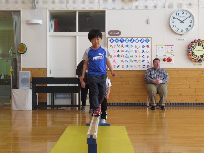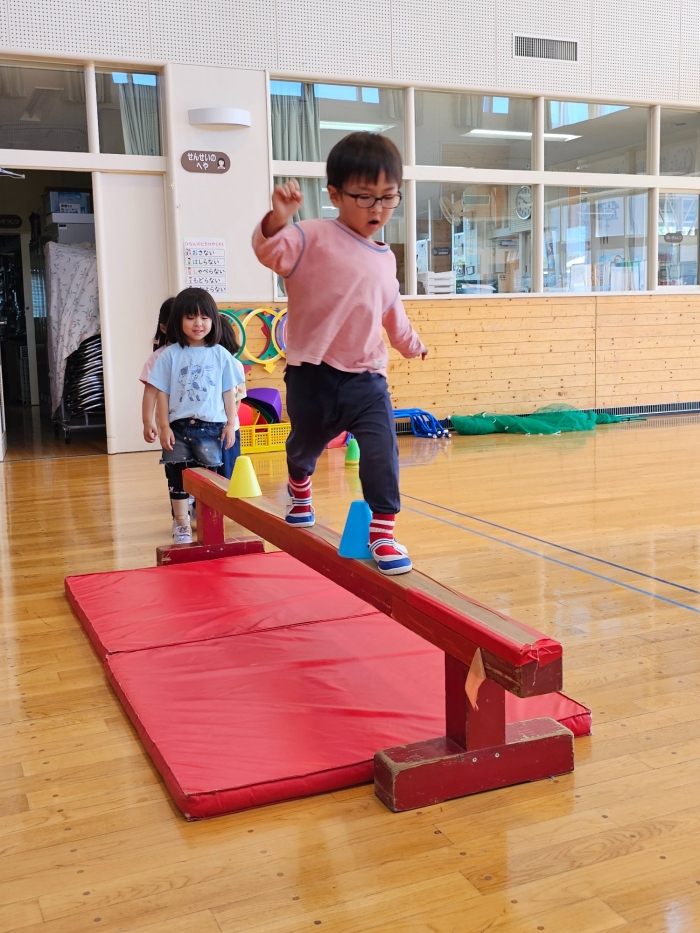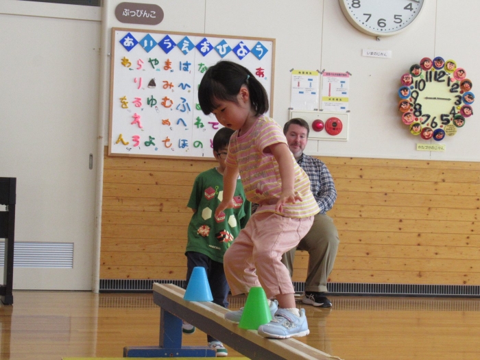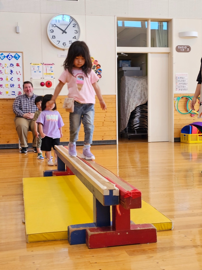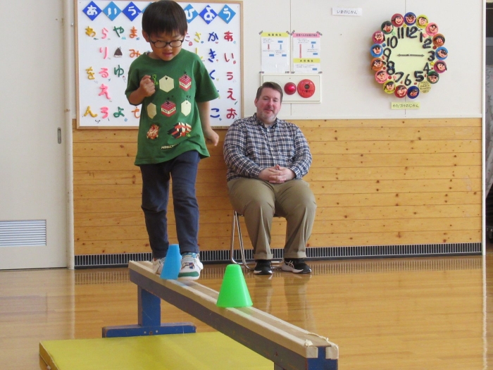 その後の『げんきっ子タイム』では、マシュー先生も一緒に『はとぽっぽ体操』! そして、今日は『平均台』を使って様々な渡り方に挑戦しました。平均台の2本合体渡り⇒ 1本渡り⇒ 障害物越え渡り(障害物~たけのこ3個、つくし2個、いちご1個)と、徐々に難易度をアップ⤴ 集中しながらじっくり渡ったり、倒れそうになっても体を持ち直したりと、集中・注意力、バランス感覚を研ぎ澄ませて取組んでいた子ども達に、たくさん拍手を送ってくれたマシュー先生です。