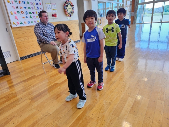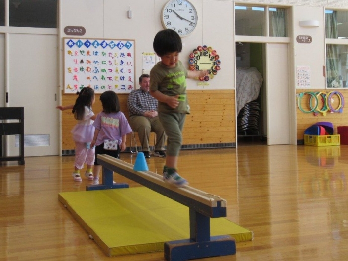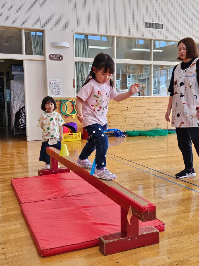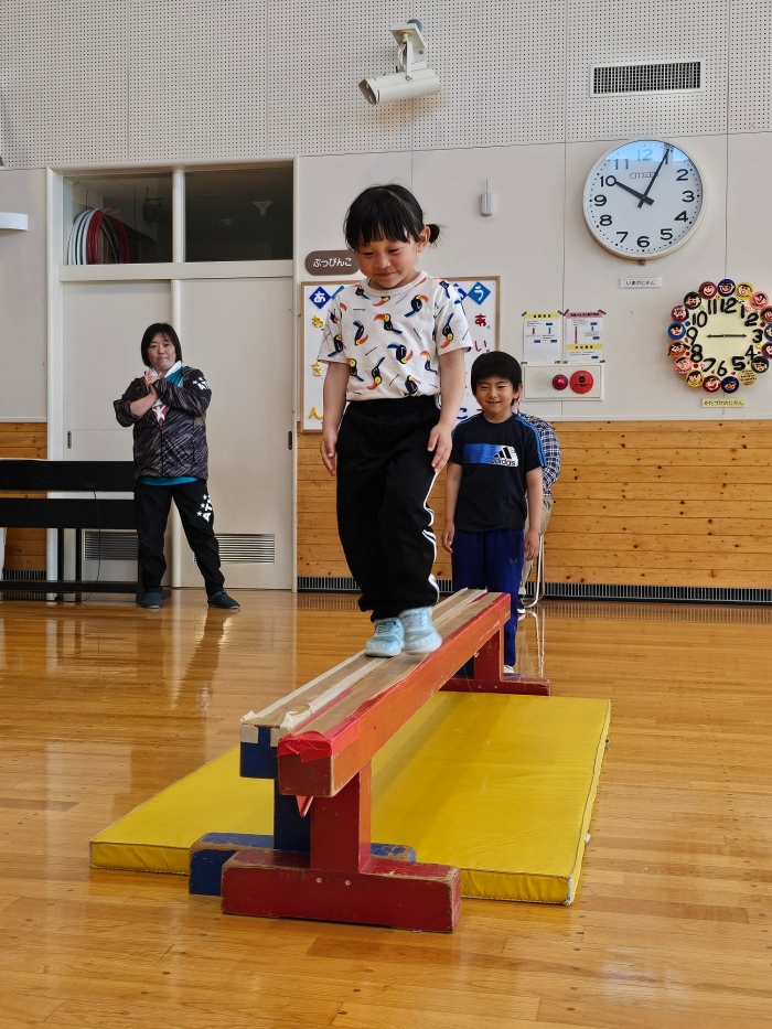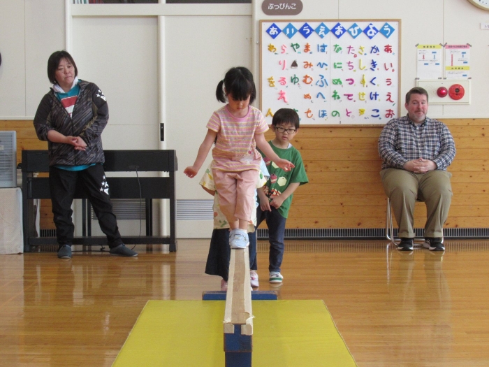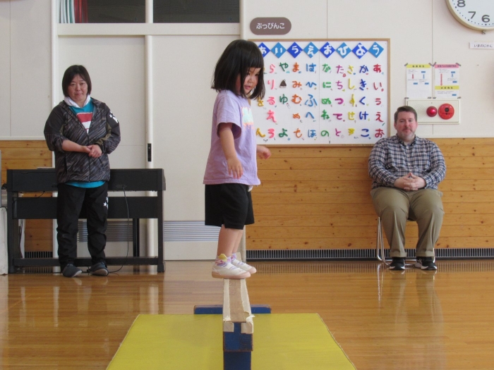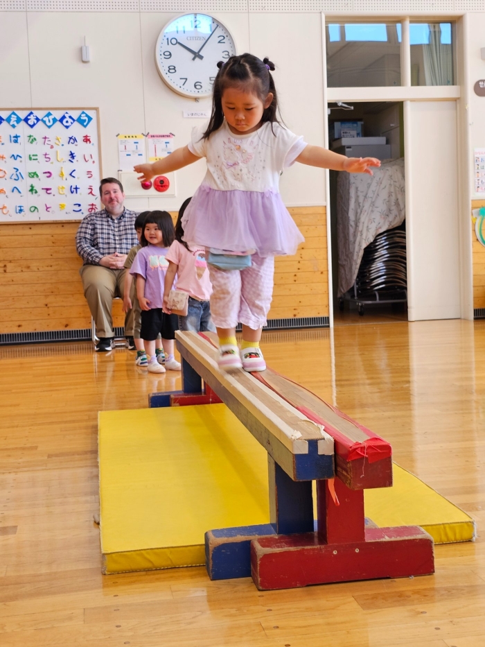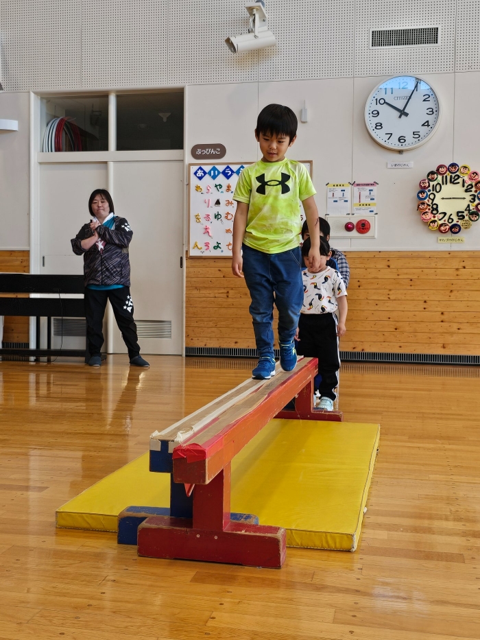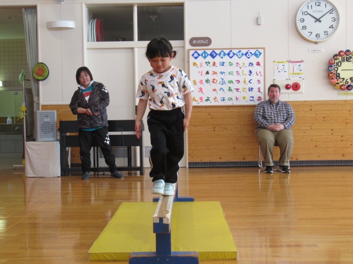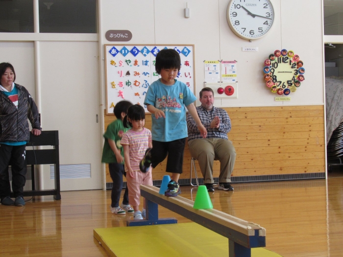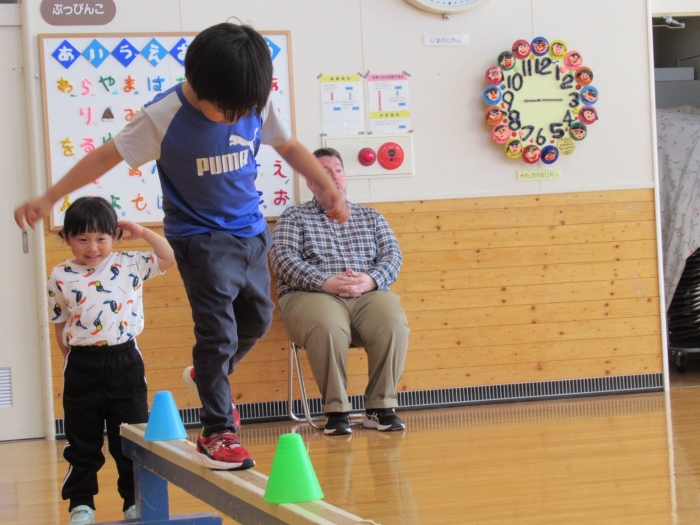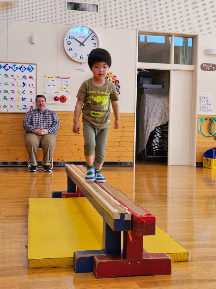 その後の『げんきっ子タイム』では、マシュー先生も一緒に『はとぽっぽ体操』! そして、今日は『平均台』を使って様々な渡り方に挑戦しました。平均台の2本合体渡り⇒ 1本渡り⇒ 障害物越え渡り(障害物~たけのこ3個、つくし2個、いちご1個)と、徐々に難易度をアップ⤴ 集中しながらじっくり渡ったり、倒れそうになっても体を持ち直したりと、集中・注意力、バランス感覚を研ぎ澄ませて取組んでいた子ども達に、たくさん拍手を送ってくれたマシュー先生です。