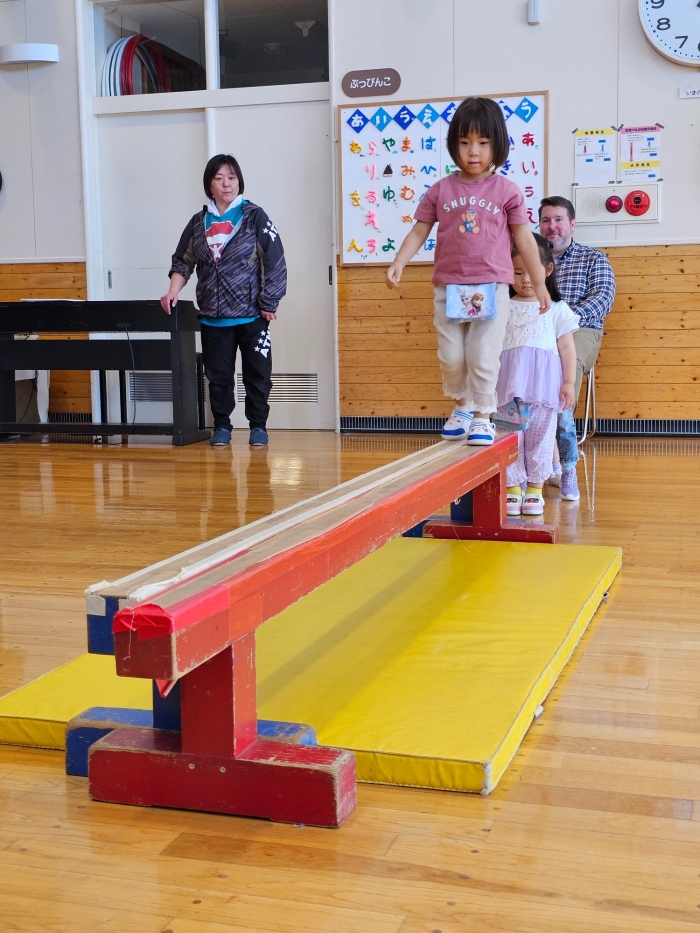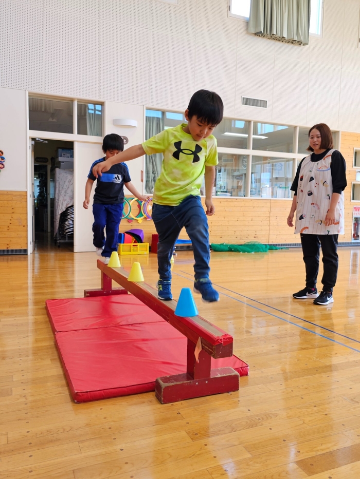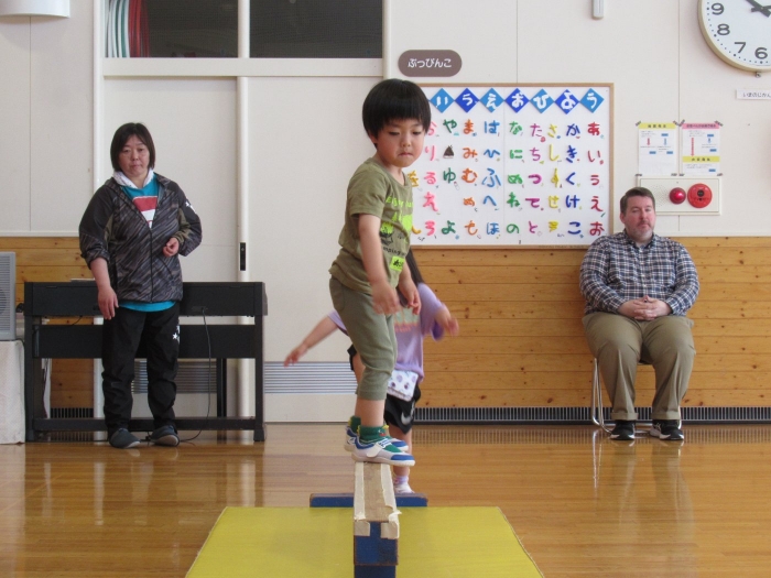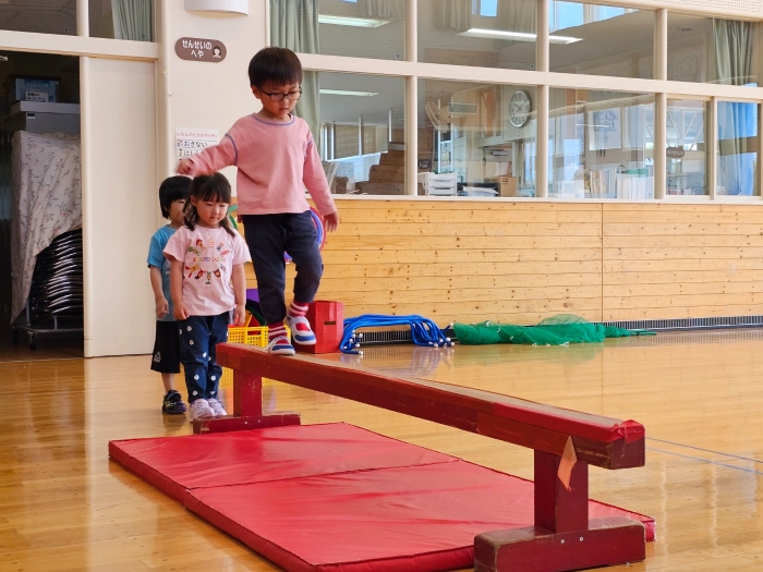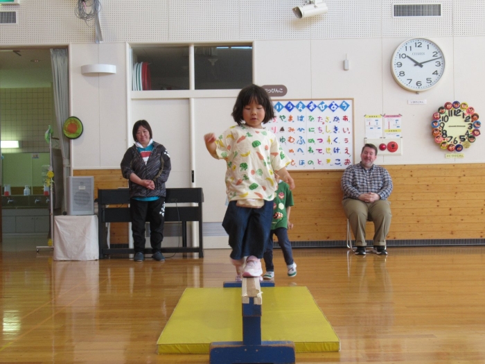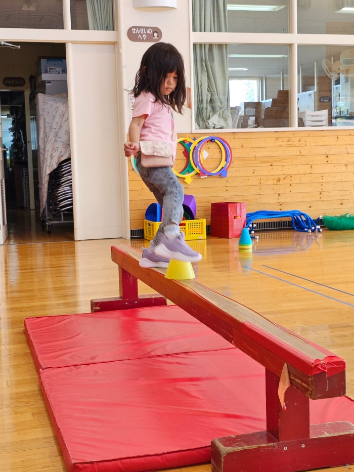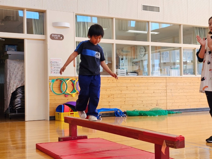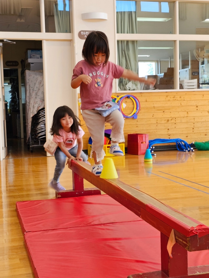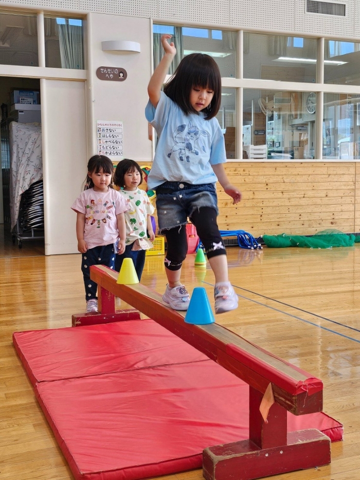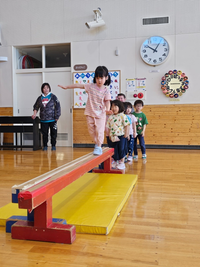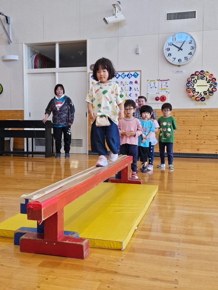 その後の『げんきっ子タイム』では、マシュー先生も一緒に『はとぽっぽ体操』! そして、今日は『平均台』を使って様々な渡り方に挑戦しました。平均台の2本合体渡り⇒ 1本渡り⇒ 障害物越え渡り(障害物~たけのこ3個、つくし2個、いちご1個)と、徐々に難易度をアップ⤴ 集中しながらじっくり渡ったり、倒れそうになっても体を持ち直したりと、集中・注意力、バランス感覚を研ぎ澄ませて取組んでいた子ども達に、たくさん拍手を送ってくれたマシュー先生です。