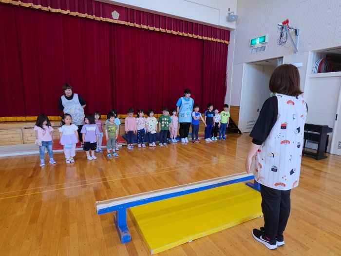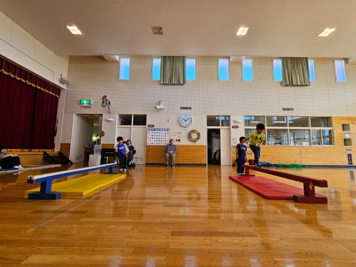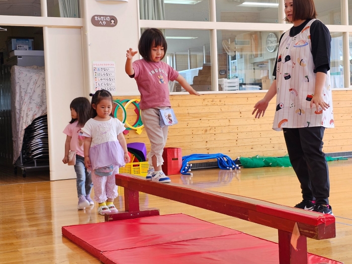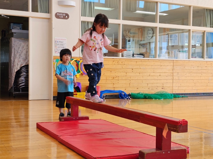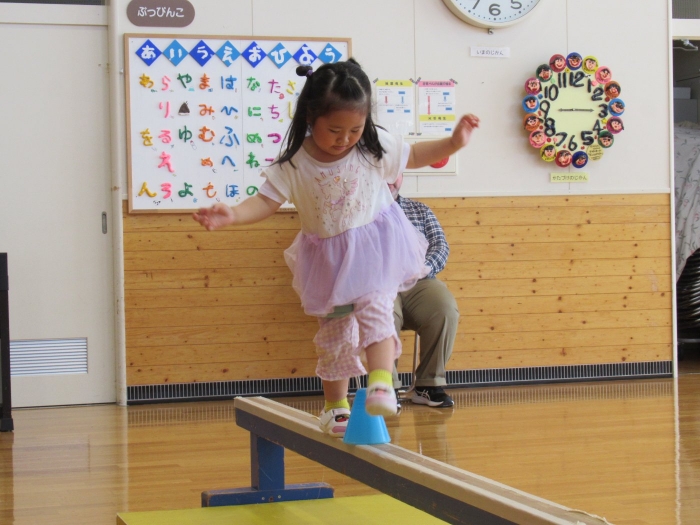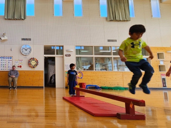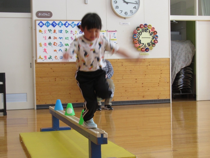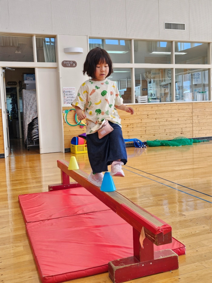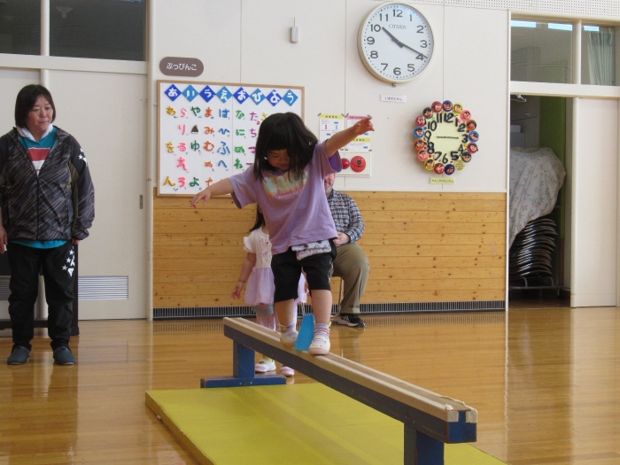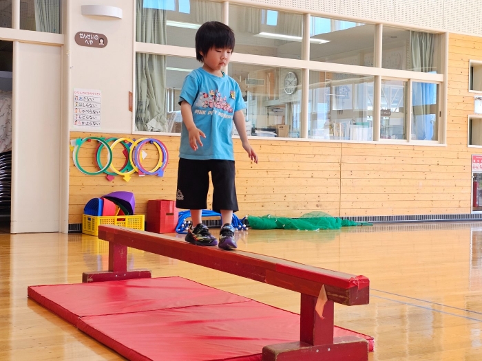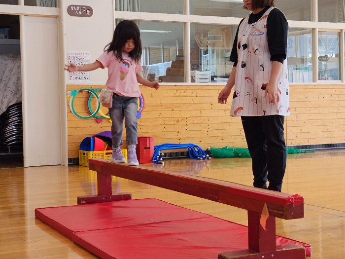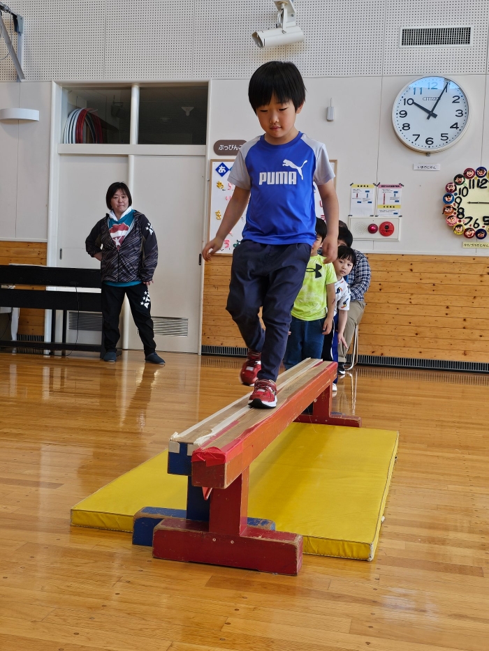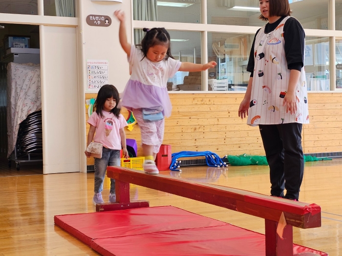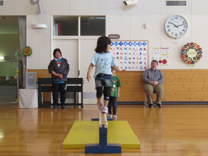 その後の『げんきっ子タイム』では、マシュー先生も一緒に『はとぽっぽ体操』! そして、今日は『平均台』を使って様々な渡り方に挑戦しました。平均台の2本合体渡り⇒ 1本渡り⇒ 障害物越え渡り(障害物~たけのこ3個、つくし2個、いちご1個)と、徐々に難易度をアップ⤴ 集中しながらじっくり渡ったり、倒れそうになっても体を持ち直したりと、集中・注意力、バランス感覚を研ぎ澄ませて取組んでいた子ども達に、たくさん拍手を送ってくれたマシュー先生です。
