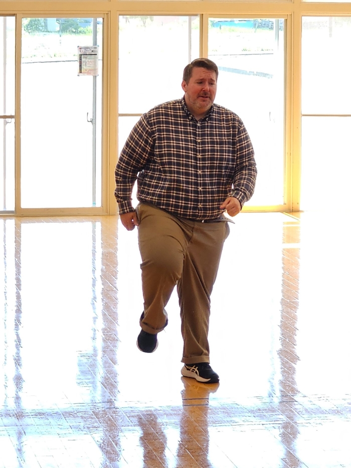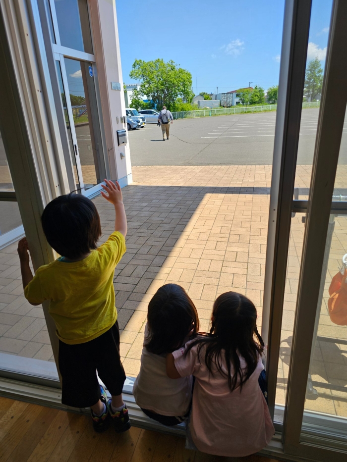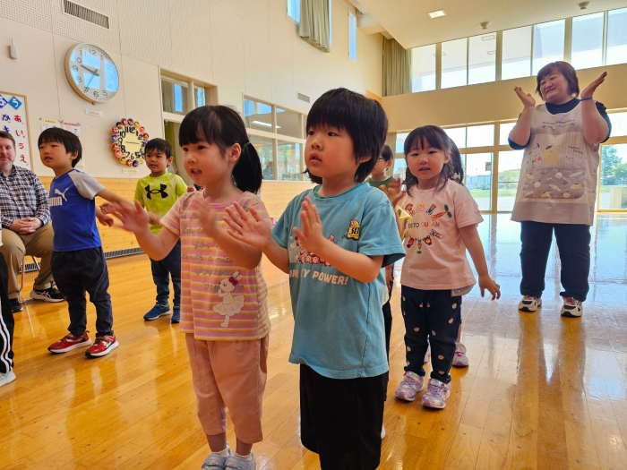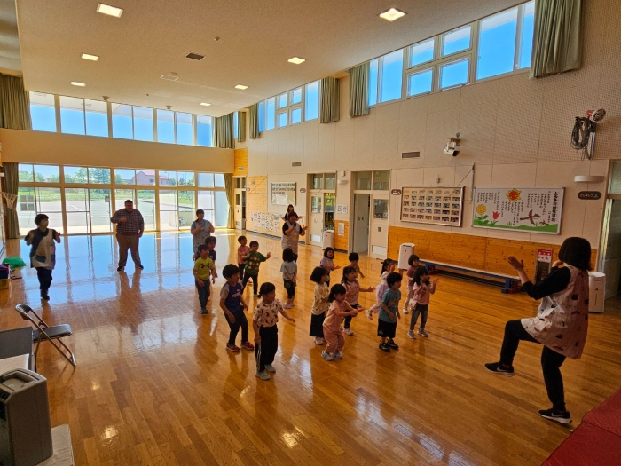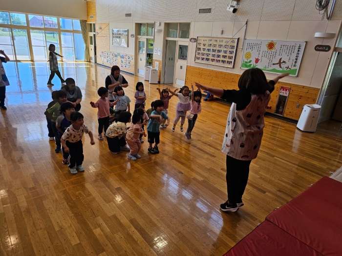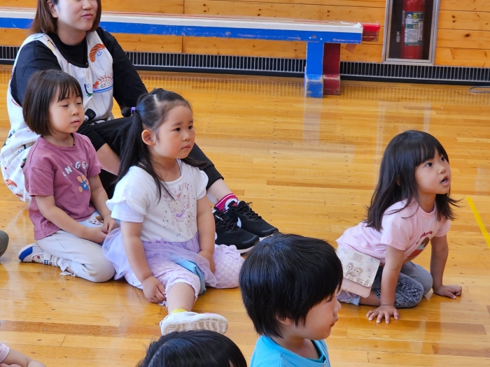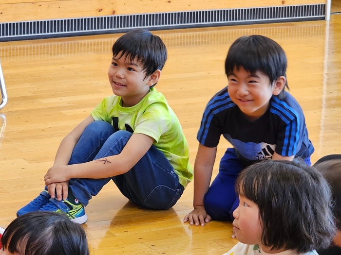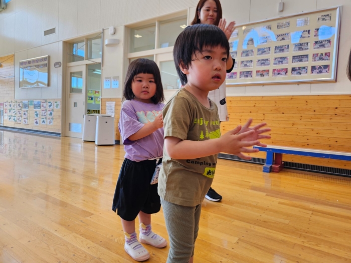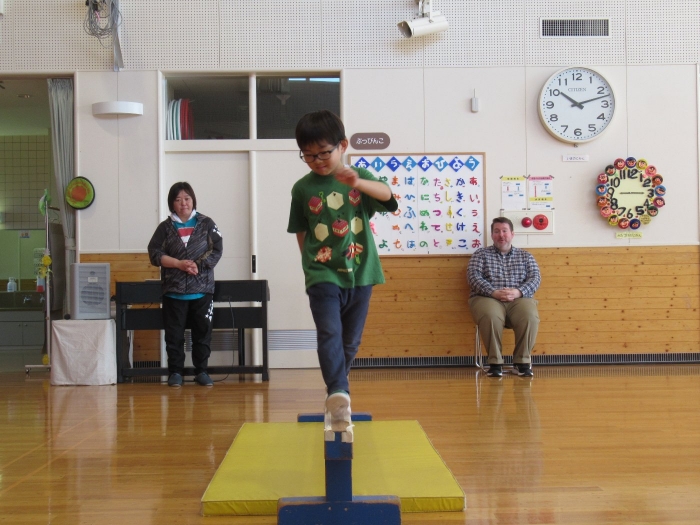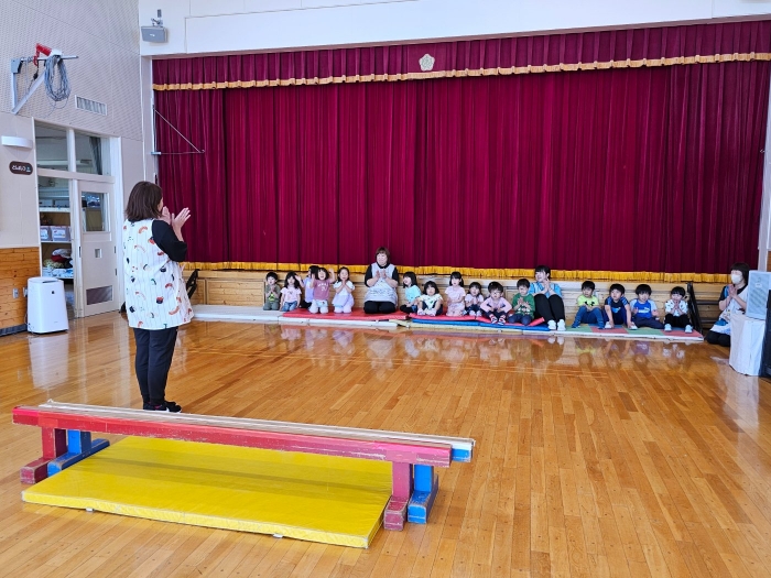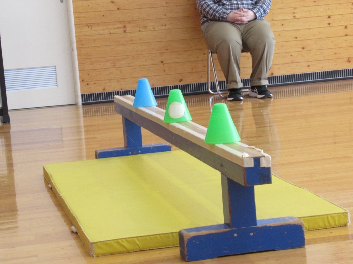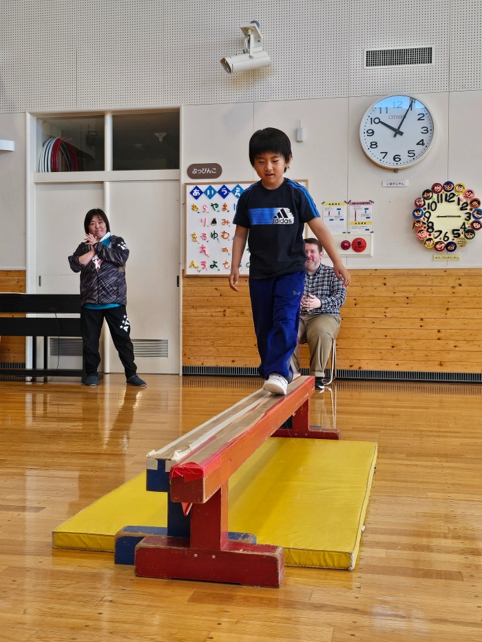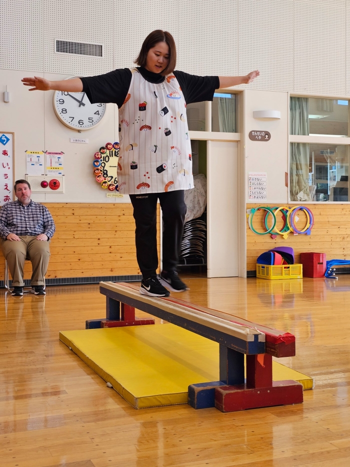 その後の『げんきっ子タイム』では、マシュー先生も一緒に『はとぽっぽ体操』! そして、今日は『平均台』を使って様々な渡り方に挑戦しました。平均台の2本合体渡り⇒ 1本渡り⇒ 障害物越え渡り(障害物~たけのこ3個、つくし2個、いちご1個)と、徐々に難易度をアップ⤴ 集中しながらじっくり渡ったり、倒れそうになっても体を持ち直したりと、集中・注意力、バランス感覚を研ぎ澄ませて取組んでいた子ども達に、たくさん拍手を送ってくれたマシュー先生です。