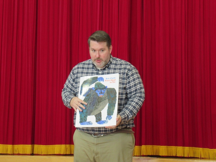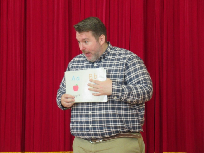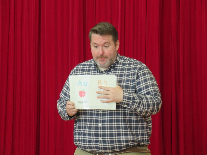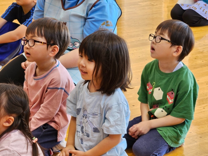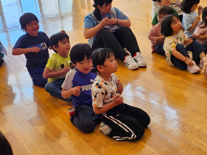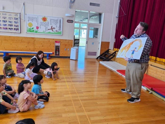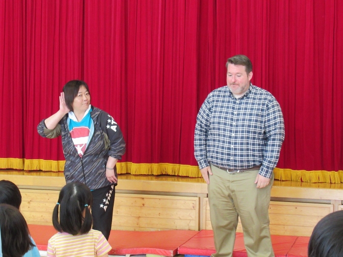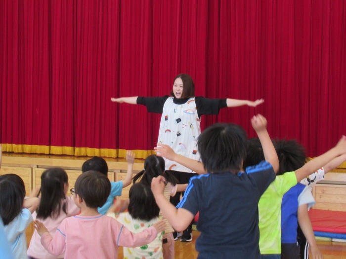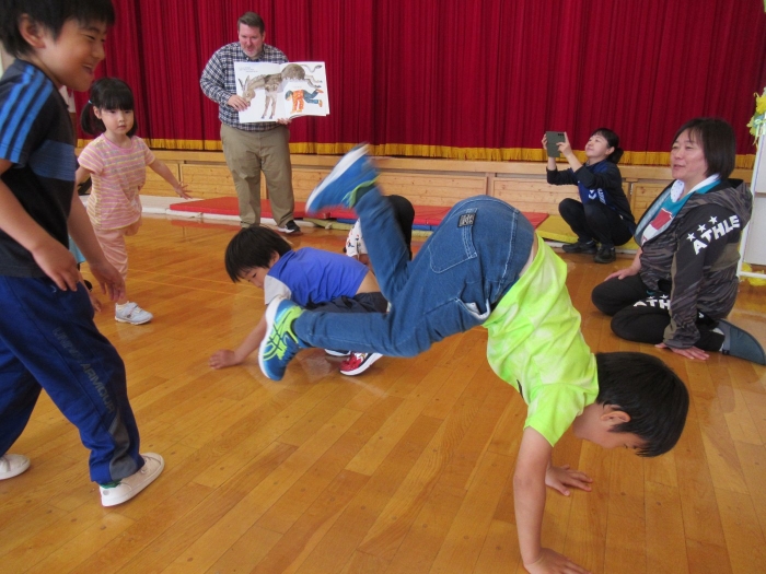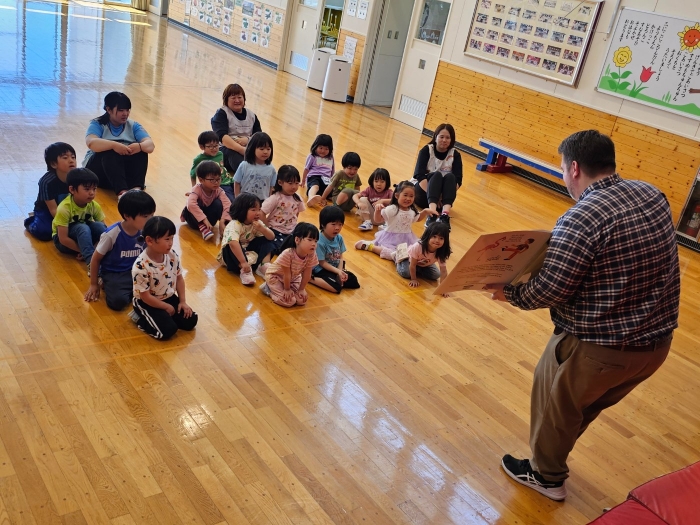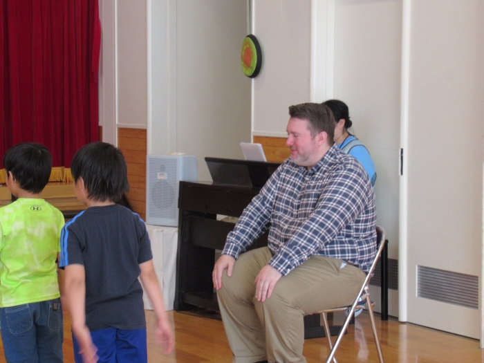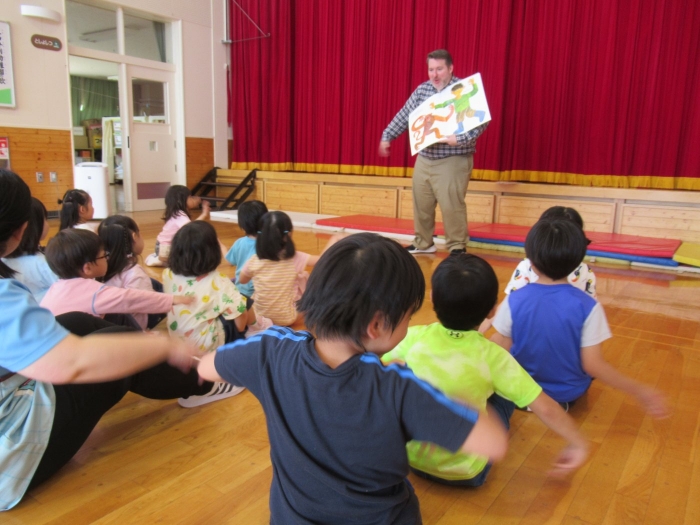 マシュー先生には『おはよう朝会』で自己紹介していただいた後、お話も担当していただきました。絵カードでの英単語リーディングでは、臆することなく英語の発音を真似たり、エリック・カールの英語絵本『できるかな? あたまからつまさきまで』の読み聞かせで 、動物の動きものまねを楽しみながら英語に親しみました。遊びながら絵カードで英単語を教えてもらったりしました。