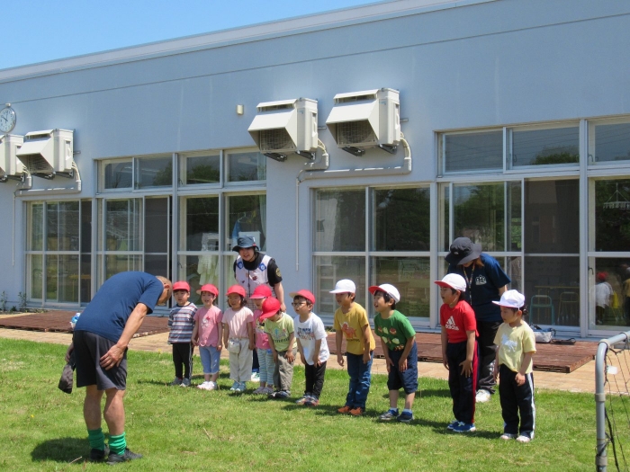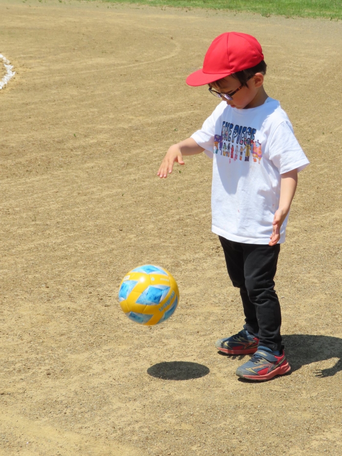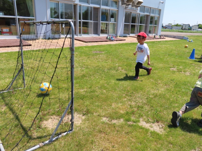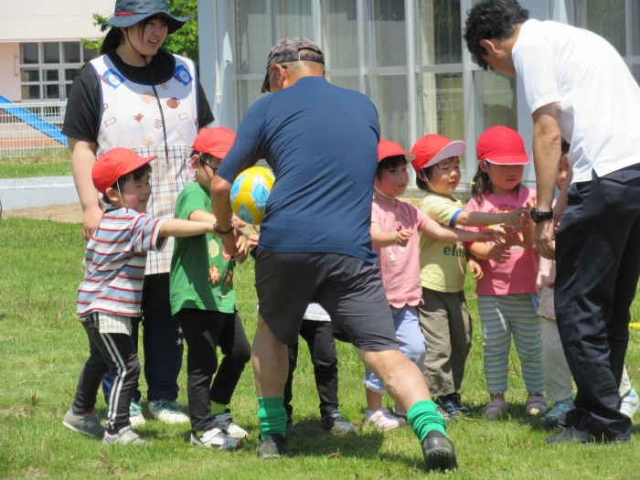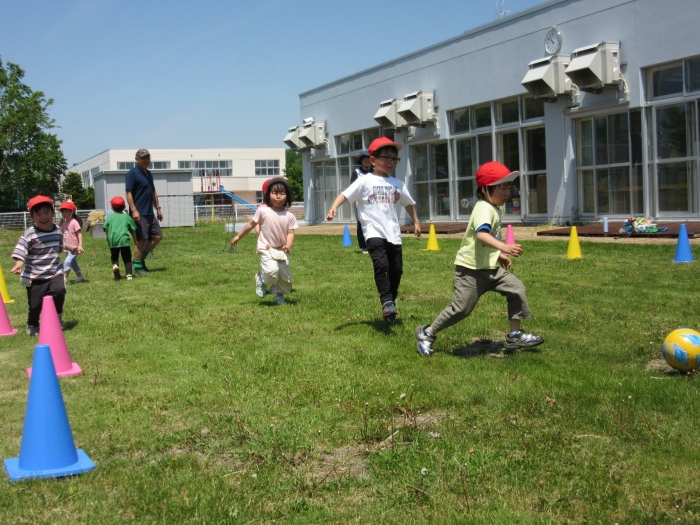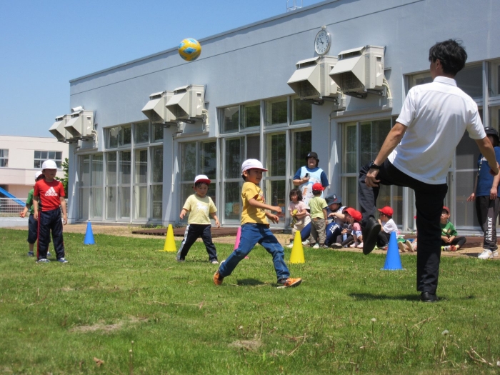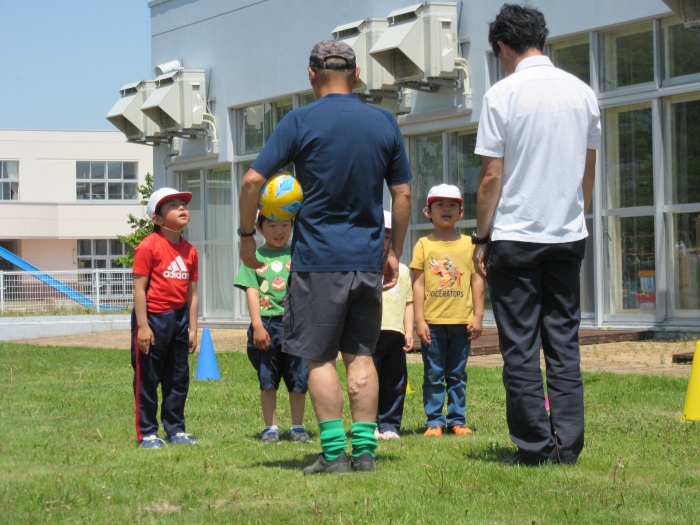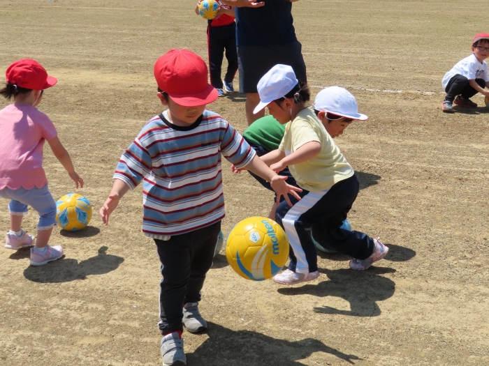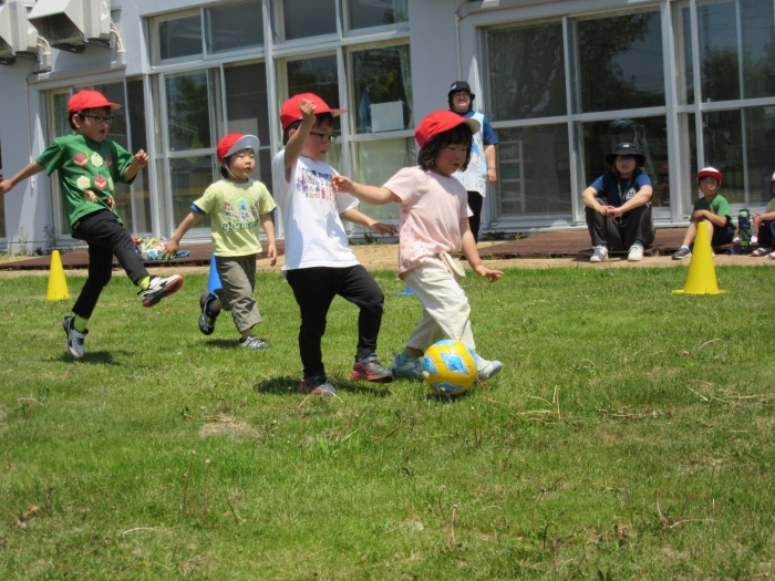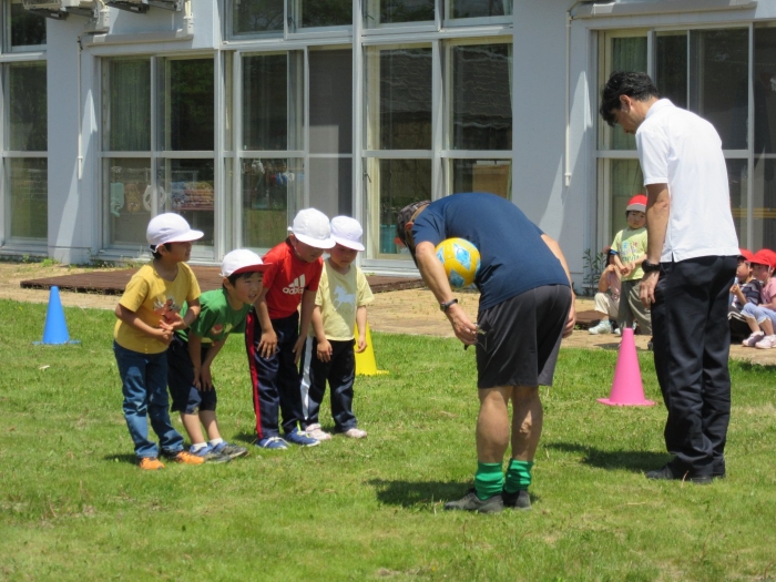 1回目の今日は、通称『祐ちゃん先生』『茂木ちゃん先生』の2名のコーチが来園し、ご指導くださいました。グラウンドのリレーコースでランニング、白線間を往復ダッシュ、白線を跨ぎ合図で左右反復回転など準備体操で体ほぐし。サッカーボールでハンドドリブル、ボールを高く投げ上げキャッチ、ドリブル&シュートで体とボールの距離感をつかむ動き。そして、最後はたけのこ組VSコーチ・つくし組VSコーチのミニ試合! サッカーでの様々な動きを通してスポーツの楽しさを教えてくださいました。