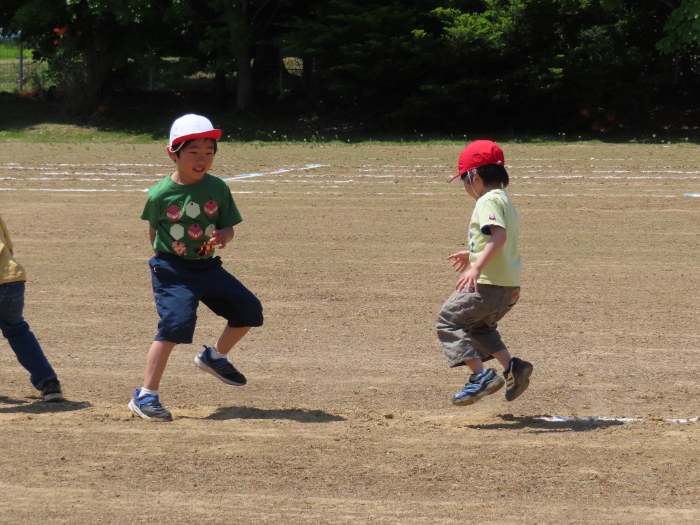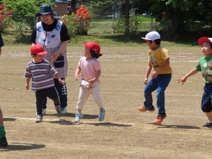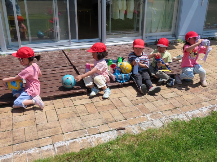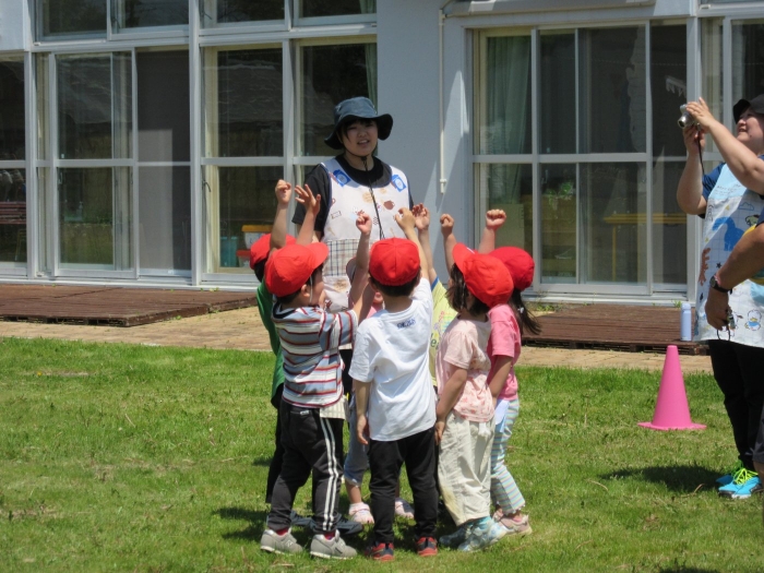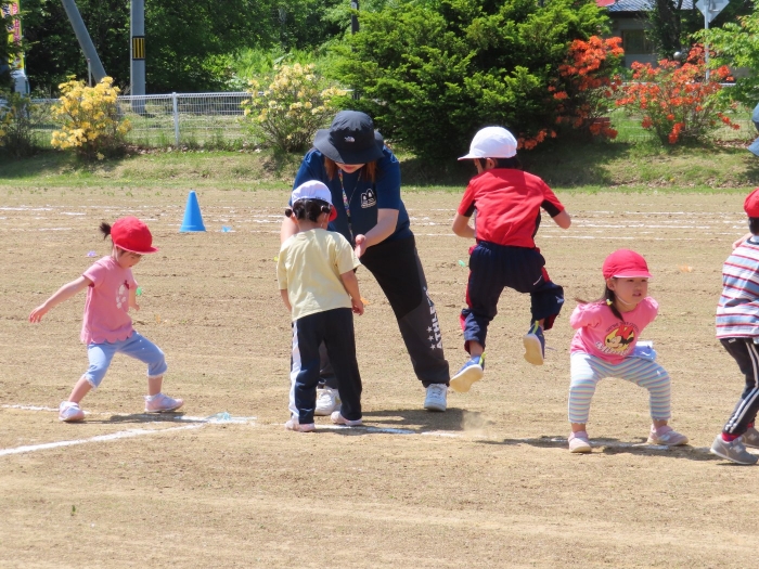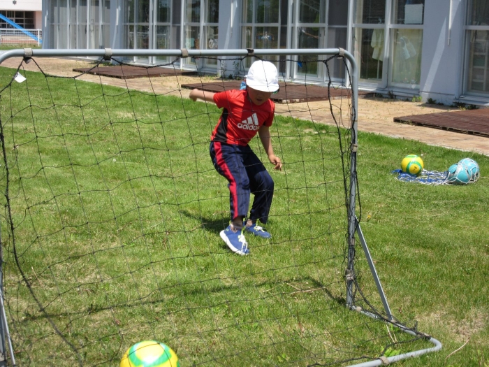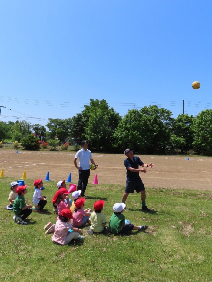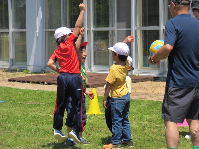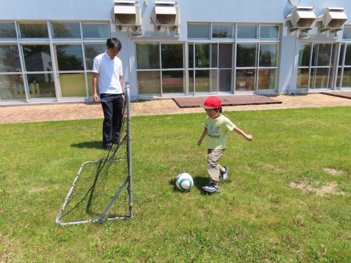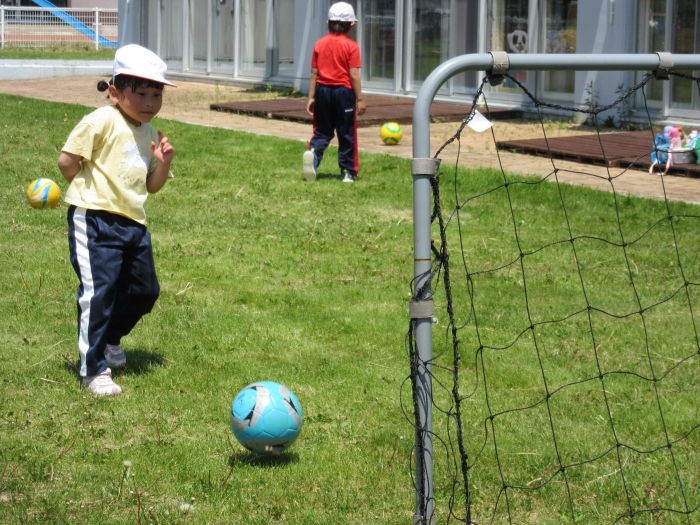 1回目の今日は、通称『祐ちゃん先生』『茂木ちゃん先生』の2名のコーチが来園し、ご指導くださいました。グラウンドのリレーコースでランニング、白線間を往復ダッシュ、白線を跨ぎ合図で左右反復回転など準備体操で体ほぐし。サッカーボールでハンドドリブル、ボールを高く投げ上げキャッチ、ドリブル&シュートで体とボールの距離感をつかむ動き。そして、最後はたけのこ組VSコーチ・つくし組VSコーチのミニ試合! サッカーでの様々な動きを通してスポーツの楽しさを教えてくださいました。