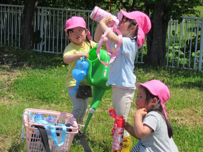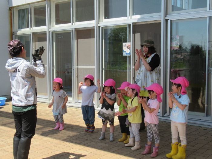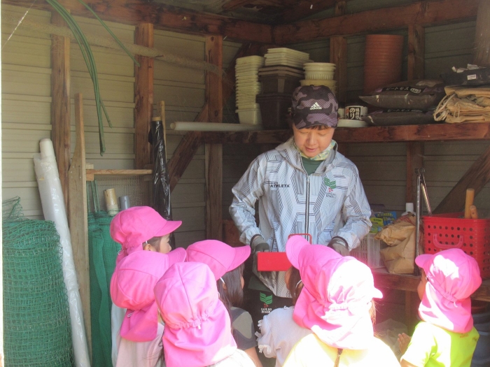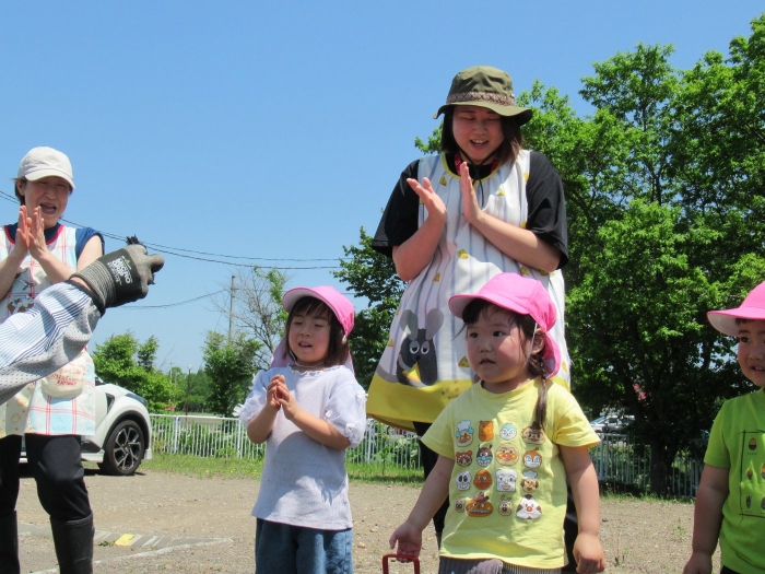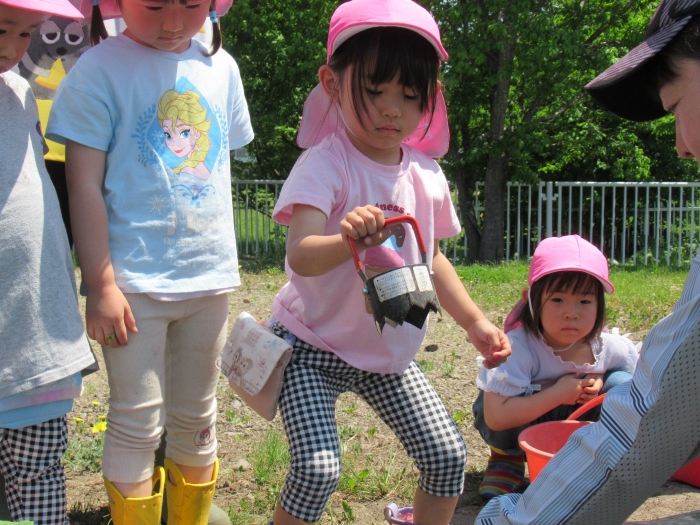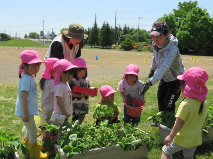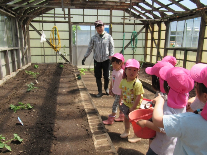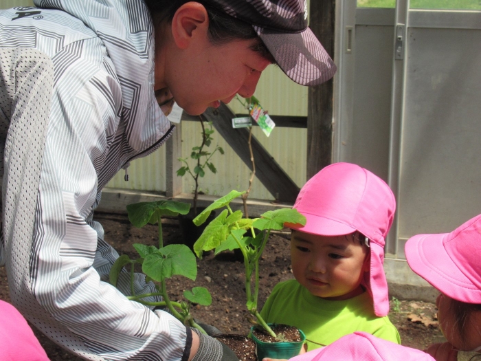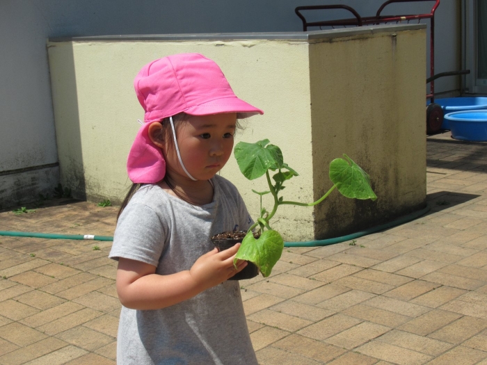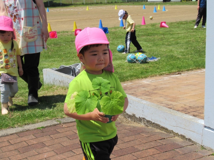 秋には、子ども達が想像しているようなハロウィンカボチャができるように、これから毎日お世話することを誓い合ったいちご組。Hくんのお家でも同様の苗を植えたそうですが、無事に実りを迎えた時には、どのくらい育ったのか、大きさ比べ・重さ比べも楽しみたいですね (^^♪