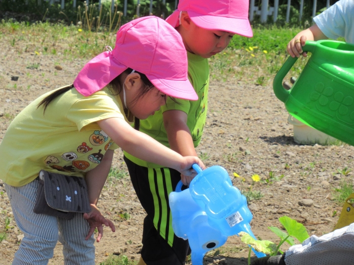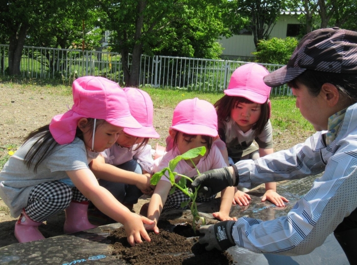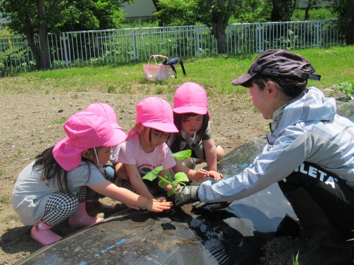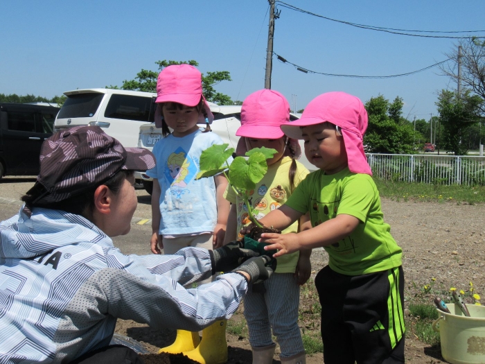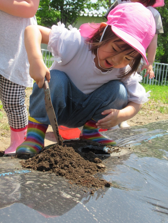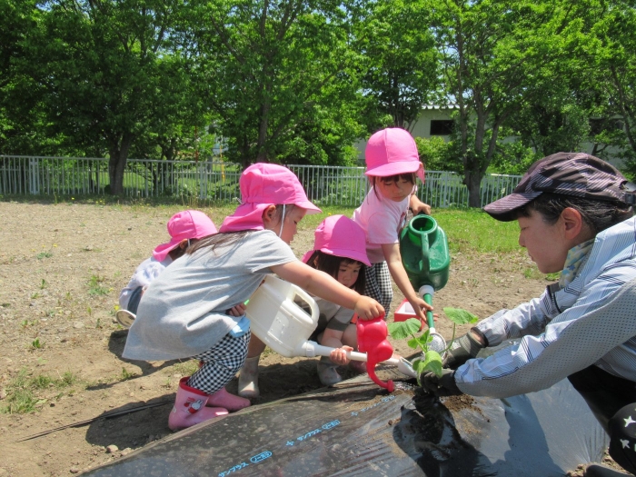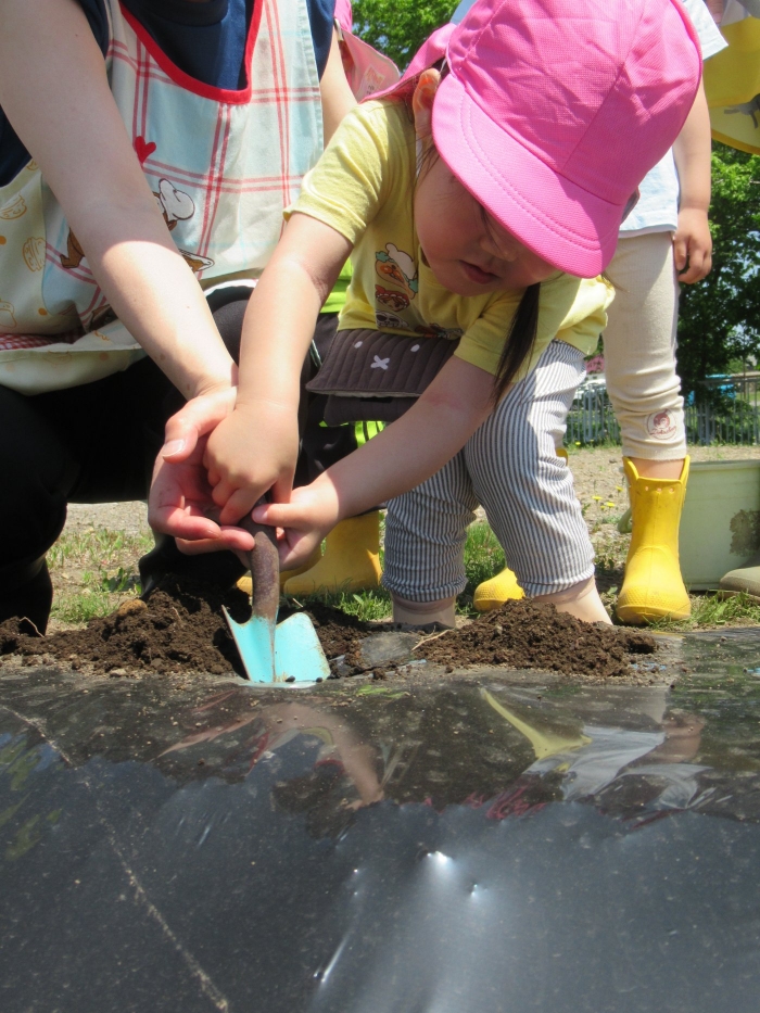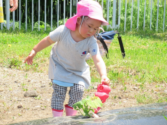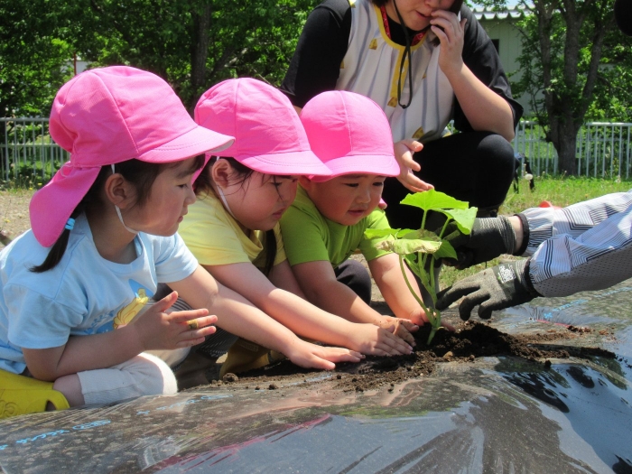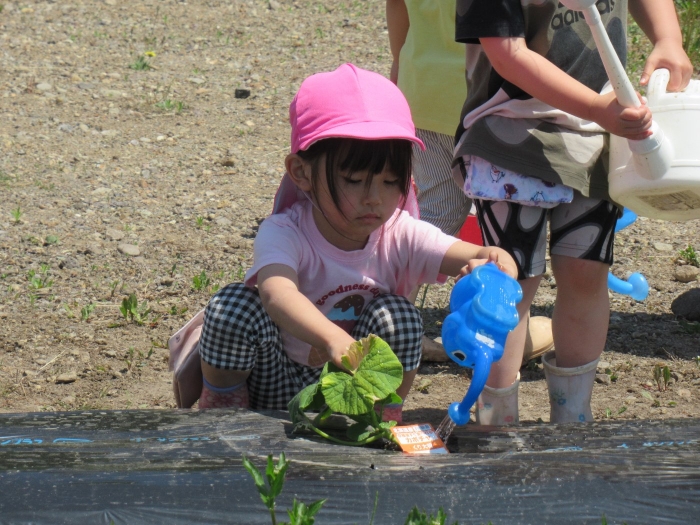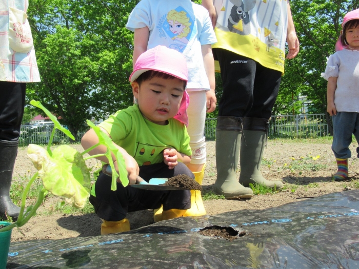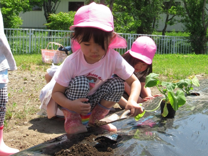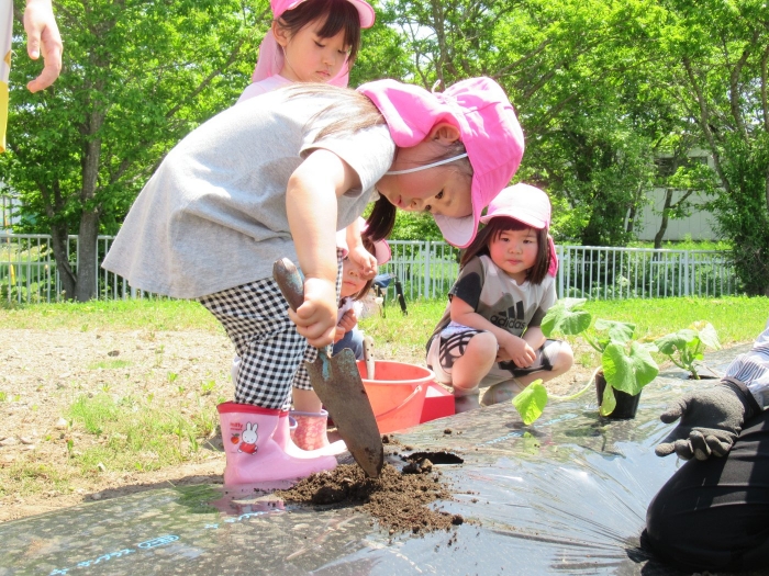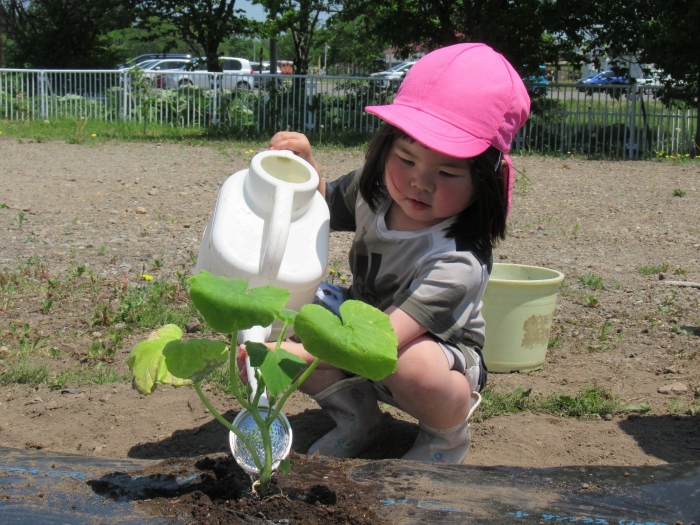 いちご組Hくんのお家から、『おばけカボチャ』の苗をいただきました☆彡 せっかくなのでクラスのみんなで植えよう!と、自分たちで物置から畑道具を、ハウスから苗を大事に運搬。つくし組がカボチャ苗を植えた職員駐車場側の花壇に一緒に植えました。マルチシート用のハンディーカッターで穴を開け、シャベルで穴を掘り、苗を入れて優しく土を被せ、ジョーロで水をたっぷり注ぐ…、真夏日和の暑さの中でしたが友達と譲り合ったり力を合わせたり一連の農作業をやり切りました。最後は「おおきくな~れ~!」と、いちご組の元気パワーもたっぷりと注入しましたよ!