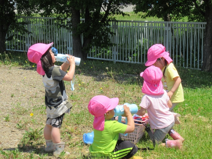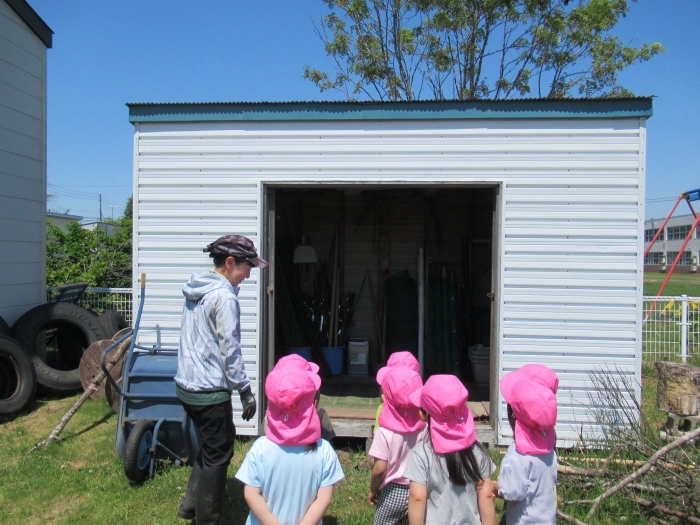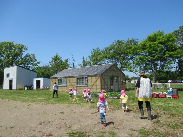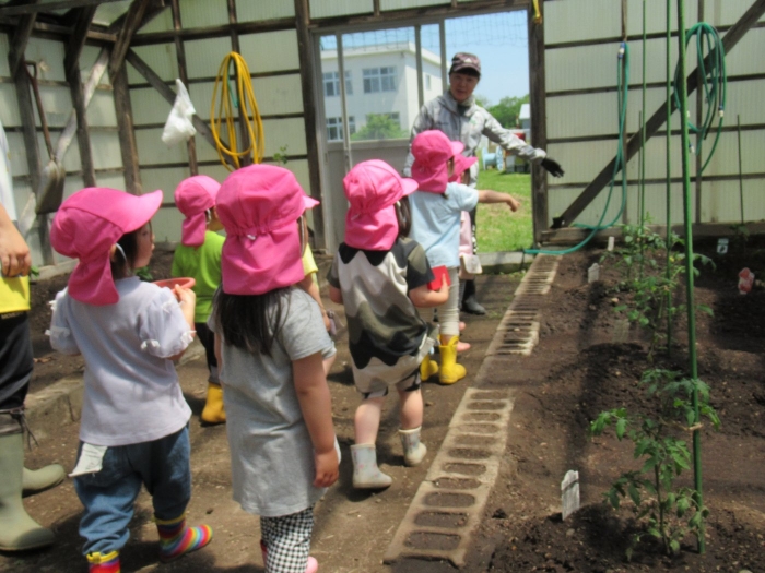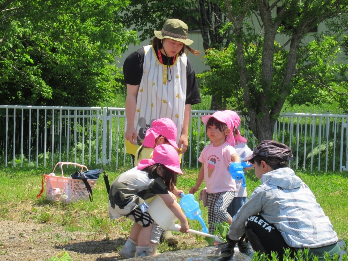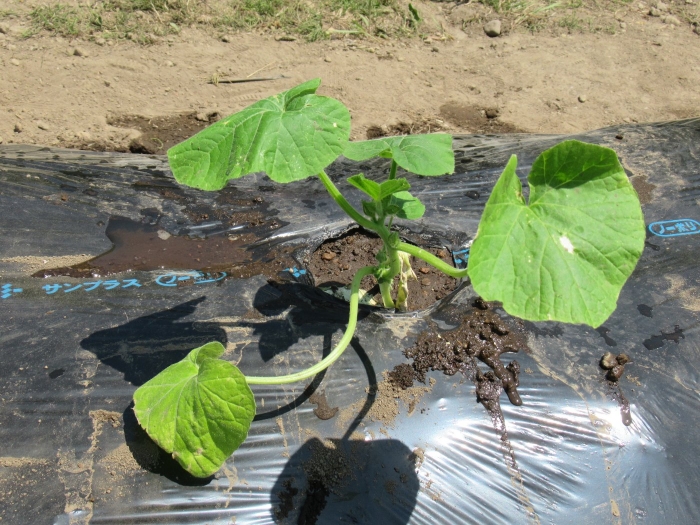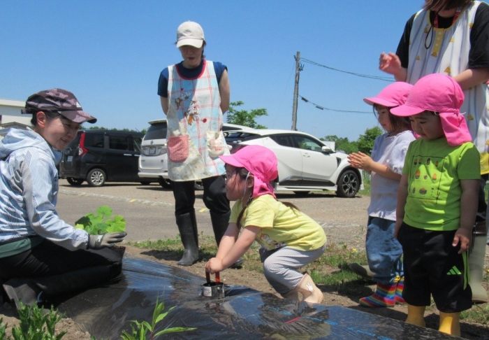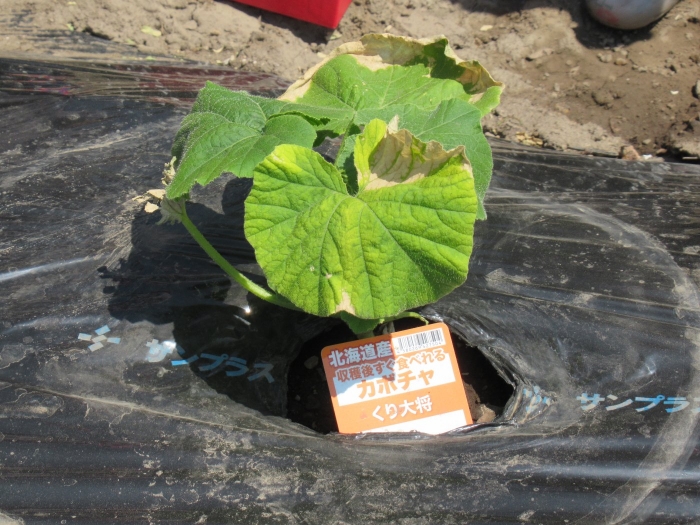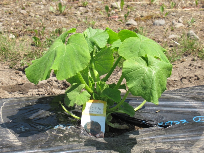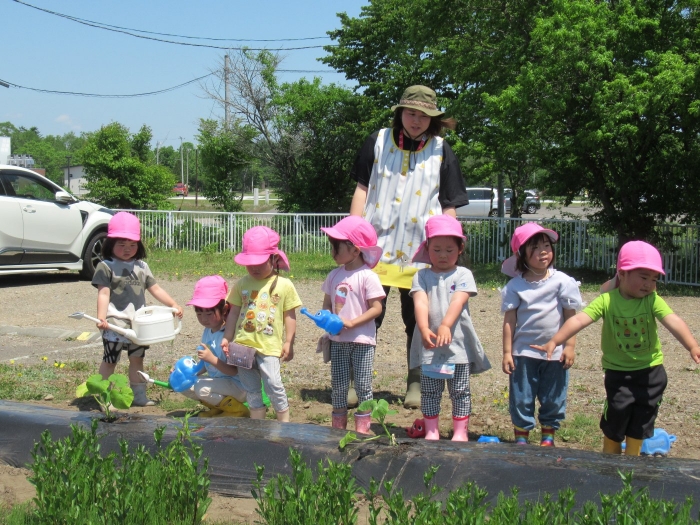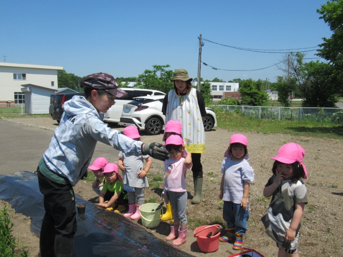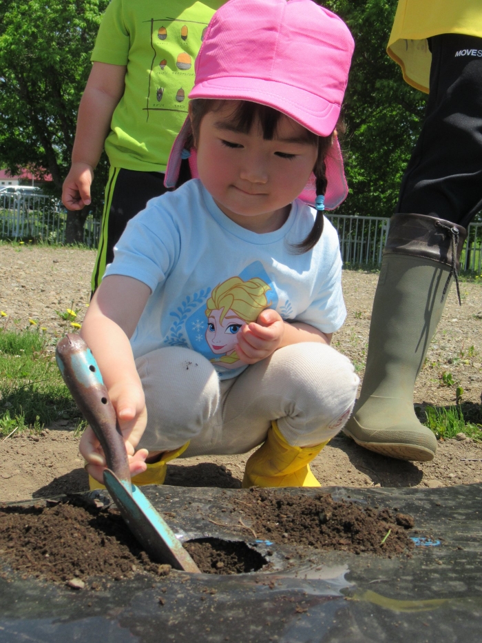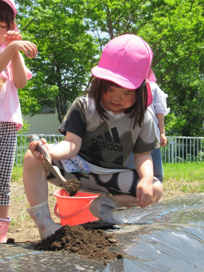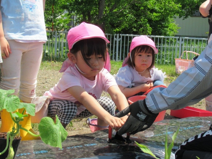 いちご組Hくんのお家から、『おばけカボチャ』の苗をいただきました☆彡 せっかくなのでクラスのみんなで植えよう!と、自分たちで物置から畑道具を、ハウスから苗を大事に運搬。つくし組がカボチャ苗を植えた職員駐車場側の花壇に一緒に植えました。マルチシート用のハンディーカッターで穴を開け、シャベルで穴を掘り、苗を入れて優しく土を被せ、ジョーロで水をたっぷり注ぐ…、真夏日和の暑さの中でしたが友達と譲り合ったり力を合わせたり一連の農作業をやり切りました。最後は「おおきくな~れ~!」と、いちご組の元気パワーもたっぷりと注入しましたよ!