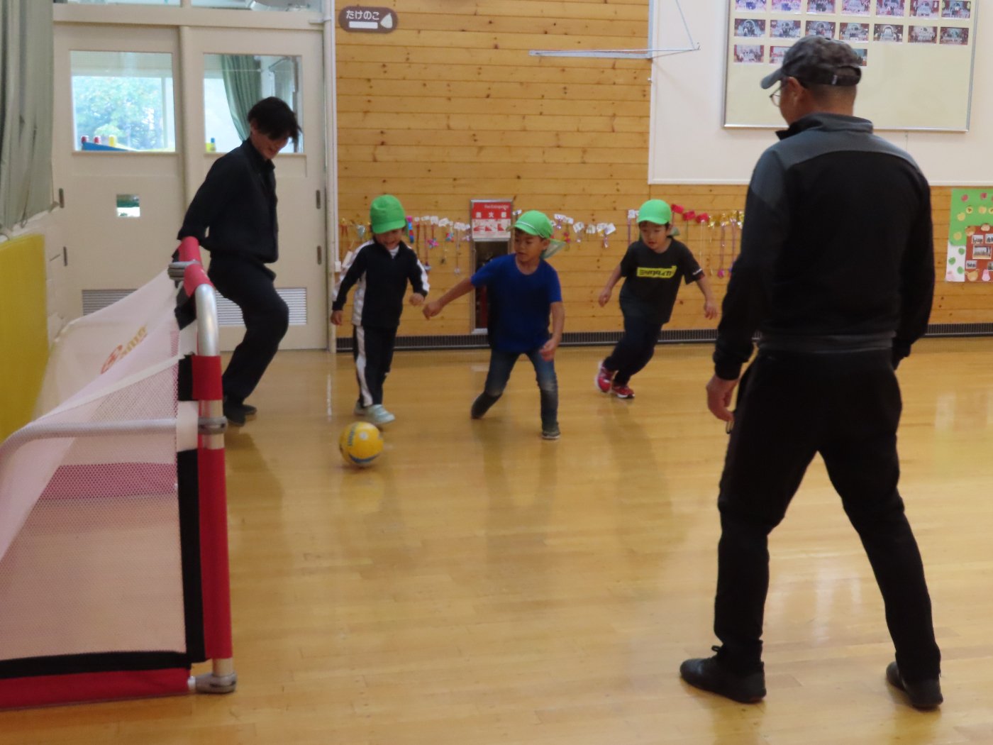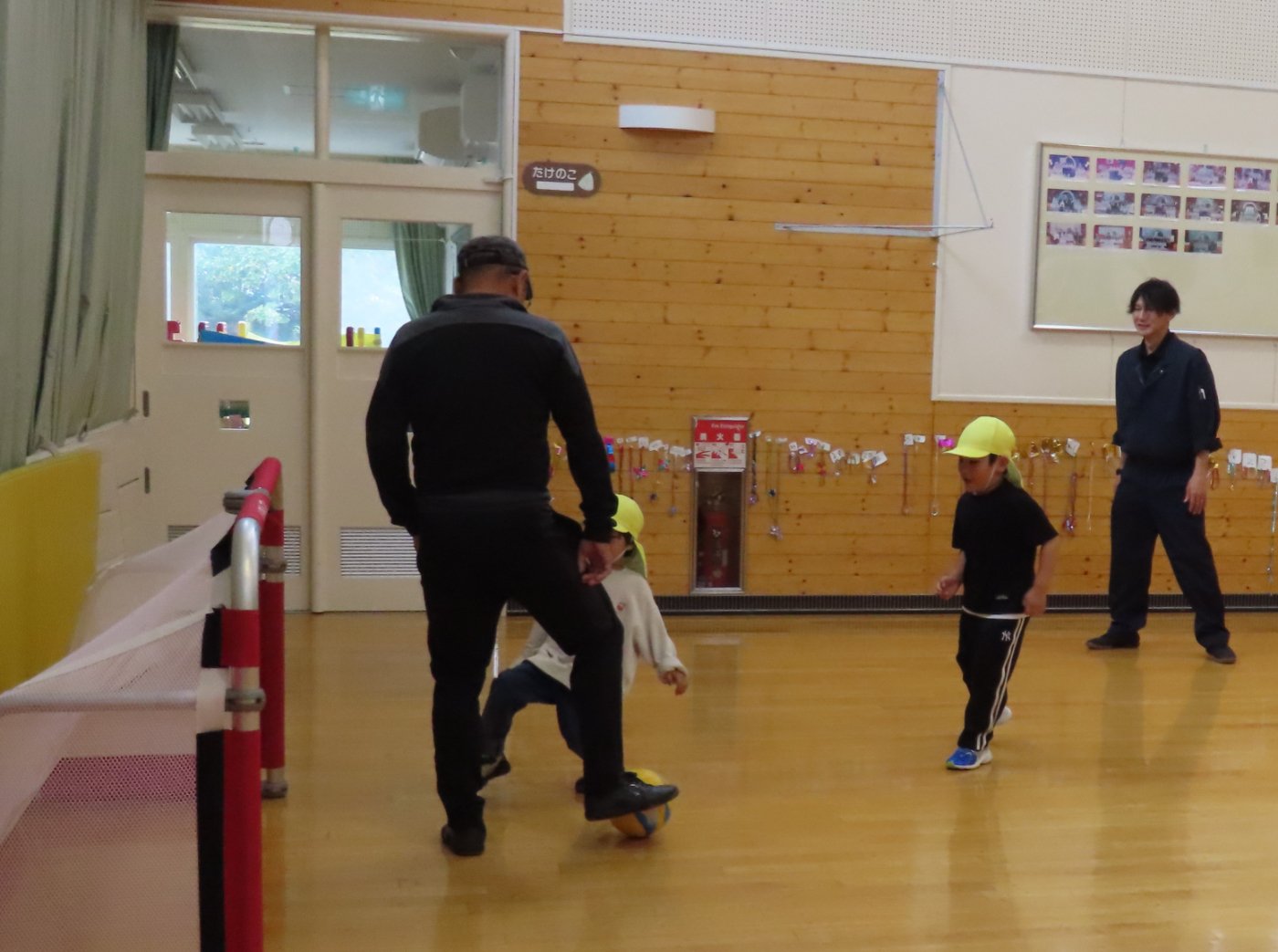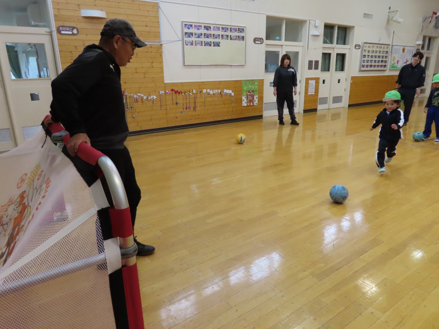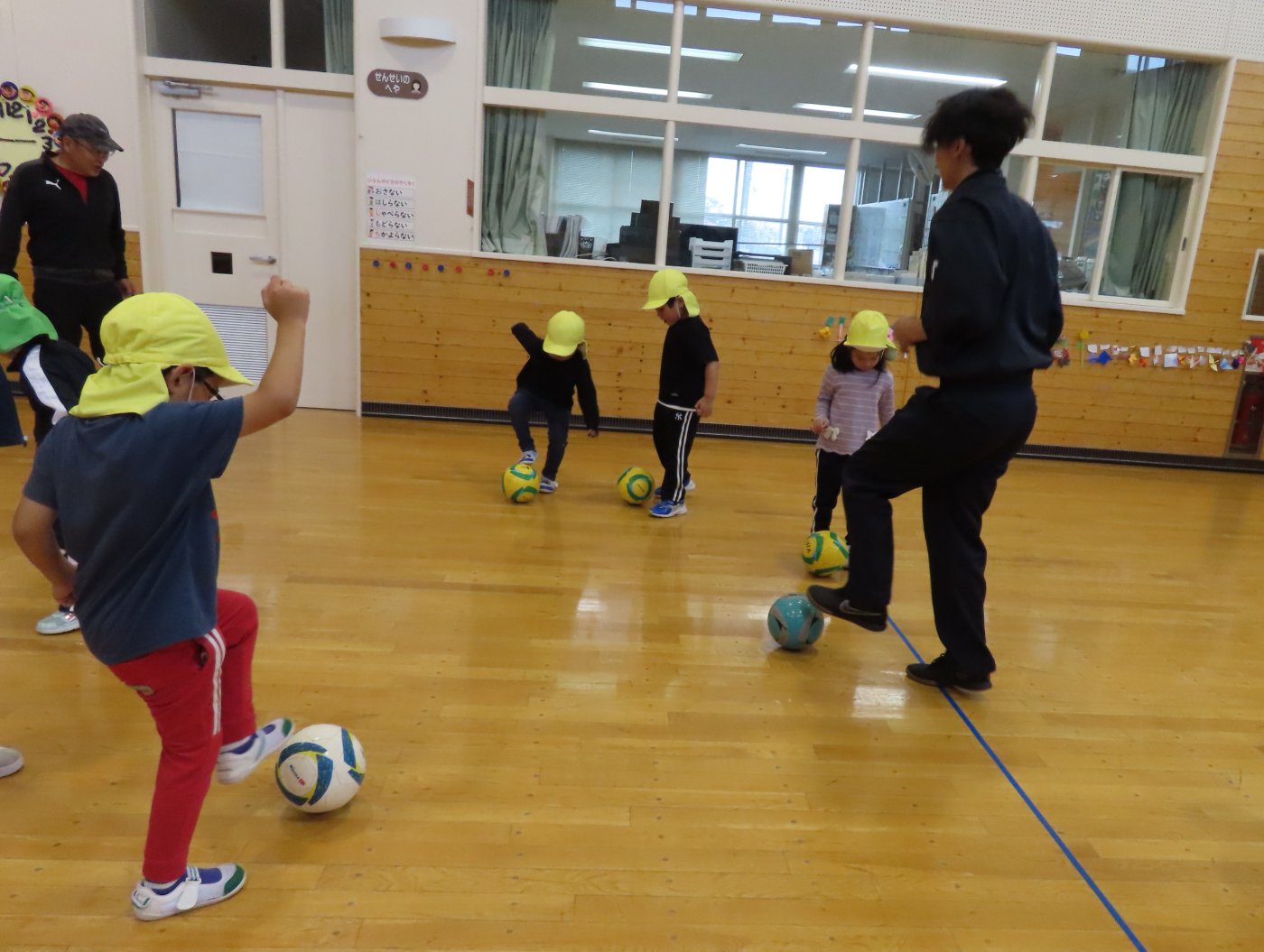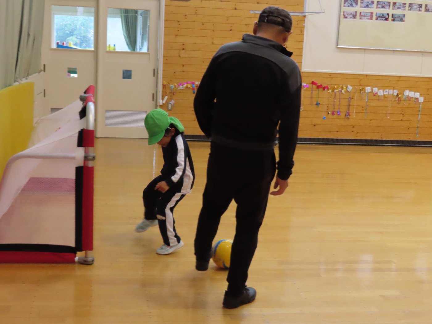 『NFA 根室地区サッカー協会』主催『サッカー教室』が、本日で最終回を迎えました。今年度は、年長たけのこ組&年中つくし組合同で6月から計8回実施しました。予定では9月末が最終回でしたが、「まだサッカーをやりたい!」「最後は、3人の先生とみんなでサッカーをしたい!」との子ども達の声を伝えたところ、快くお引き受けいただきました。これまでお世話になった通称『ユウちゃん先生』『モギちゃん先生』『ユウト先生』と、3名のコーチが勢揃いで、これまで以上に意欲満々!大興奮の子ども達でした。