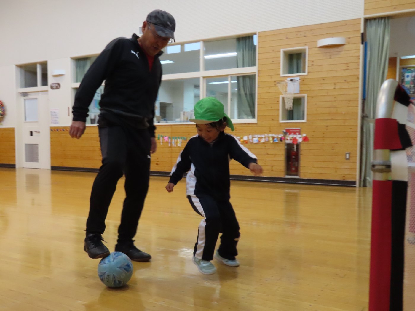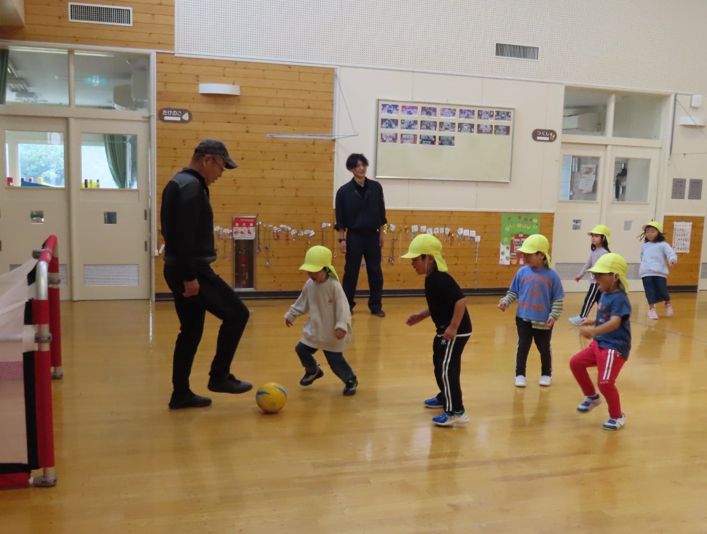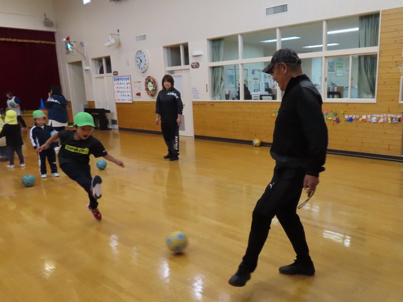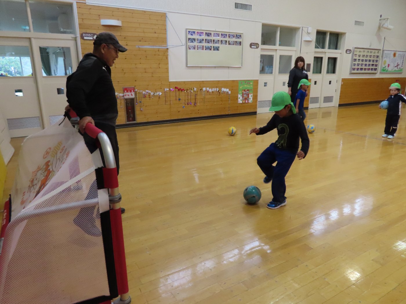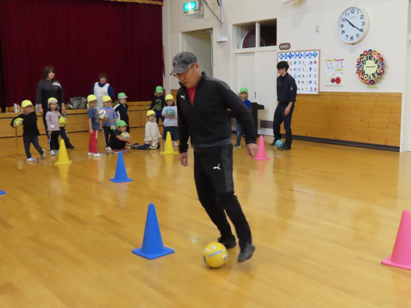 『NFA 根室地区サッカー協会』主催『サッカー教室』が、本日で最終回を迎えました。今年度は、年長たけのこ組&年中つくし組合同で6月から計8回実施しました。予定では9月末が最終回でしたが、「まだサッカーをやりたい!」「最後は、3人の先生とみんなでサッカーをしたい!」との子ども達の声を伝えたところ、快くお引き受けいただきました。これまでお世話になった通称『ユウちゃん先生』『モギちゃん先生』『ユウト先生』と、3名のコーチが勢揃いで、これまで以上に意欲満々!大興奮の子ども達でした。