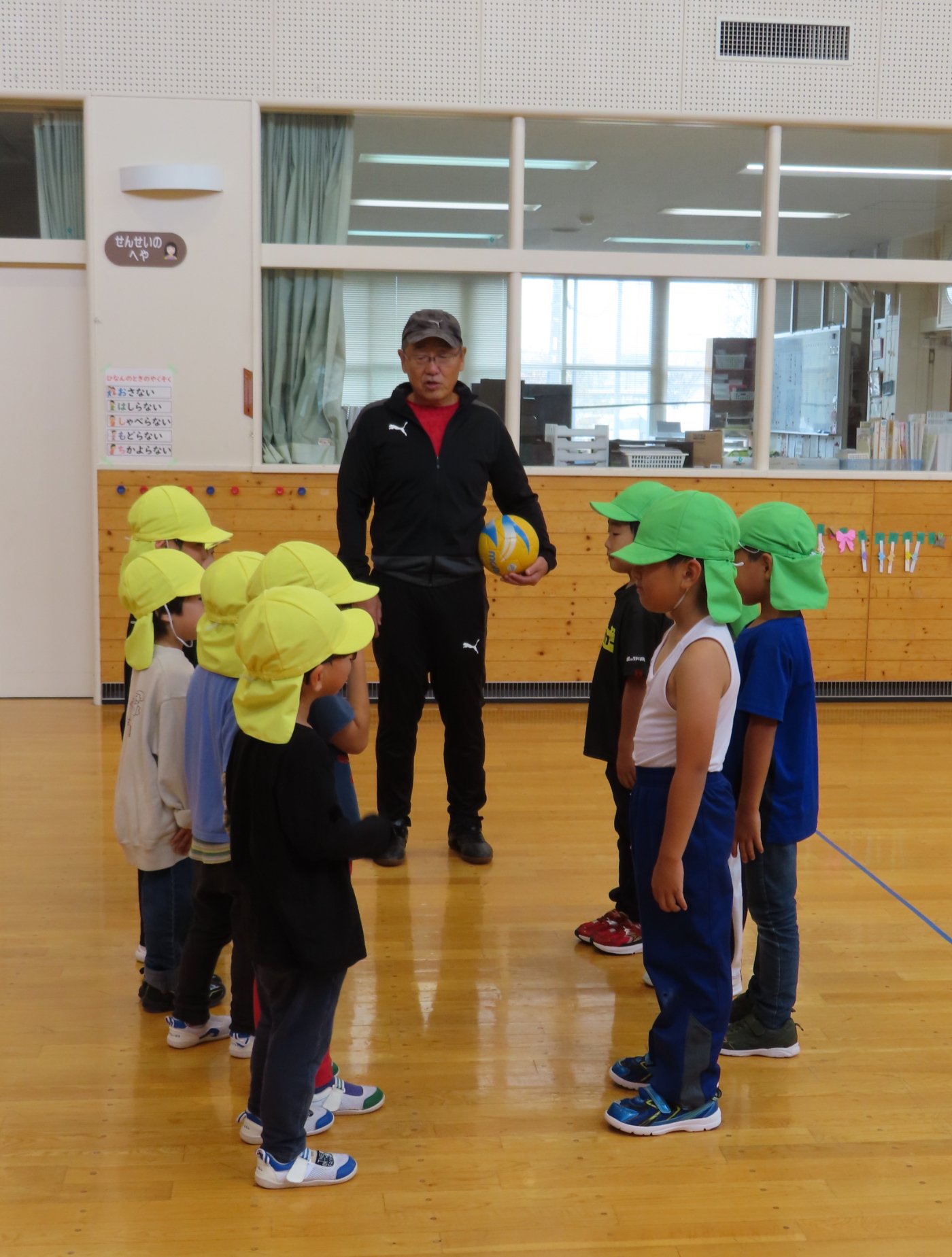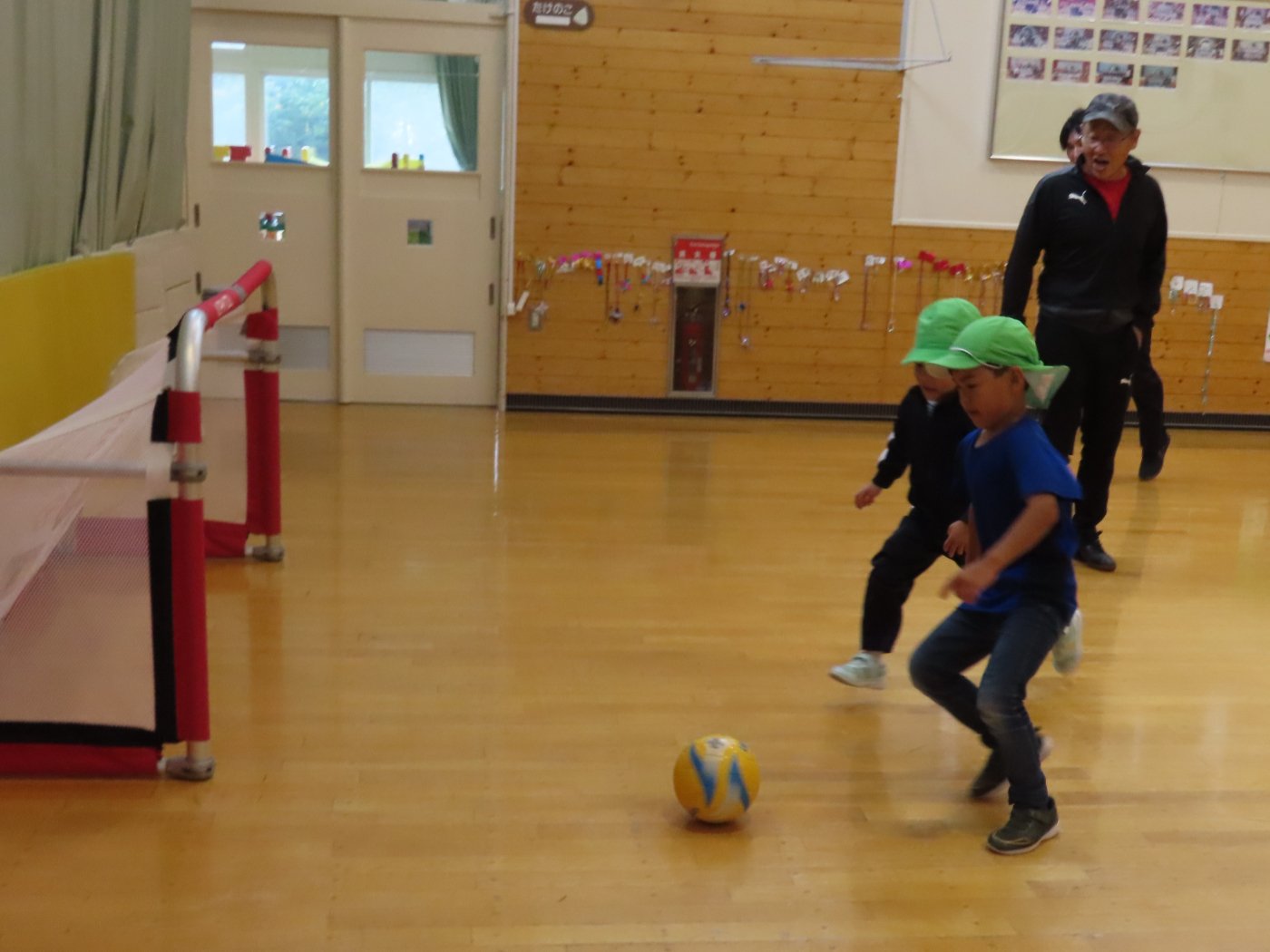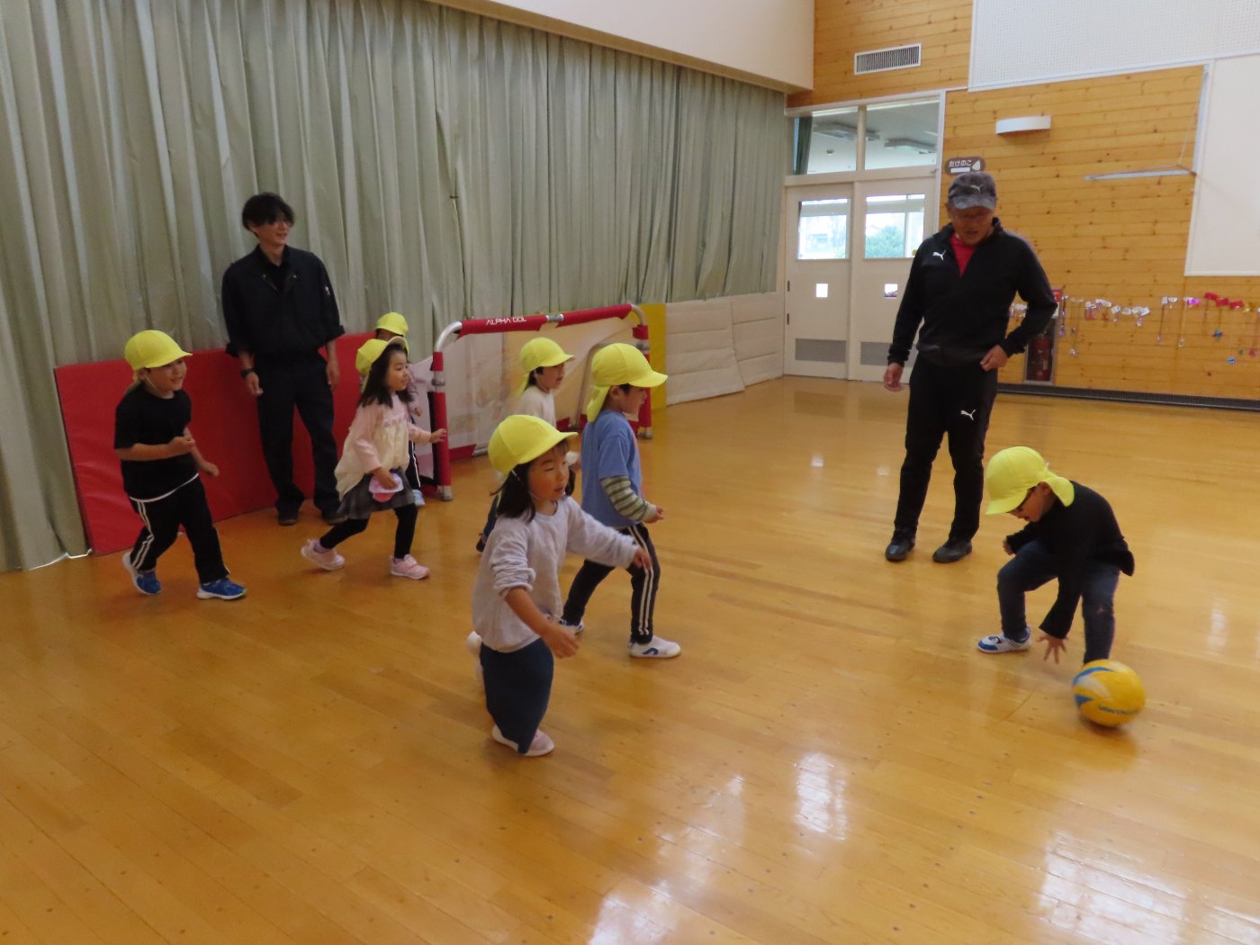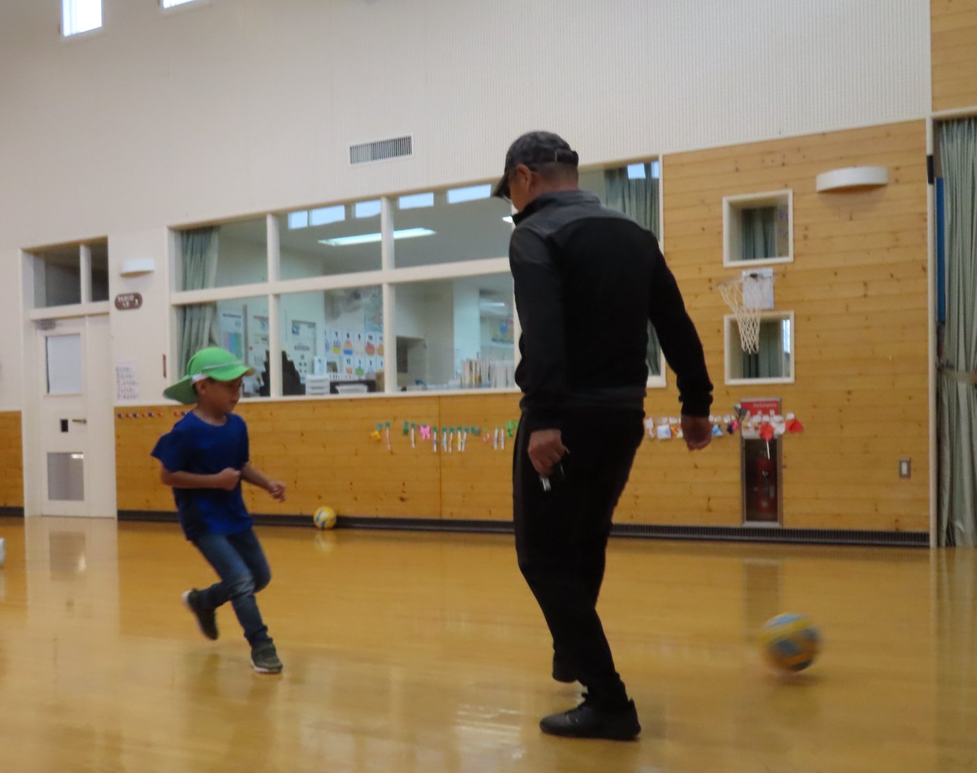 『NFA 根室地区サッカー協会』主催『サッカー教室』が、本日で最終回を迎えました。今年度は、年長たけのこ組&年中つくし組合同で6月から計8回実施しました。予定では9月末が最終回でしたが、「まだサッカーをやりたい!」「最後は、3人の先生とみんなでサッカーをしたい!」との子ども達の声を伝えたところ、快くお引き受けいただきました。これまでお世話になった通称『ユウちゃん先生』『モギちゃん先生』『ユウト先生』と、3名のコーチが勢揃いで、これまで以上に意欲満々!大興奮の子ども達でした。
