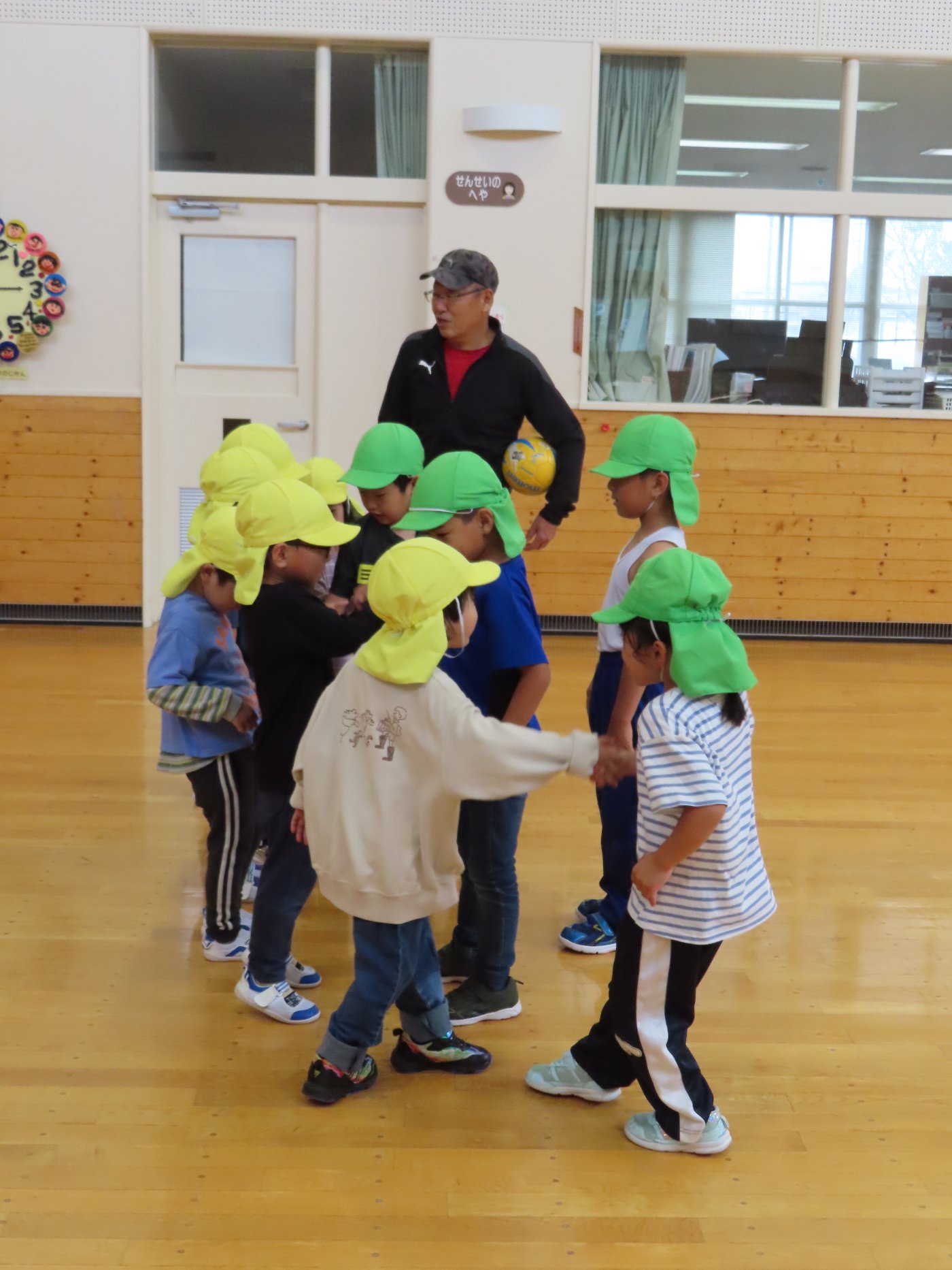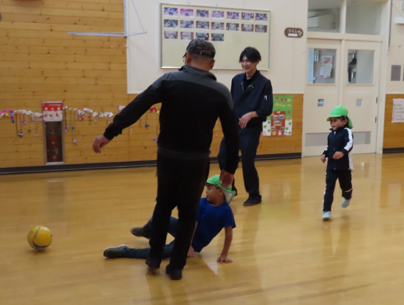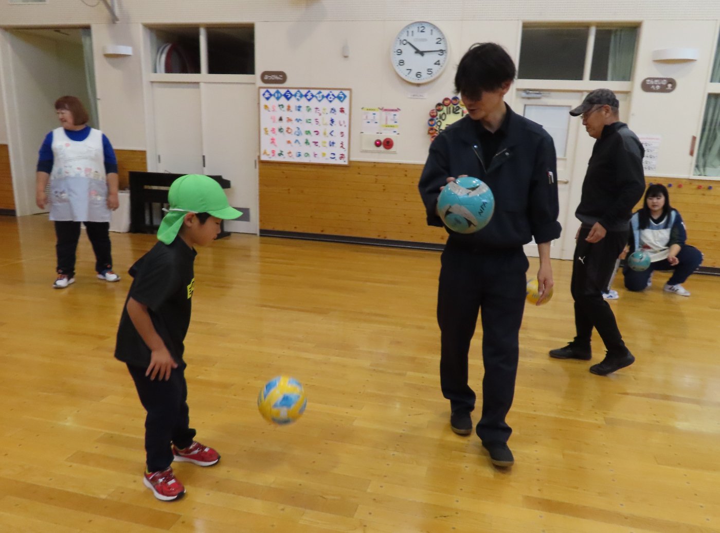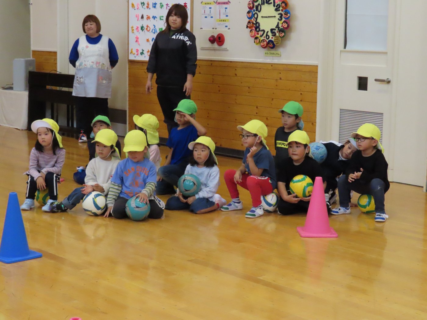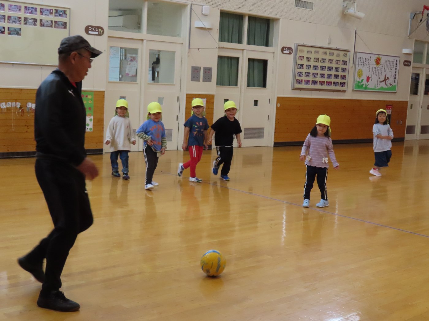 『NFA 根室地区サッカー協会』主催『サッカー教室』が、本日で最終回を迎えました。今年度は、年長たけのこ組&年中つくし組合同で6月から計8回実施しました。予定では9月末が最終回でしたが、「まだサッカーをやりたい!」「最後は、3人の先生とみんなでサッカーをしたい!」との子ども達の声を伝えたところ、快くお引き受けいただきました。これまでお世話になった通称『ユウちゃん先生』『モギちゃん先生』『ユウト先生』と、3名のコーチが勢揃いで、これまで以上に意欲満々!大興奮の子ども達でした。