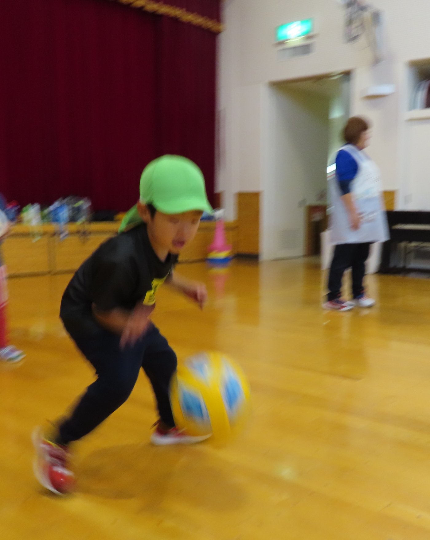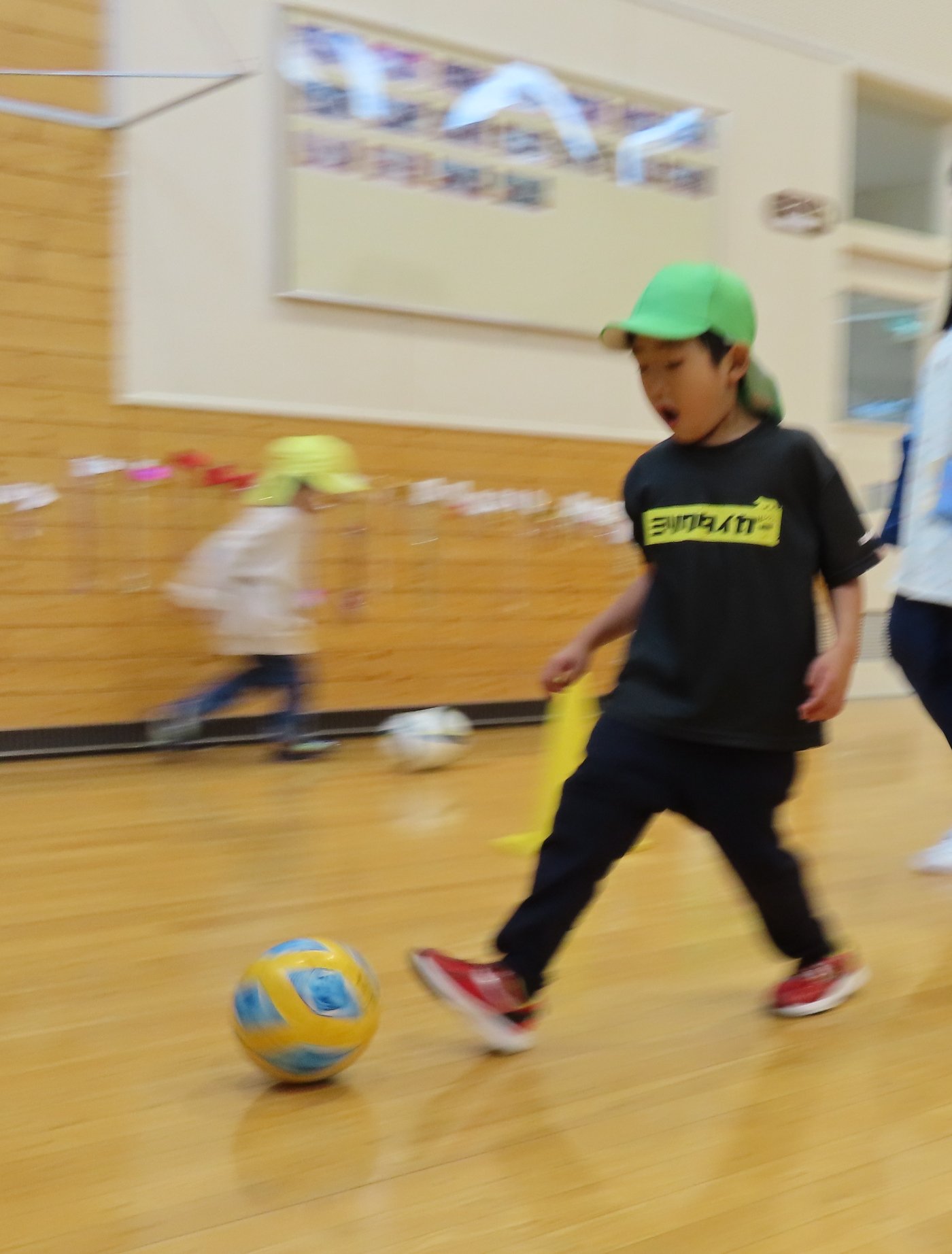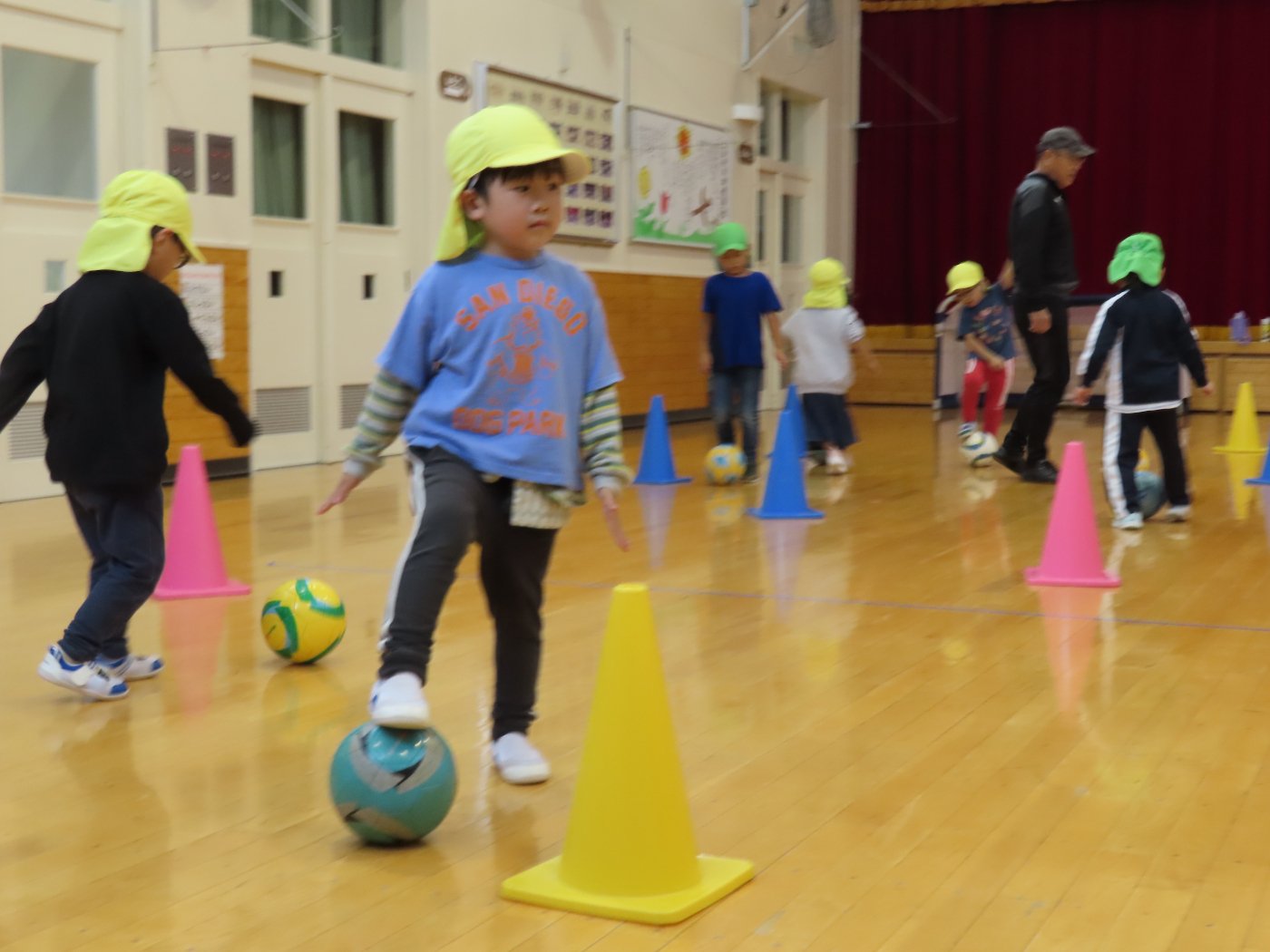 みんな揃ったところで、まずは元気な挨拶から! そして、ランニングや線を跨ぎ左右反復回転、高速・持続ステップ、腕を振りながらの太腿上げなどでウォーミングアップ!  ボールを投げ上げキャッチ、ハンドドリブル、ステップを踏みながらのボールタッチでボールとの距離感をつかむ動き。コーンの周りをドリブル回転、ボールをキック・ストップ、立ち塞ぐ先生を交わしてドリブル&シュートなど、これまでの練習をおさらいしました。どの動きを取っても、確実にステップアップしていた子ども達です。