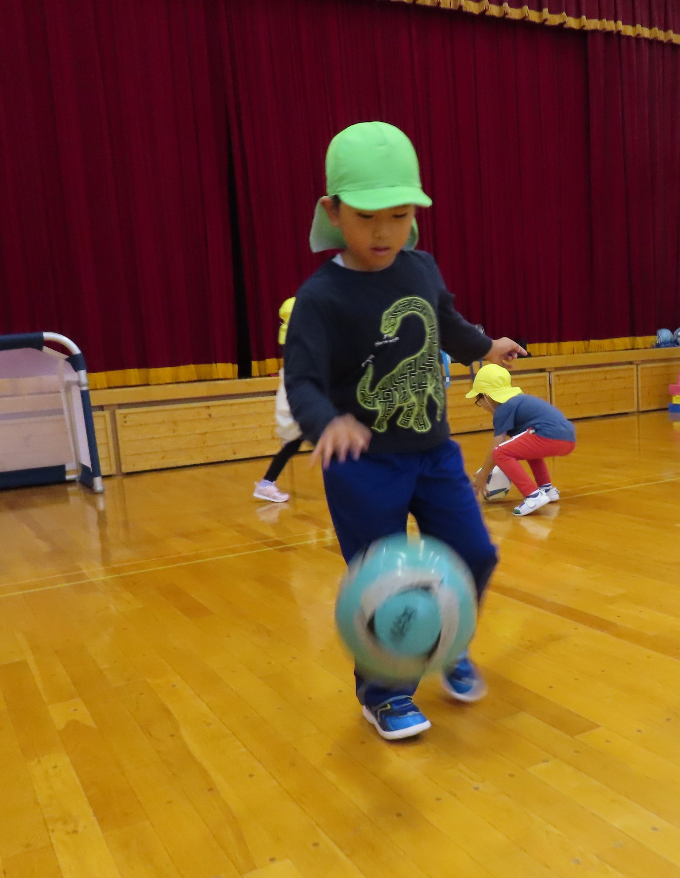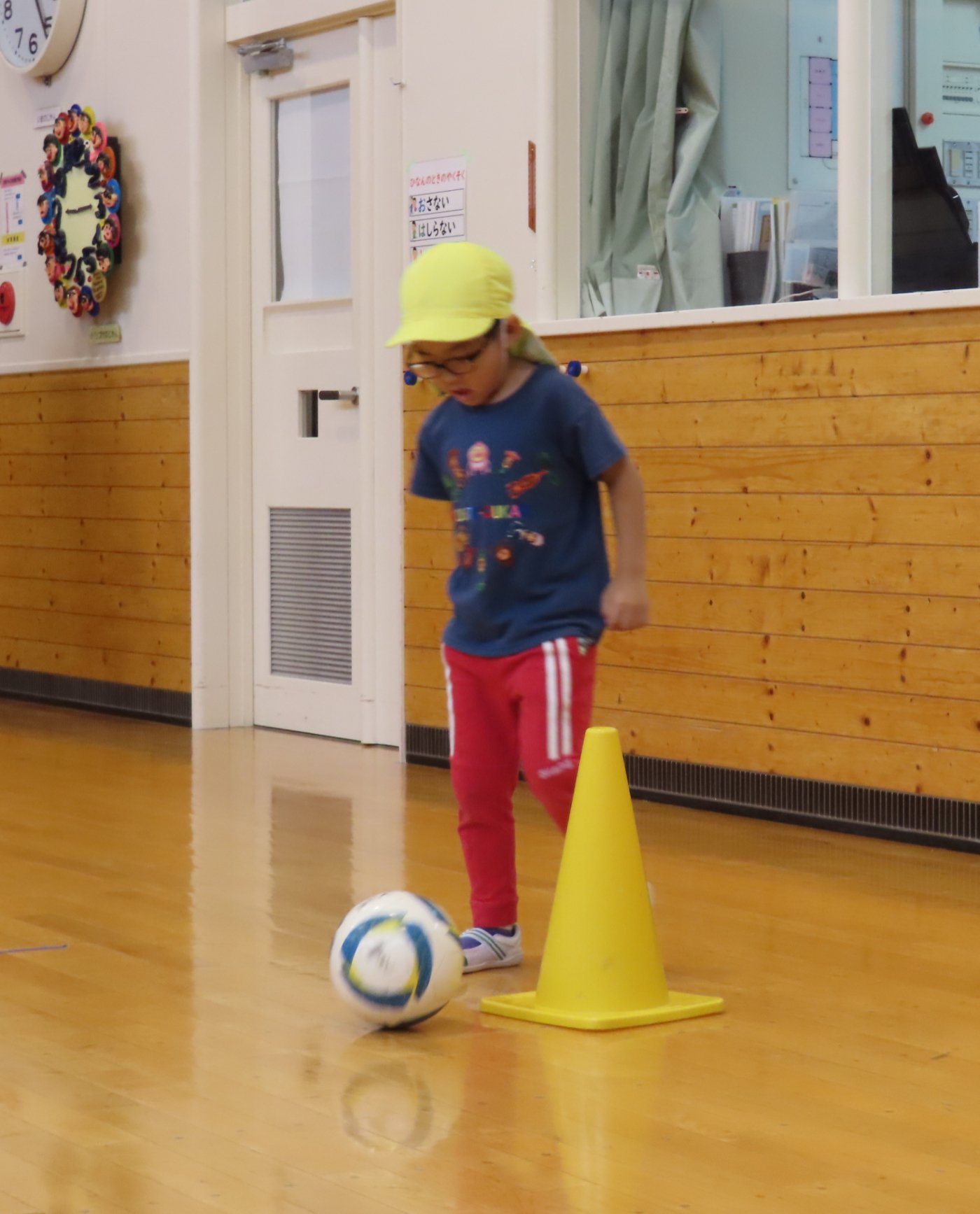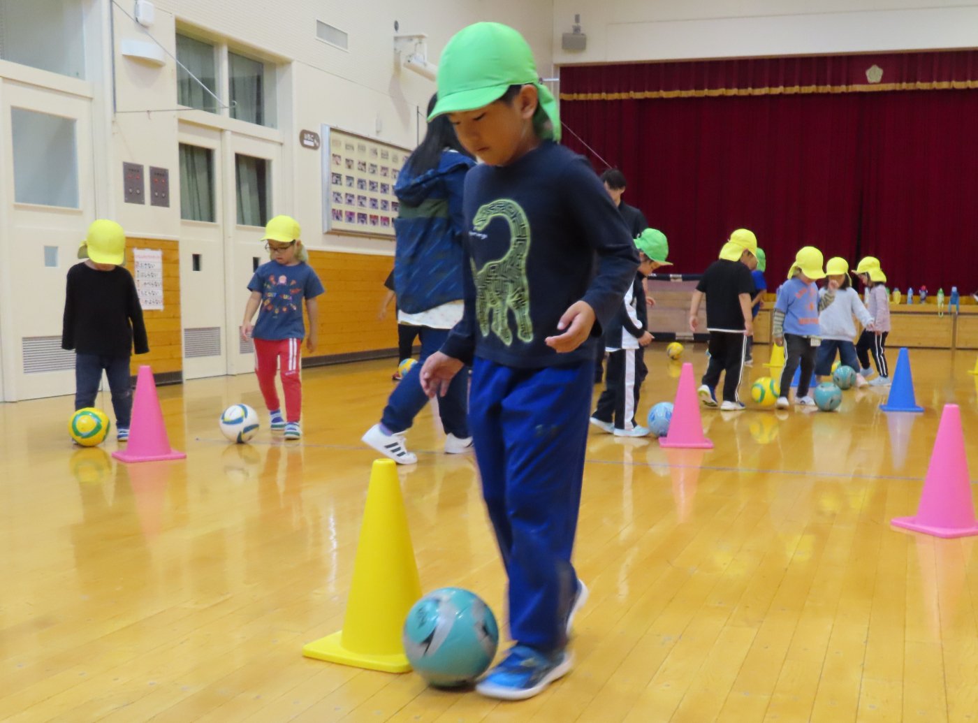 みんな揃ったところで、まずは元気な挨拶から! そして、ランニングや線を跨ぎ左右反復回転、高速・持続ステップ、腕を振りながらの太腿上げなどでウォーミングアップ!  ボールを投げ上げキャッチ、ハンドドリブル、ステップを踏みながらのボールタッチでボールとの距離感をつかむ動き。コーンの周りをドリブル回転、ボールをキック・ストップ、立ち塞ぐ先生を交わしてドリブル&シュートなど、これまでの練習をおさらいしました。どの動きを取っても、確実にステップアップしていた子ども達です。