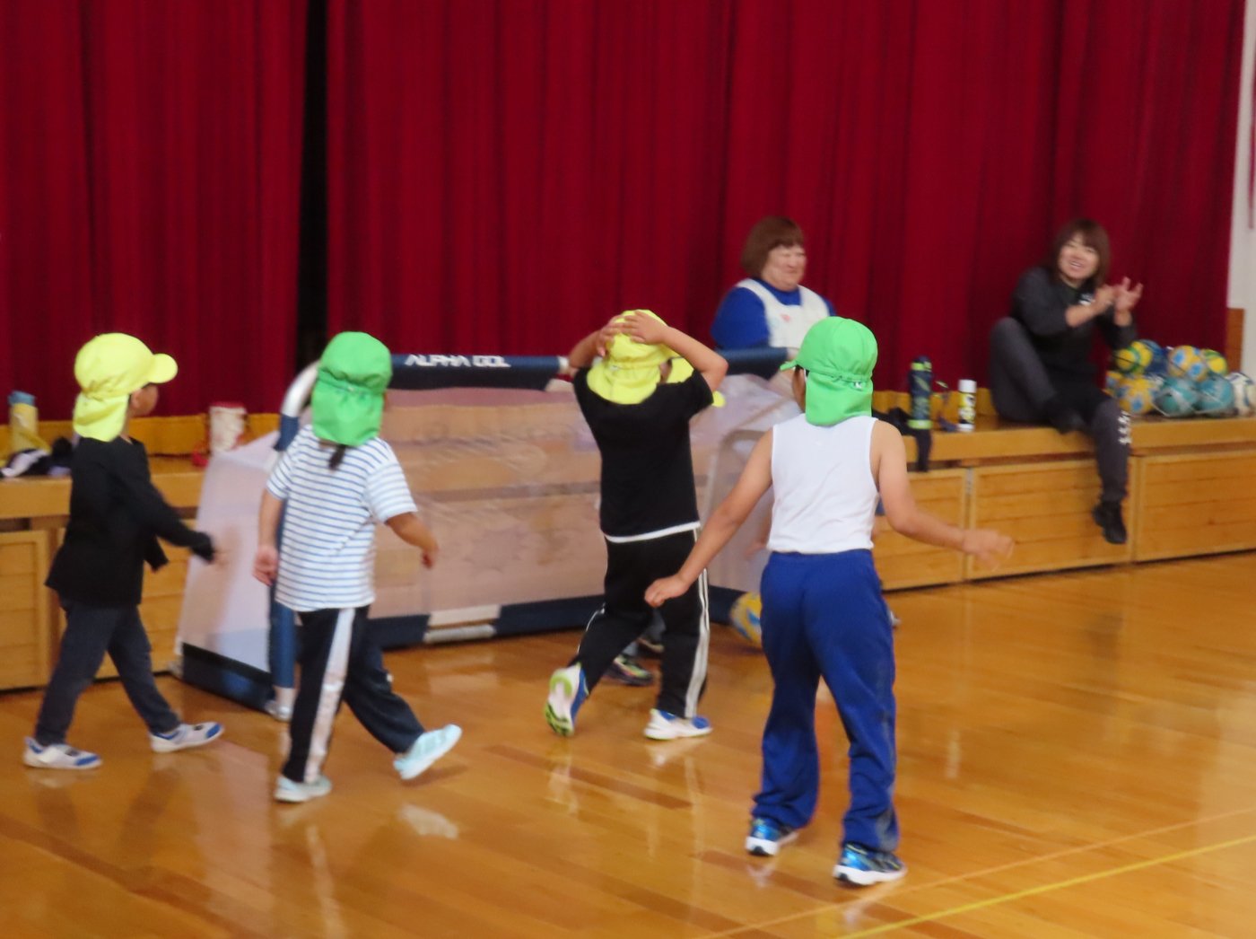 そして、最後は恒例の試合対戦です。たけのこ組VSコーチ、つくし組VSコーチ、たけのこ組VSつくし組と計3試合を行いました。これまで練習してきた様々な動きが試され、発揮された試合展開で、共にいい汗、いい笑顔で締め括ることができました。