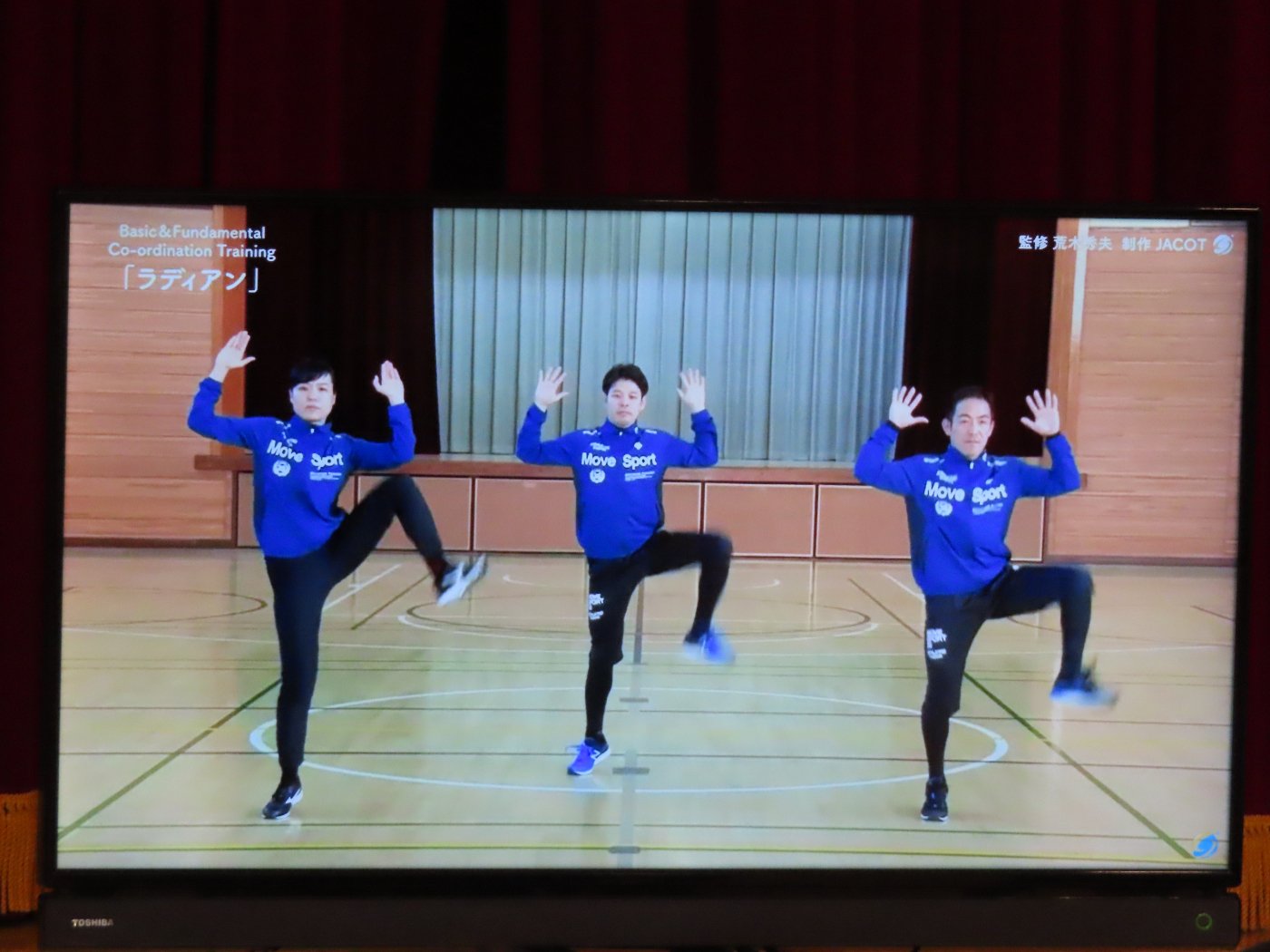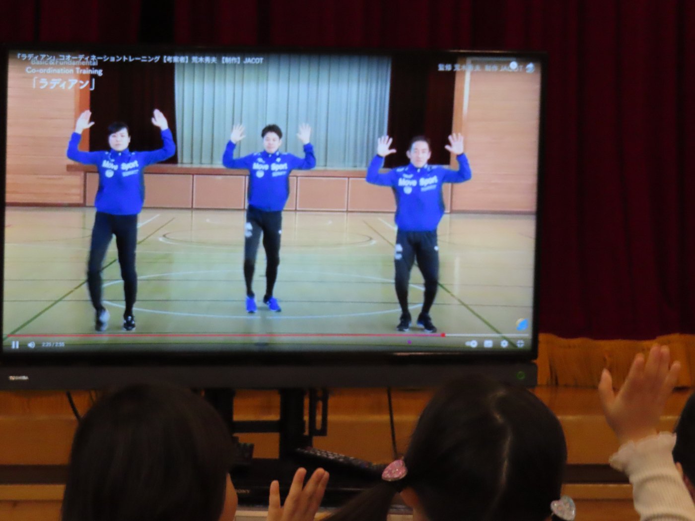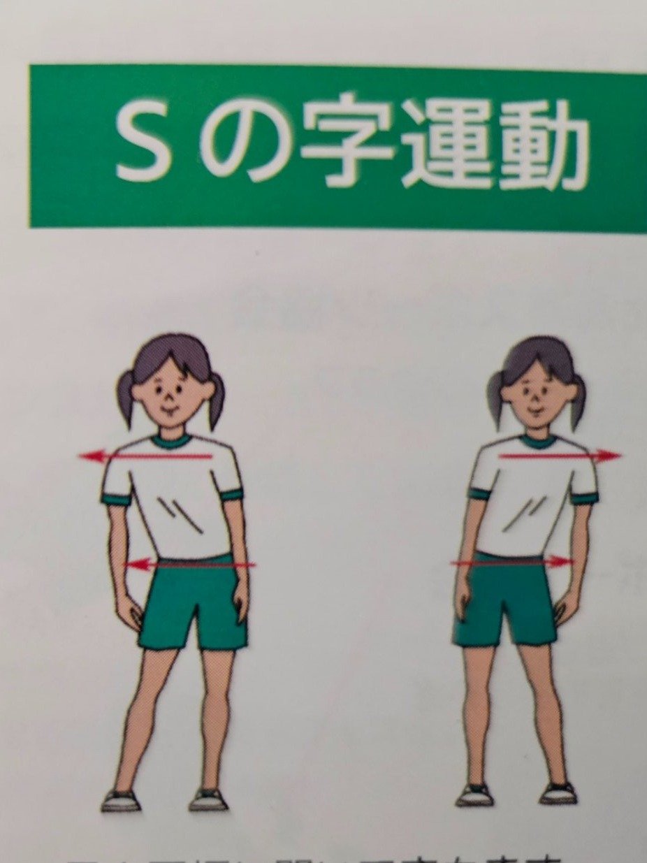 初回は公式動画を見ながら、体幹の動きに気づき、ボディーイメージをつかむ『「く」の字運動』『「S」の字運動』、体幹・四肢の連動性を高める『ラディアン』という動きを行いました。意欲の表れか、ぐいぐい画面に迫る勢いでトレーニングを楽しんでいた子ども達です。