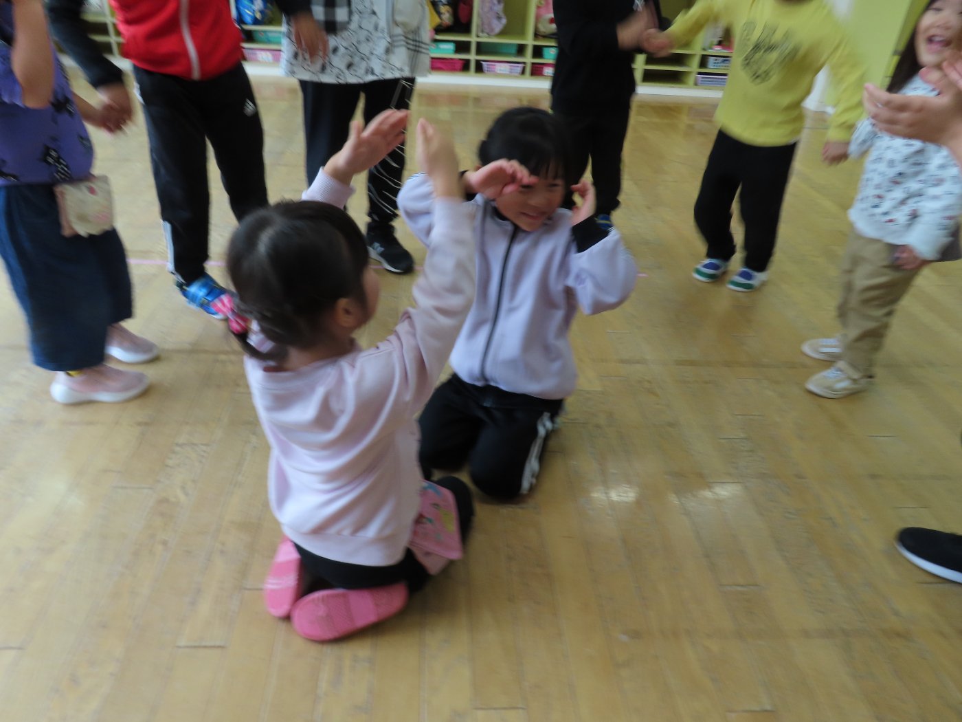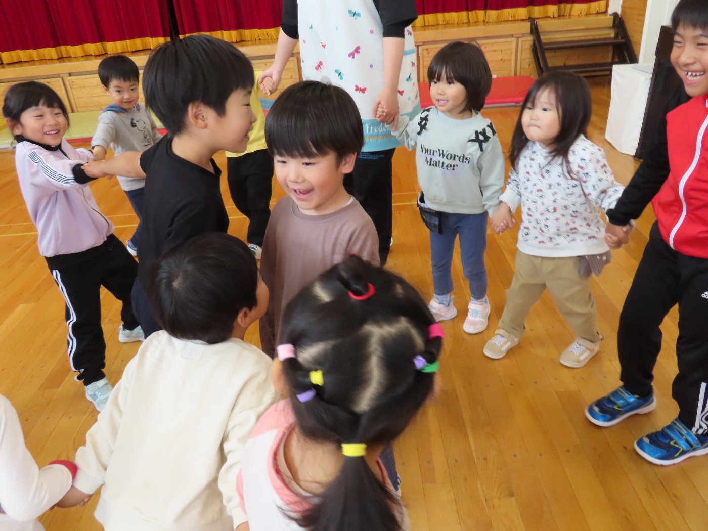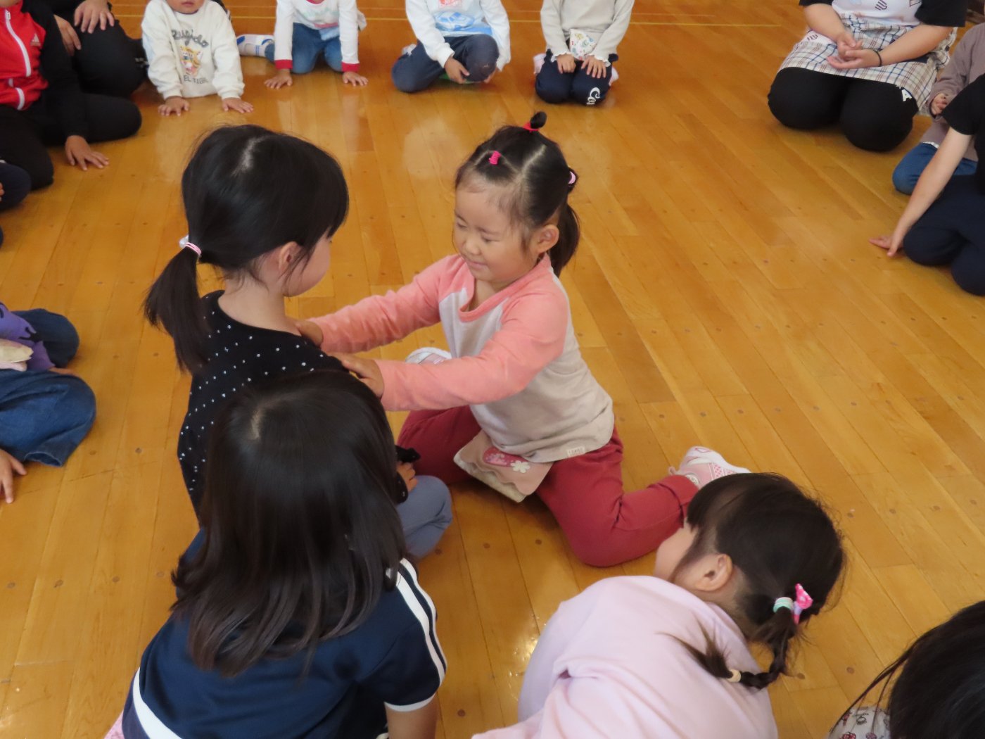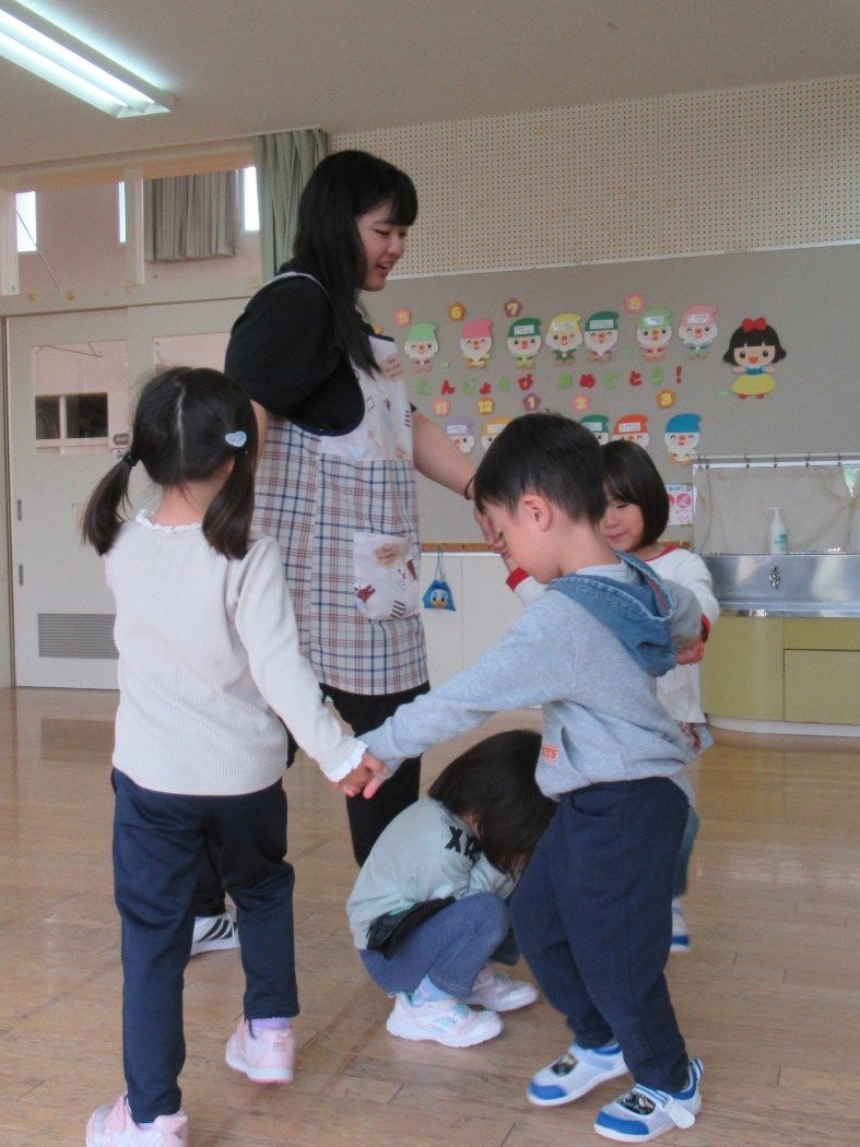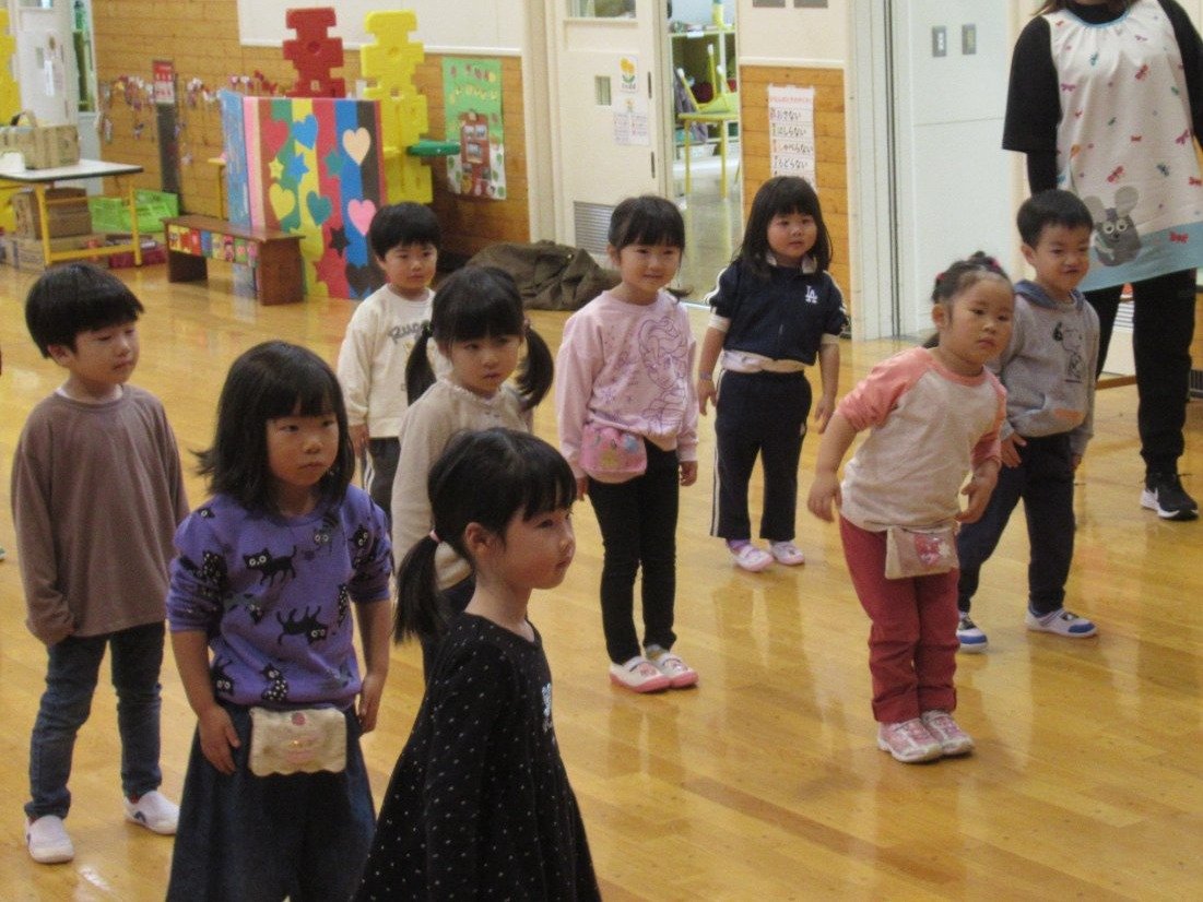 初回は少し緊張しながらも、いつもと違う仲間、前に立つ先生や保育室に、わくわく感の方が高まっていた子ども達。クラス仲間の名前を覚える、親しみがわくきっかけ作りとして、名前を言い当てる伝承遊び『かごめかごめ』も各クラスで取り入れました。その後、全園児でも楽しみ、大いに盛り上がっていました。