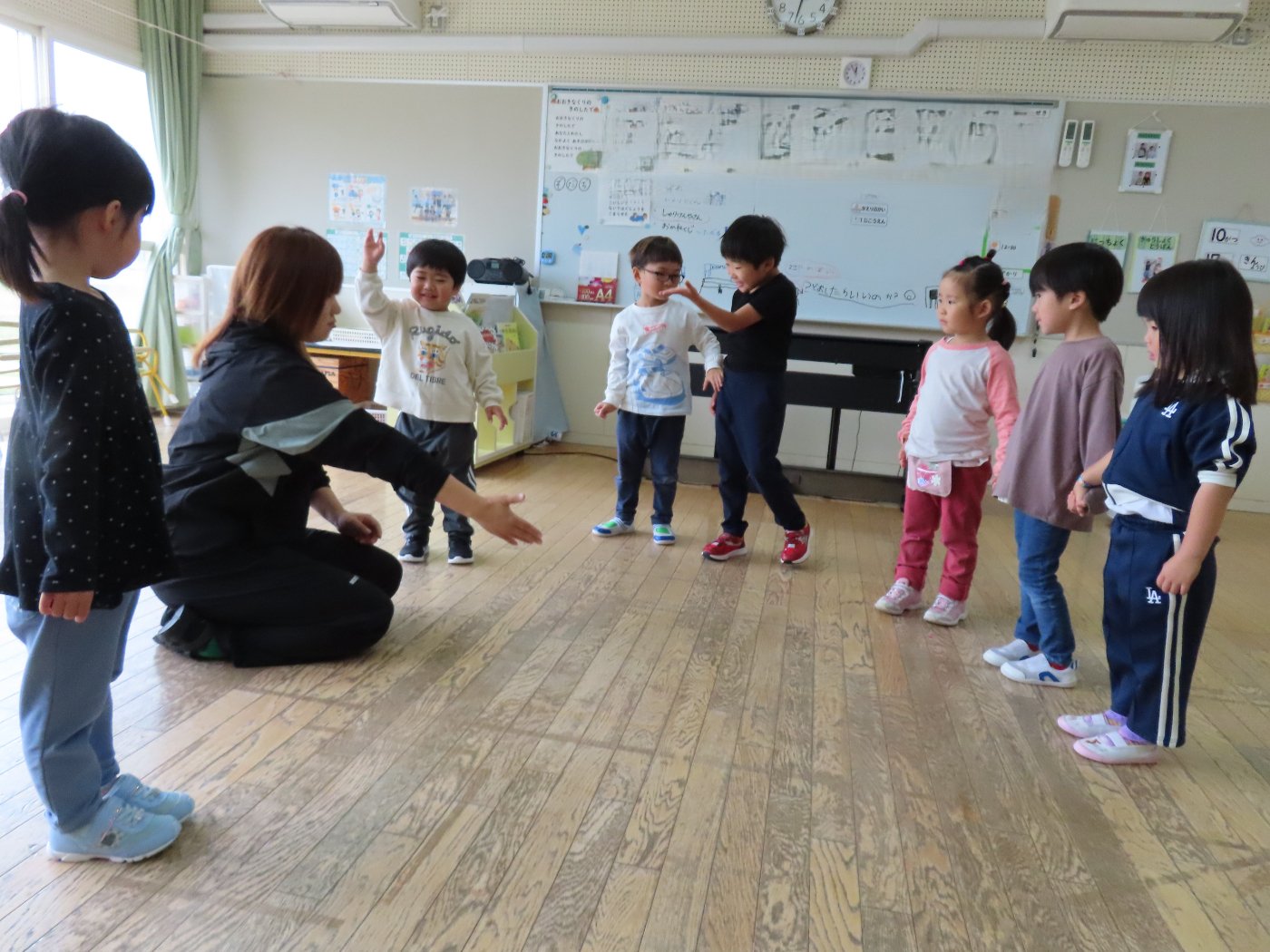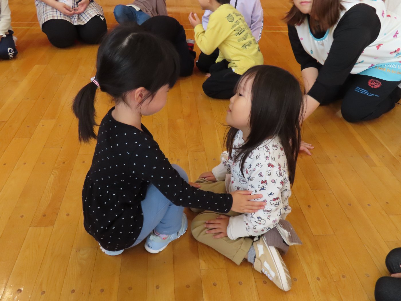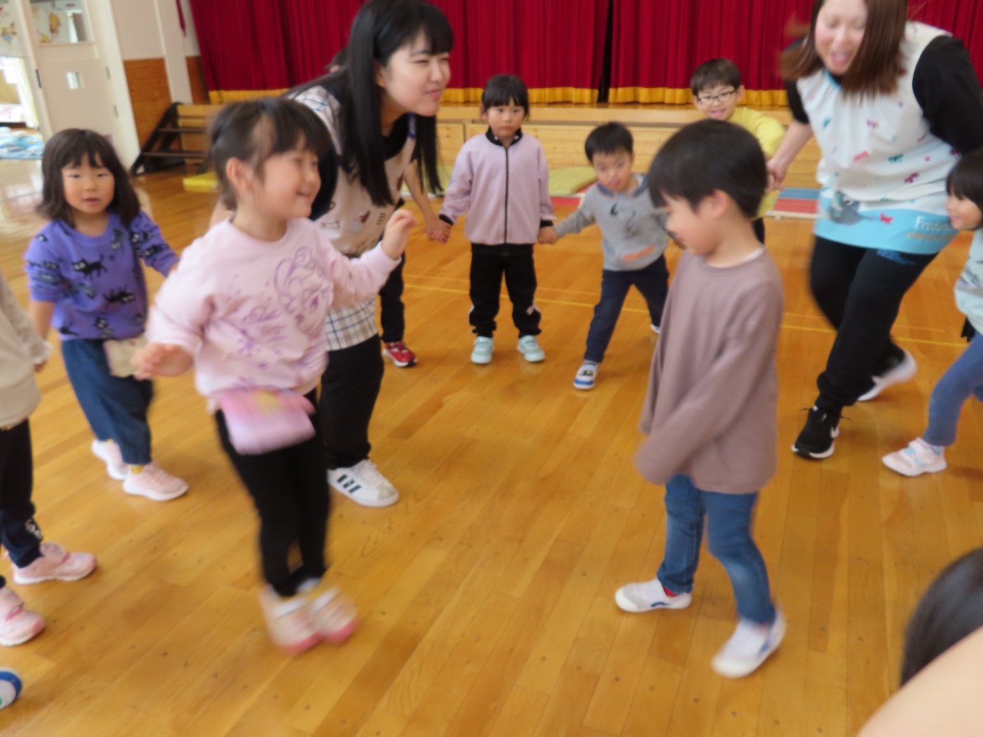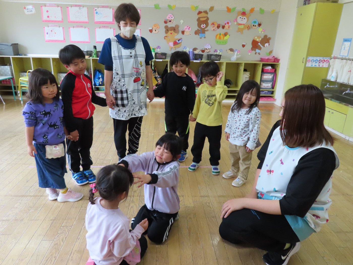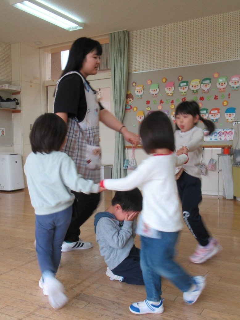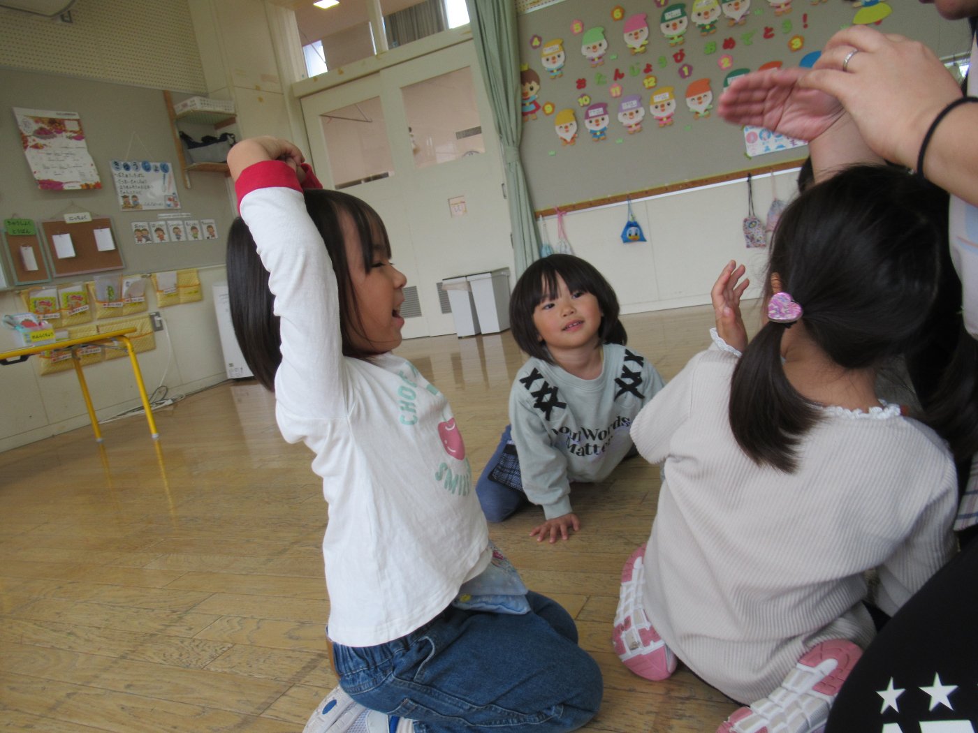 初回は少し緊張しながらも、いつもと違う仲間、前に立つ先生や保育室に、わくわく感の方が高まっていた子ども達。クラス仲間の名前を覚える、親しみがわくきっかけ作りとして、名前を言い当てる伝承遊び『かごめかごめ』も各クラスで取り入れました。その後、全園児でも楽しみ、大いに盛り上がっていました。