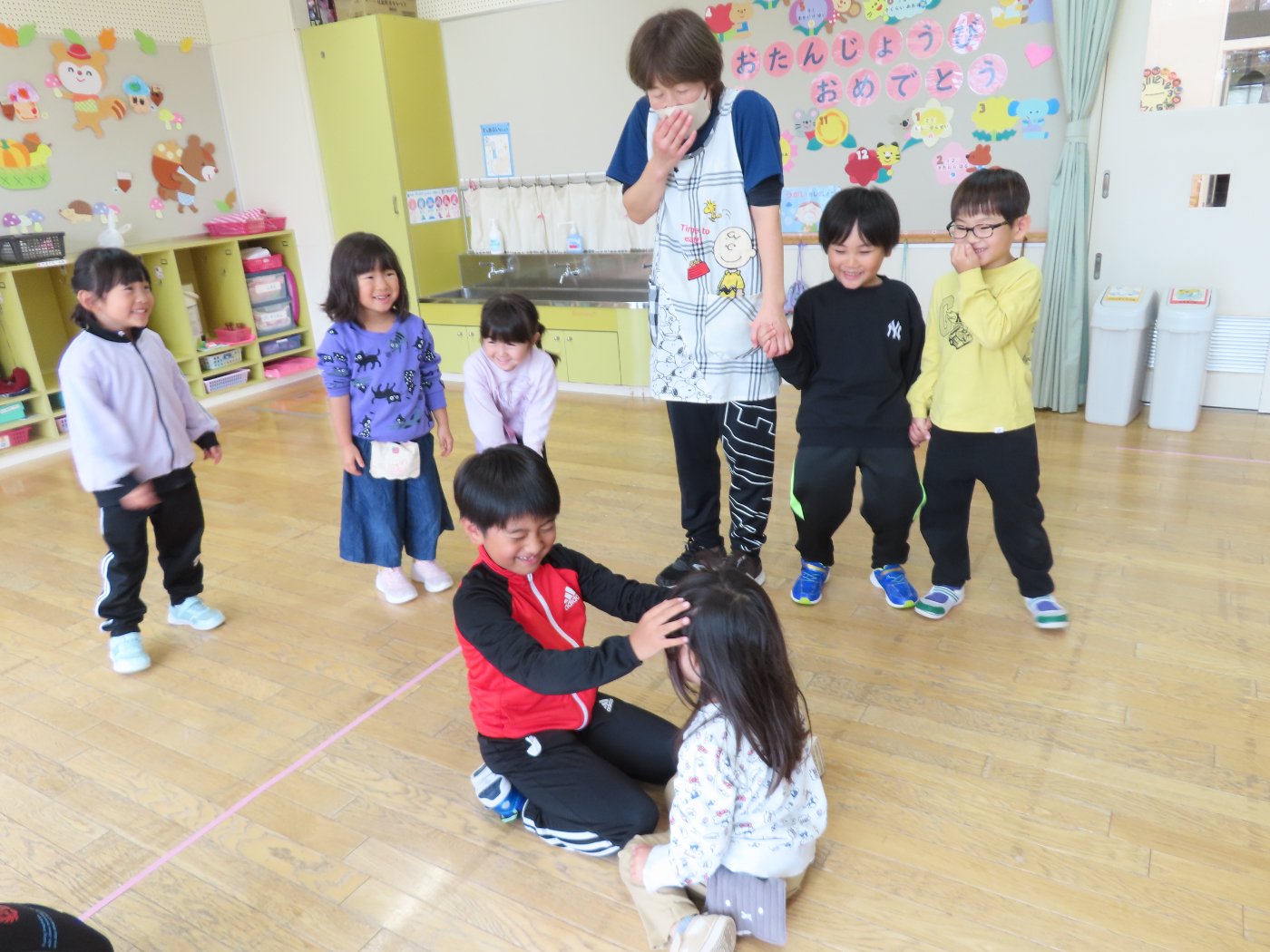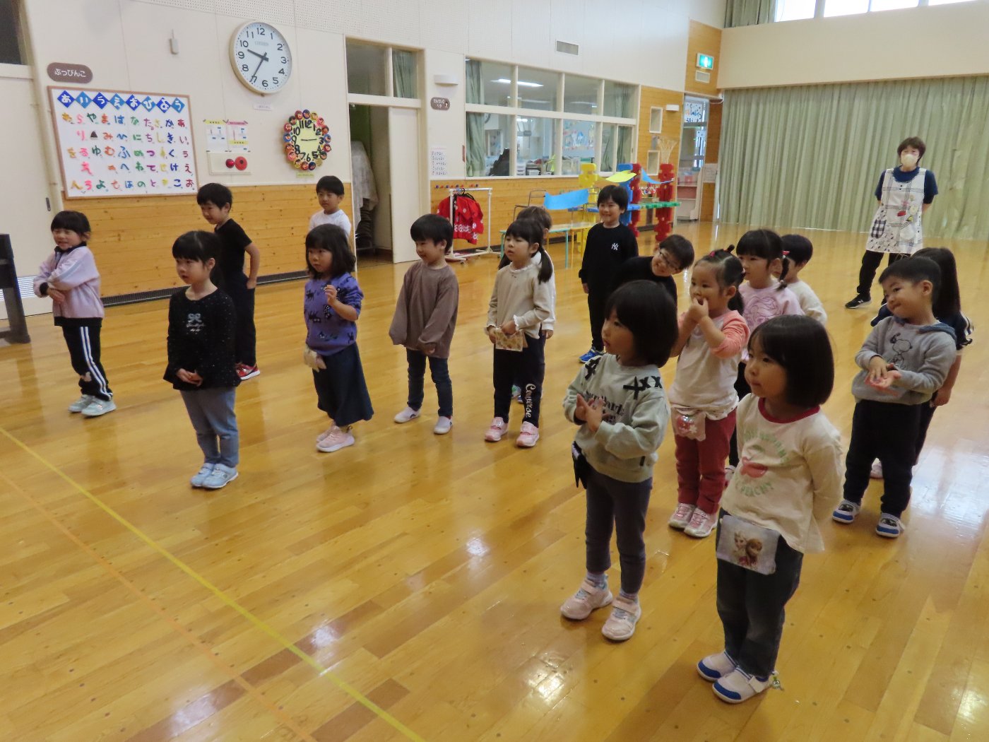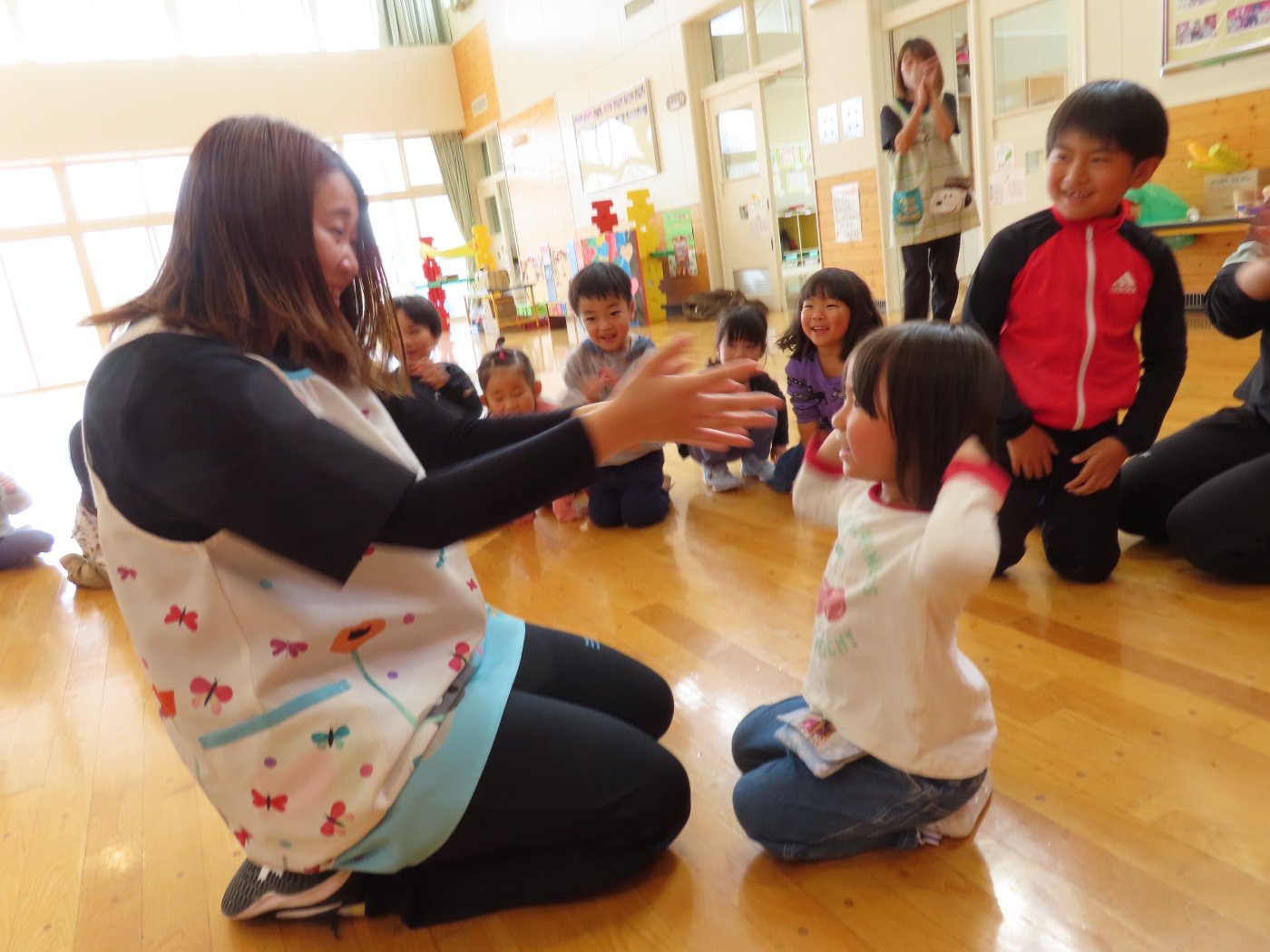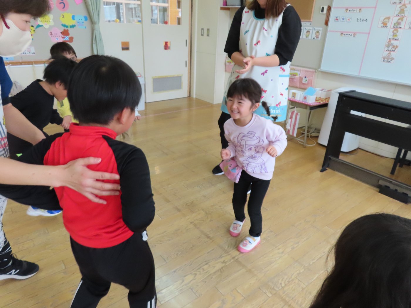 初回は少し緊張しながらも、いつもと違う仲間、前に立つ先生や保育室に、わくわく感の方が高まっていた子ども達。クラス仲間の名前を覚える、親しみがわくきっかけ作りとして、名前を言い当てる伝承遊び『かごめかごめ』も各クラスで取り入れました。その後、全園児でも楽しみ、大いに盛り上がっていました。