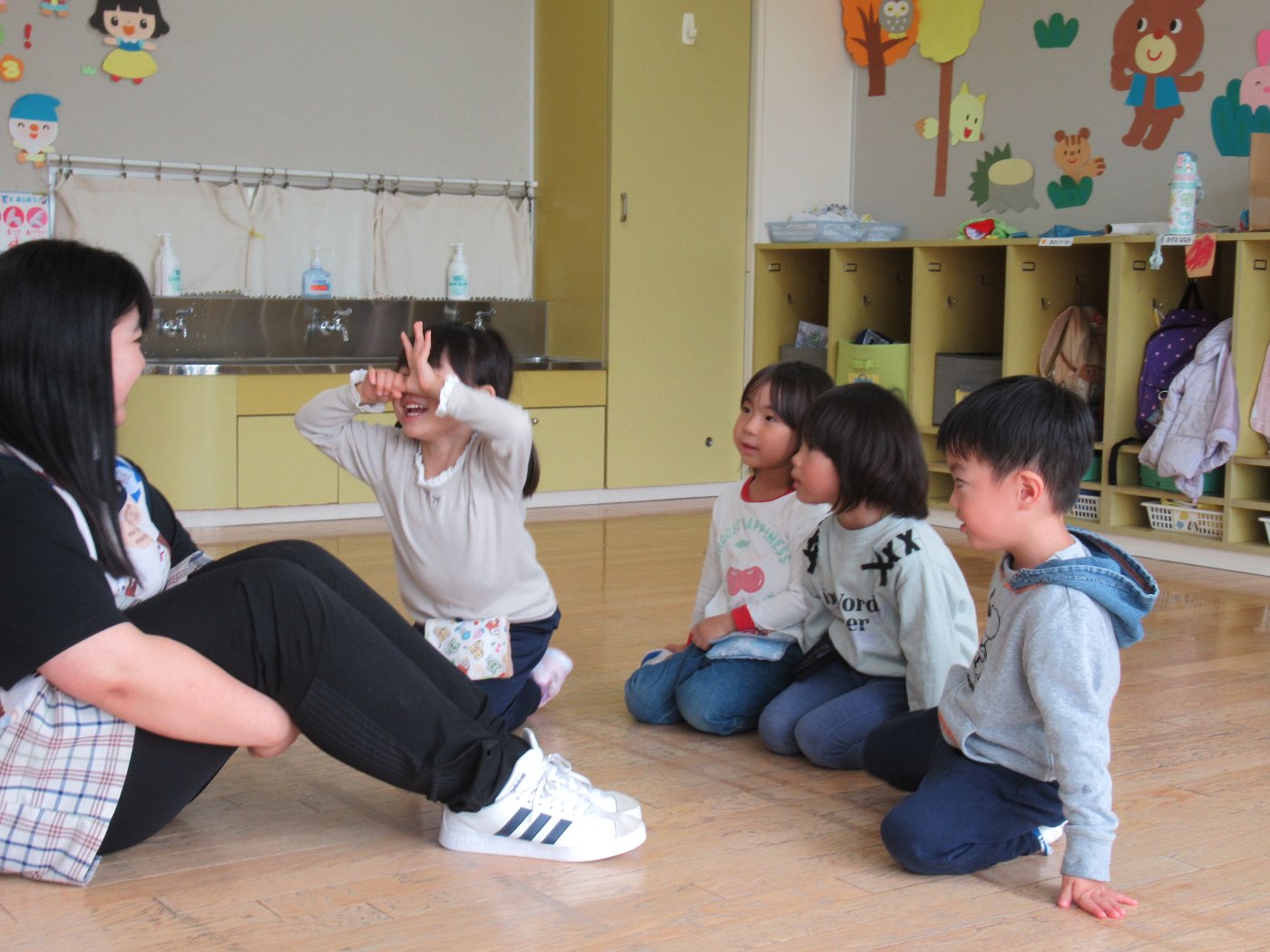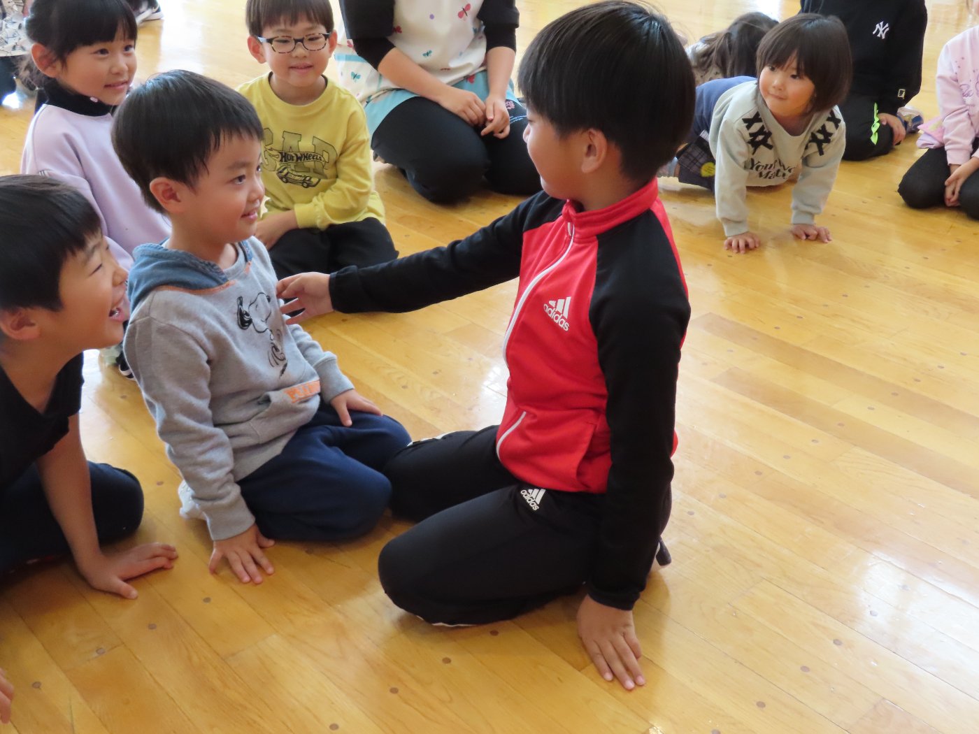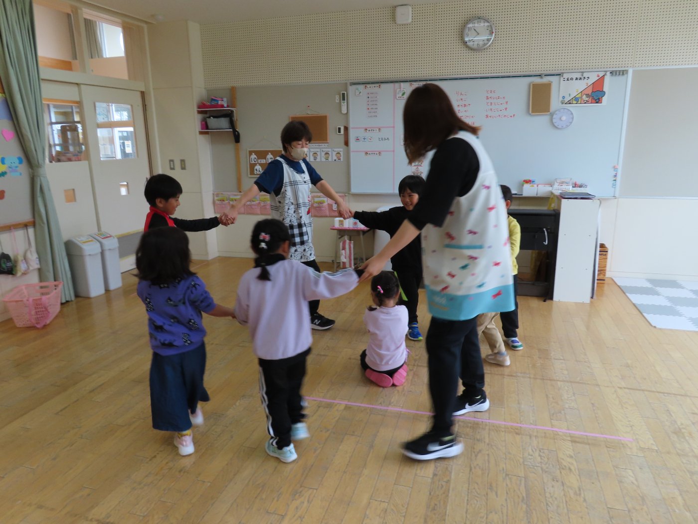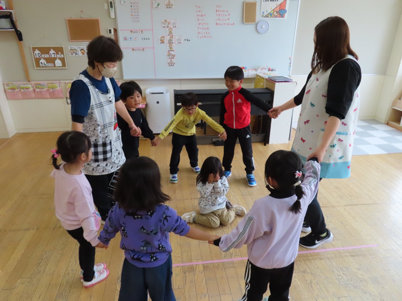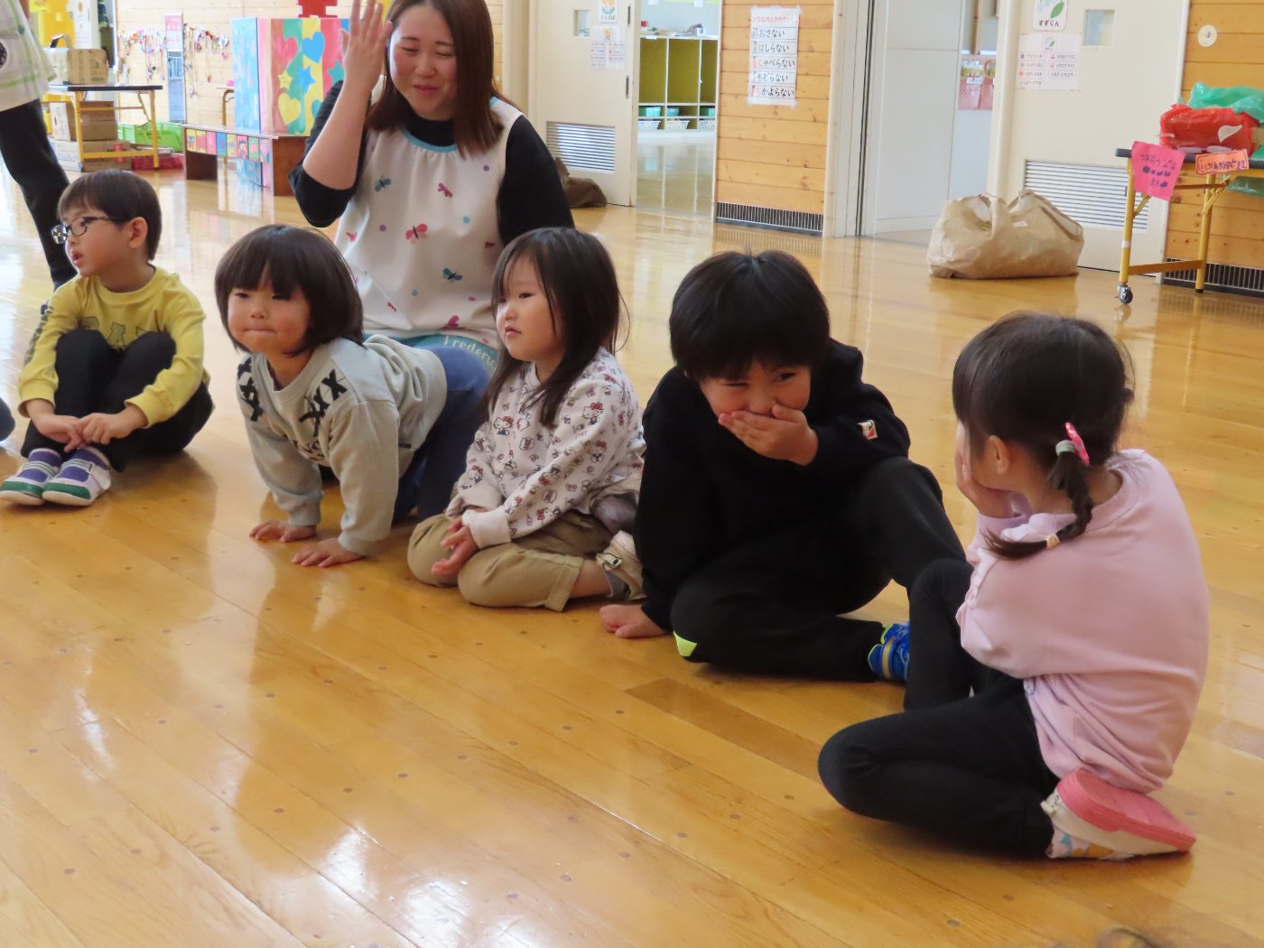 初回は少し緊張しながらも、いつもと違う仲間、前に立つ先生や保育室に、わくわく感の方が高まっていた子ども達。クラス仲間の名前を覚える、親しみがわくきっかけ作りとして、名前を言い当てる伝承遊び『かごめかごめ』も各クラスで取り入れました。その後、全園児でも楽しみ、大いに盛り上がっていました。