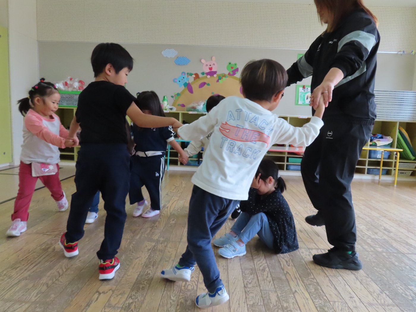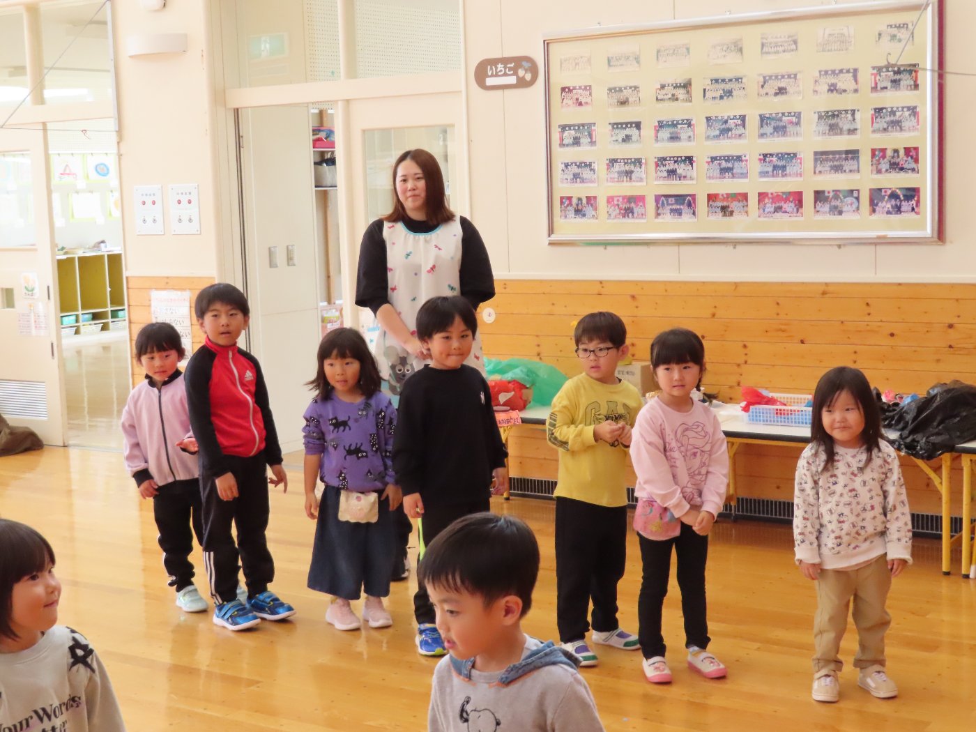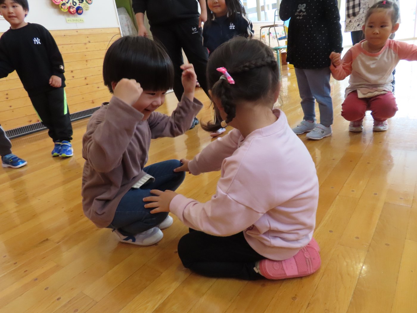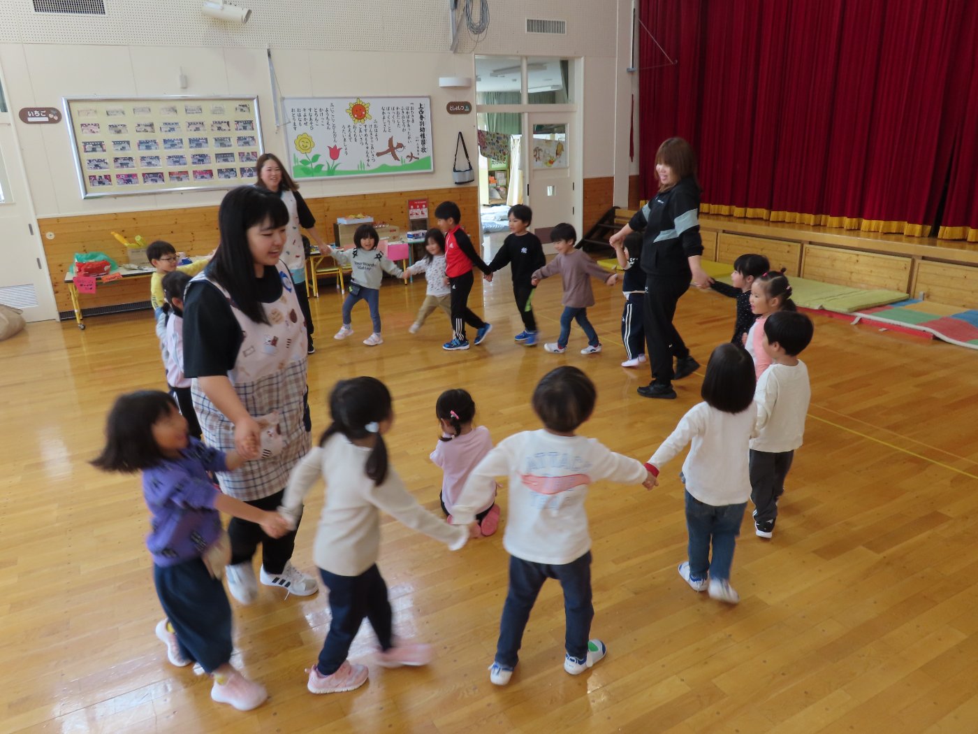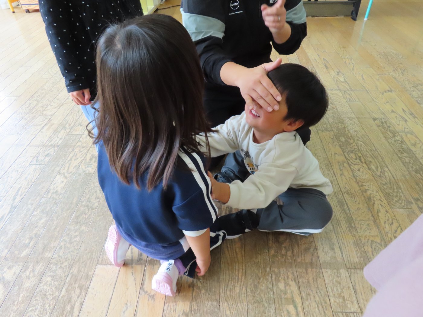 初回は少し緊張しながらも、いつもと違う仲間、前に立つ先生や保育室に、わくわく感の方が高まっていた子ども達。クラス仲間の名前を覚える、親しみがわくきっかけ作りとして、名前を言い当てる伝承遊び『かごめかごめ』も各クラスで取り入れました。その後、全園児でも楽しみ、大いに盛り上がっていました。