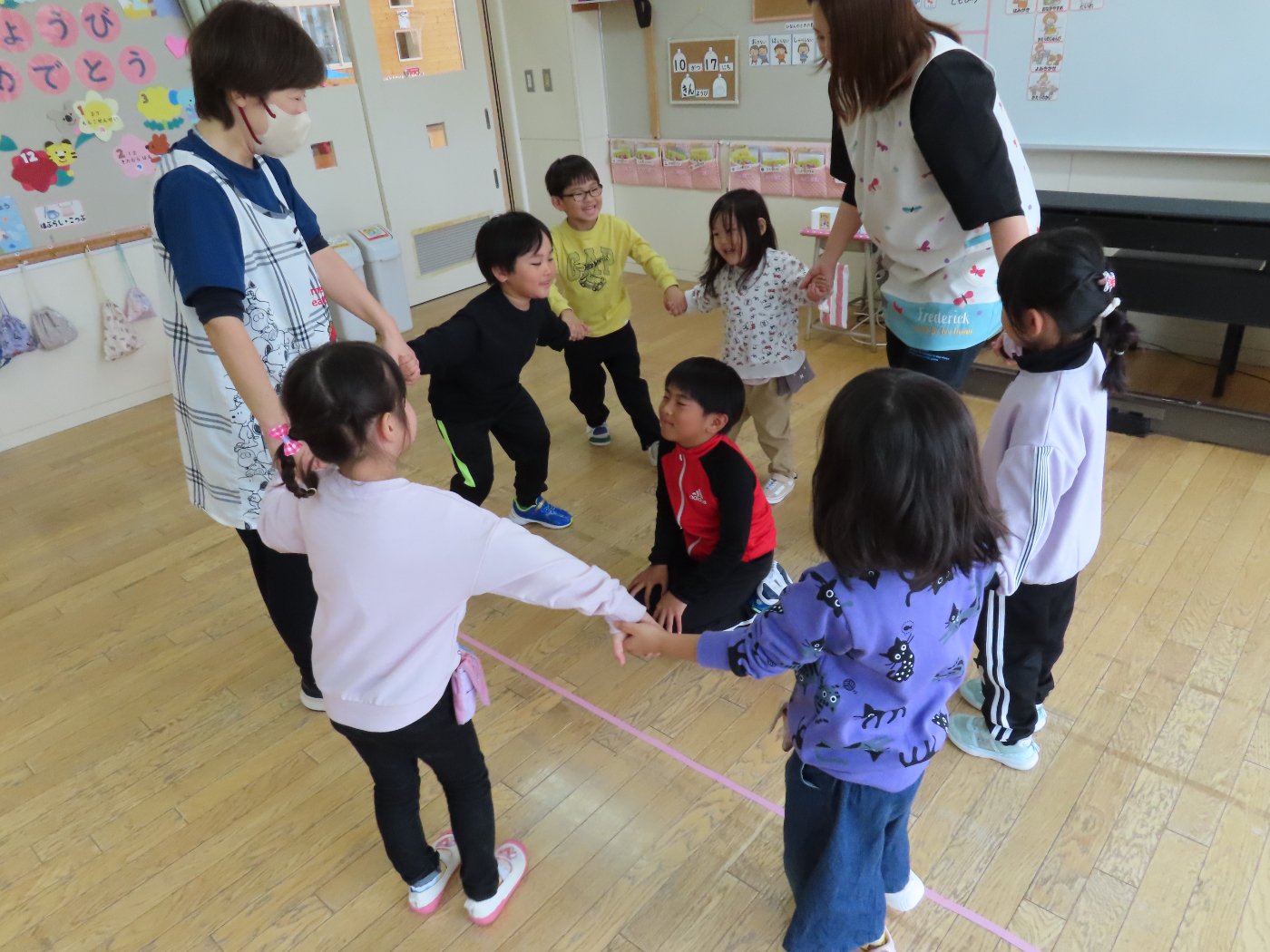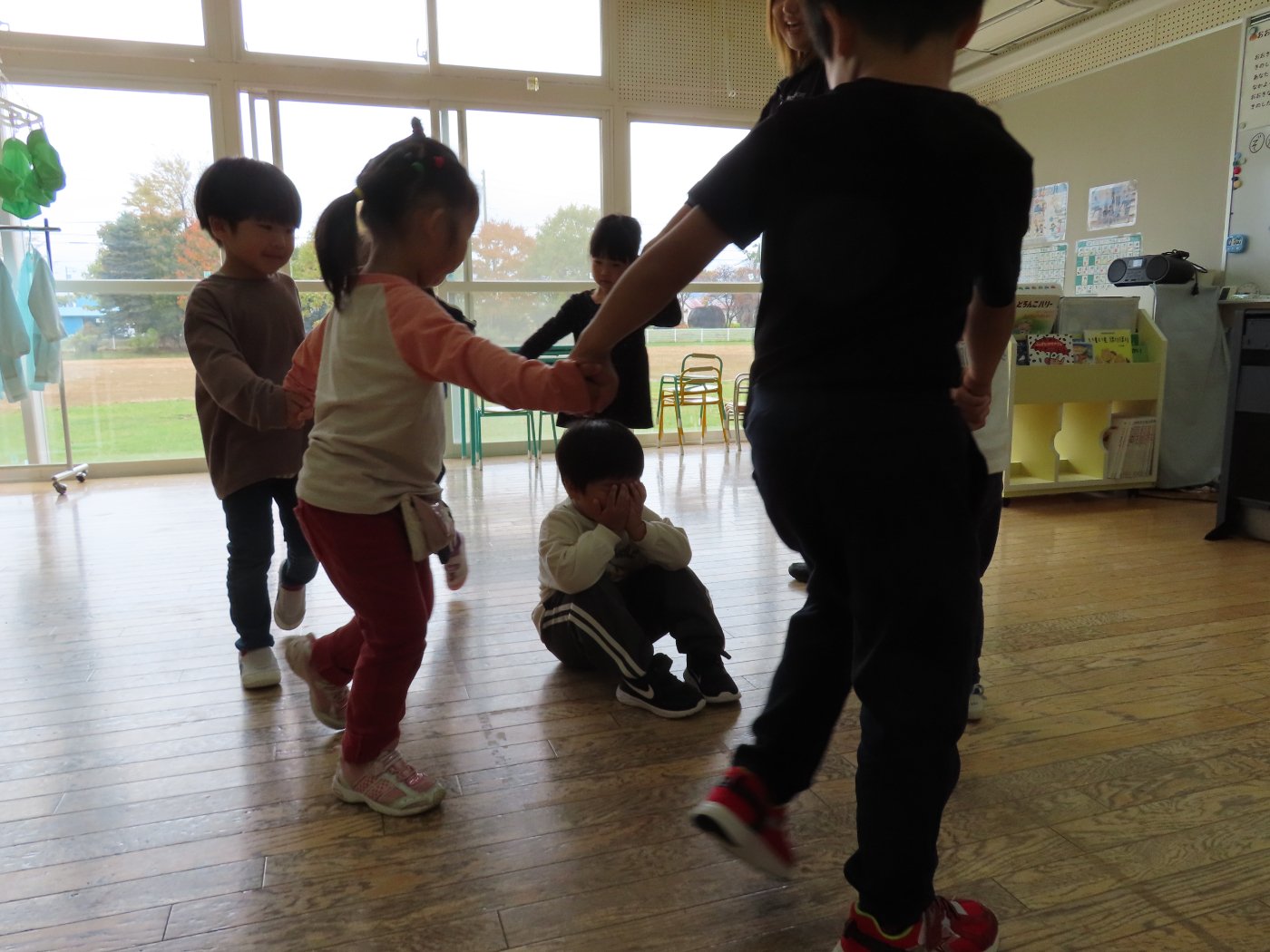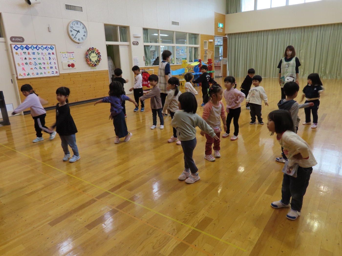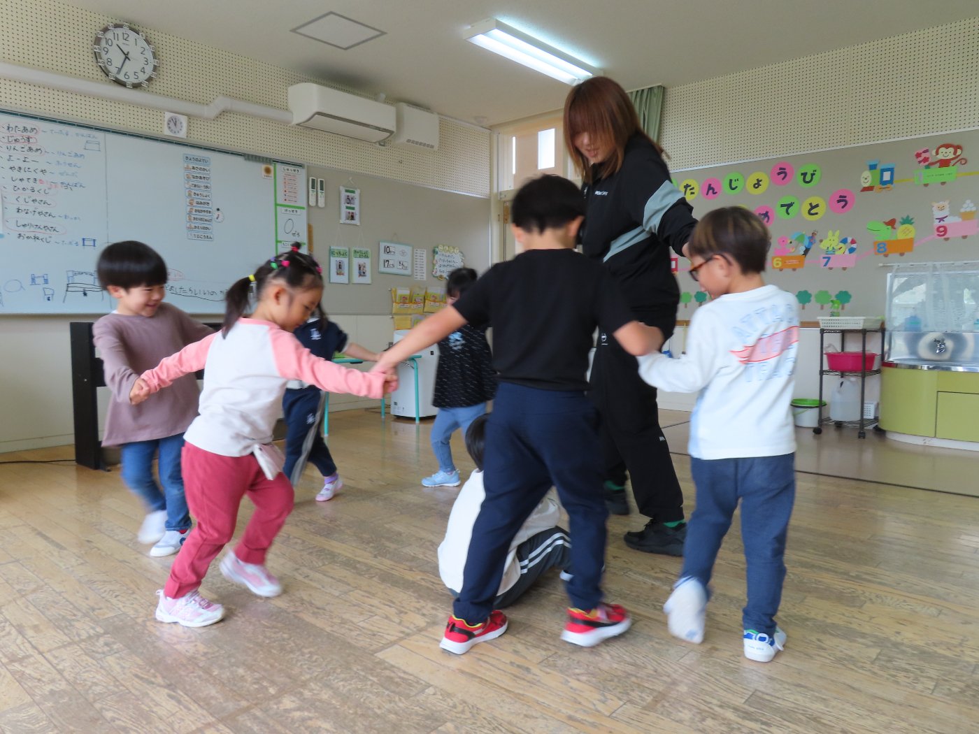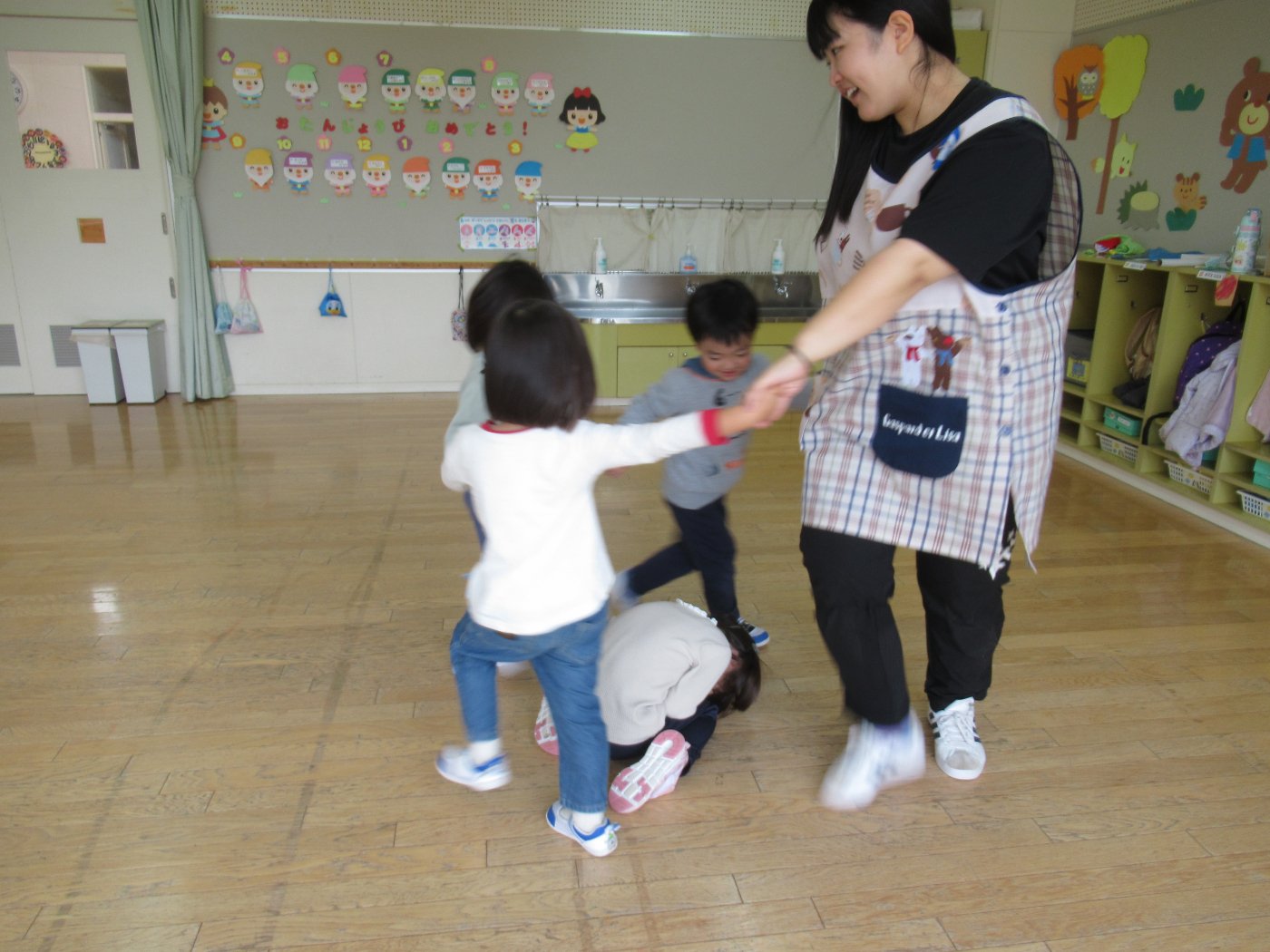 初回は少し緊張しながらも、いつもと違う仲間、前に立つ先生や保育室に、わくわく感の方が高まっていた子ども達。クラス仲間の名前を覚える、親しみがわくきっかけ作りとして、名前を言い当てる伝承遊び『かごめかごめ』も各クラスで取り入れました。その後、全園児でも楽しみ、大いに盛り上がっていました。
