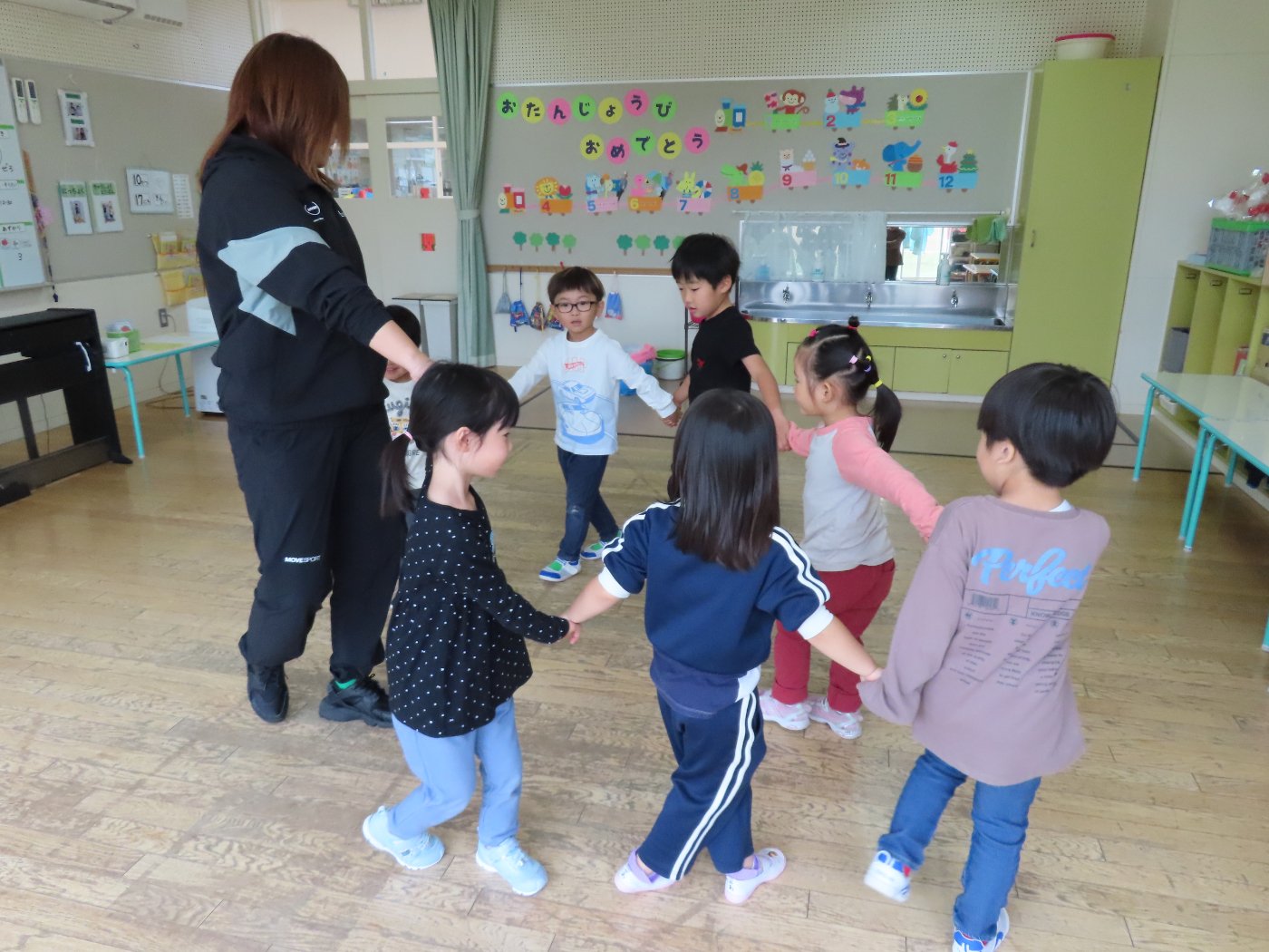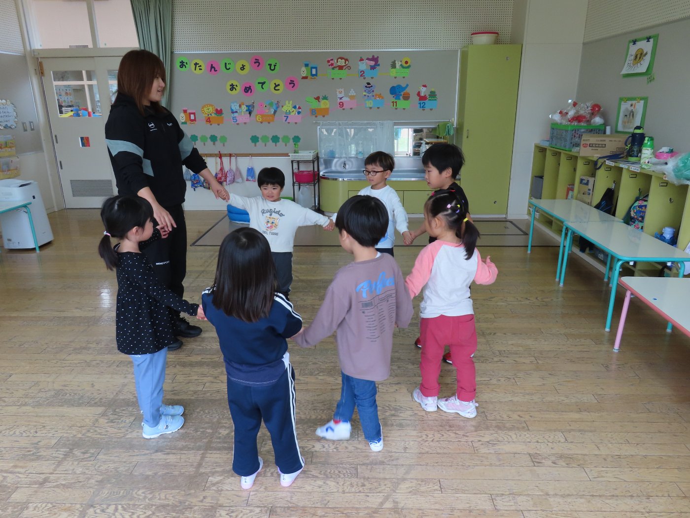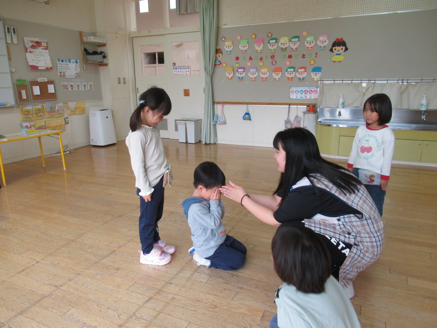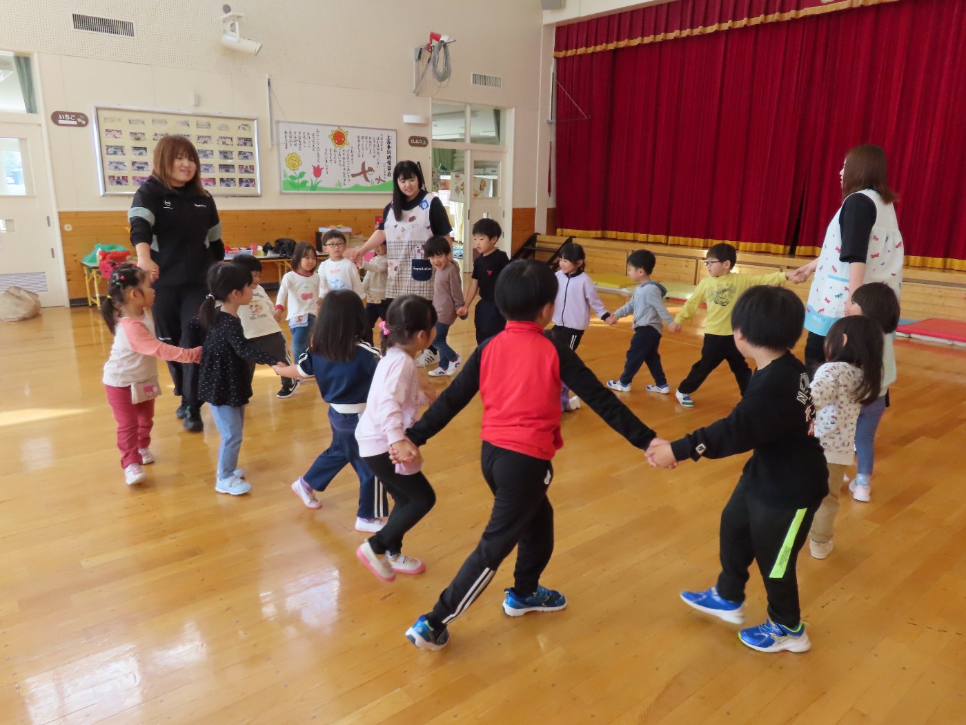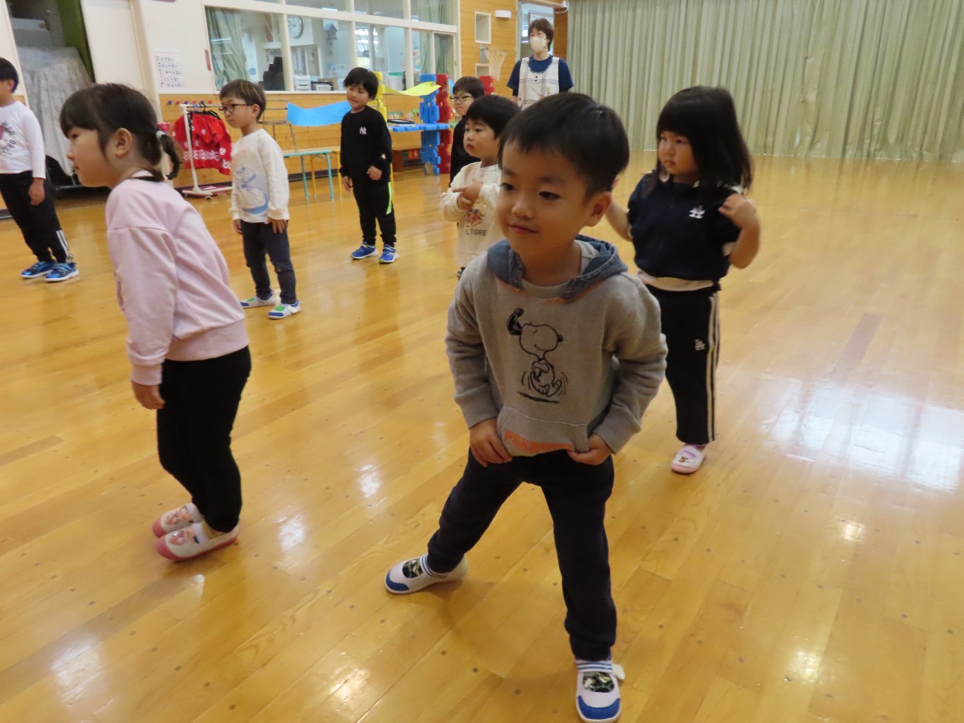 初回は少し緊張しながらも、いつもと違う仲間、前に立つ先生や保育室に、わくわく感の方が高まっていた子ども達。クラス仲間の名前を覚える、親しみがわくきっかけ作りとして、名前を言い当てる伝承遊び『かごめかごめ』も各クラスで取り入れました。その後、全園児でも楽しみ、大いに盛り上がっていました。