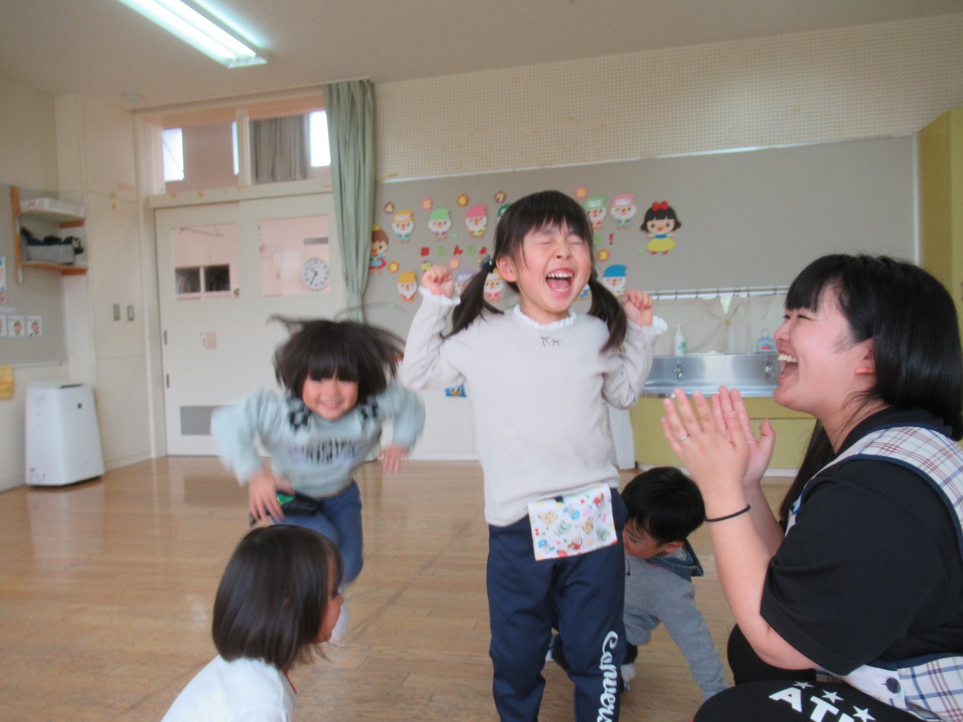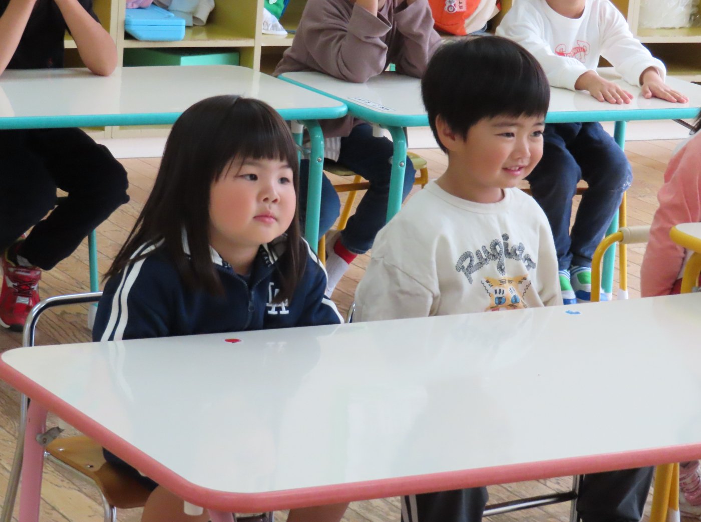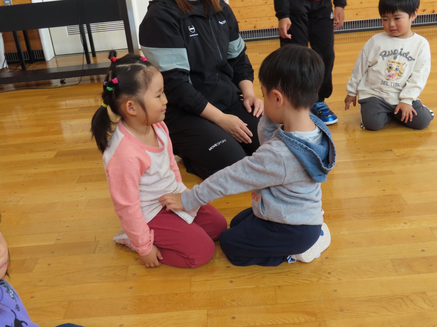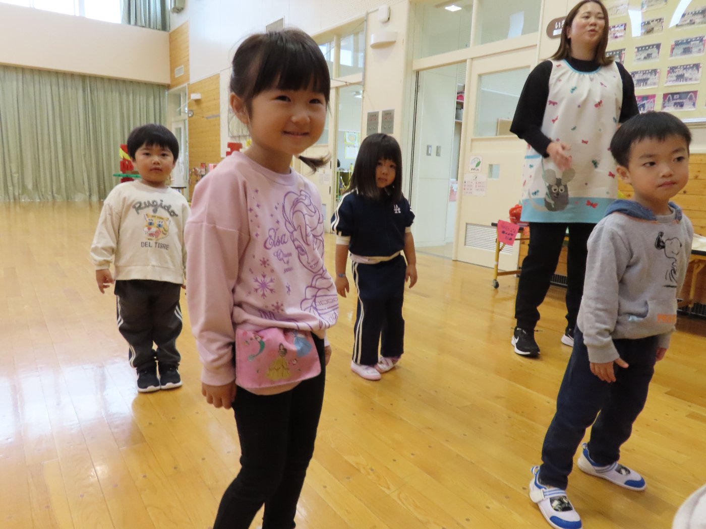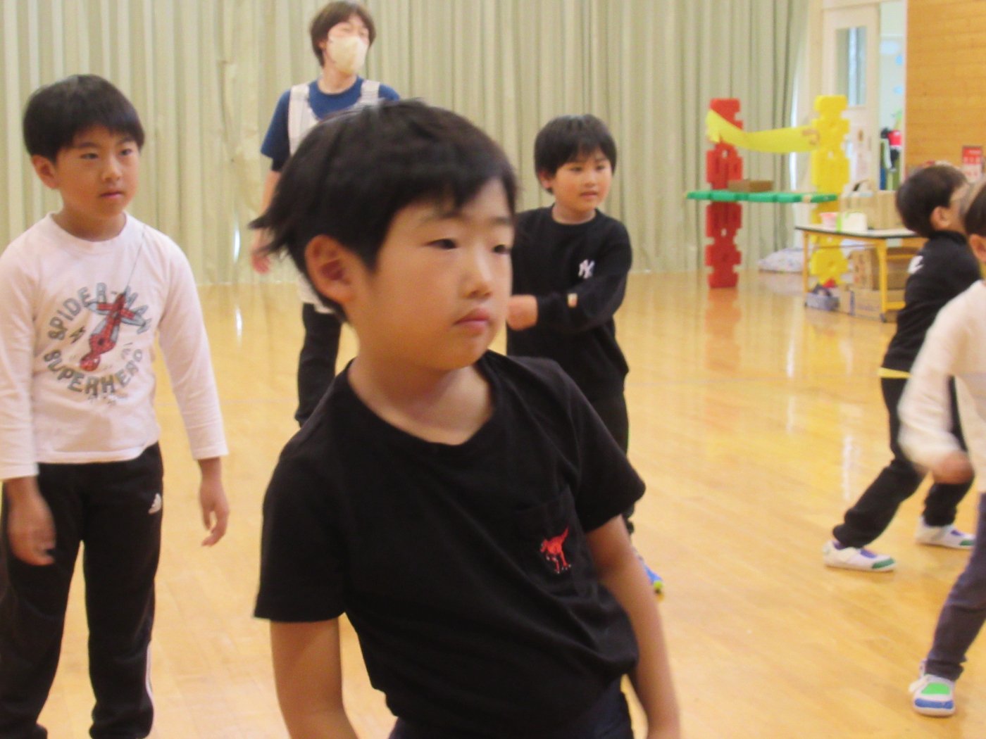初回は少し緊張しながらも、いつもと違う仲間、前に立つ先生や保育室に、わくわく感の方が高まっていた子ども達。クラス仲間の名前を覚える、親しみがわくきっかけ作りとして、名前を言い当てる伝承遊び『かごめかごめ』も各クラスで取り入れました。その後、全園児でも楽しみ、大いに盛り上がっていました。