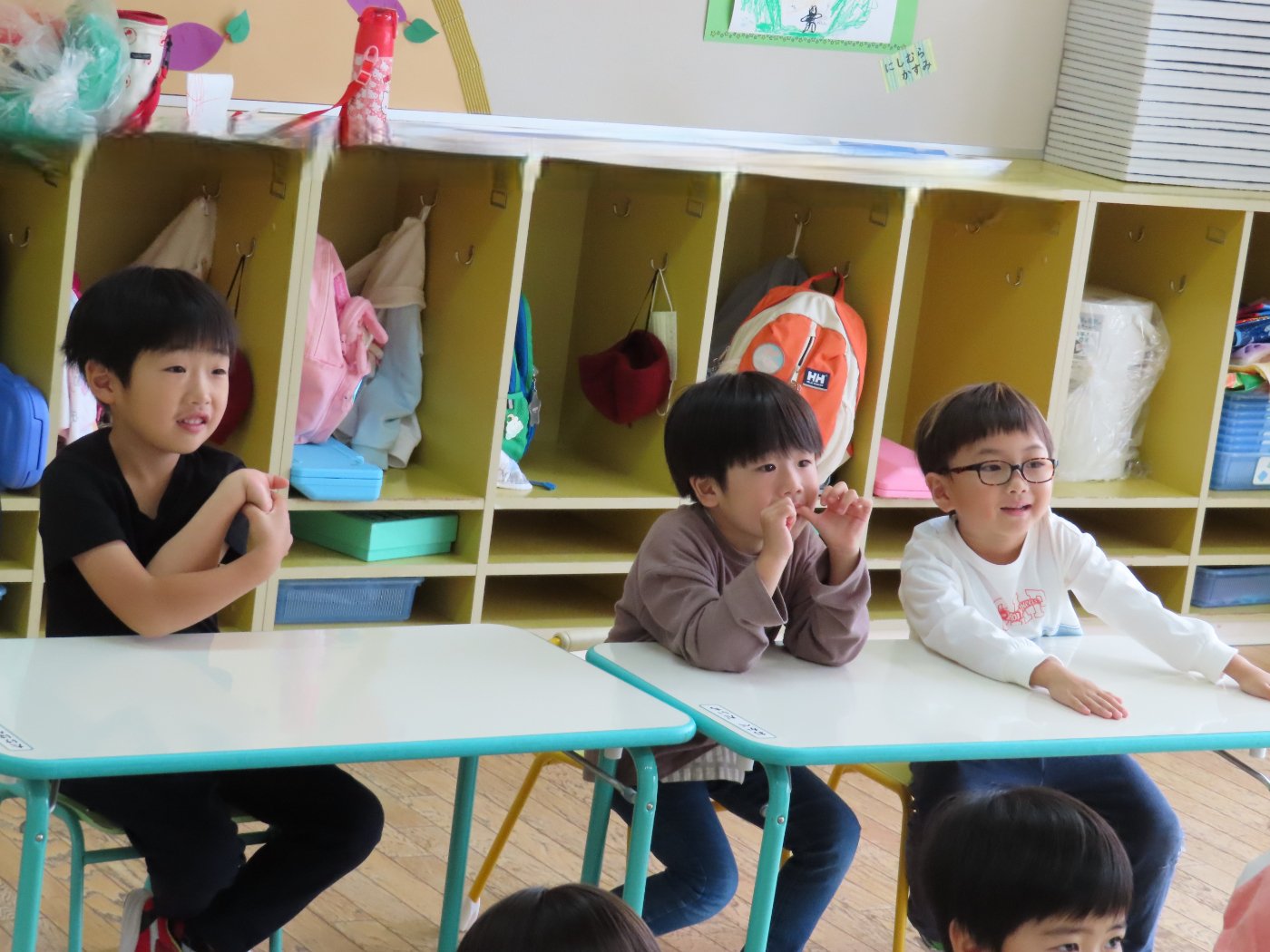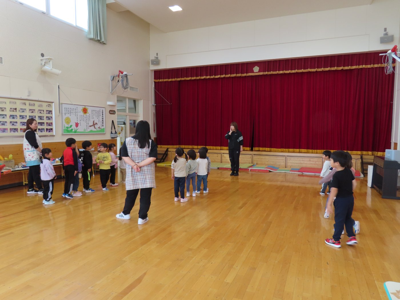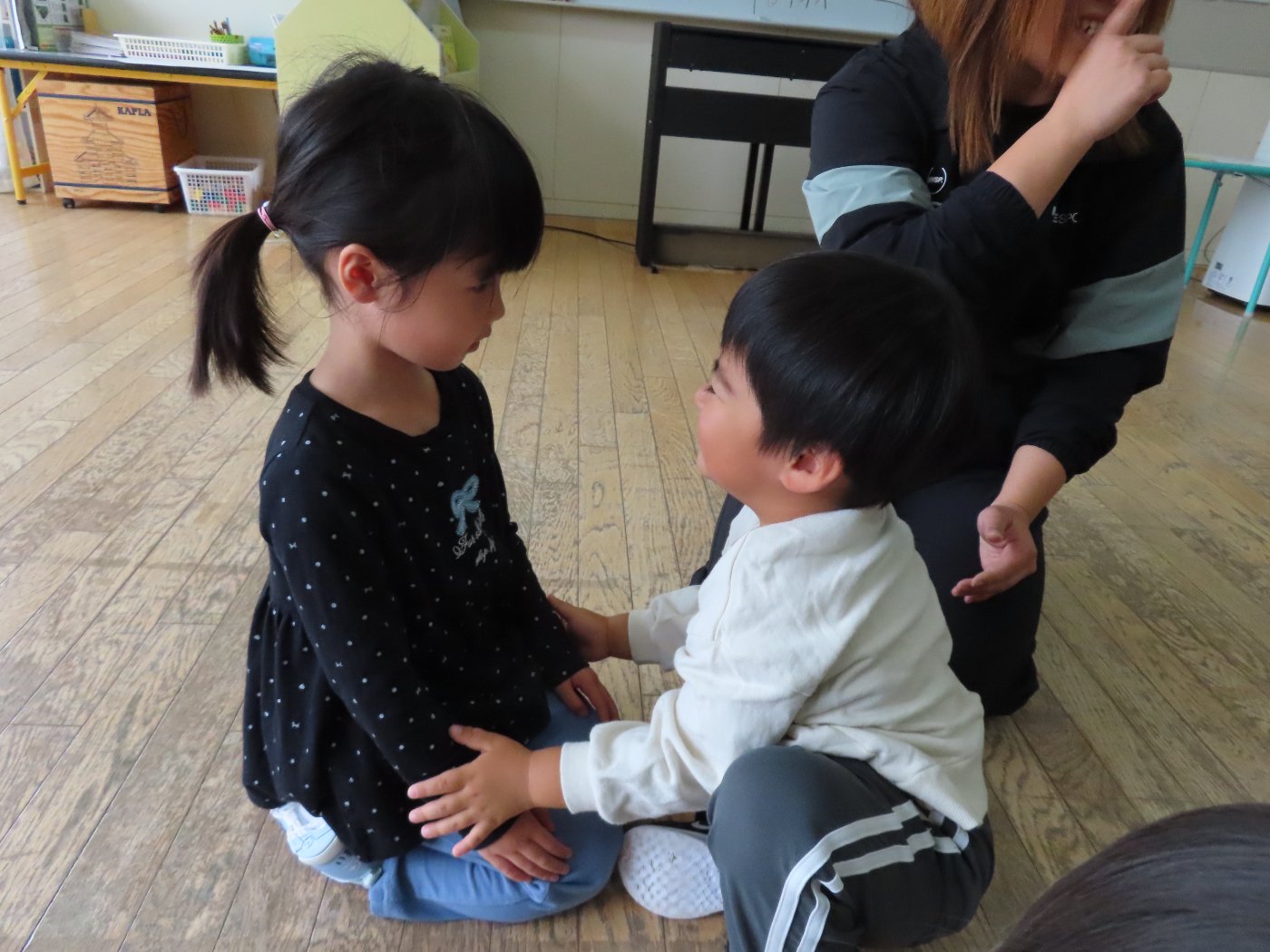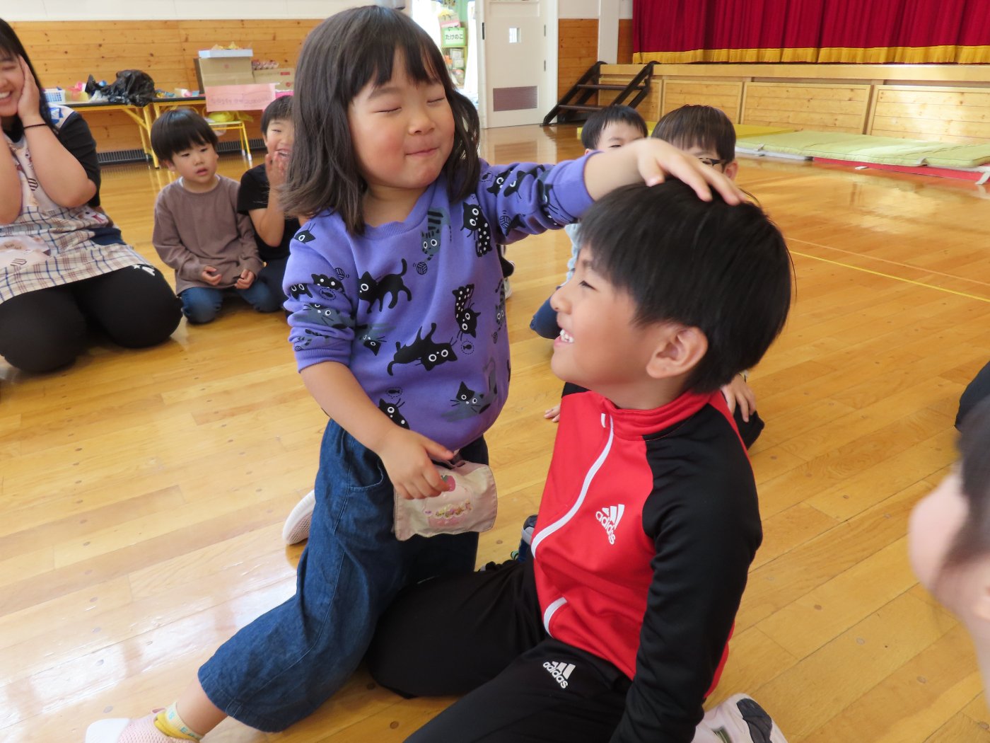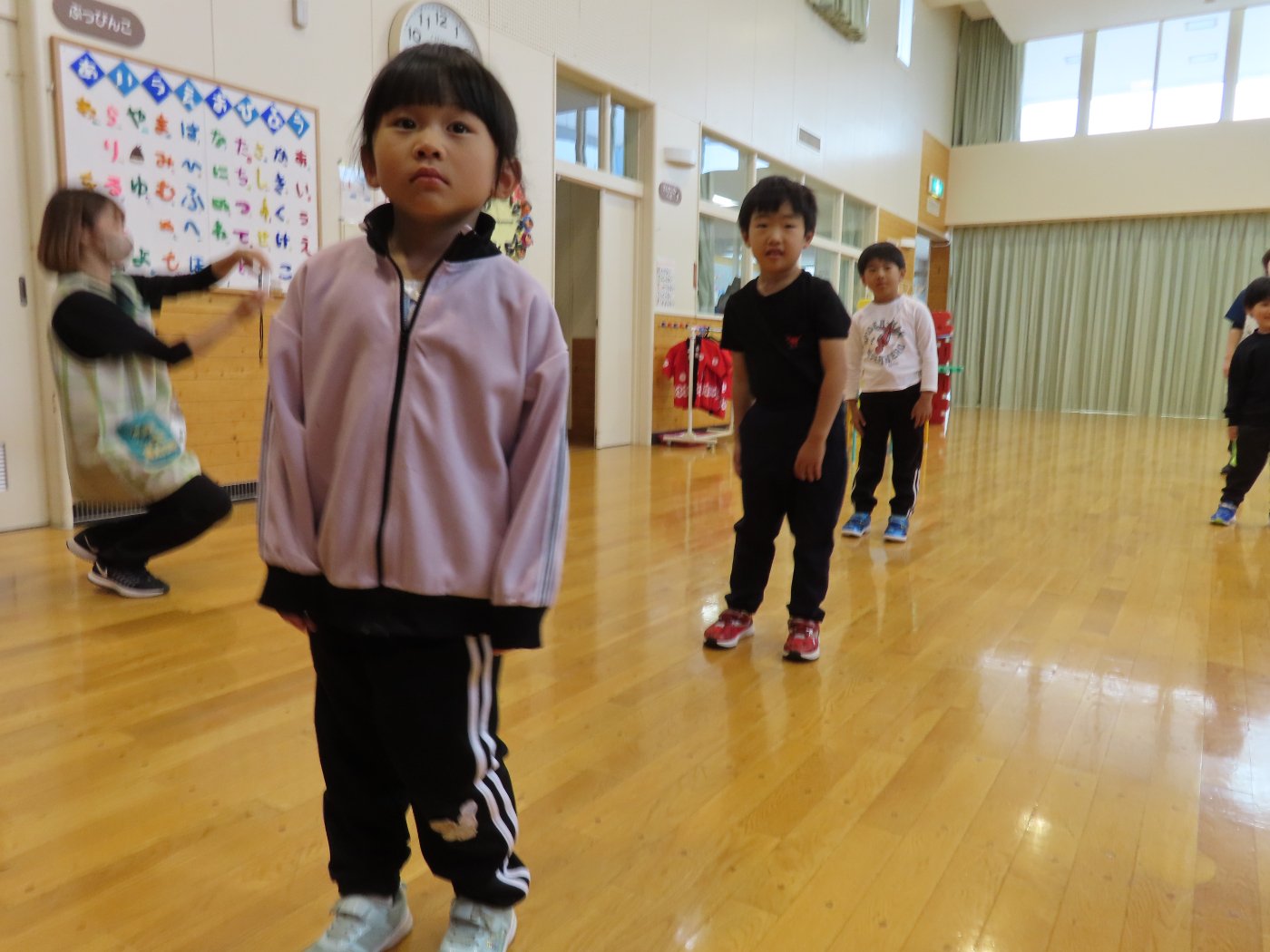 初回は少し緊張しながらも、いつもと違う仲間、前に立つ先生や保育室に、わくわく感の方が高まっていた子ども達。クラス仲間の名前を覚える、親しみがわくきっかけ作りとして、名前を言い当てる伝承遊び『かごめかごめ』も各クラスで取り入れました。その後、全園児でも楽しみ、大いに盛り上がっていました。