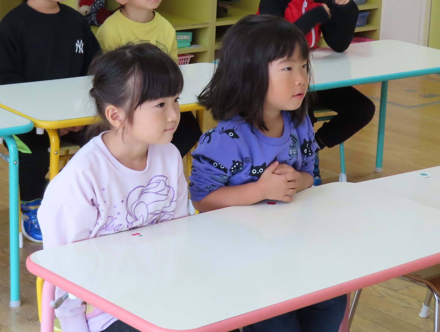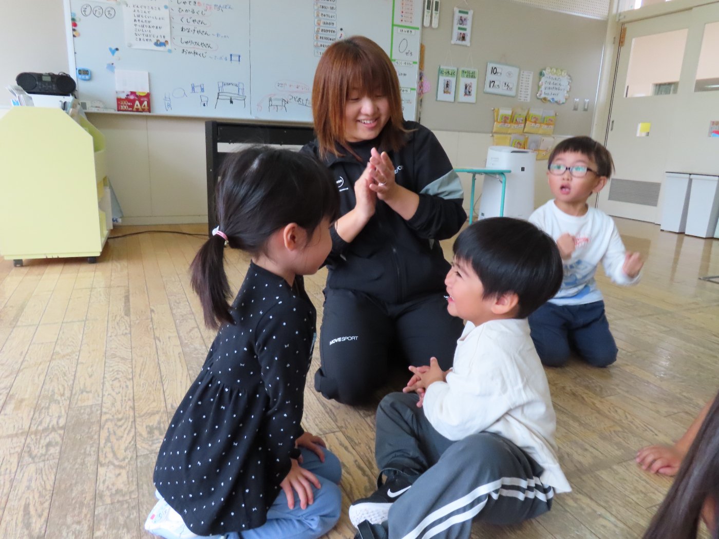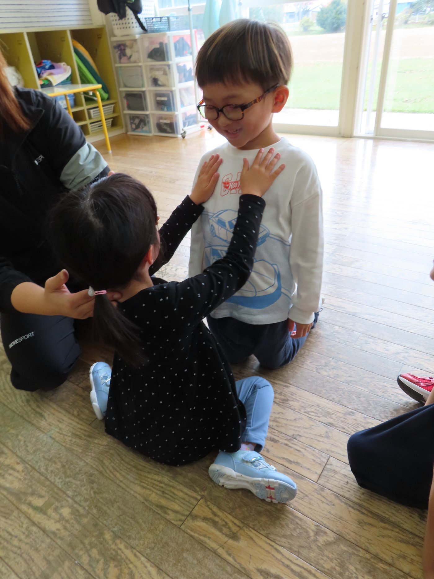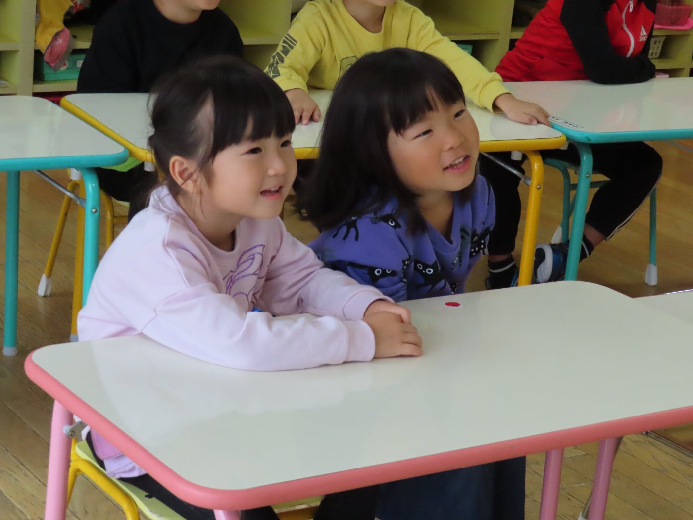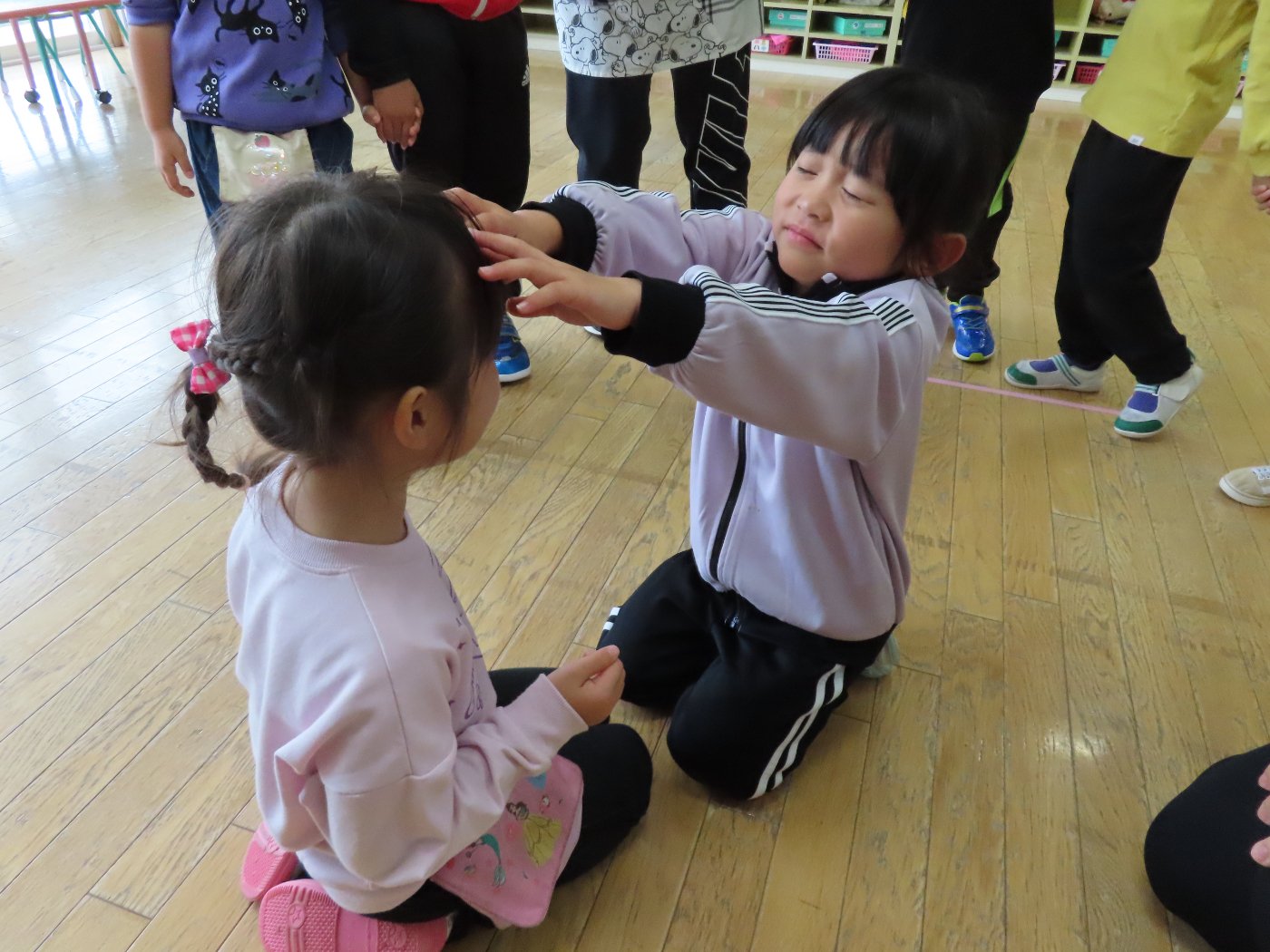 初回は少し緊張しながらも、いつもと違う仲間、前に立つ先生や保育室に、わくわく感の方が高まっていた子ども達。クラス仲間の名前を覚える、親しみがわくきっかけ作りとして、名前を言い当てる伝承遊び『かごめかごめ』も各クラスで取り入れました。その後、全園児でも楽しみ、大いに盛り上がっていました。