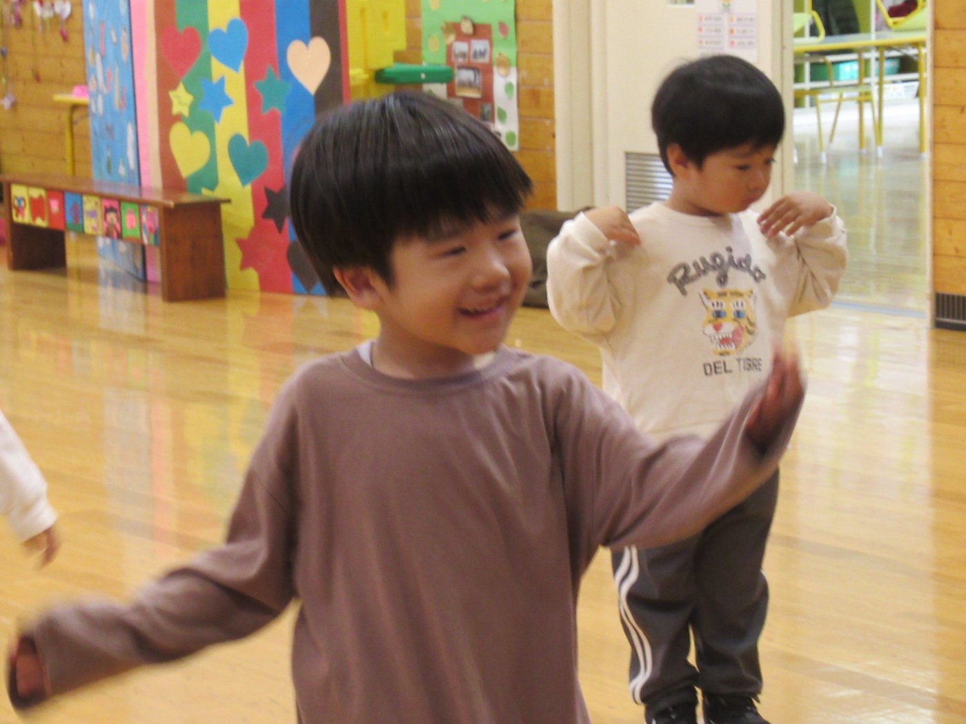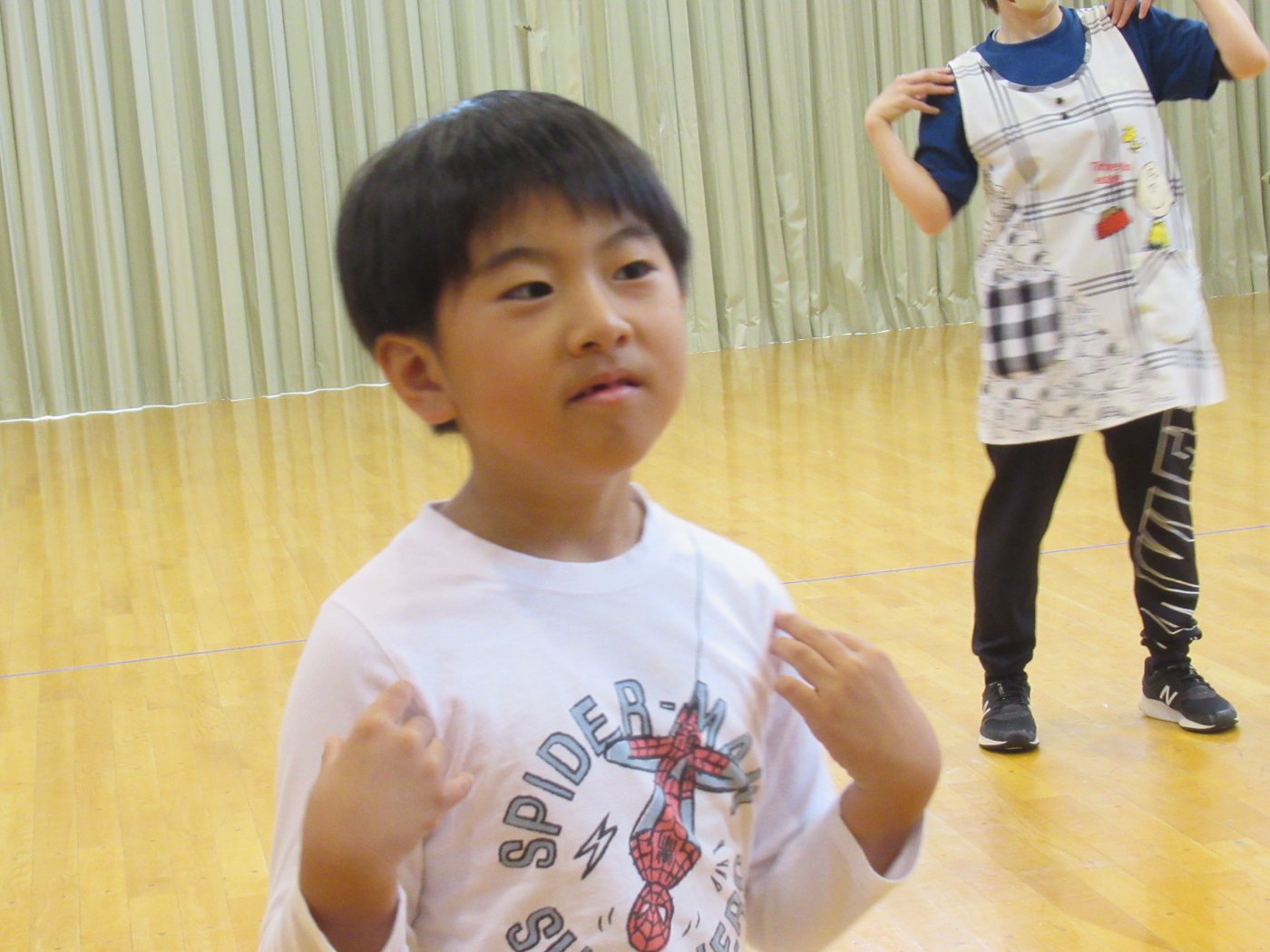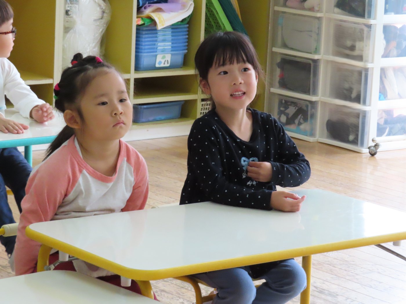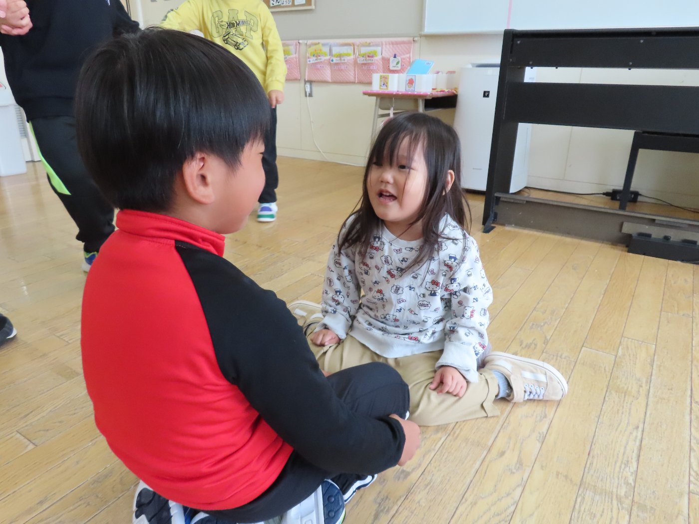 初回は少し緊張しながらも、いつもと違う仲間、前に立つ先生や保育室に、わくわく感の方が高まっていた子ども達。クラス仲間の名前を覚える、親しみがわくきっかけ作りとして、名前を言い当てる伝承遊び『かごめかごめ』も各クラスで取り入れました。その後、全園児でも楽しみ、大いに盛り上がっていました。