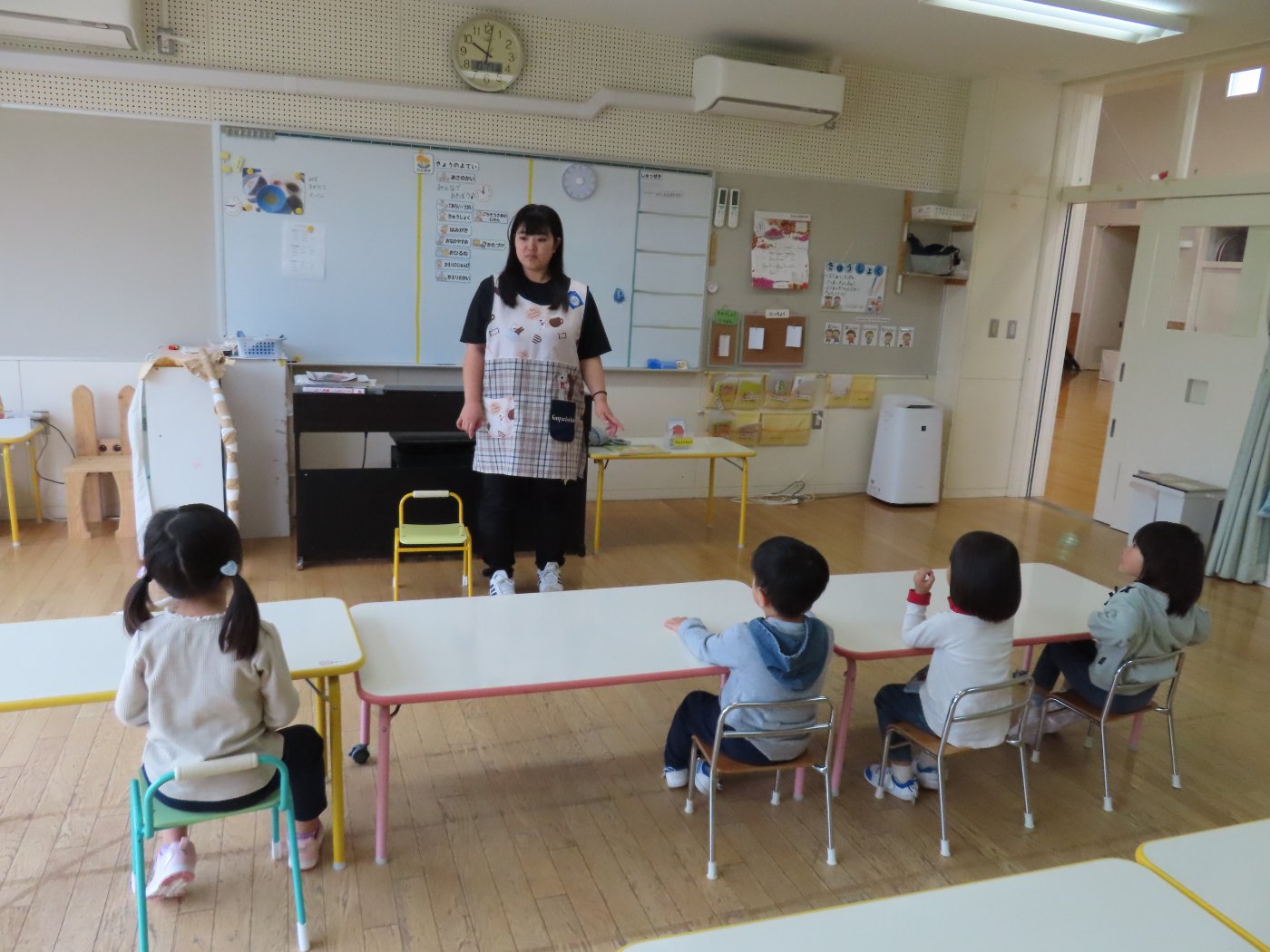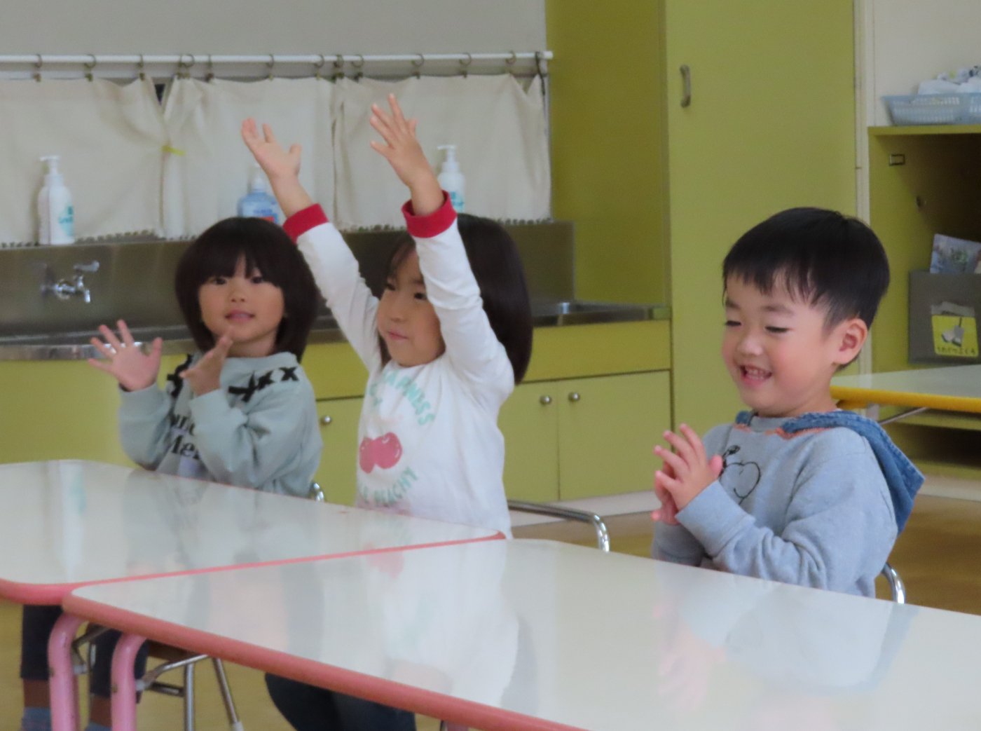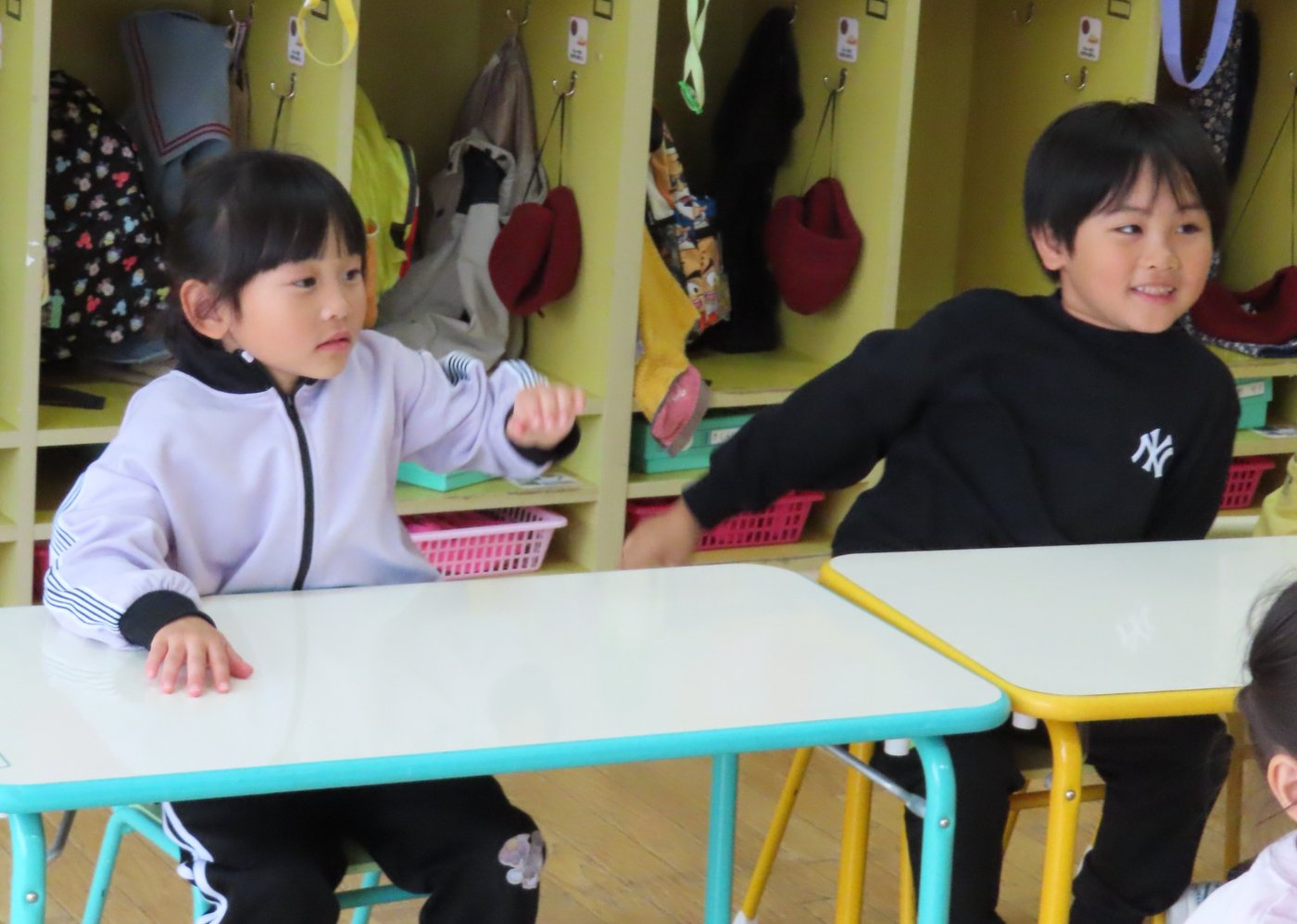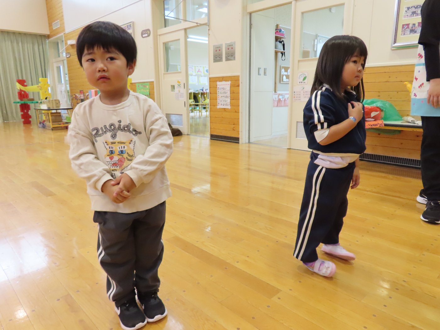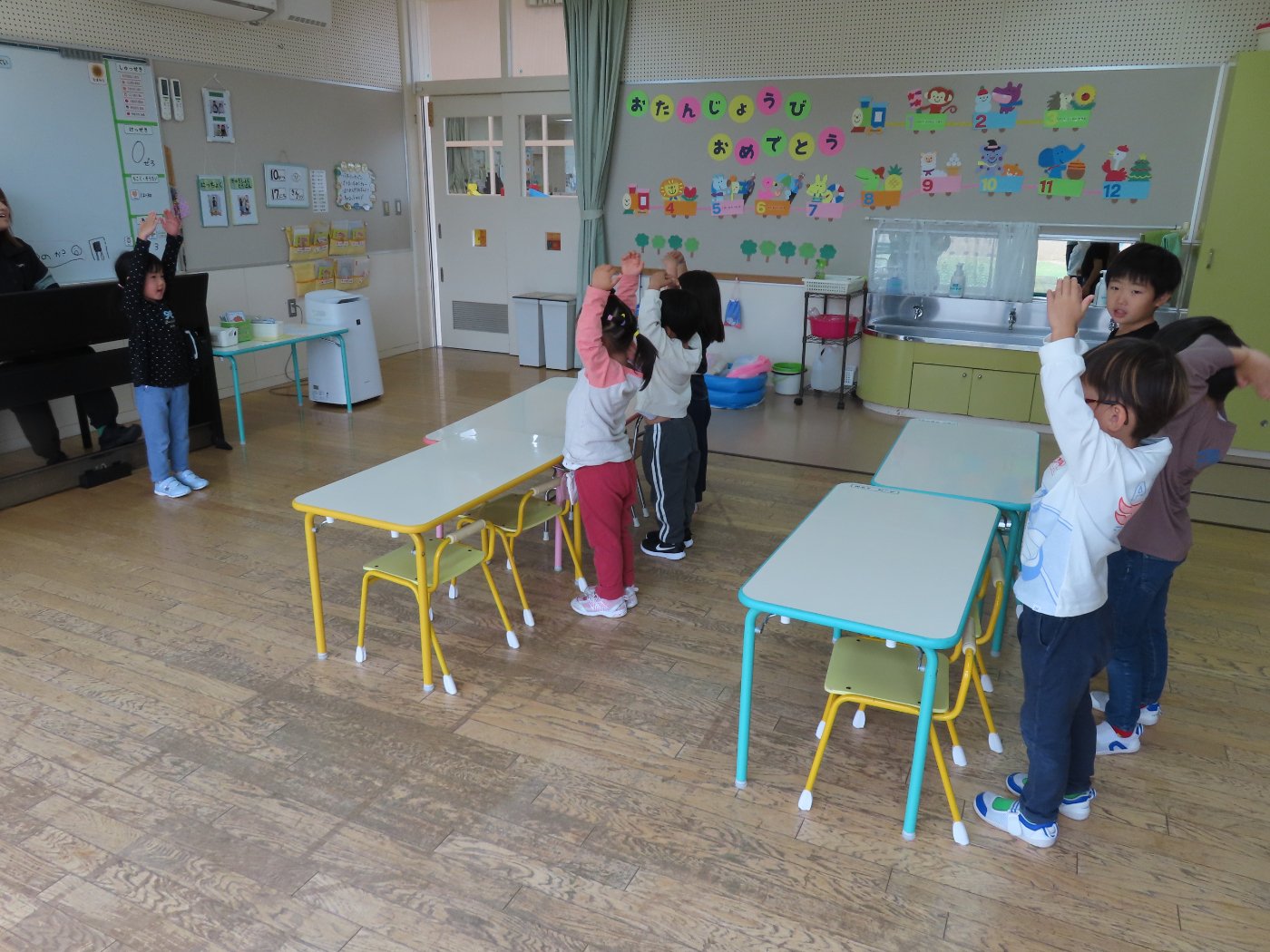 初回は少し緊張しながらも、いつもと違う仲間、前に立つ先生や保育室に、わくわく感の方が高まっていた子ども達。クラス仲間の名前を覚える、親しみがわくきっかけ作りとして、名前を言い当てる伝承遊び『かごめかごめ』も各クラスで取り入れました。その後、全園児でも楽しみ、大いに盛り上がっていました。