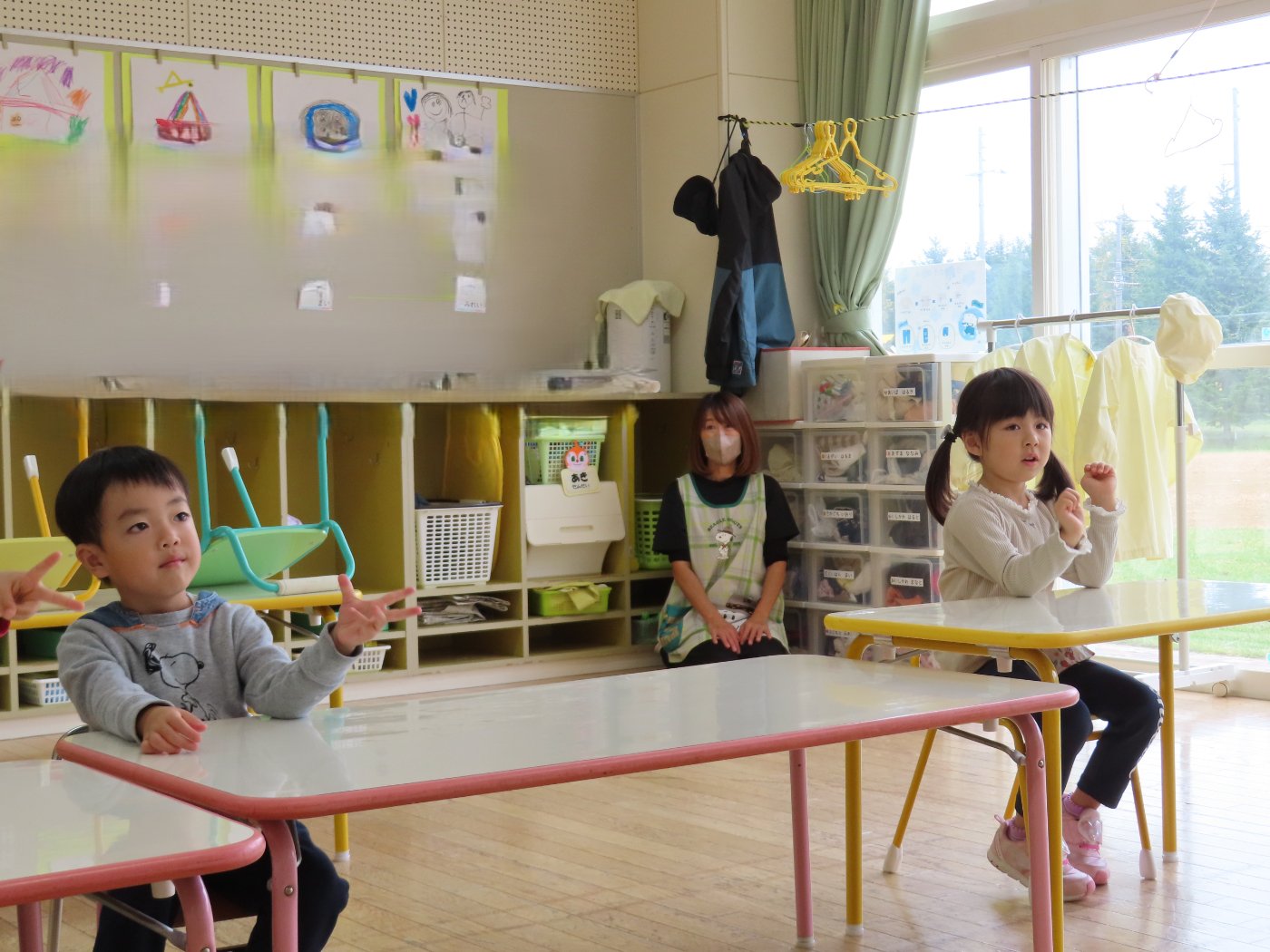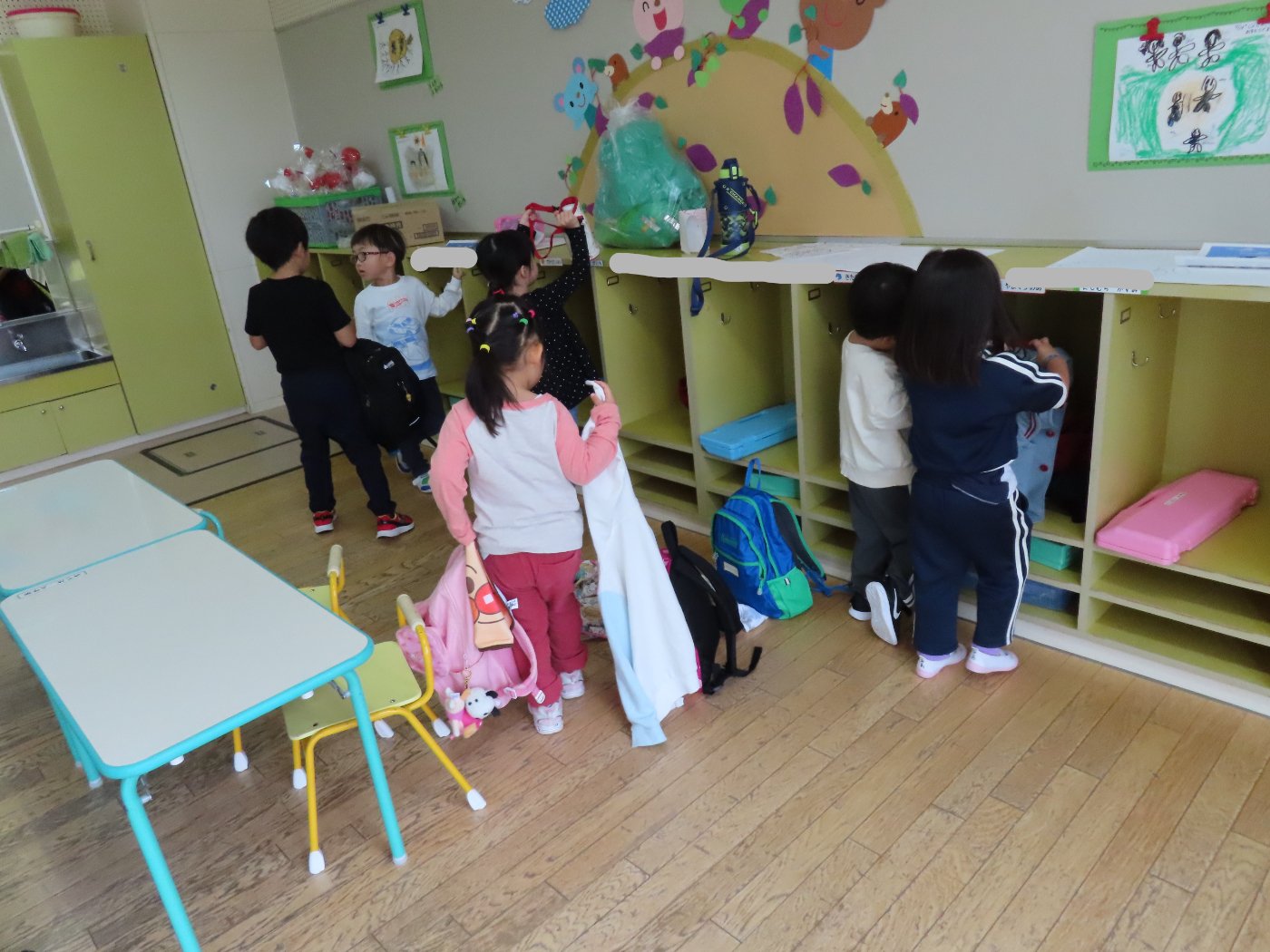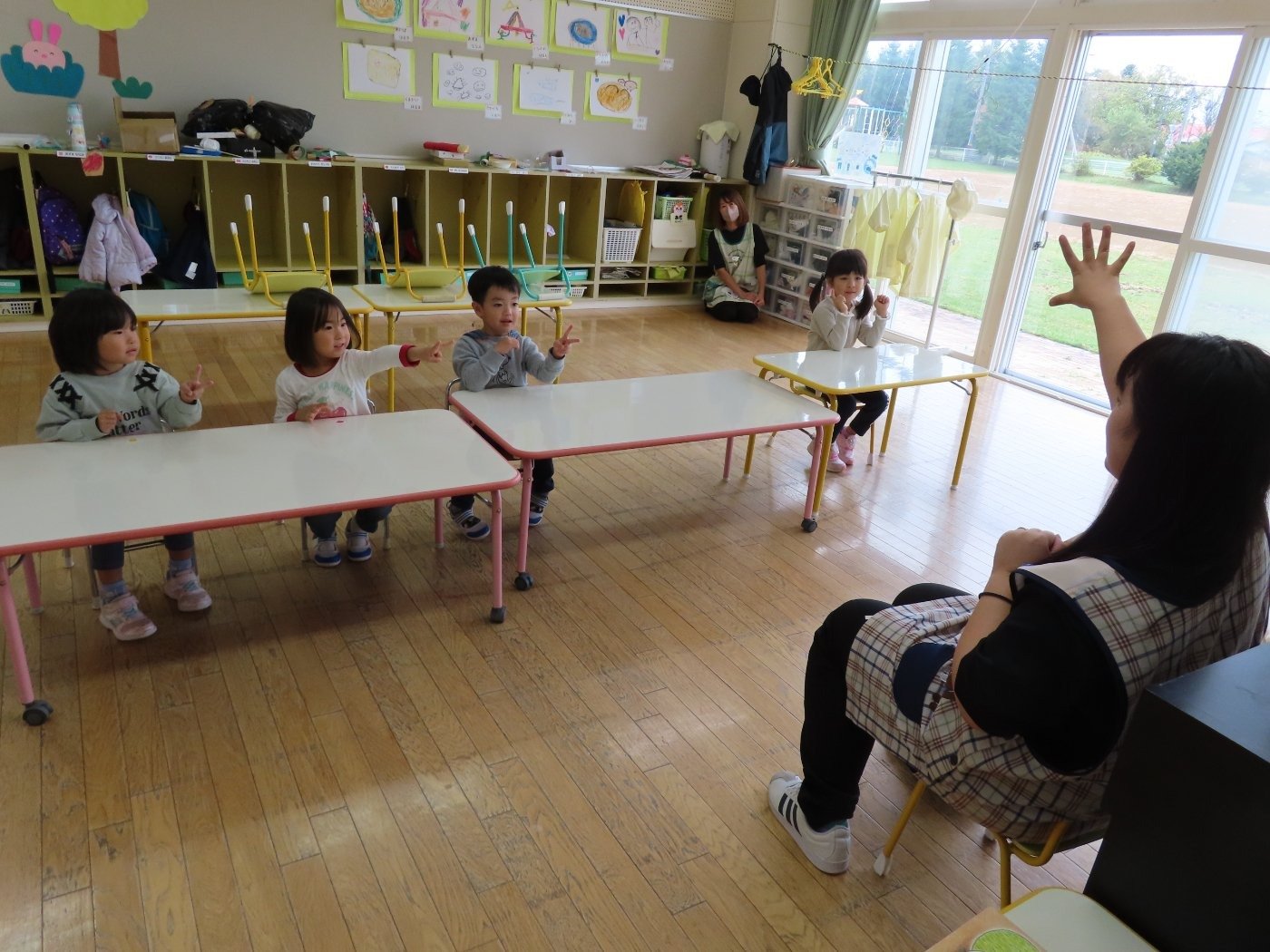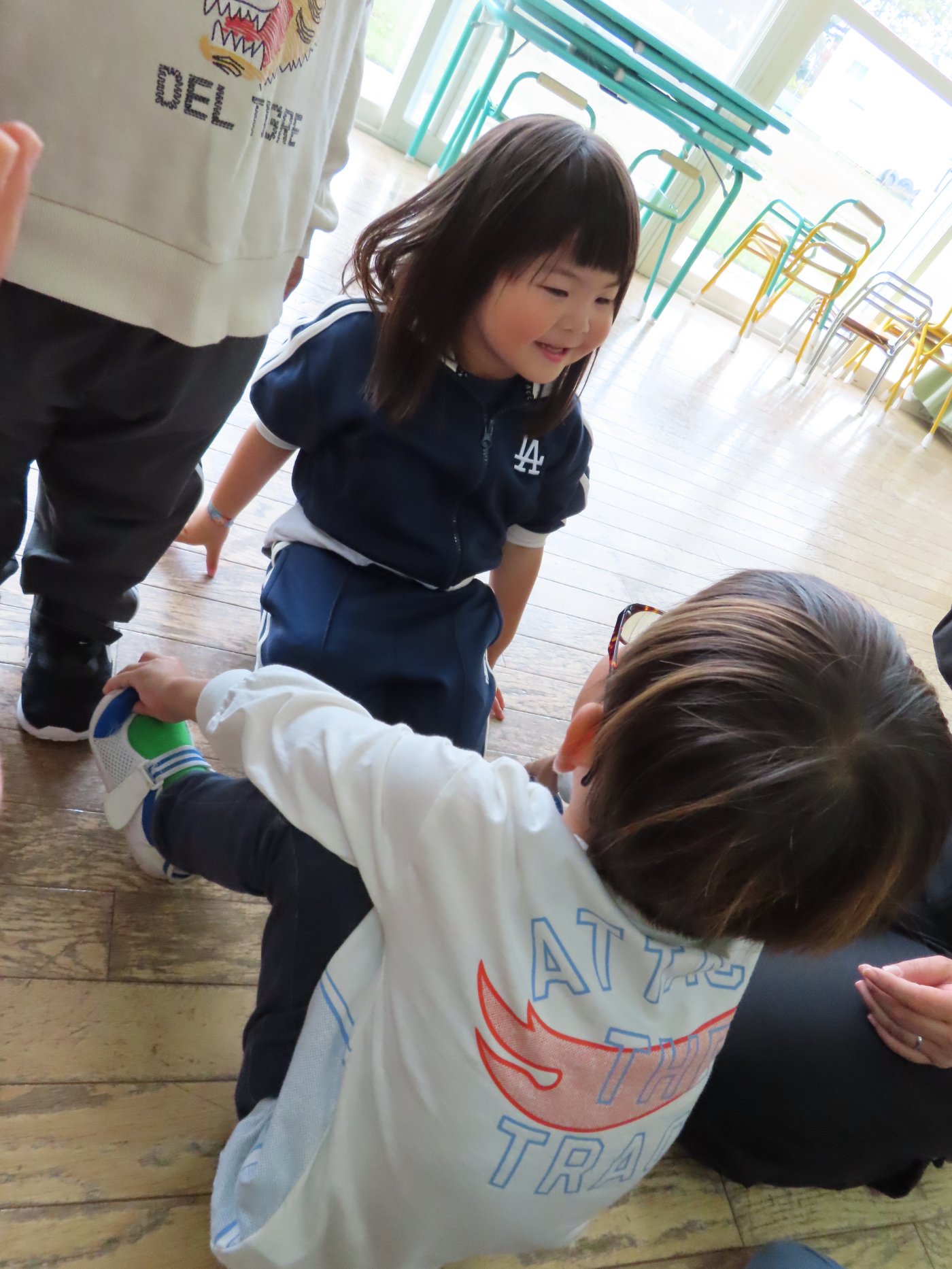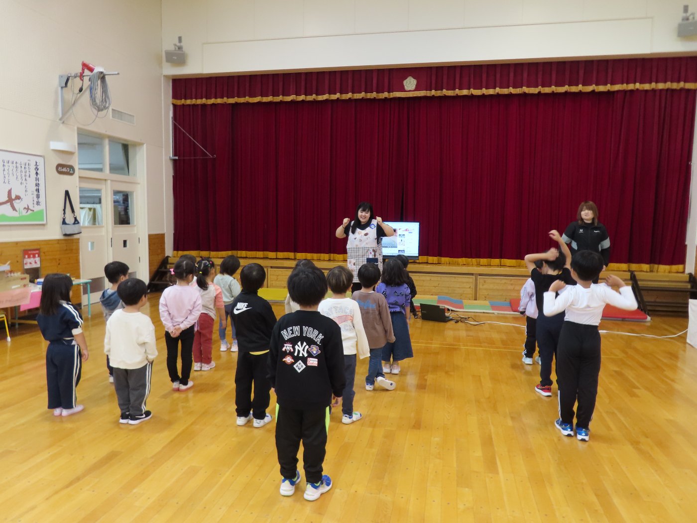 初回は少し緊張しながらも、いつもと違う仲間、前に立つ先生や保育室に、わくわく感の方が高まっていた子ども達。クラス仲間の名前を覚える、親しみがわくきっかけ作りとして、名前を言い当てる伝承遊び『かごめかごめ』も各クラスで取り入れました。その後、全園児でも楽しみ、大いに盛り上がっていました。