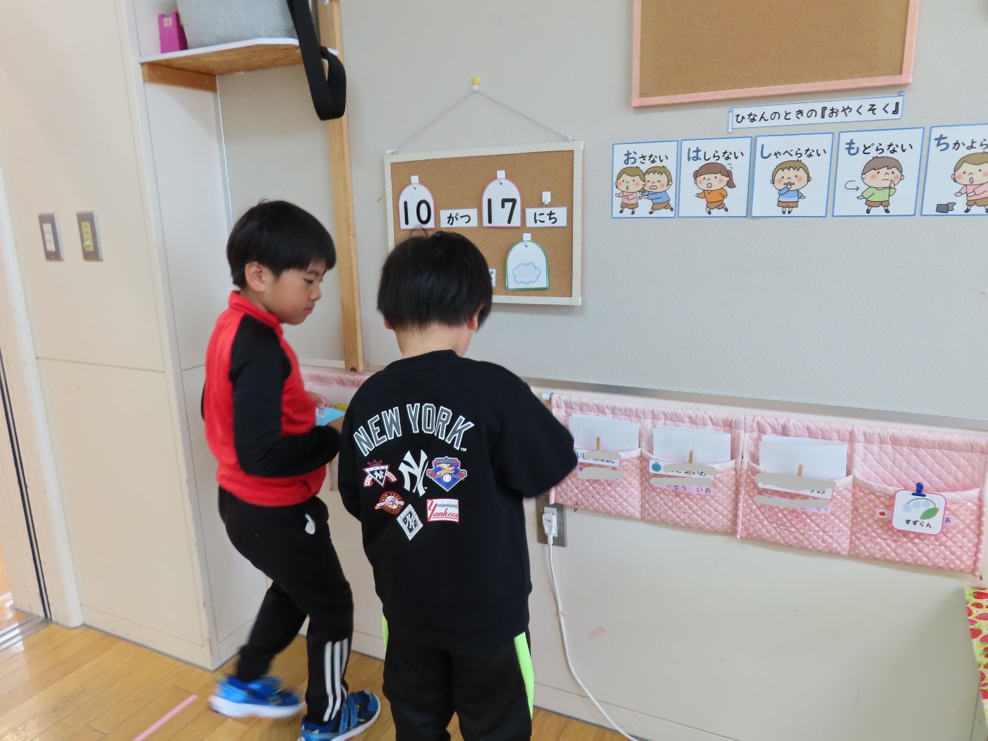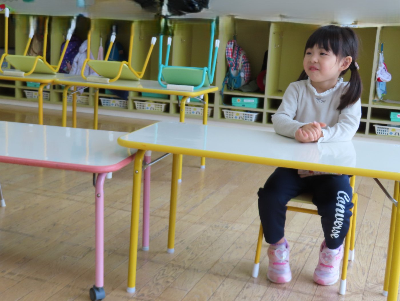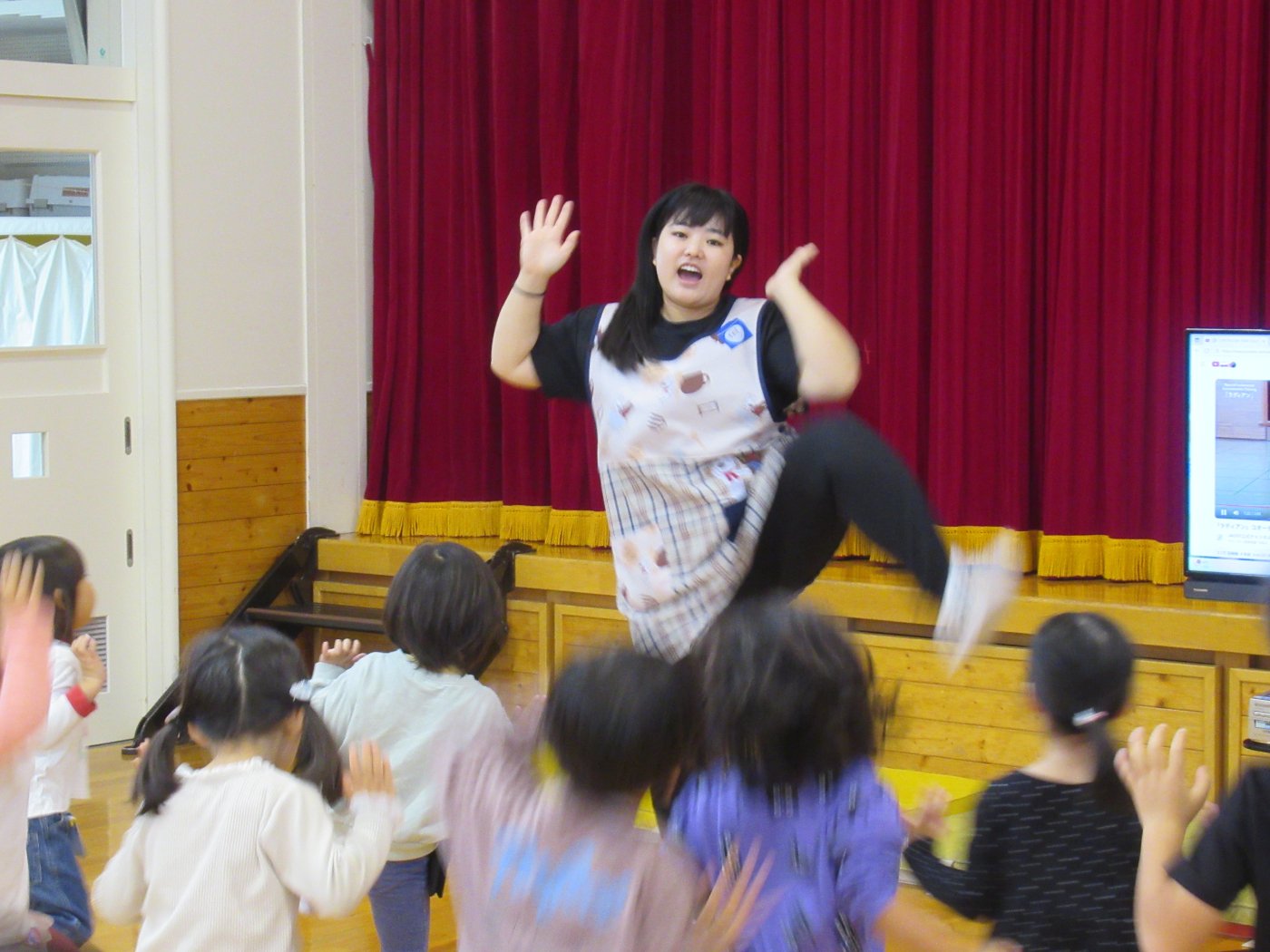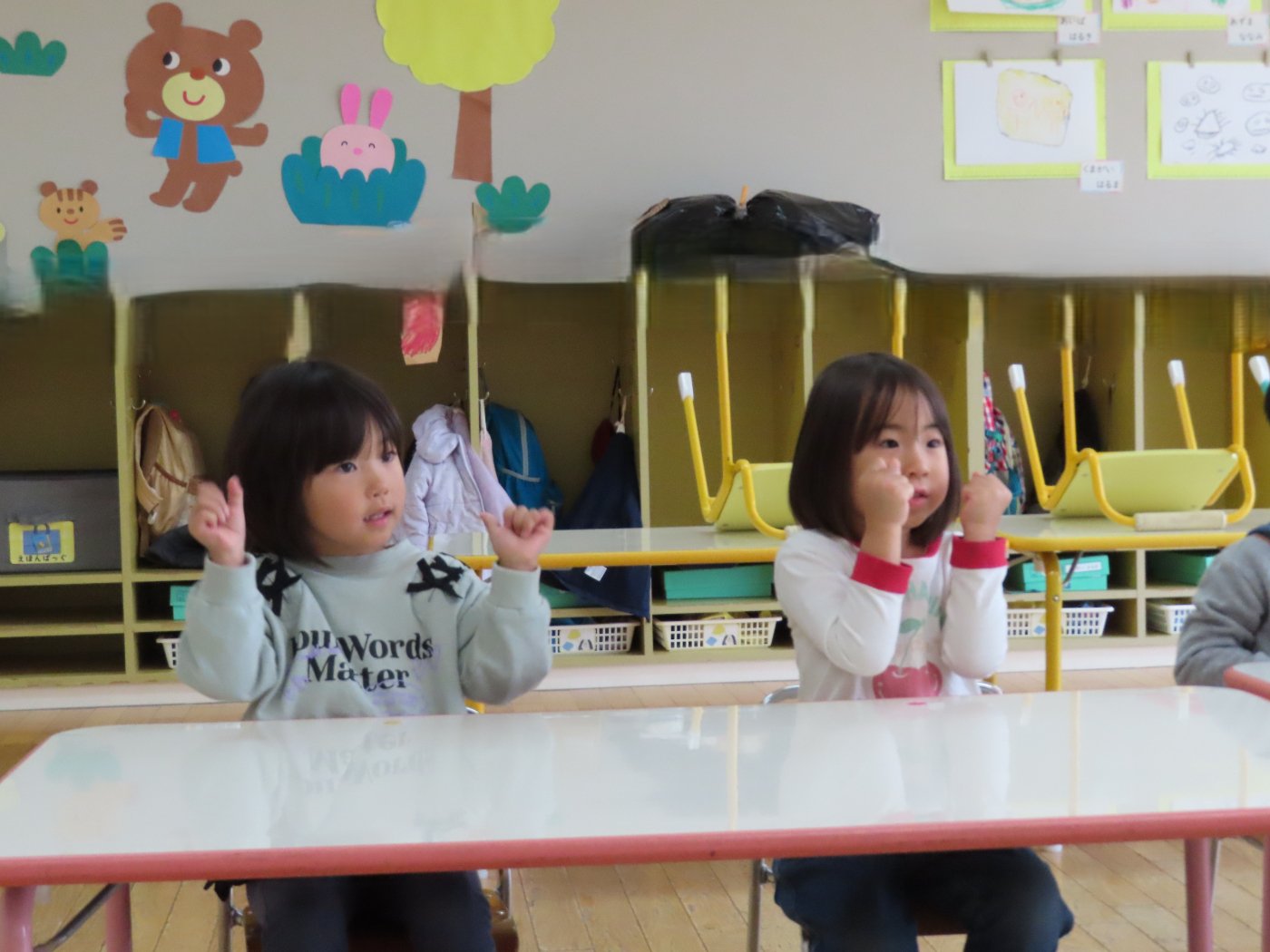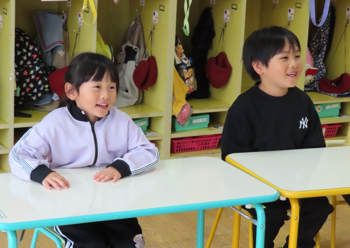 初回は少し緊張しながらも、いつもと違う仲間、前に立つ先生や保育室に、わくわく感の方が高まっていた子ども達。クラス仲間の名前を覚える、親しみがわくきっかけ作りとして、名前を言い当てる伝承遊び『かごめかごめ』も各クラスで取り入れました。その後、全園児でも楽しみ、大いに盛り上がっていました。