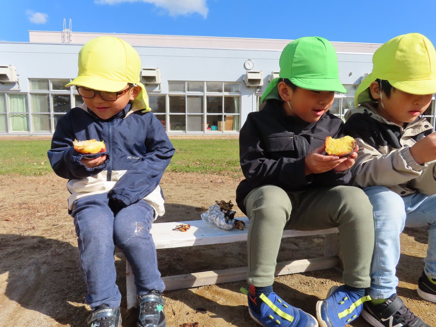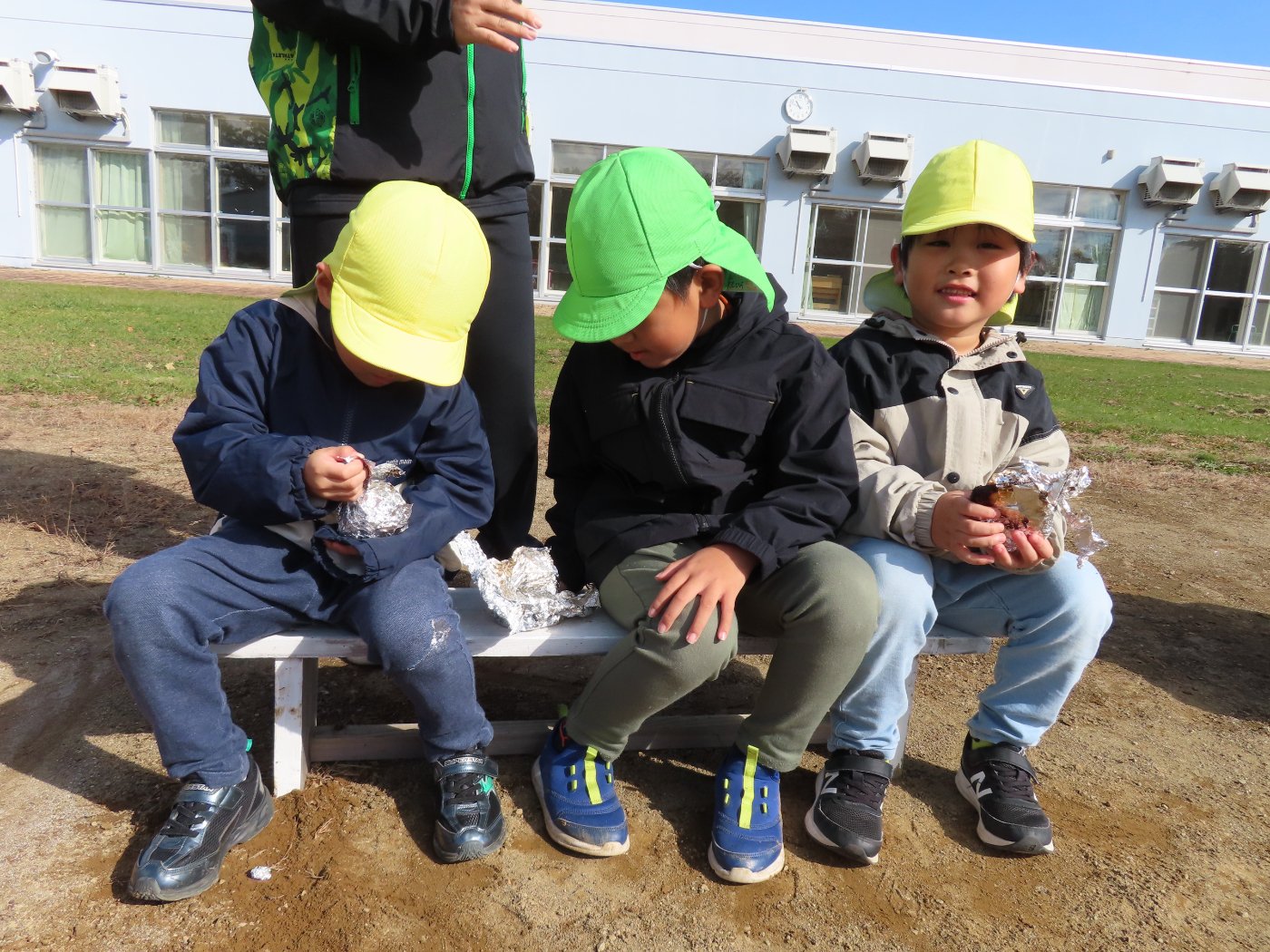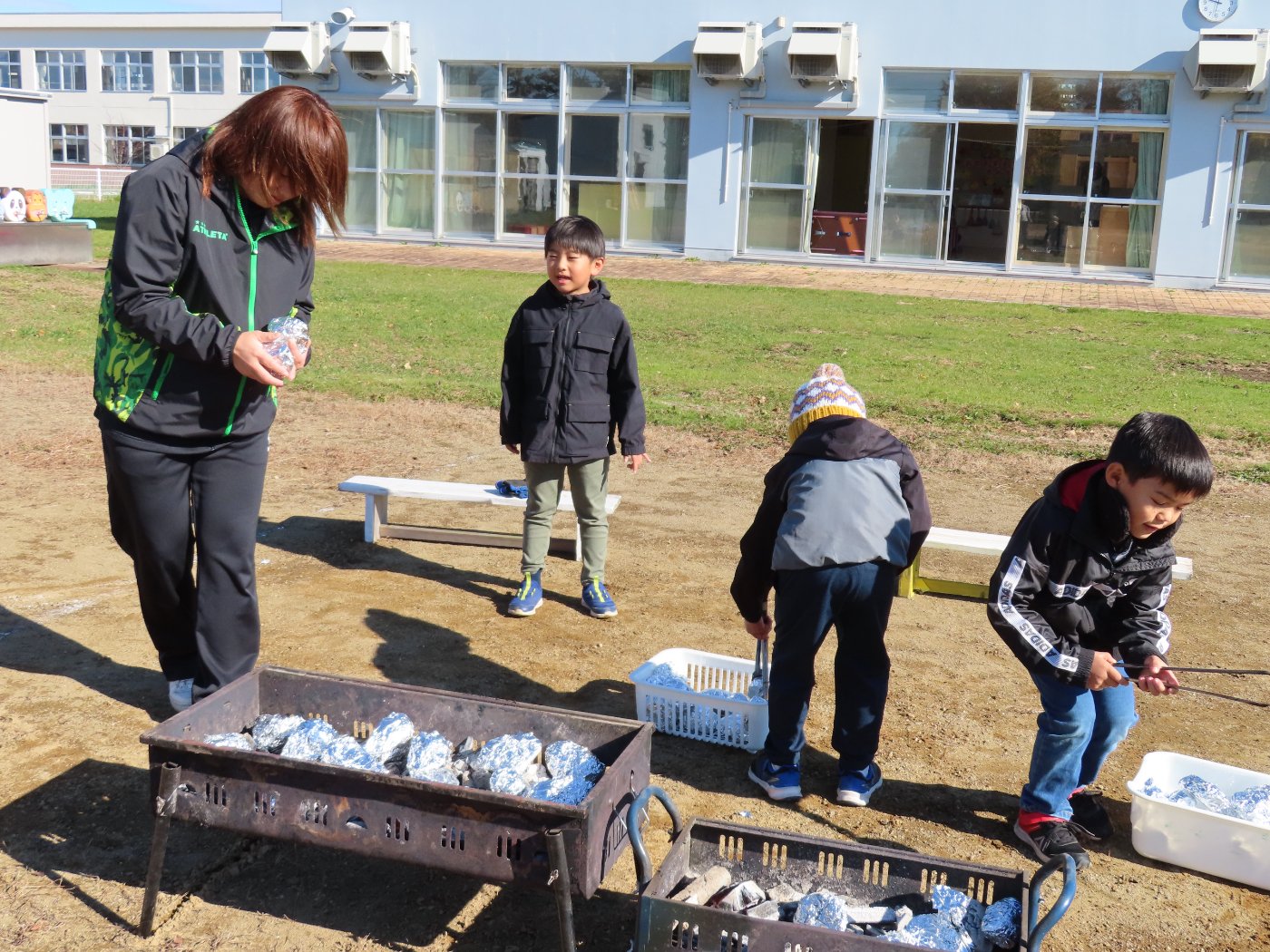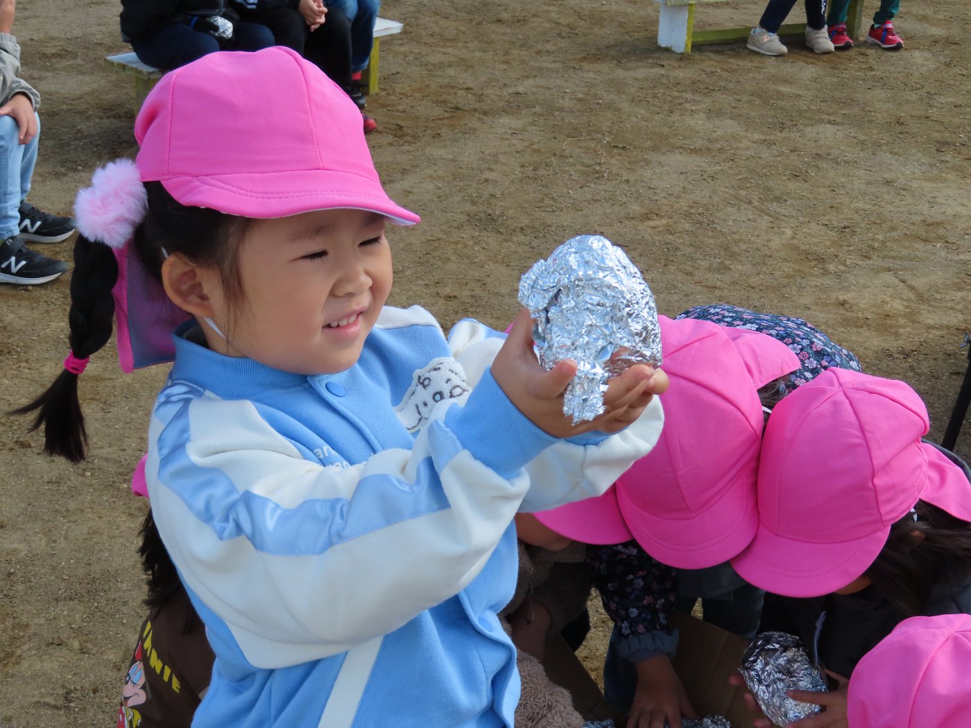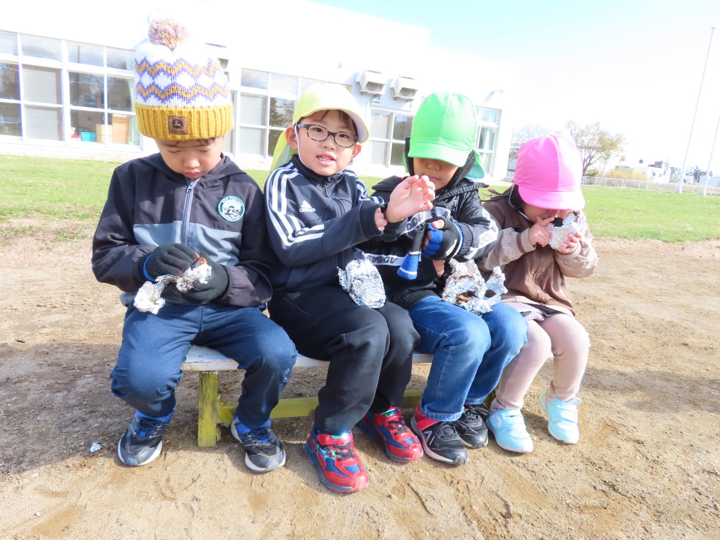 10月誕生会のお楽しみは、毎年恒例!『焼き芋』を行いました。朝遊びの時間は、美味しい焼き芋のためにサツマイモのホイル包みに精を出しました。このサツマイモはもちろん!たけのこ組が丹精込めて育てた上西春別幼稚園産です。たけのこ組は、炭火の,熱風と格闘しながら、包んだサツマイモを投入するのにもチャレンジしました。サツマイモの他にも、マシュマロ、ウィンナー、収穫カボチャ、チーズ(A先生の旦那様が差し入れてくださいました♫)も炭火焼に! 熱々ほくほくのうちにみんなで味わい、それはそれは幸せそうに頬張っていた子ども達です。
