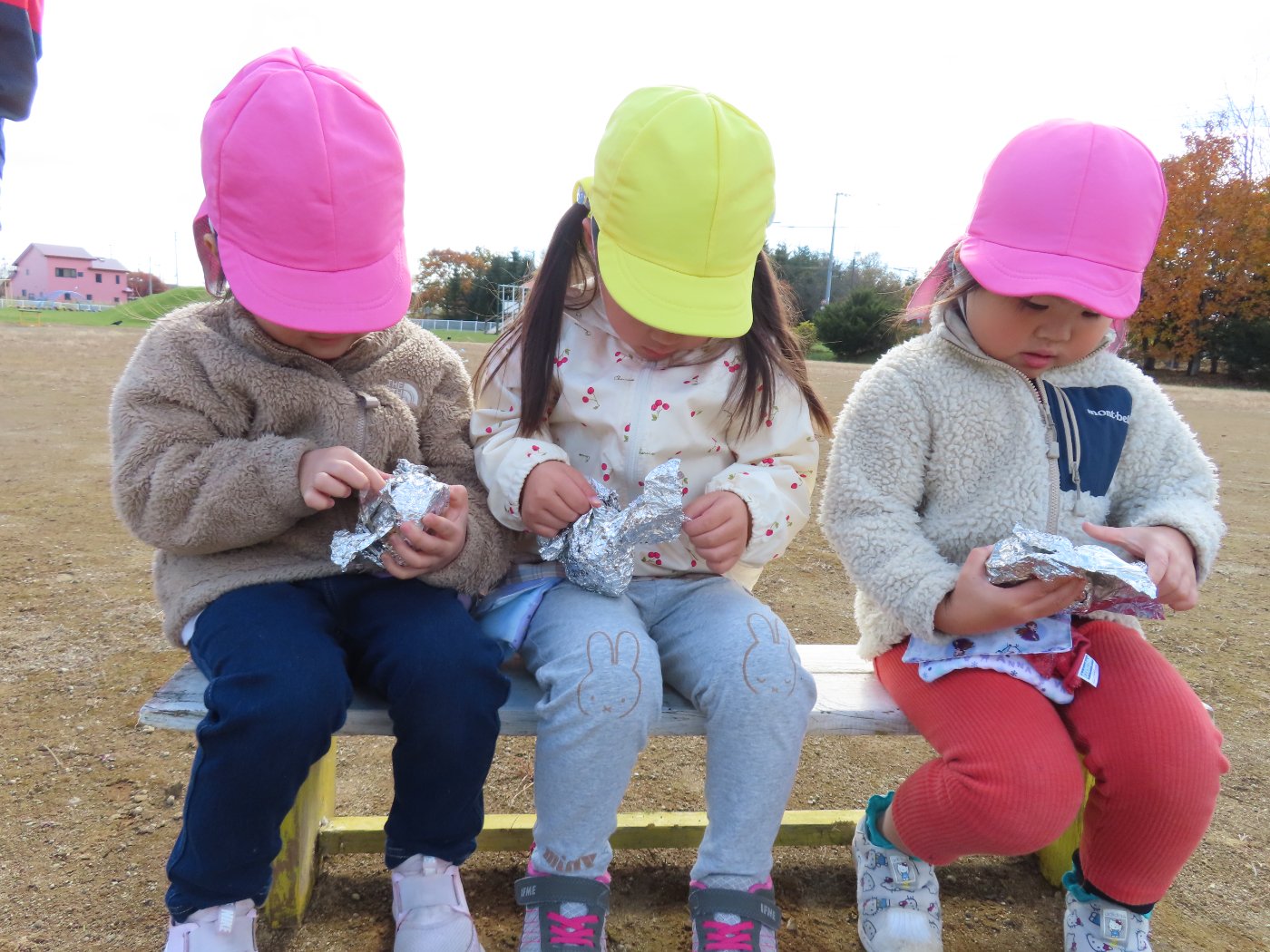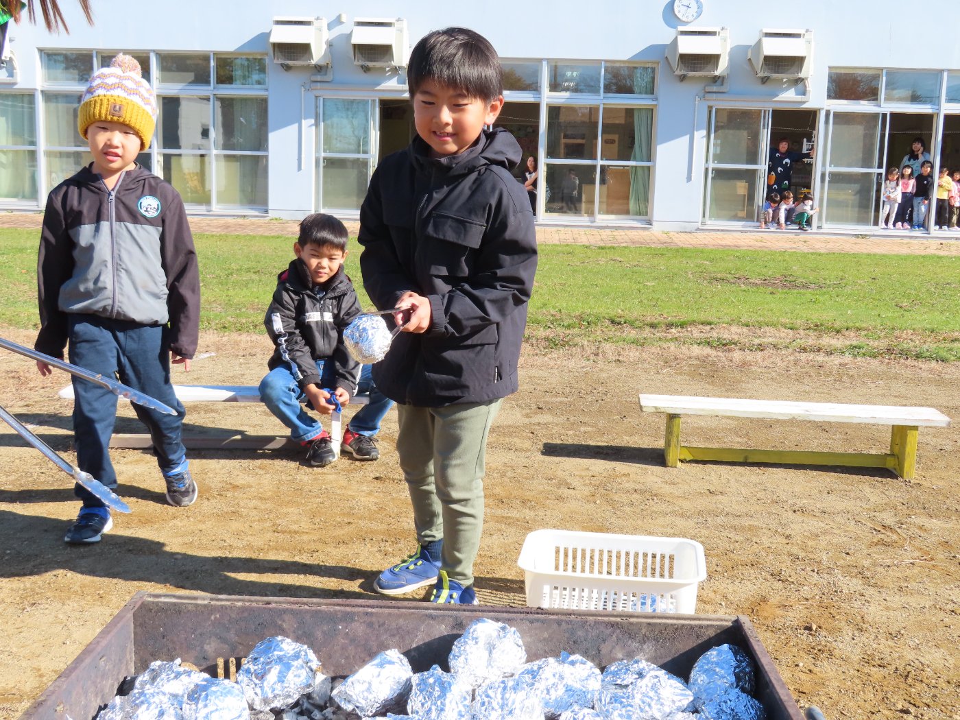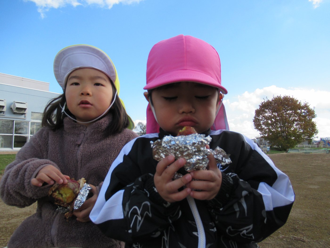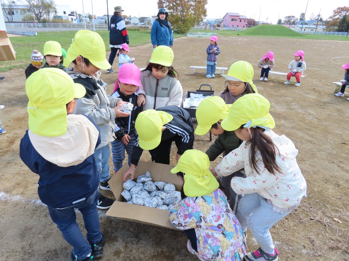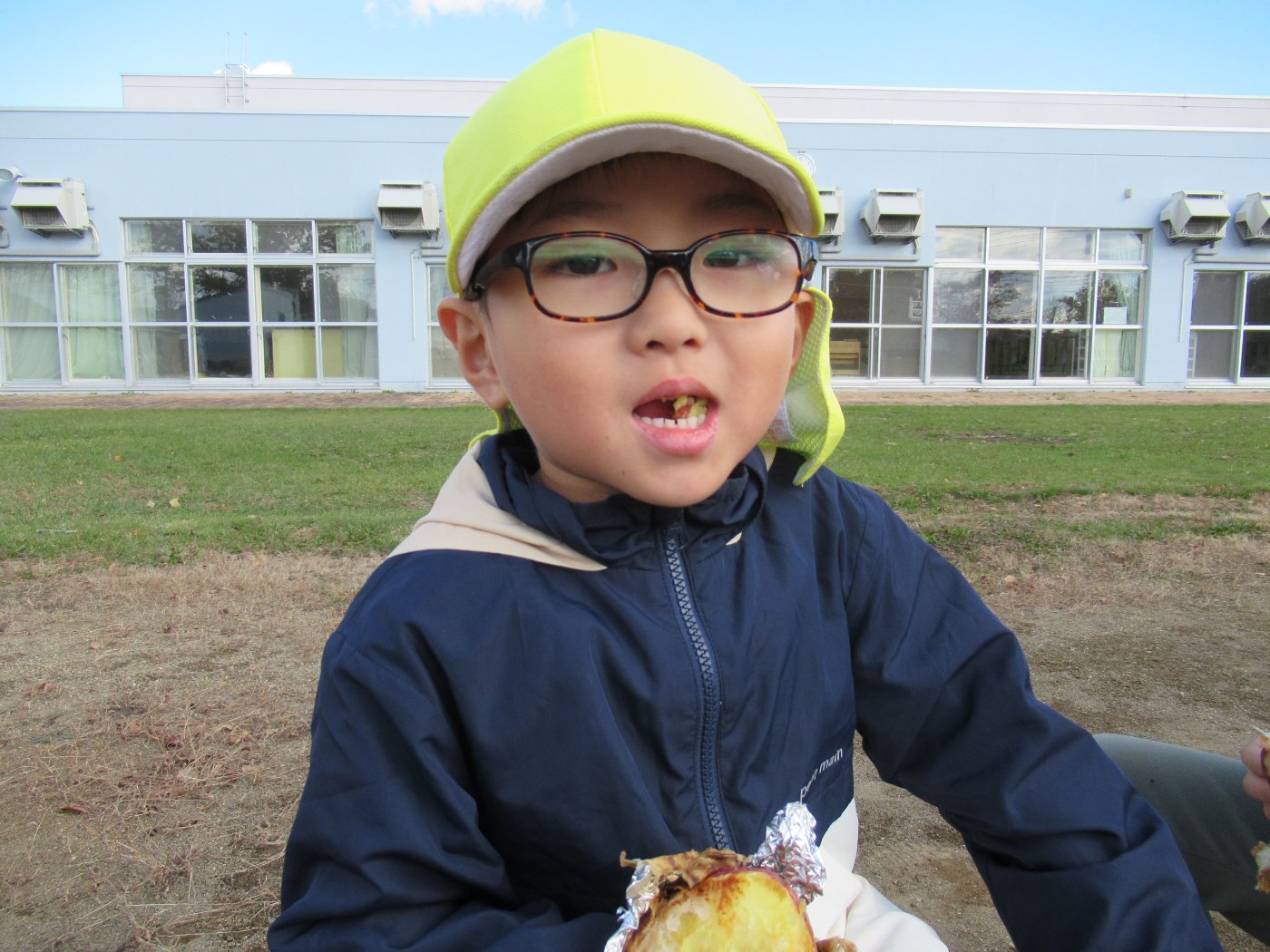 10月誕生会のお楽しみは、毎年恒例!『焼き芋』を行いました。朝遊びの時間は、美味しい焼き芋のためにサツマイモのホイル包みに精を出しました。このサツマイモはもちろん!たけのこ組が丹精込めて育てた上西春別幼稚園産です。たけのこ組は、炭火の,熱風と格闘しながら、包んだサツマイモを投入するのにもチャレンジしました。サツマイモの他にも、マシュマロ、ウィンナー、収穫カボチャ、チーズ(A先生の旦那様が差し入れてくださいました♫)も炭火焼に! 熱々ほくほくのうちにみんなで味わい、それはそれは幸せそうに頬張っていた子ども達です。