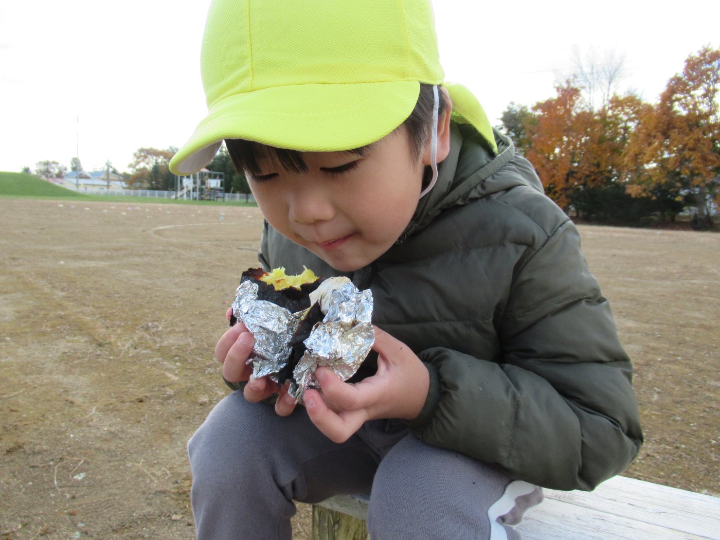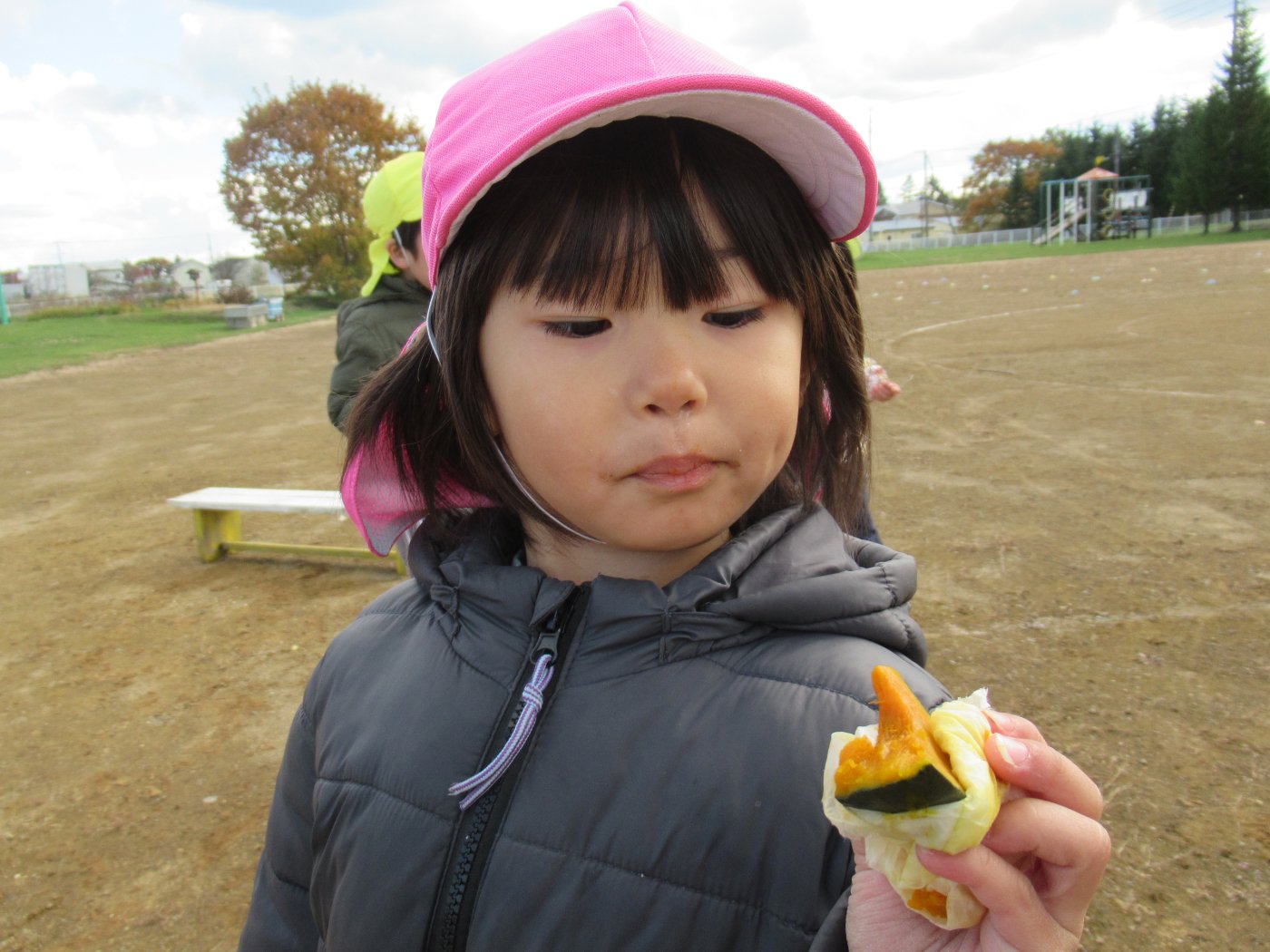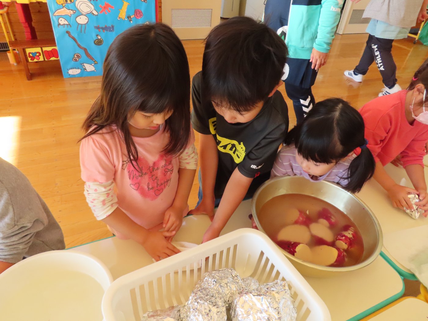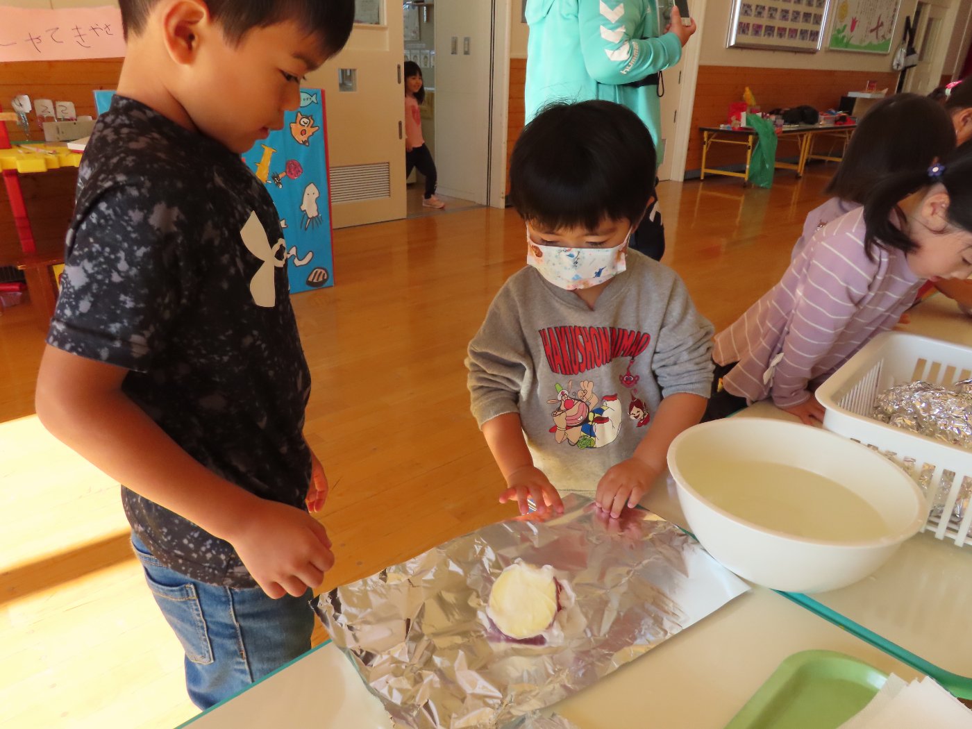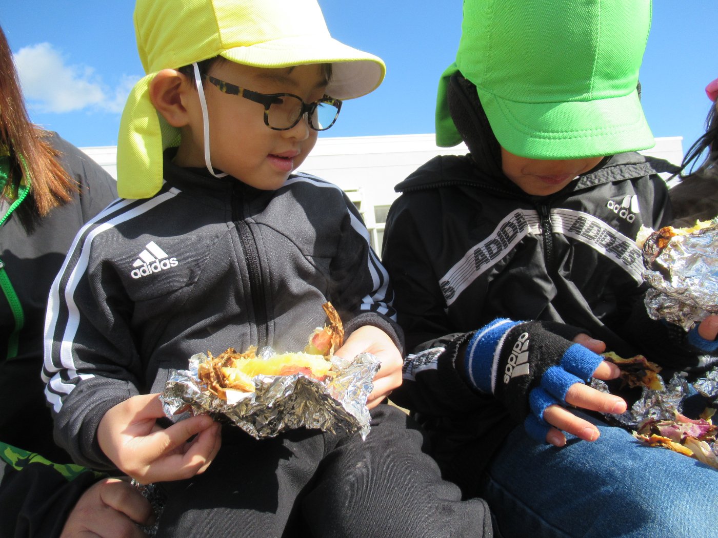 10月誕生会のお楽しみは、毎年恒例!『焼き芋』を行いました。朝遊びの時間は、美味しい焼き芋のためにサツマイモのホイル包みに精を出しました。このサツマイモはもちろん!たけのこ組が丹精込めて育てた上西春別幼稚園産です。たけのこ組は、炭火の,熱風と格闘しながら、包んだサツマイモを投入するのにもチャレンジしました。サツマイモの他にも、マシュマロ、ウィンナー、収穫カボチャ、チーズ(A先生の旦那様が差し入れてくださいました♫)も炭火焼に! 熱々ほくほくのうちにみんなで味わい、それはそれは幸せそうに頬張っていた子ども達です。