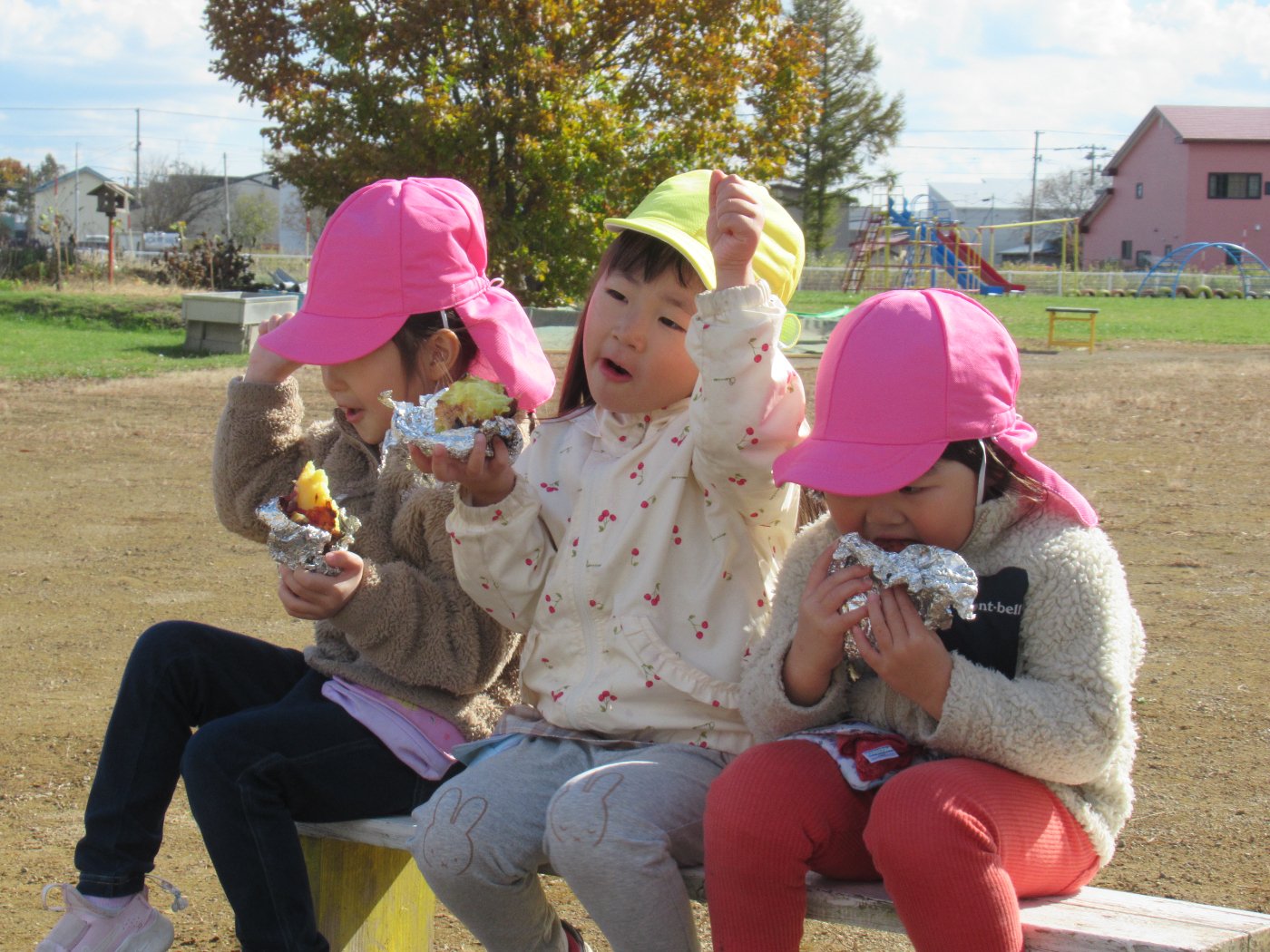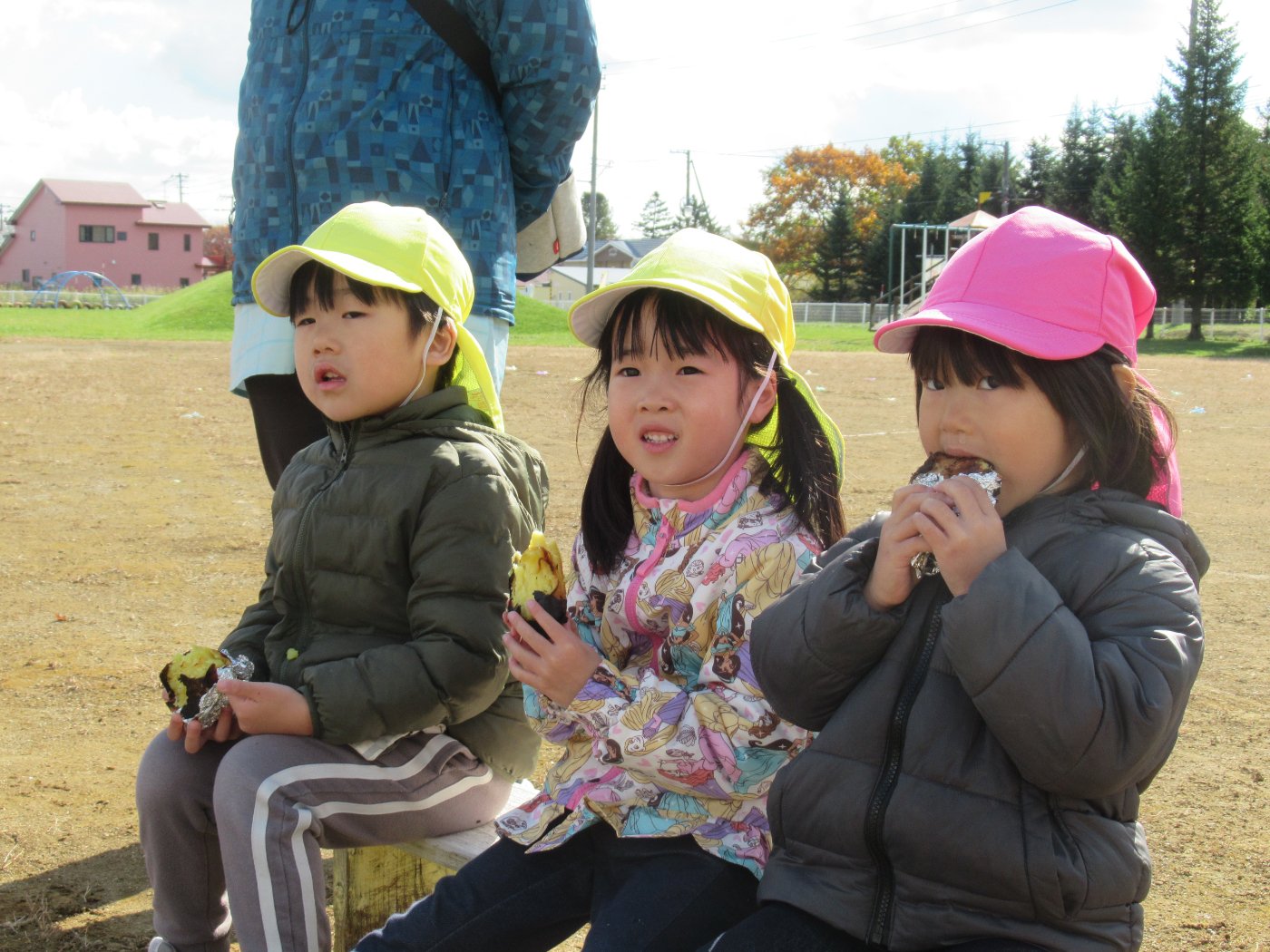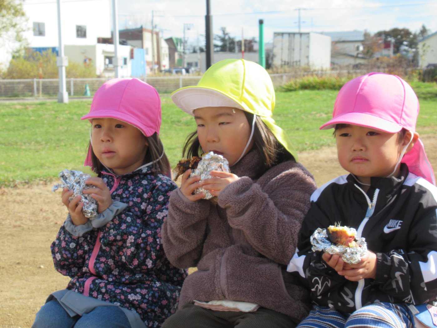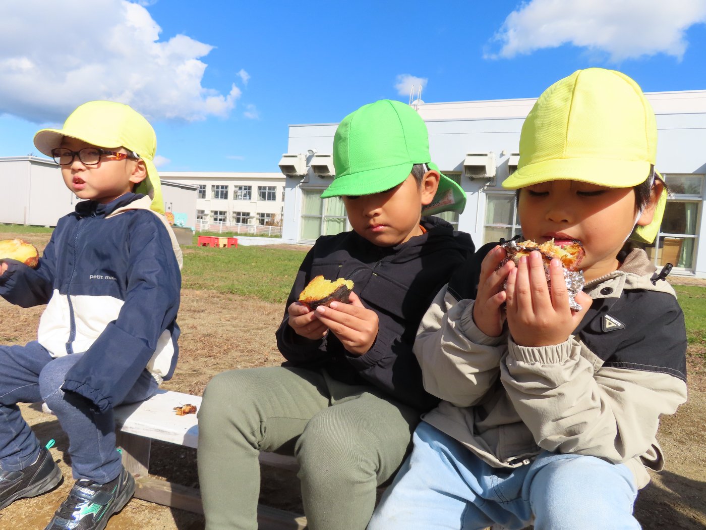 10月誕生会のお楽しみは、毎年恒例!『焼き芋』を行いました。朝遊びの時間は、美味しい焼き芋のためにサツマイモのホイル包みに精を出しました。このサツマイモはもちろん!たけのこ組が丹精込めて育てた上西春別幼稚園産です。たけのこ組は、炭火の,熱風と格闘しながら、包んだサツマイモを投入するのにもチャレンジしました。サツマイモの他にも、マシュマロ、ウィンナー、収穫カボチャ、チーズ(A先生の旦那様が差し入れてくださいました♫)も炭火焼に! 熱々ほくほくのうちにみんなで味わい、それはそれは幸せそうに頬張っていた子ども達です。