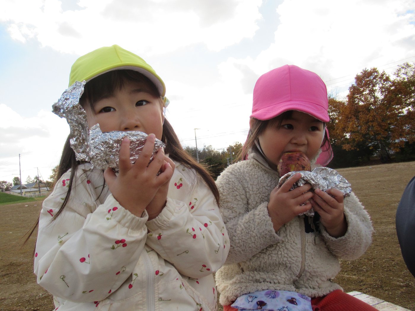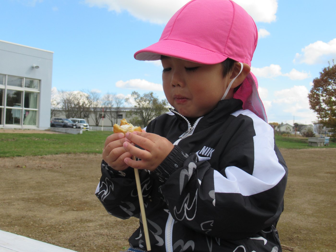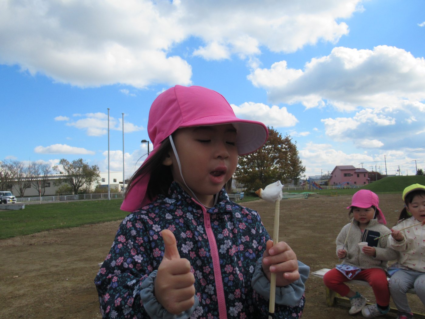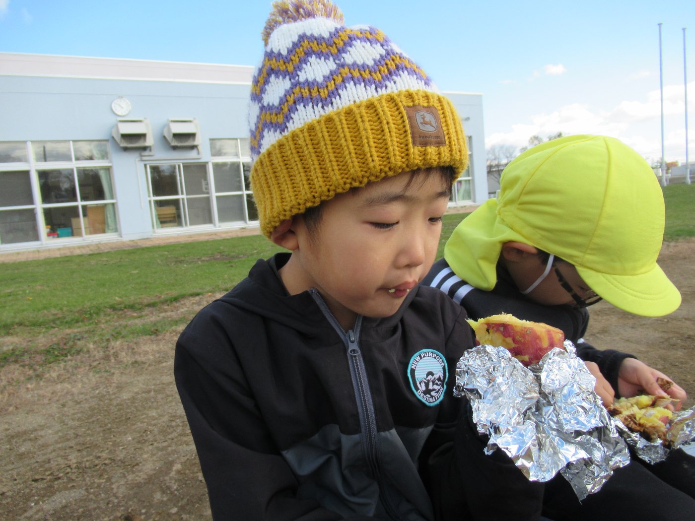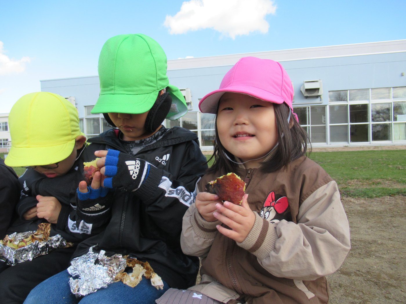 10月誕生会のお楽しみは、毎年恒例!『焼き芋』を行いました。朝遊びの時間は、美味しい焼き芋のためにサツマイモのホイル包みに精を出しました。このサツマイモはもちろん!たけのこ組が丹精込めて育てた上西春別幼稚園産です。たけのこ組は、炭火の,熱風と格闘しながら、包んだサツマイモを投入するのにもチャレンジしました。サツマイモの他にも、マシュマロ、ウィンナー、収穫カボチャ、チーズ(A先生の旦那様が差し入れてくださいました♫)も炭火焼に! 熱々ほくほくのうちにみんなで味わい、それはそれは幸せそうに頬張っていた子ども達です。