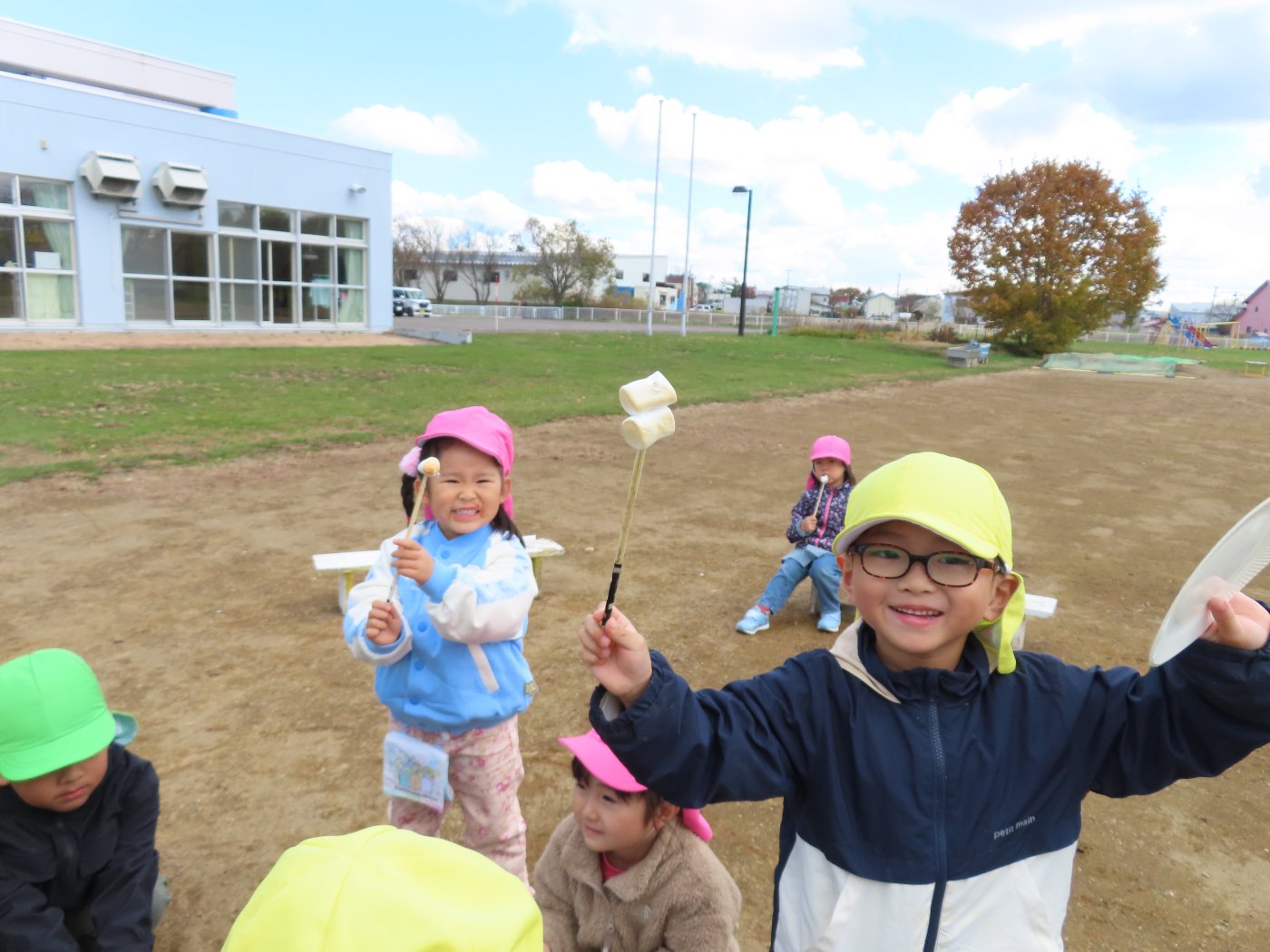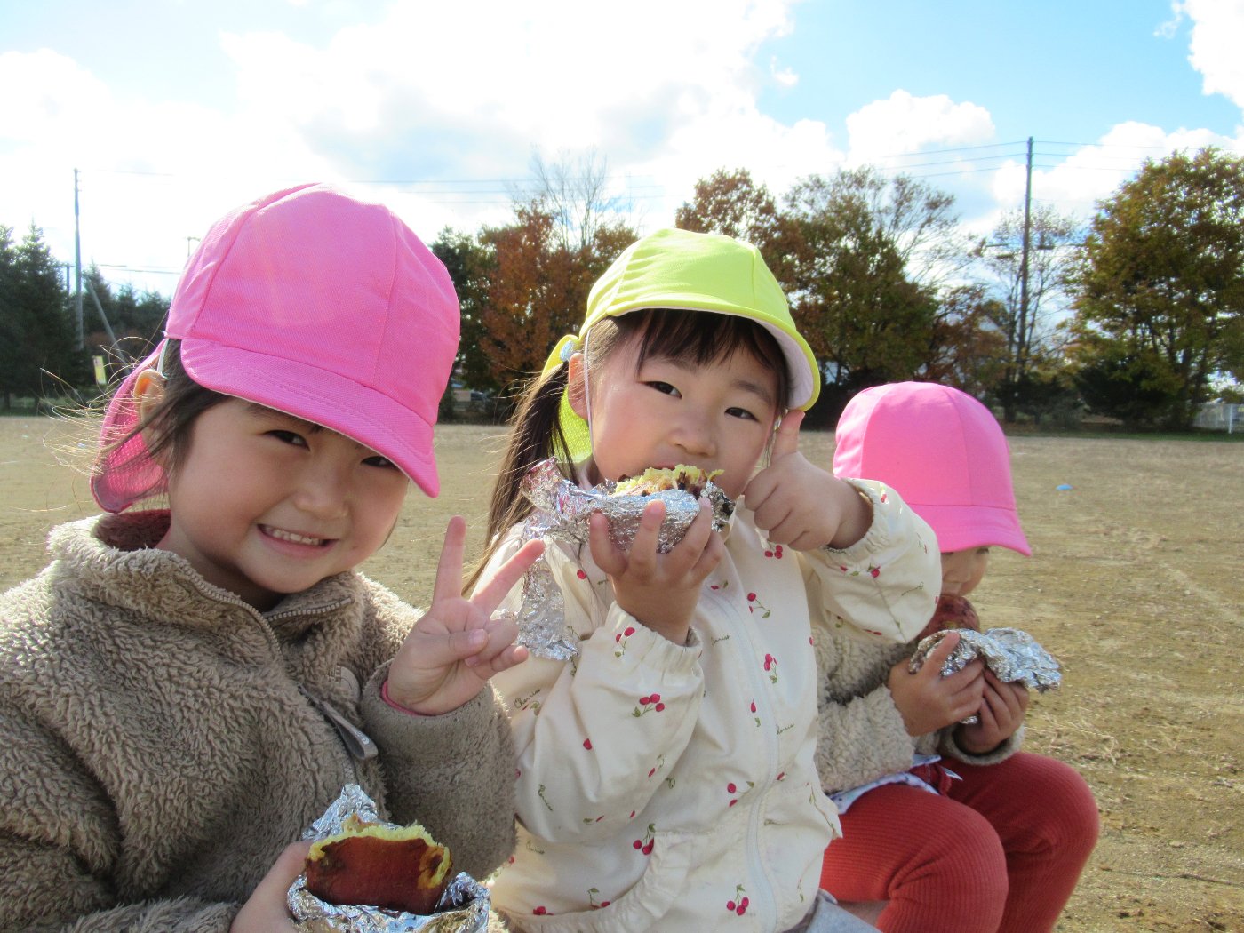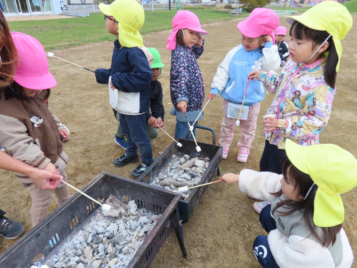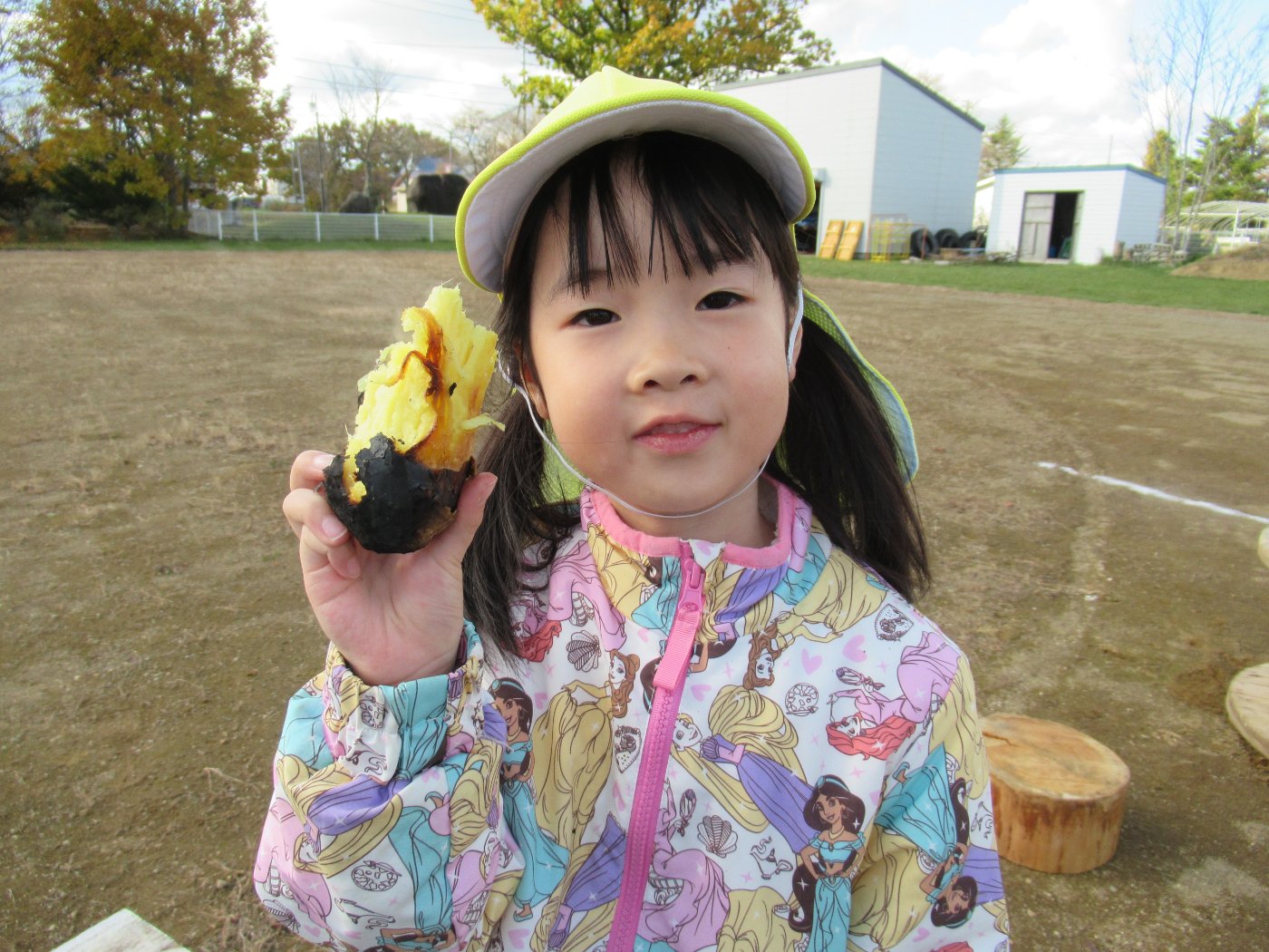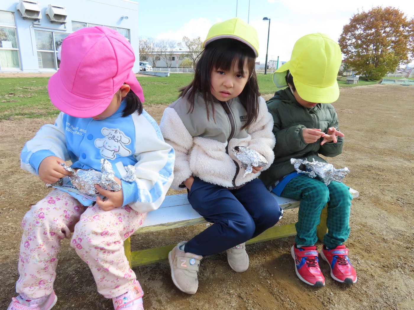 10月誕生会のお楽しみは、毎年恒例!『焼き芋』を行いました。朝遊びの時間は、美味しい焼き芋のためにサツマイモのホイル包みに精を出しました。このサツマイモはもちろん!たけのこ組が丹精込めて育てた上西春別幼稚園産です。たけのこ組は、炭火の,熱風と格闘しながら、包んだサツマイモを投入するのにもチャレンジしました。サツマイモの他にも、マシュマロ、ウィンナー、収穫カボチャ、チーズ(A先生の旦那様が差し入れてくださいました♫)も炭火焼に! 熱々ほくほくのうちにみんなで味わい、それはそれは幸せそうに頬張っていた子ども達です。