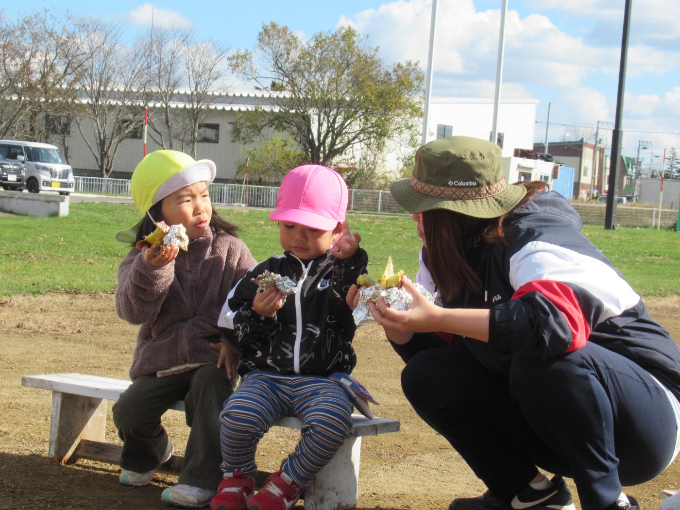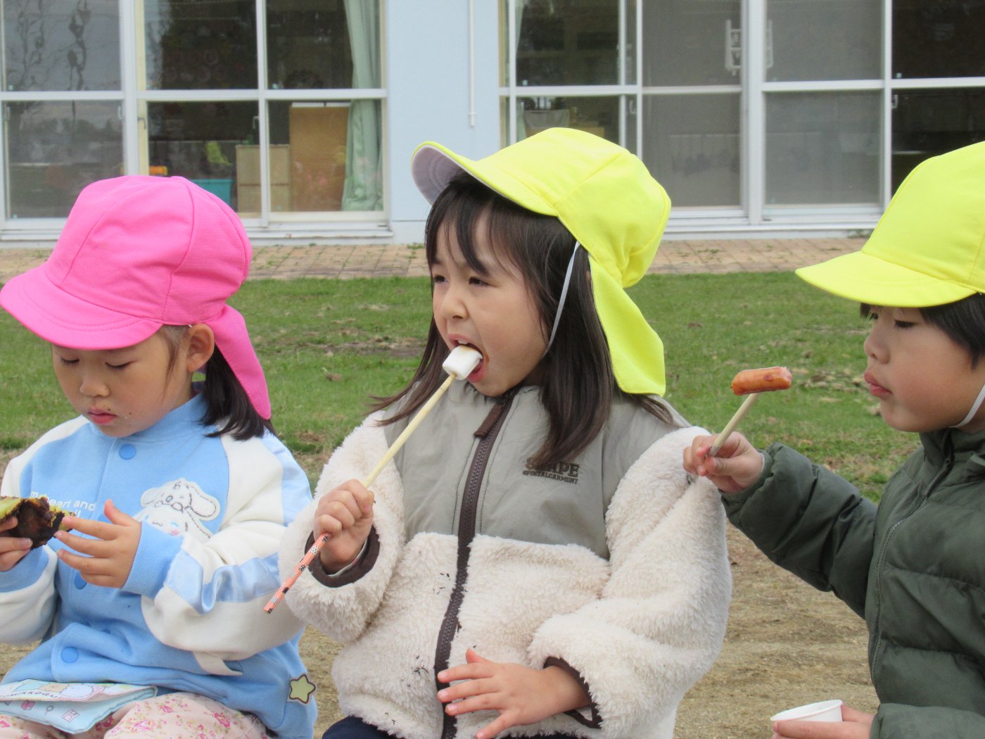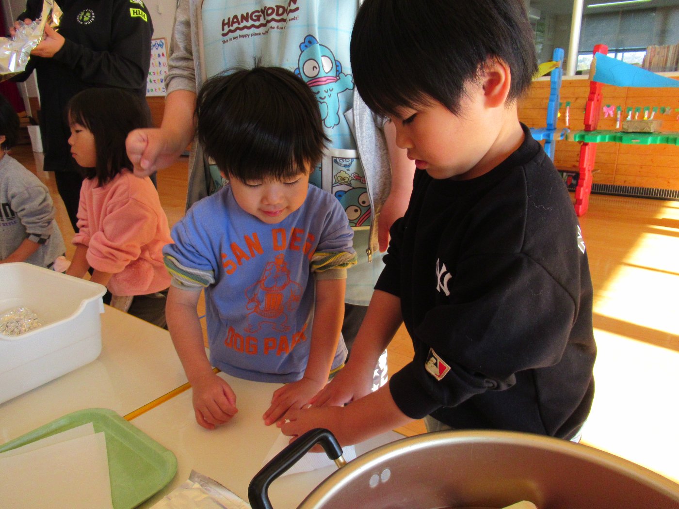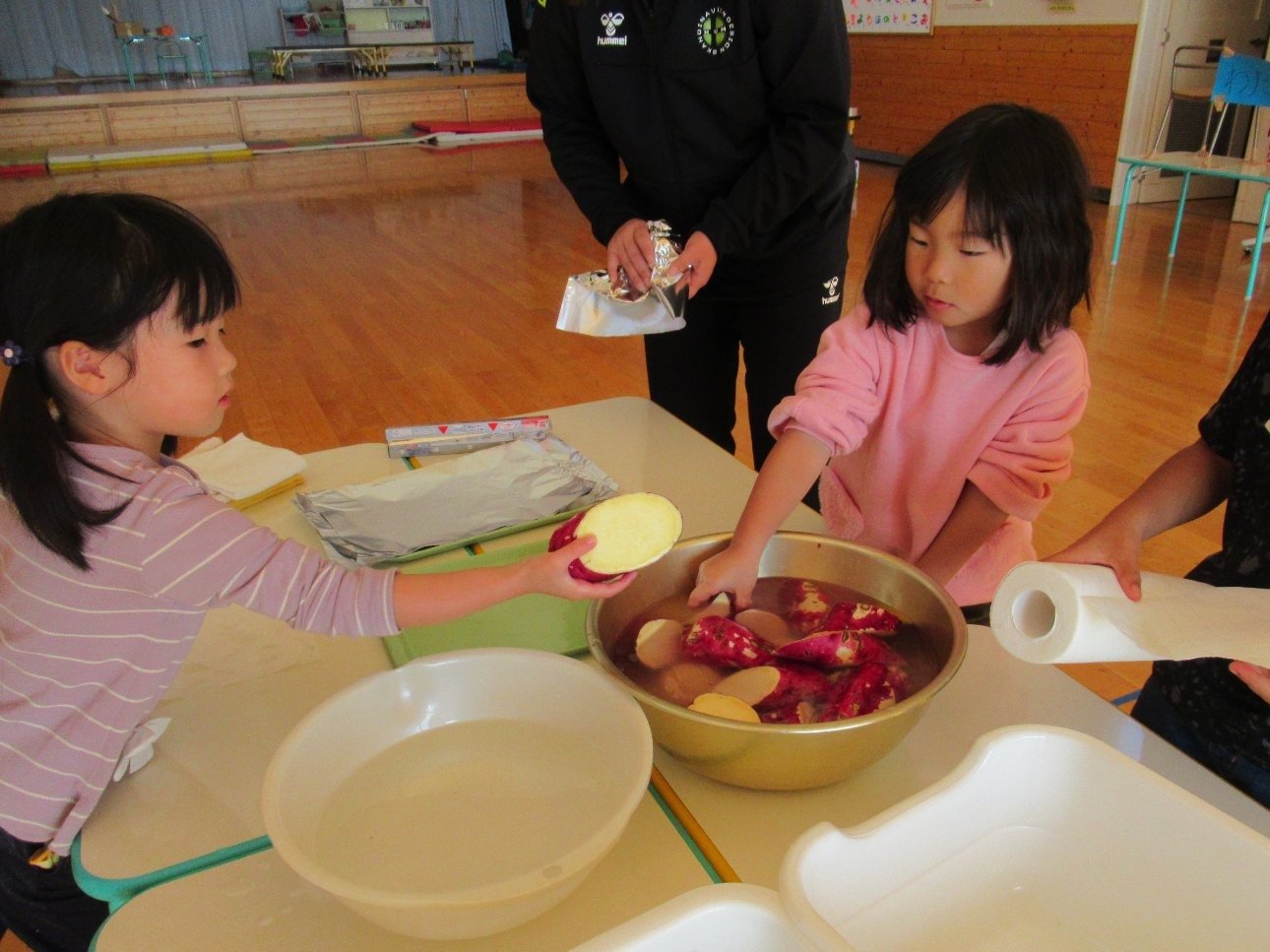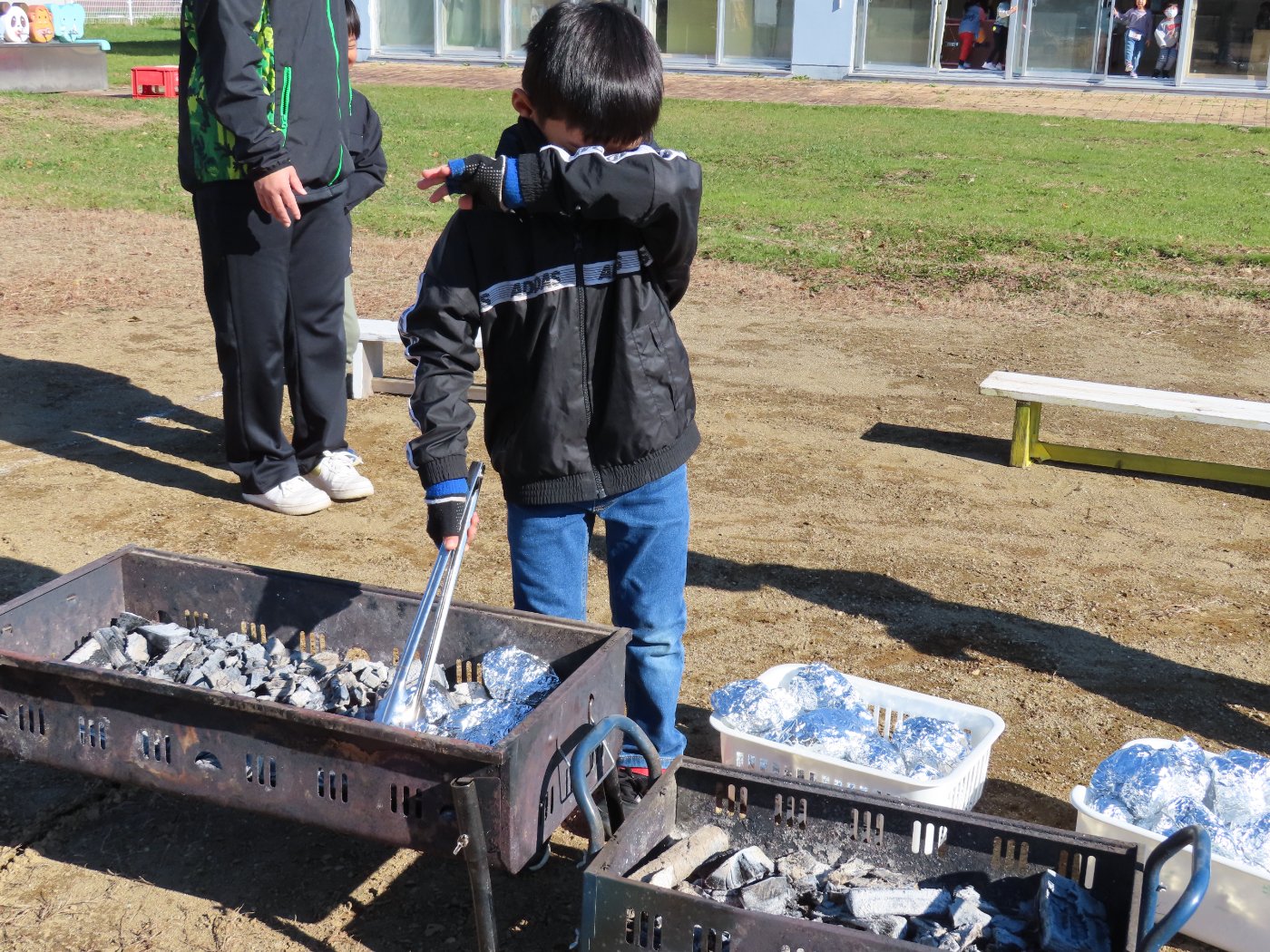 10月誕生会のお楽しみは、毎年恒例!『焼き芋』を行いました。朝遊びの時間は、美味しい焼き芋のためにサツマイモのホイル包みに精を出しました。このサツマイモはもちろん!たけのこ組が丹精込めて育てた上西春別幼稚園産です。たけのこ組は、炭火の,熱風と格闘しながら、包んだサツマイモを投入するのにもチャレンジしました。サツマイモの他にも、マシュマロ、ウィンナー、収穫カボチャ、チーズ(A先生の旦那様が差し入れてくださいました♫)も炭火焼に! 熱々ほくほくのうちにみんなで味わい、それはそれは幸せそうに頬張っていた子ども達です。