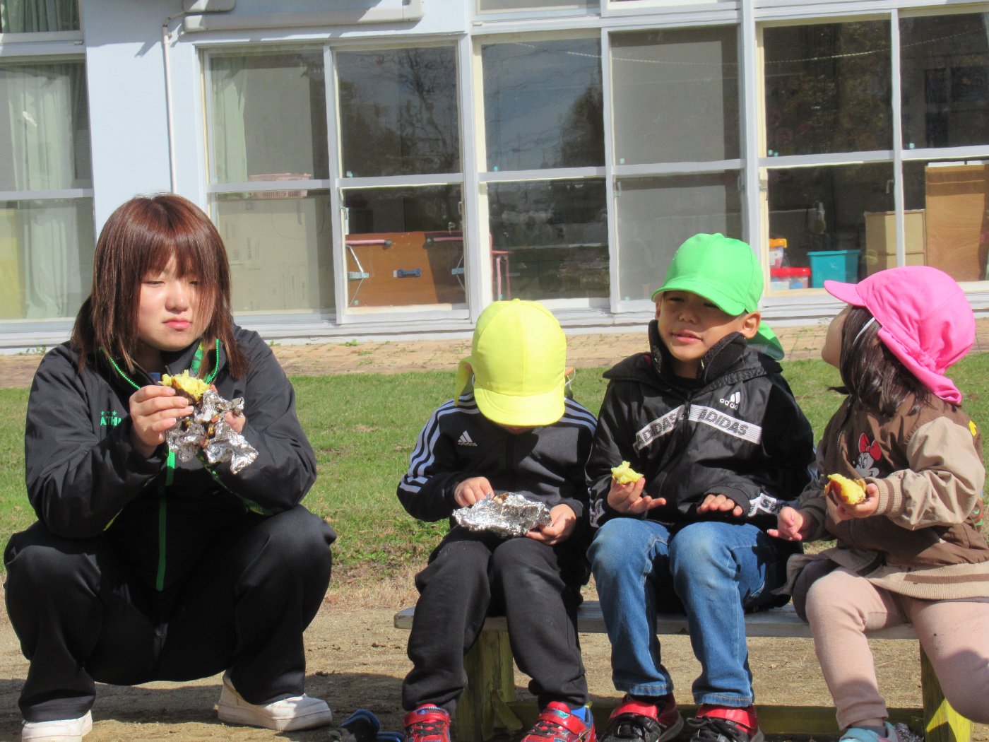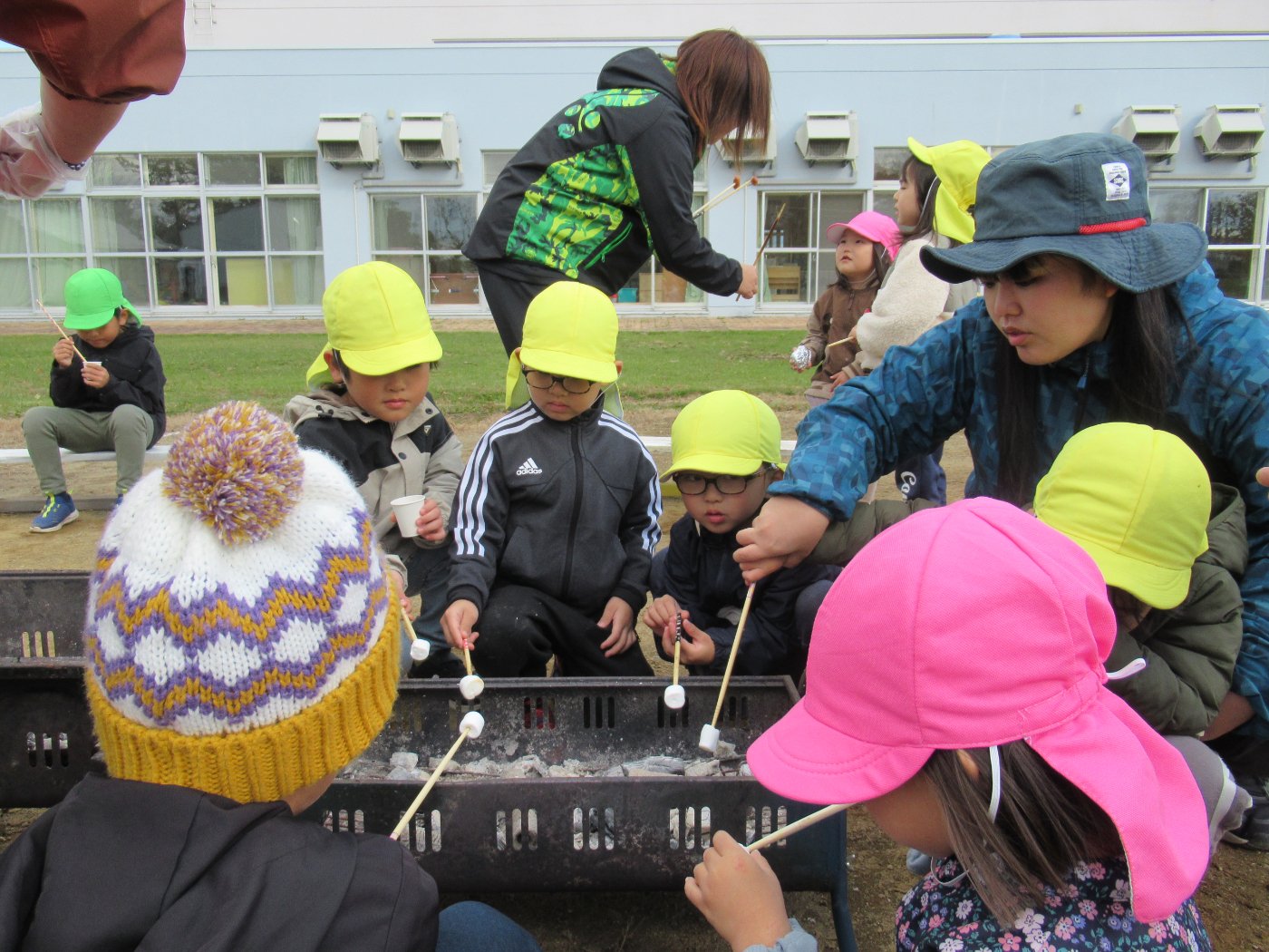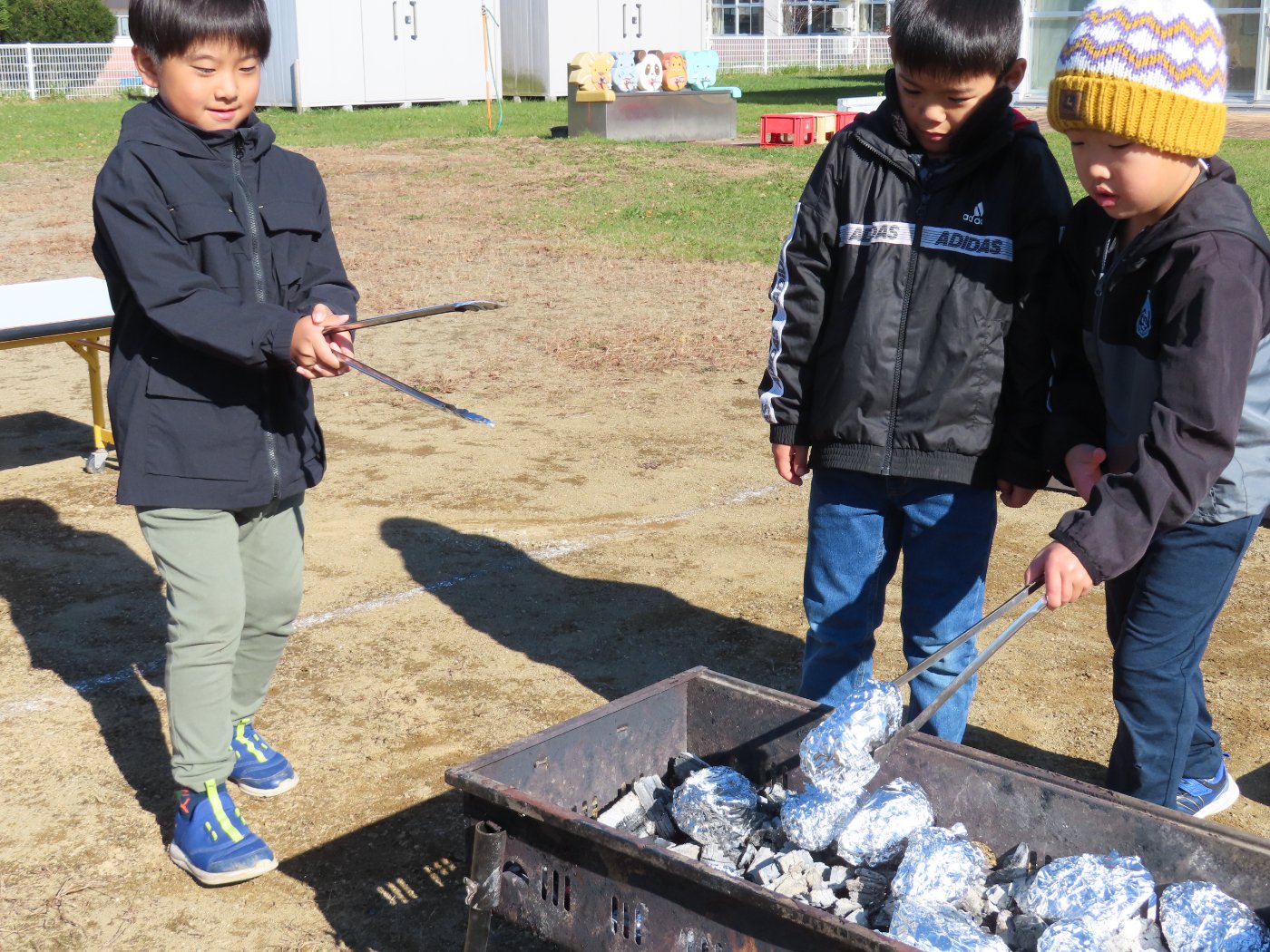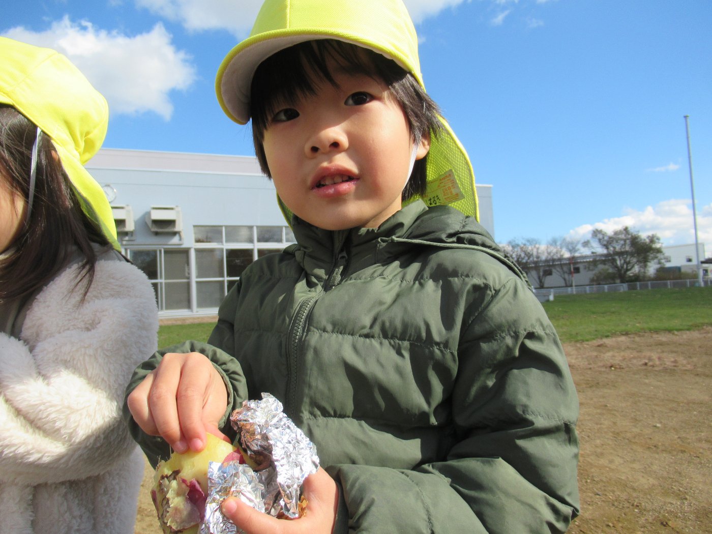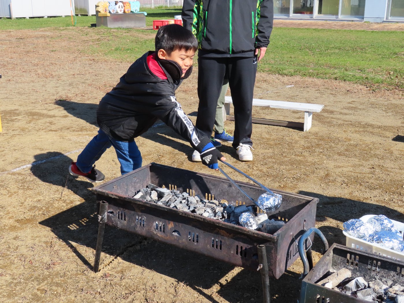 10月誕生会のお楽しみは、毎年恒例!『焼き芋』を行いました。朝遊びの時間は、美味しい焼き芋のためにサツマイモのホイル包みに精を出しました。このサツマイモはもちろん!たけのこ組が丹精込めて育てた上西春別幼稚園産です。たけのこ組は、炭火の,熱風と格闘しながら、包んだサツマイモを投入するのにもチャレンジしました。サツマイモの他にも、マシュマロ、ウィンナー、収穫カボチャ、チーズ(A先生の旦那様が差し入れてくださいました♫)も炭火焼に! 熱々ほくほくのうちにみんなで味わい、それはそれは幸せそうに頬張っていた子ども達です。
