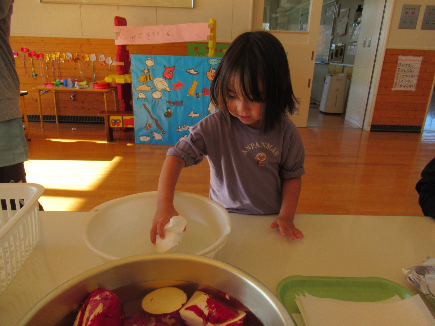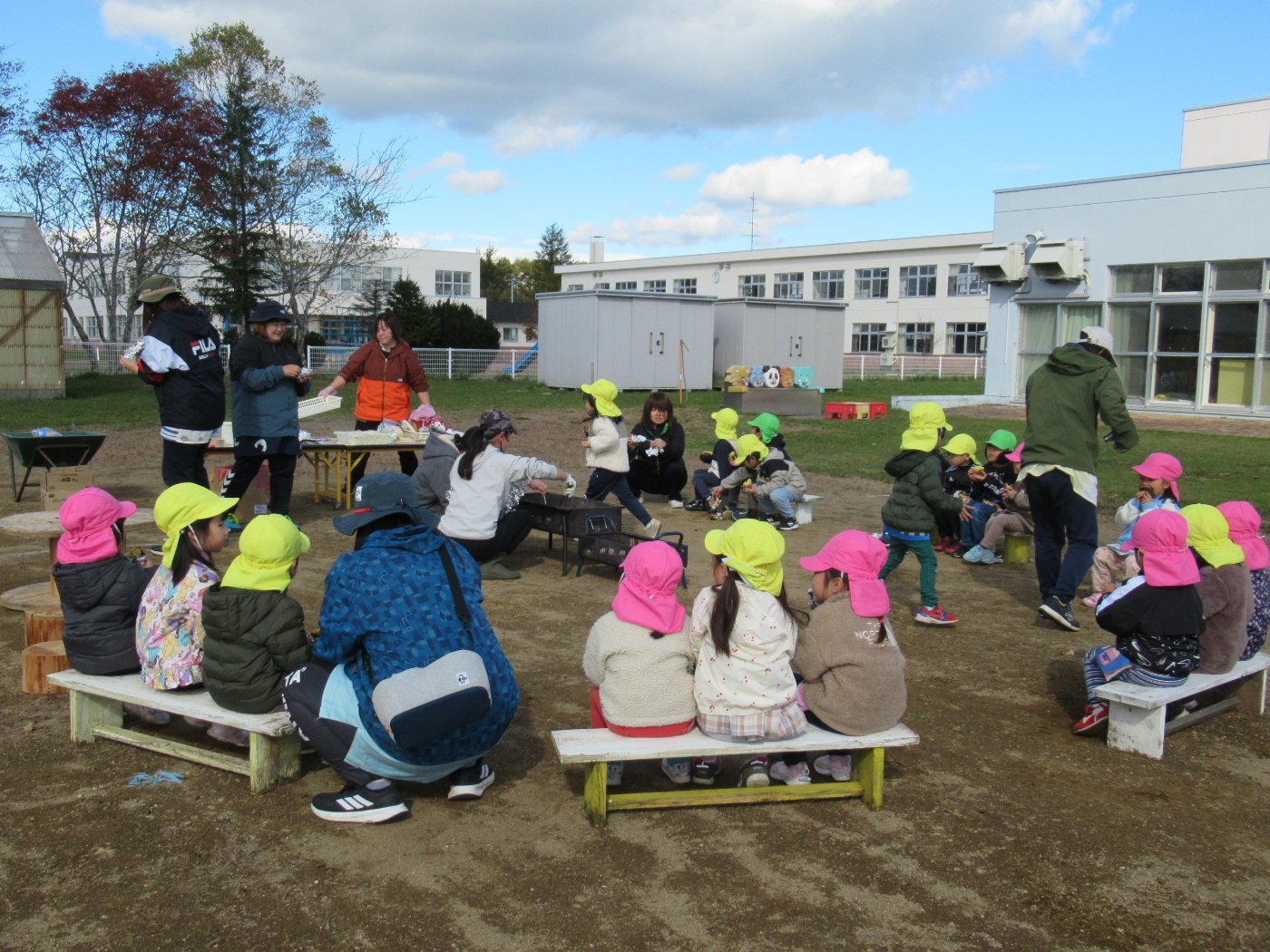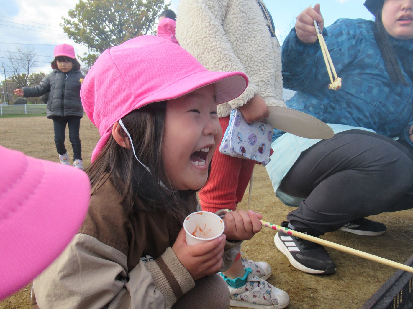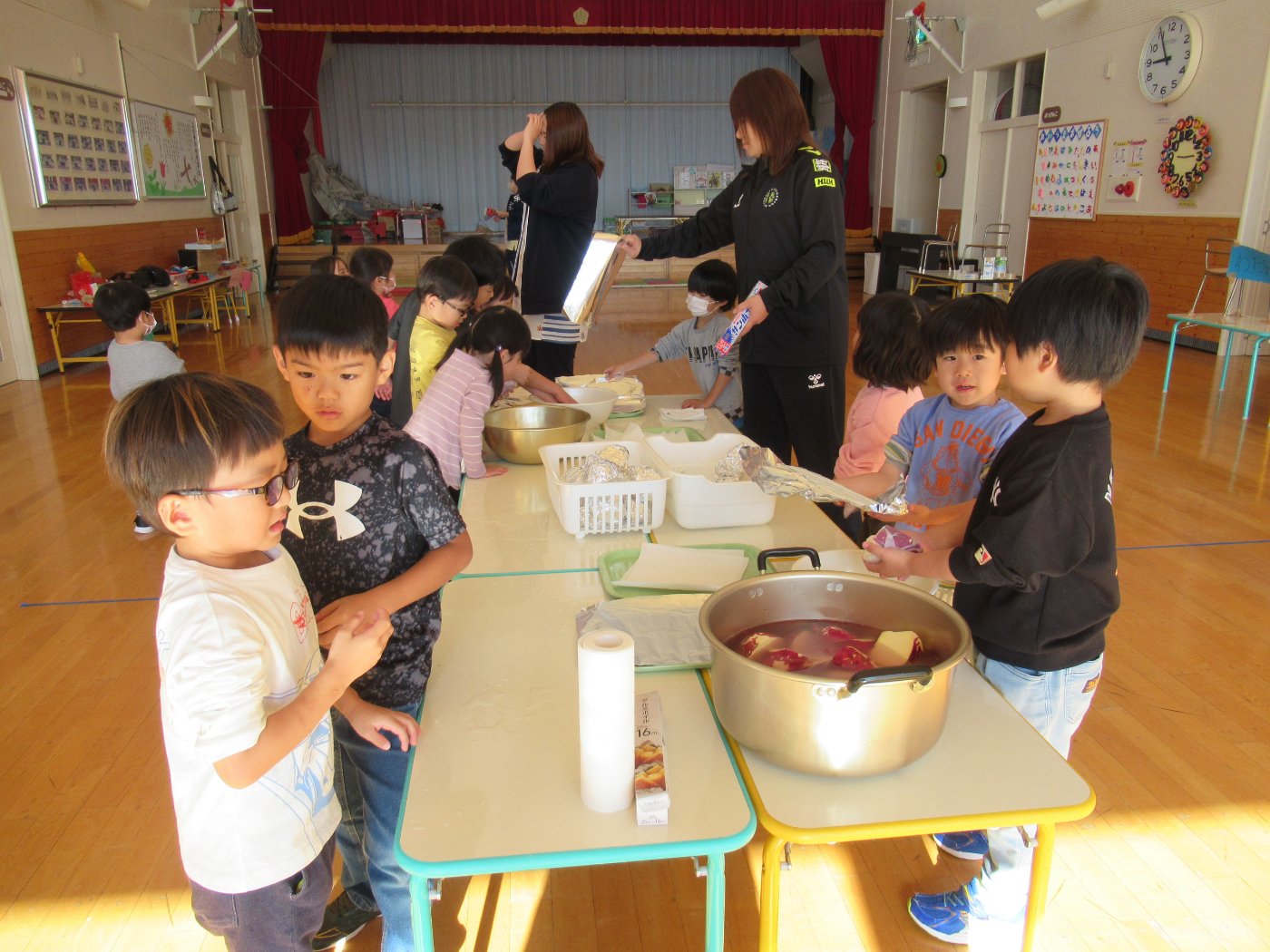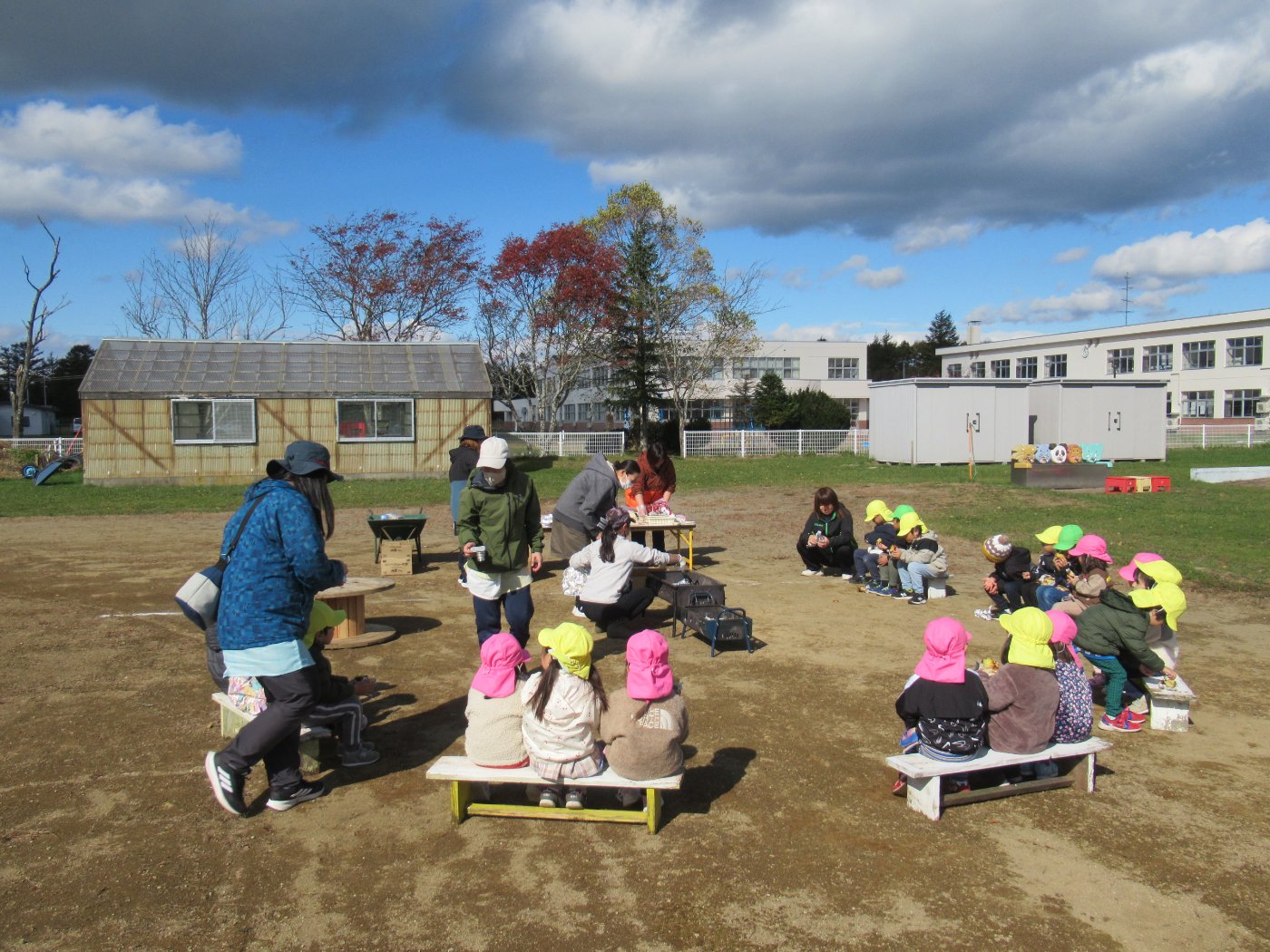 10月誕生会のお楽しみは、毎年恒例!『焼き芋』を行いました。朝遊びの時間は、美味しい焼き芋のためにサツマイモのホイル包みに精を出しました。このサツマイモはもちろん!たけのこ組が丹精込めて育てた上西春別幼稚園産です。たけのこ組は、炭火の,熱風と格闘しながら、包んだサツマイモを投入するのにもチャレンジしました。サツマイモの他にも、マシュマロ、ウィンナー、収穫カボチャ、チーズ(A先生の旦那様が差し入れてくださいました♫)も炭火焼に! 熱々ほくほくのうちにみんなで味わい、それはそれは幸せそうに頬張っていた子ども達です。