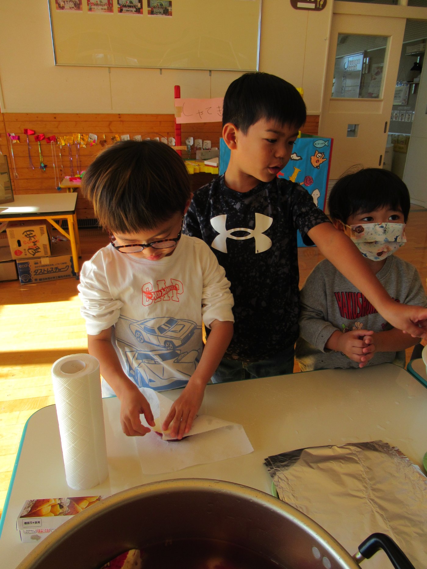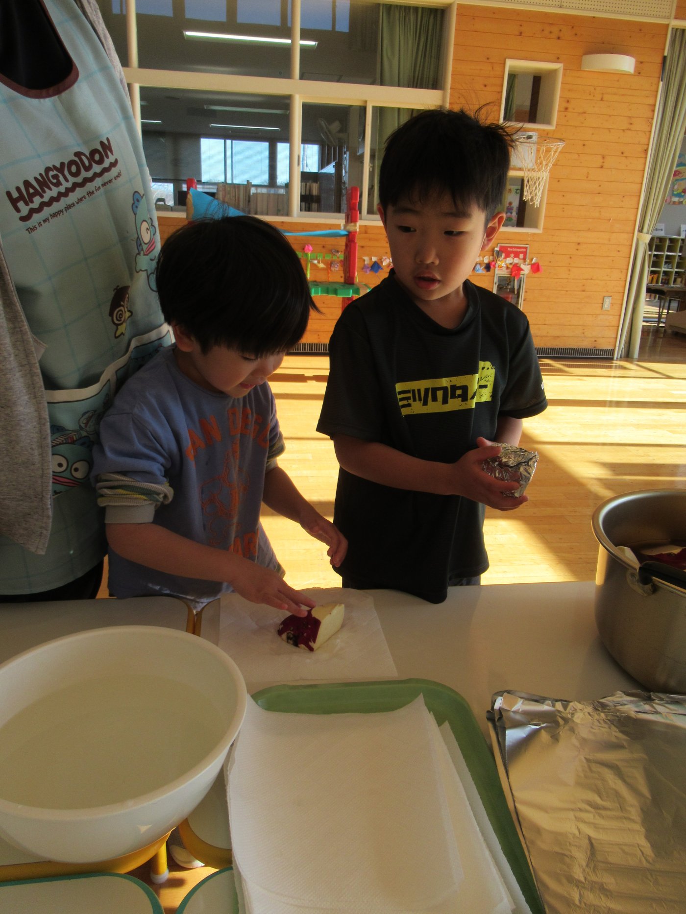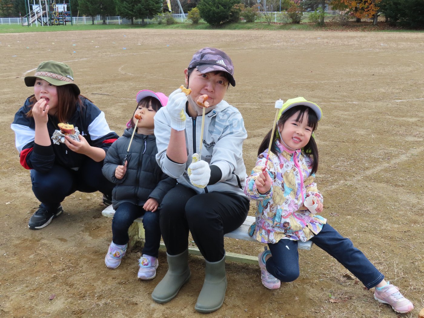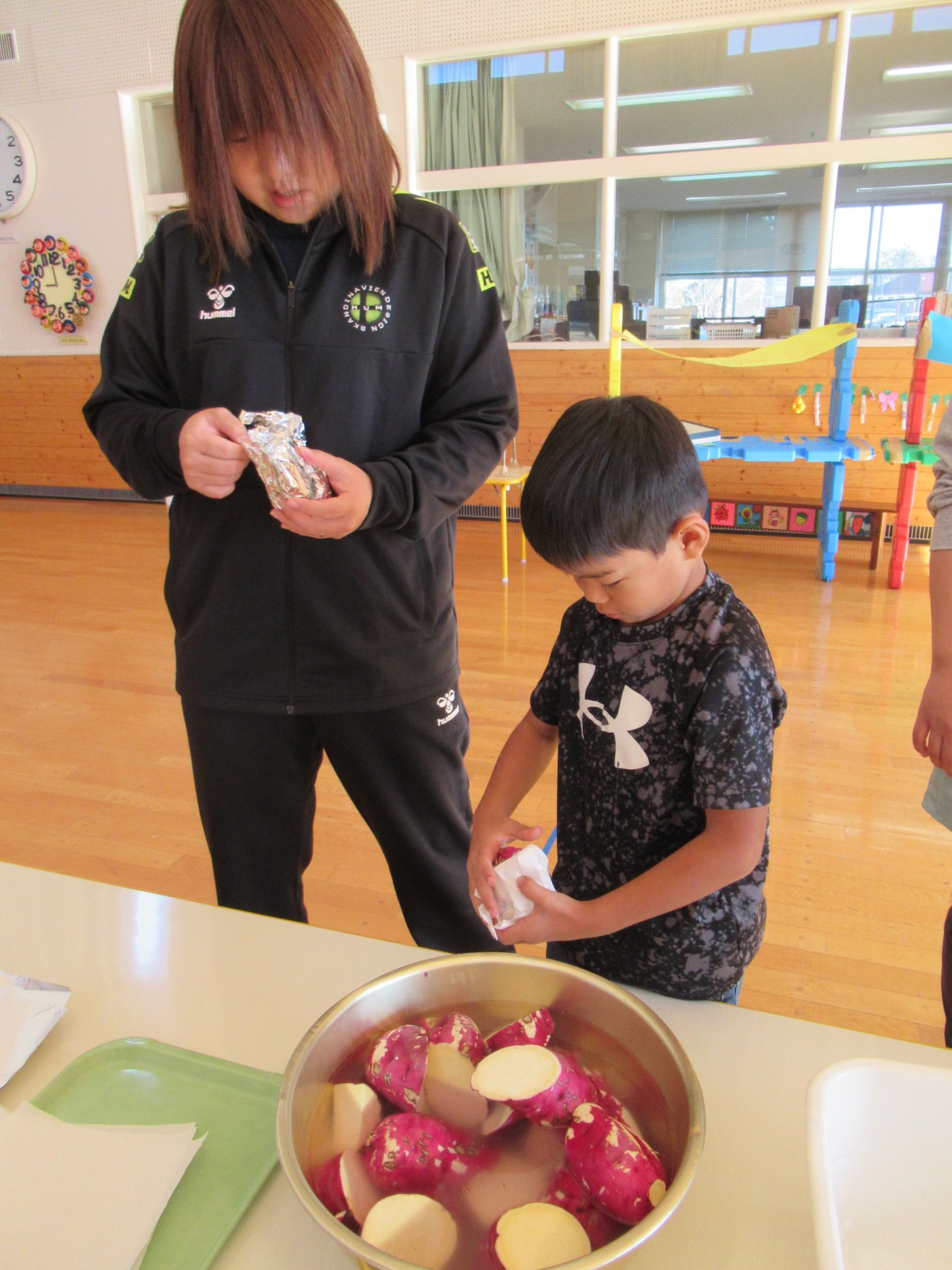 10月誕生会のお楽しみは、毎年恒例!『焼き芋』を行いました。朝遊びの時間は、美味しい焼き芋のためにサツマイモのホイル包みに精を出しました。このサツマイモはもちろん!たけのこ組が丹精込めて育てた上西春別幼稚園産です。たけのこ組は、炭火の,熱風と格闘しながら、包んだサツマイモを投入するのにもチャレンジしました。サツマイモの他にも、マシュマロ、ウィンナー、収穫カボチャ、チーズ(A先生の旦那様が差し入れてくださいました♫)も炭火焼に! 熱々ほくほくのうちにみんなで味わい、それはそれは幸せそうに頬張っていた子ども達です。